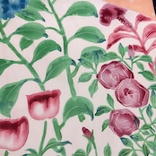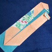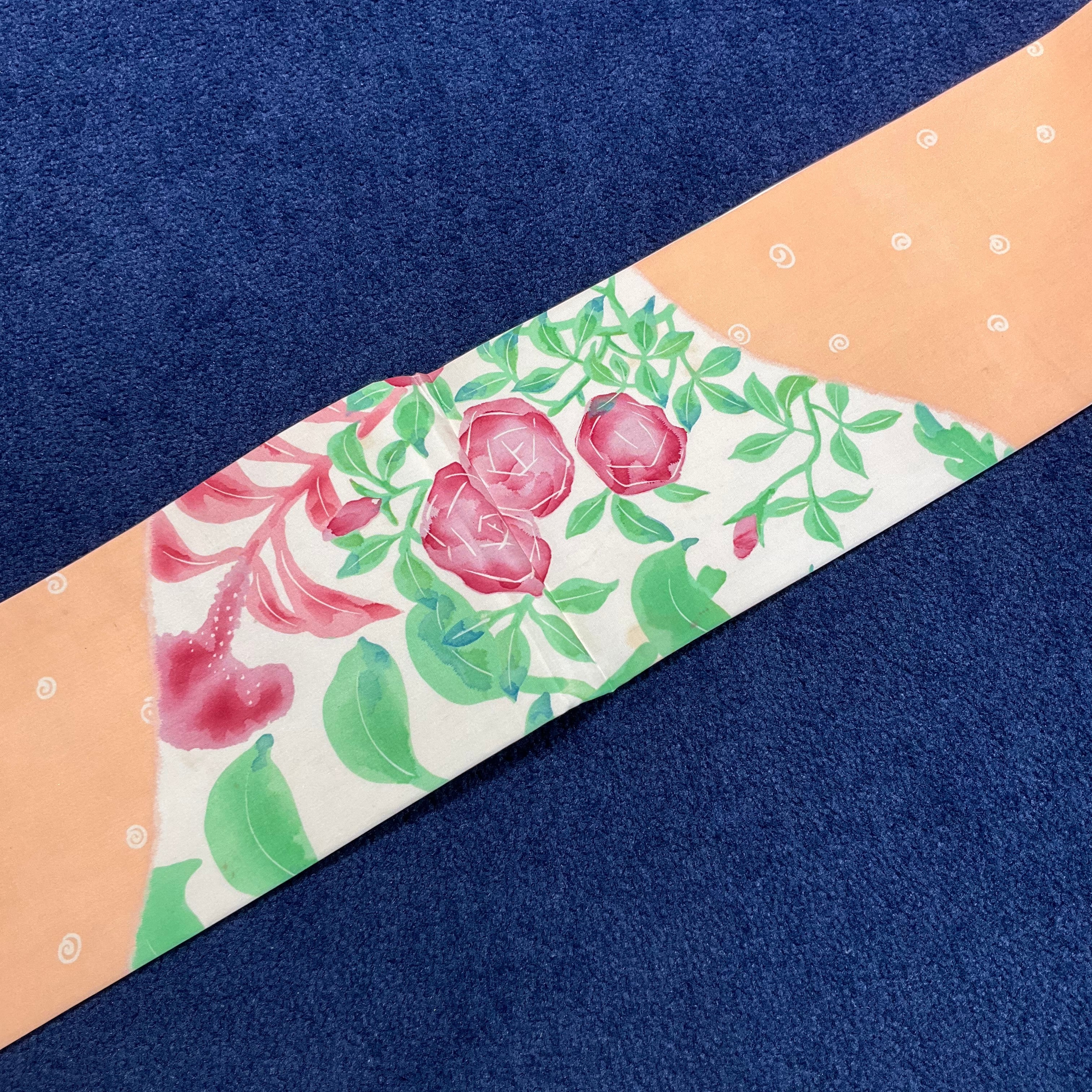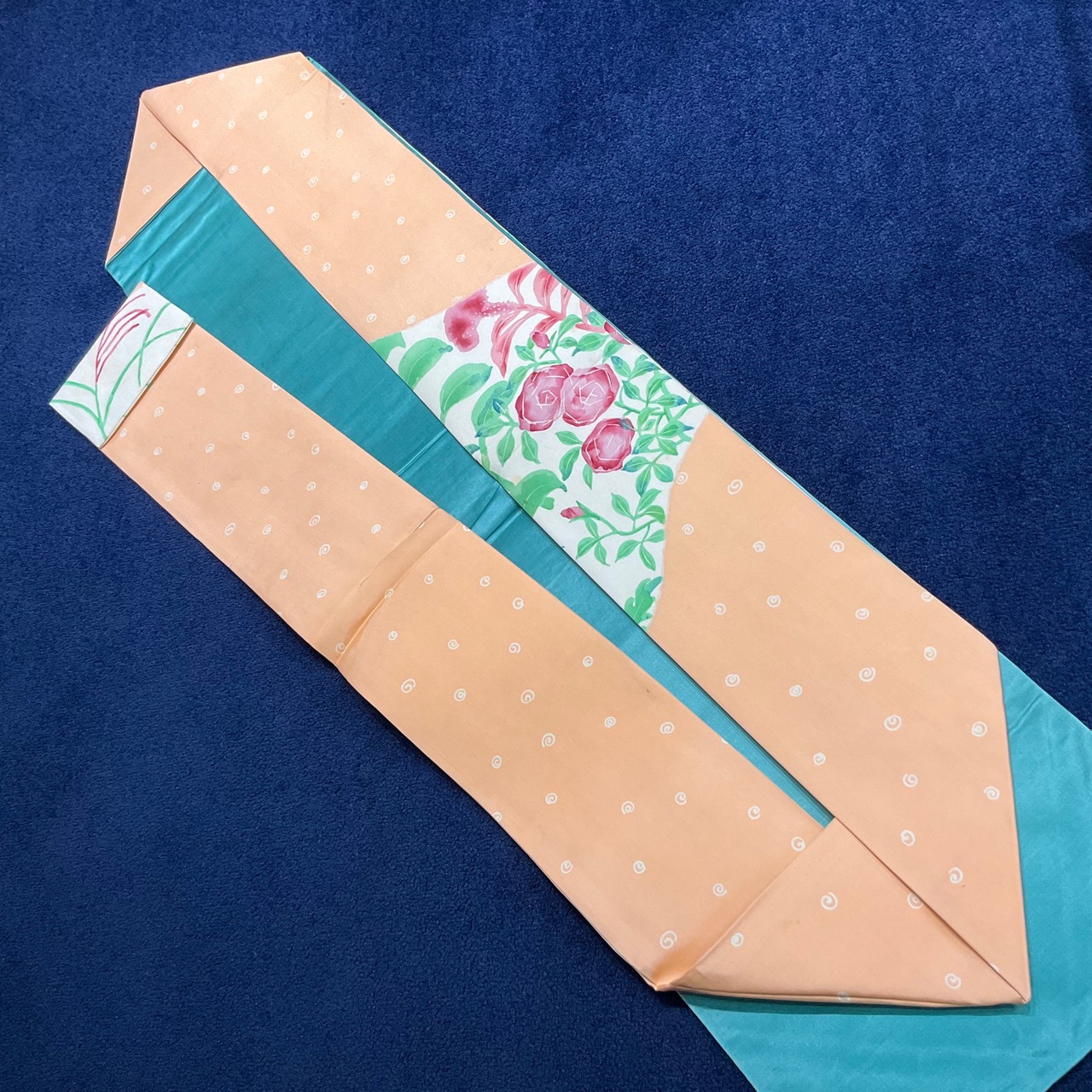 サーモンピンク地に、チューリップ、薔薇、紫陽花、鶏頭が描かれた季節問わずに使える染めのアンティーク名古屋帯です ✨️