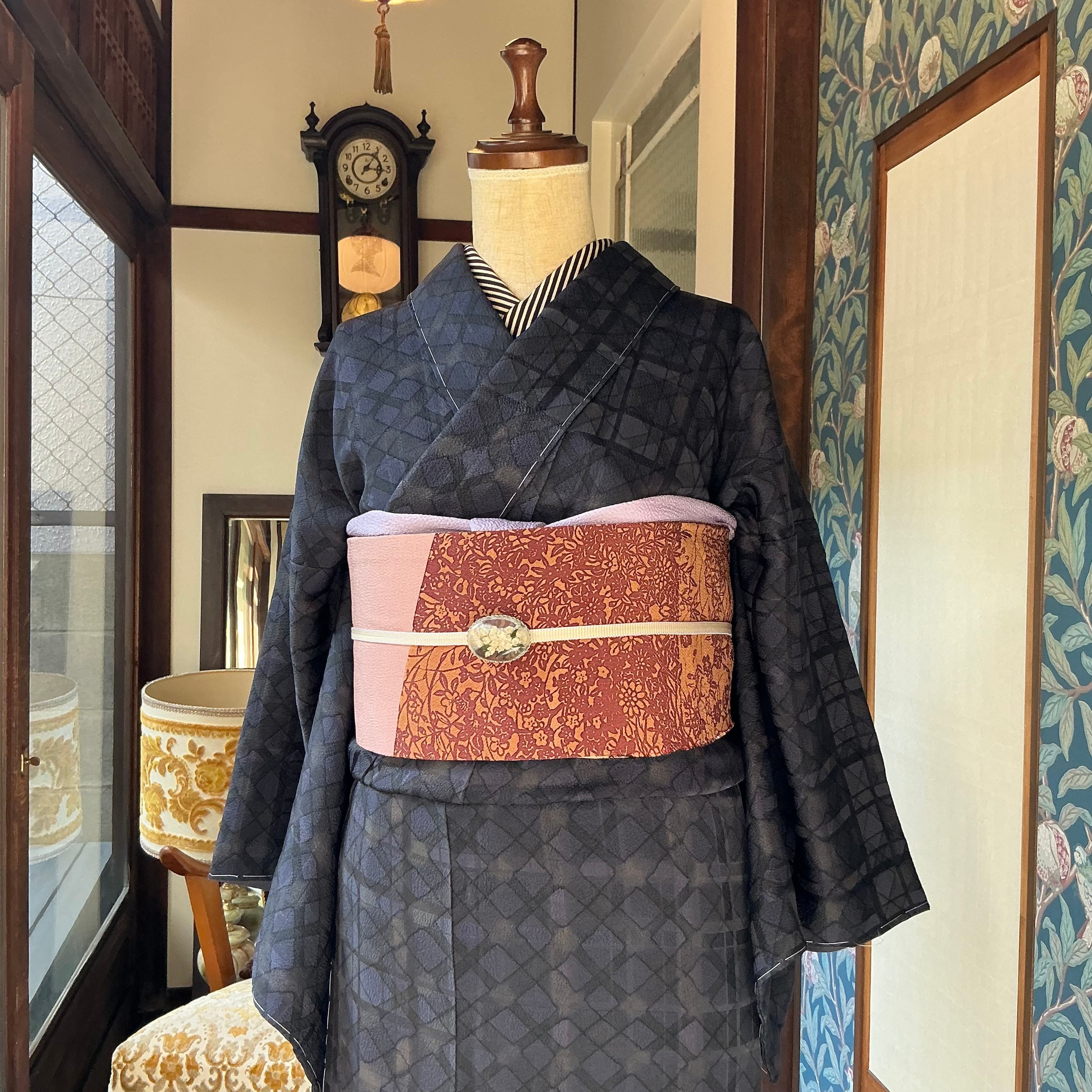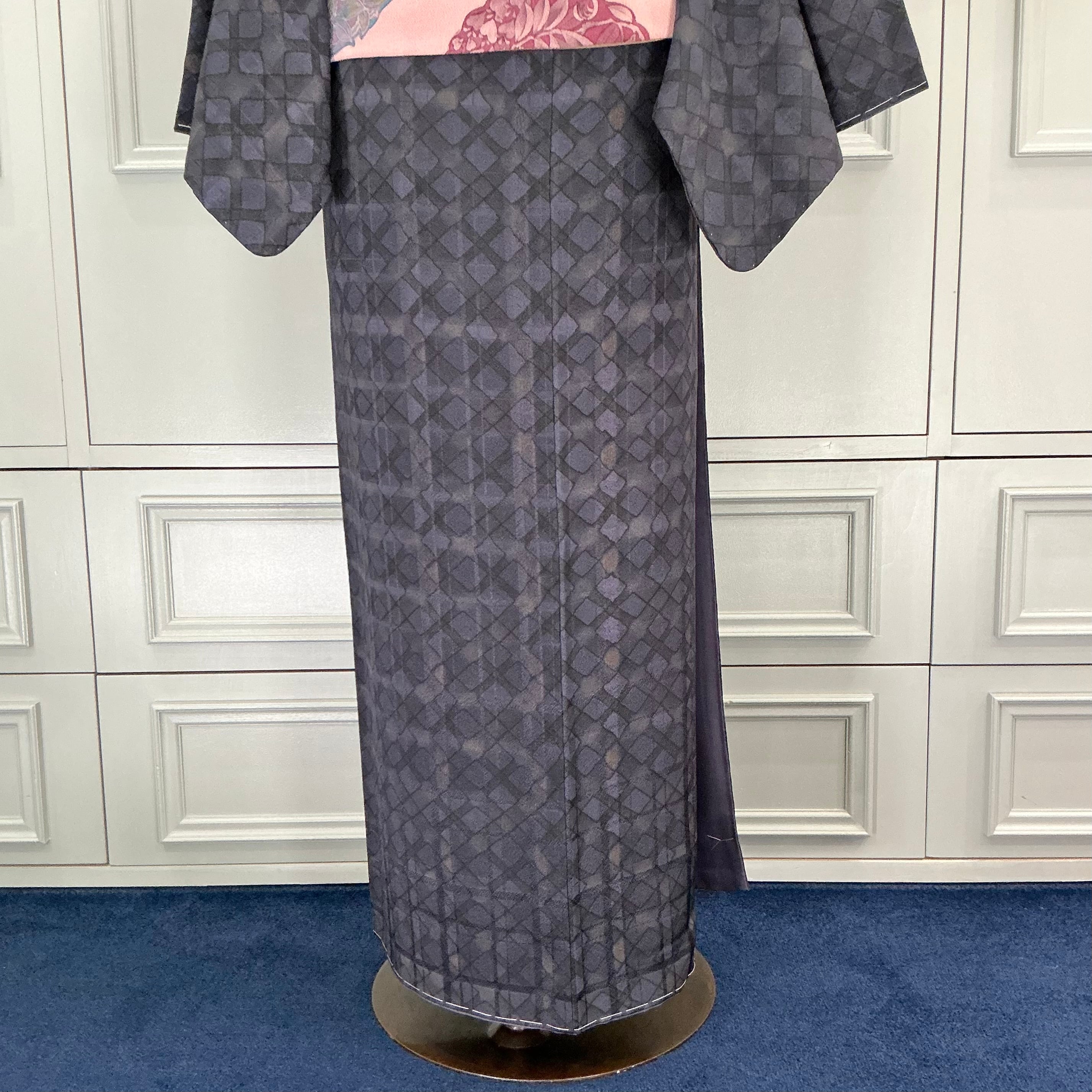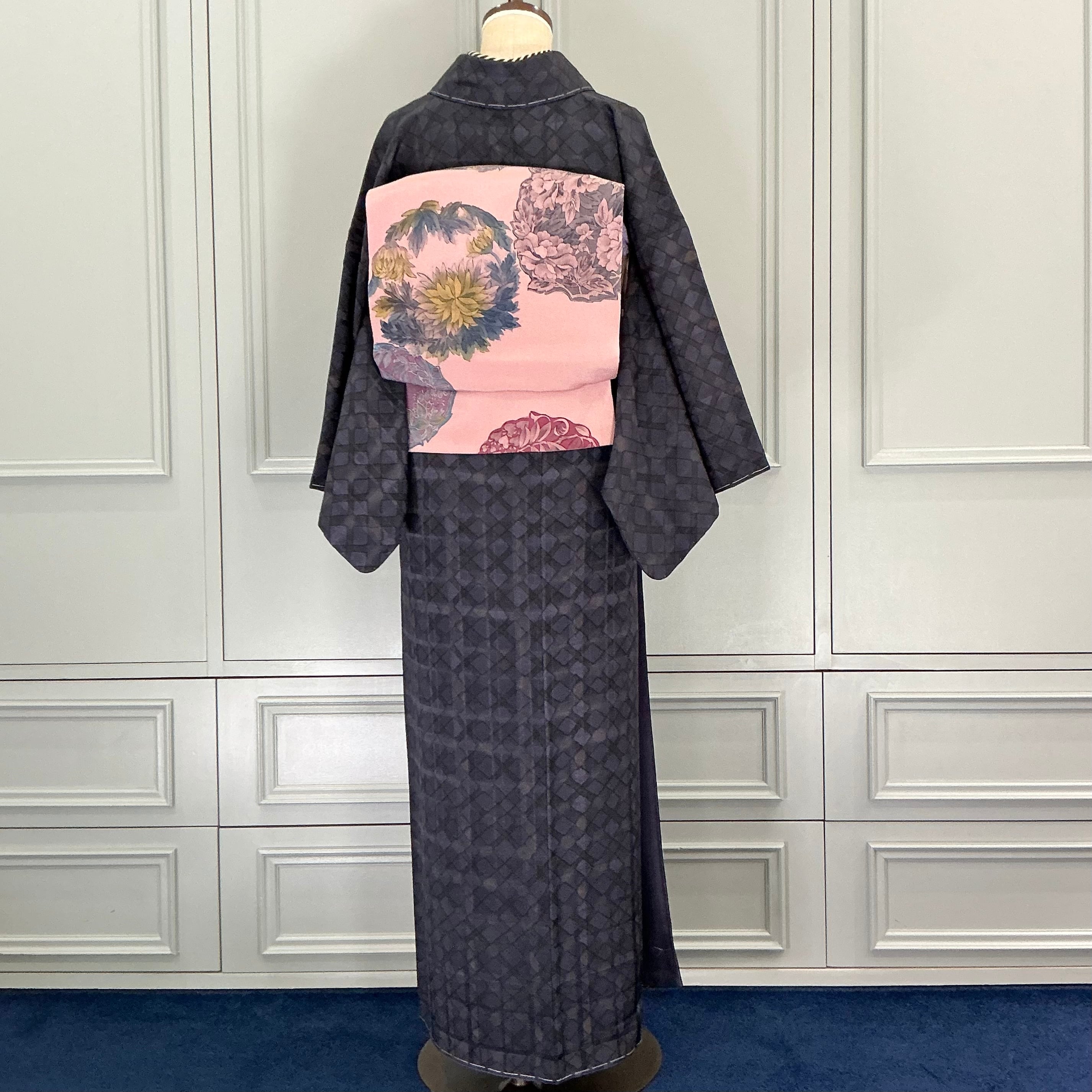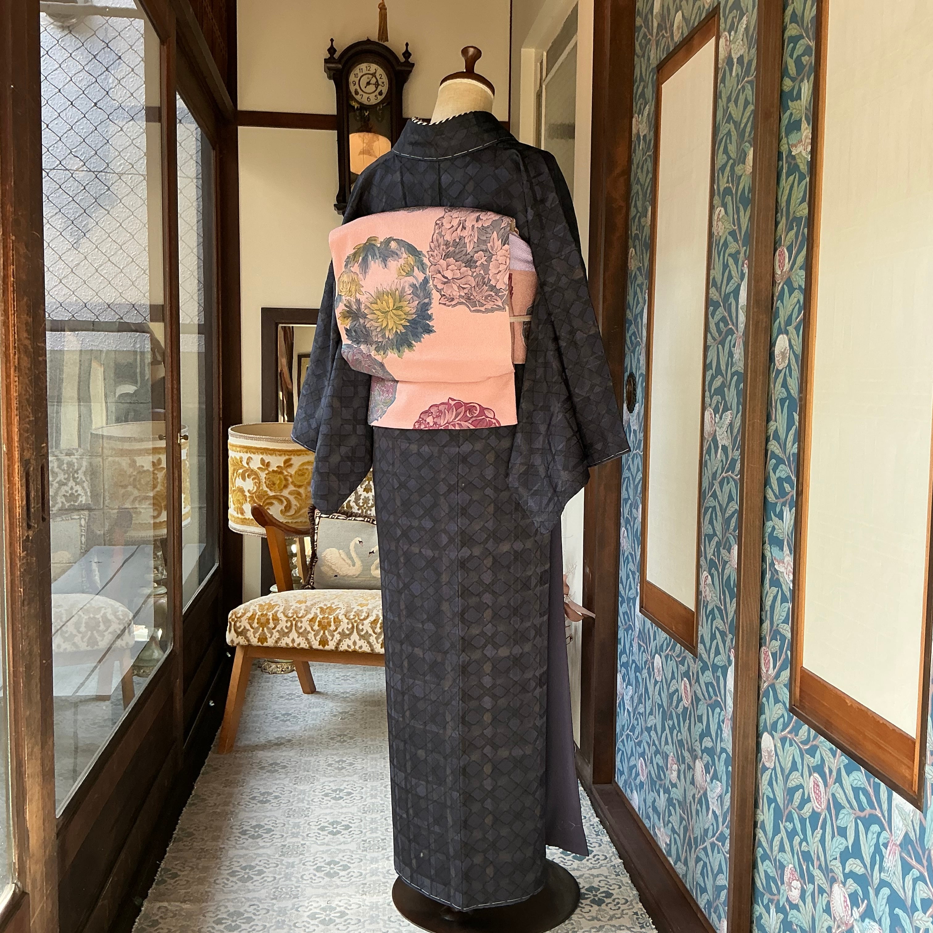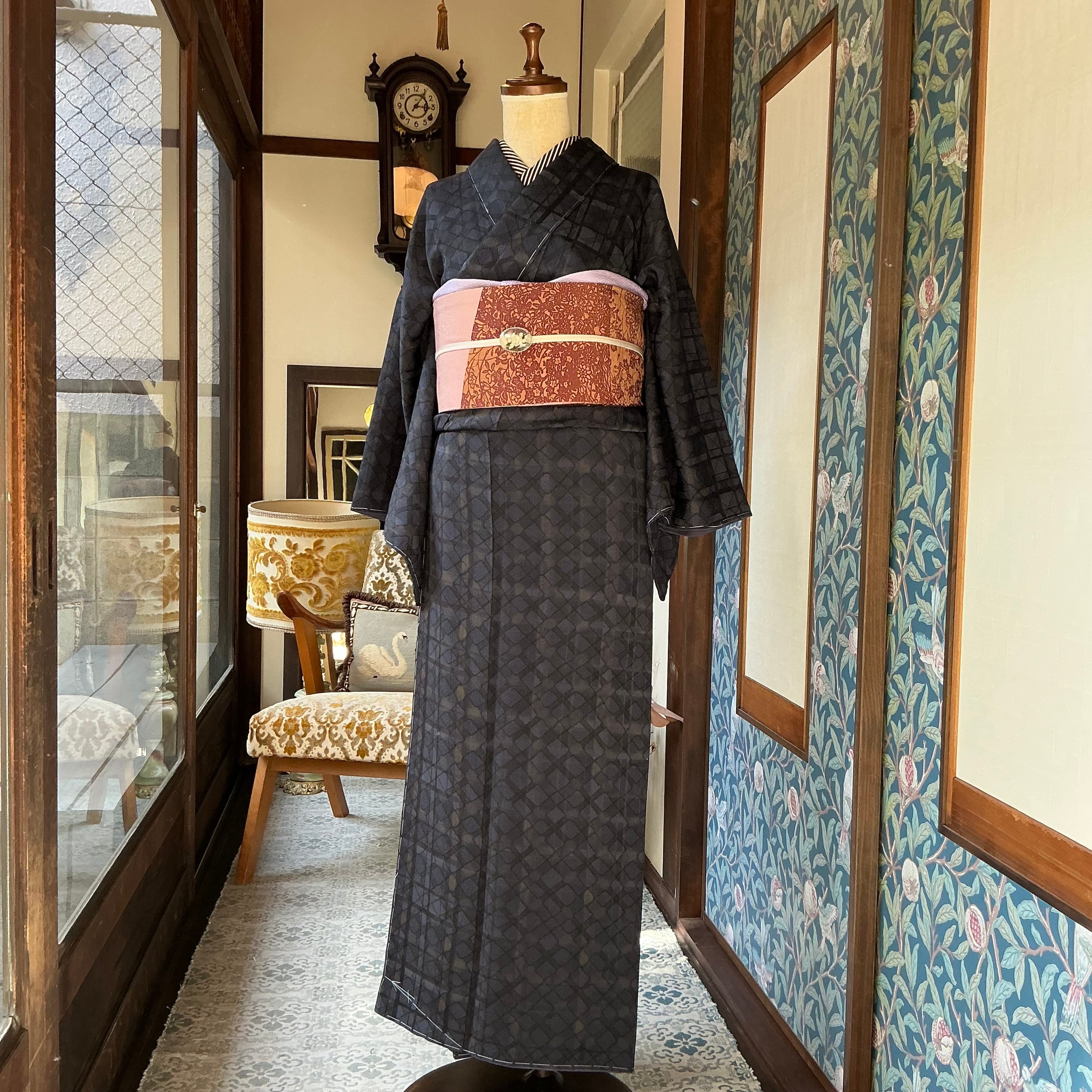 ブラック×ネイビーの菱形と格子柄の小紋着物です