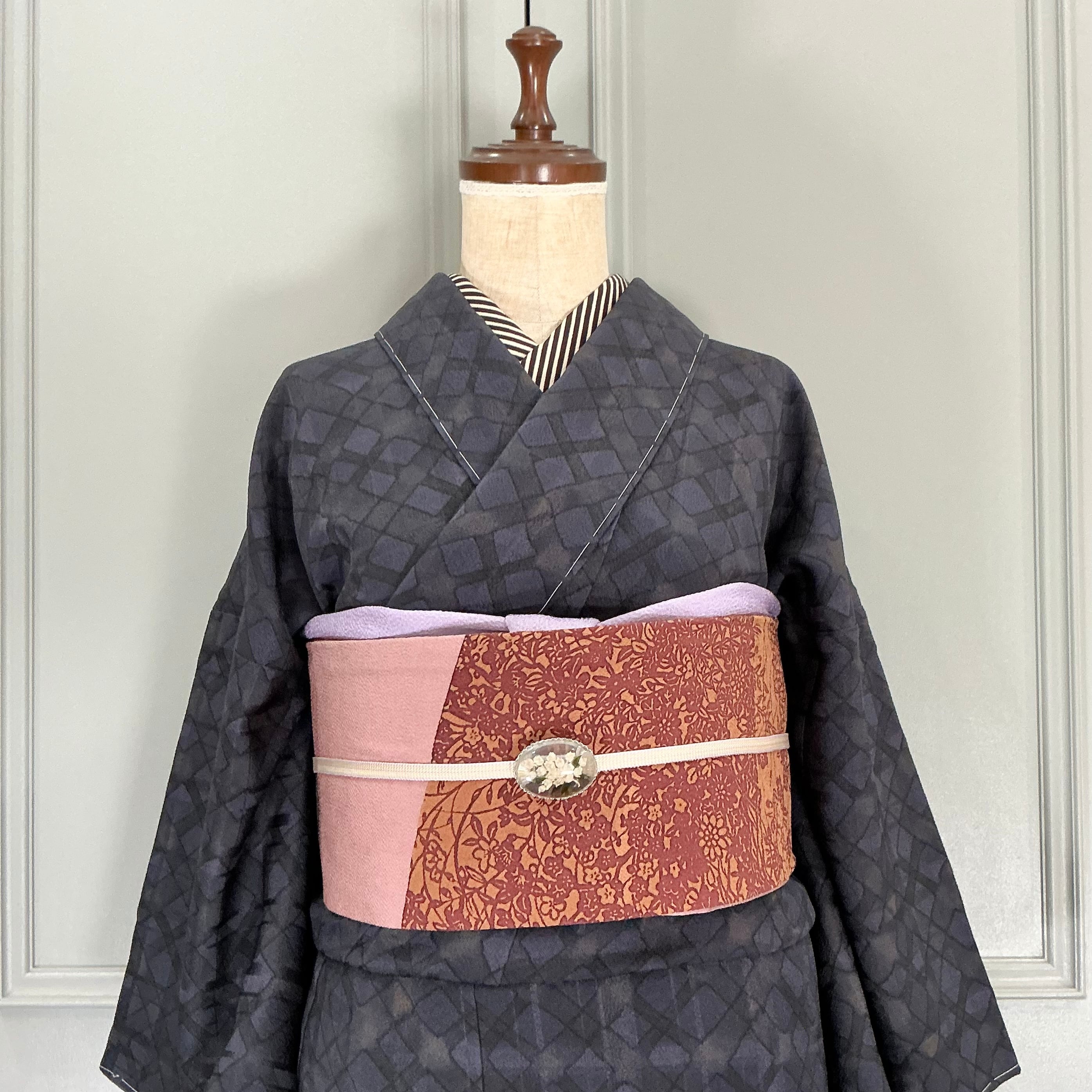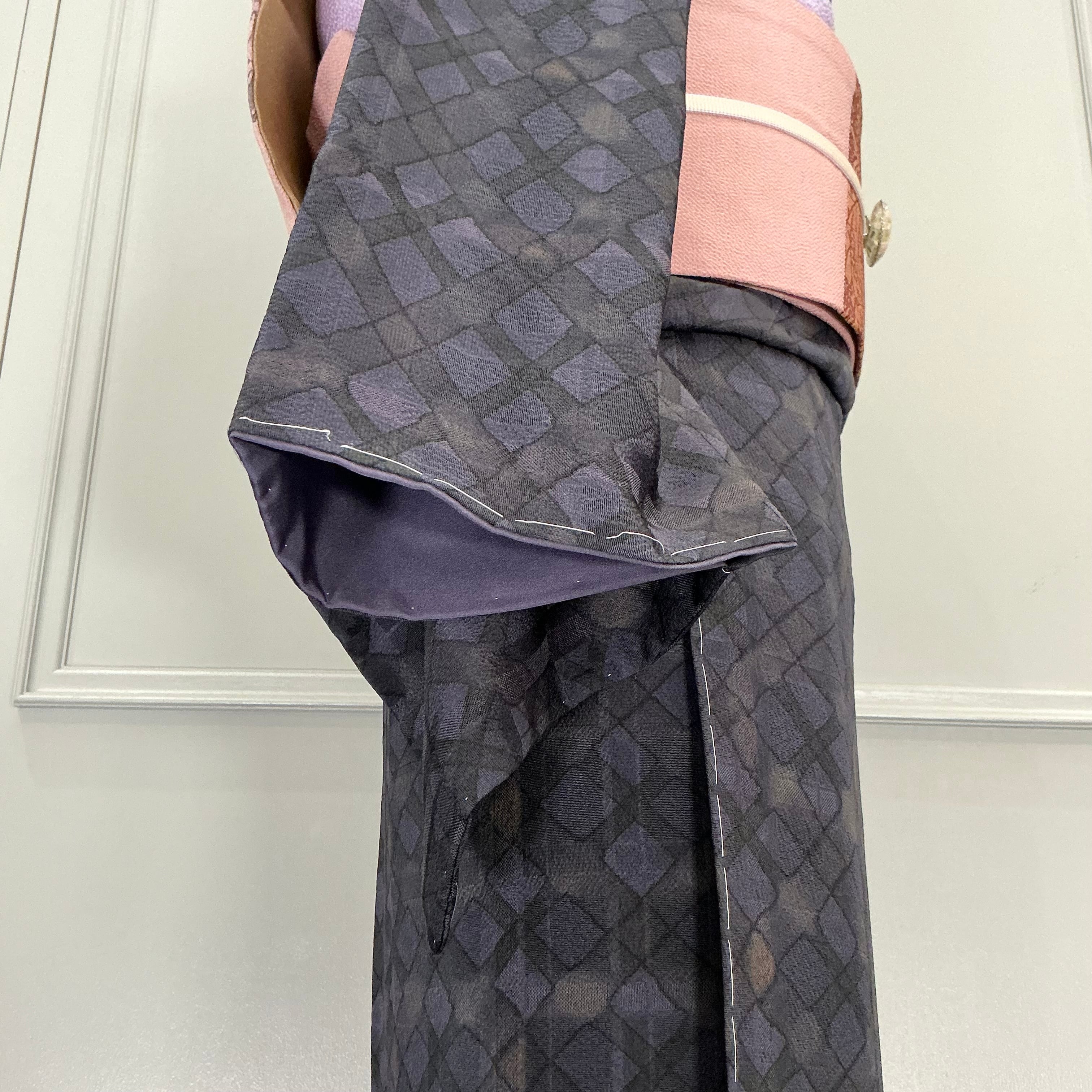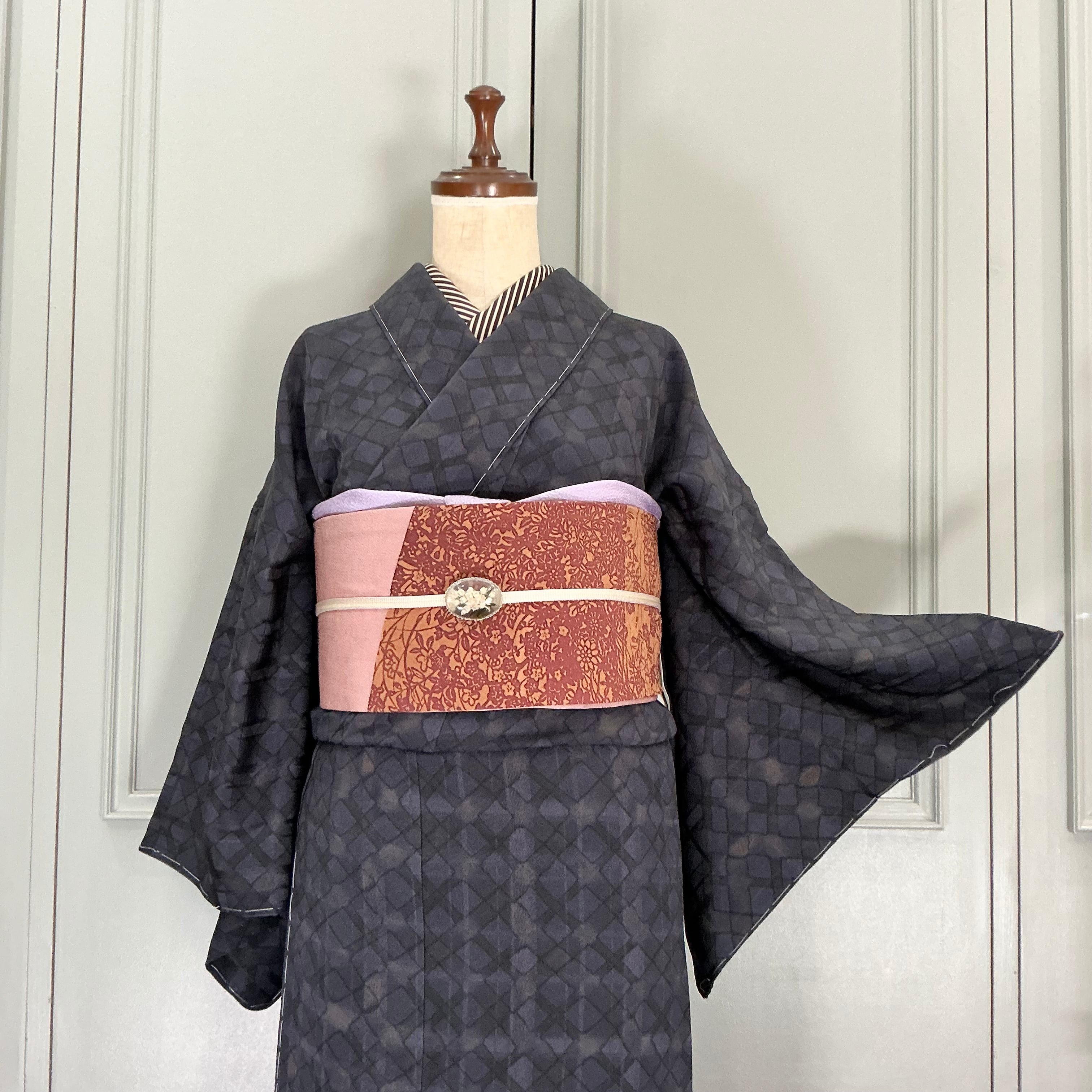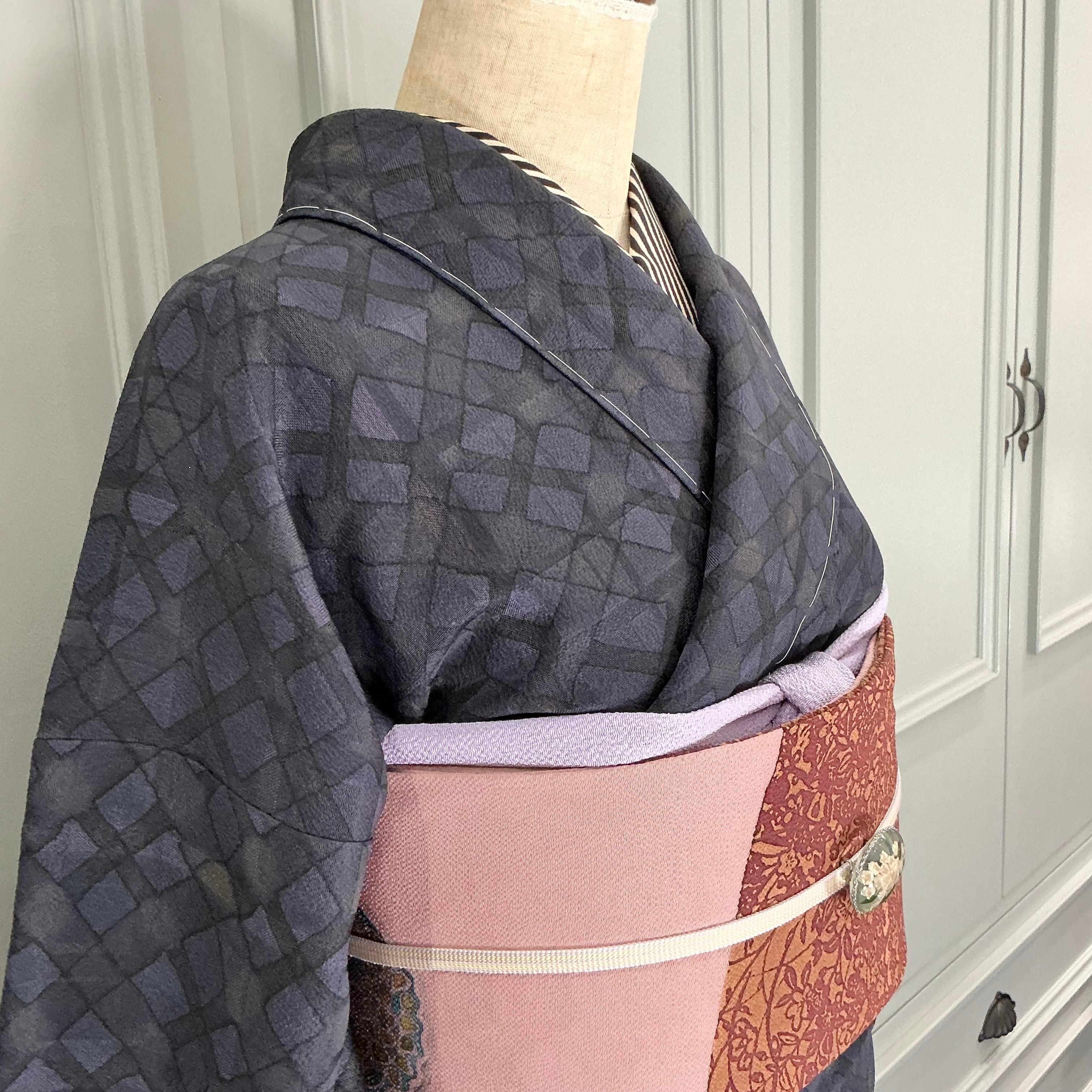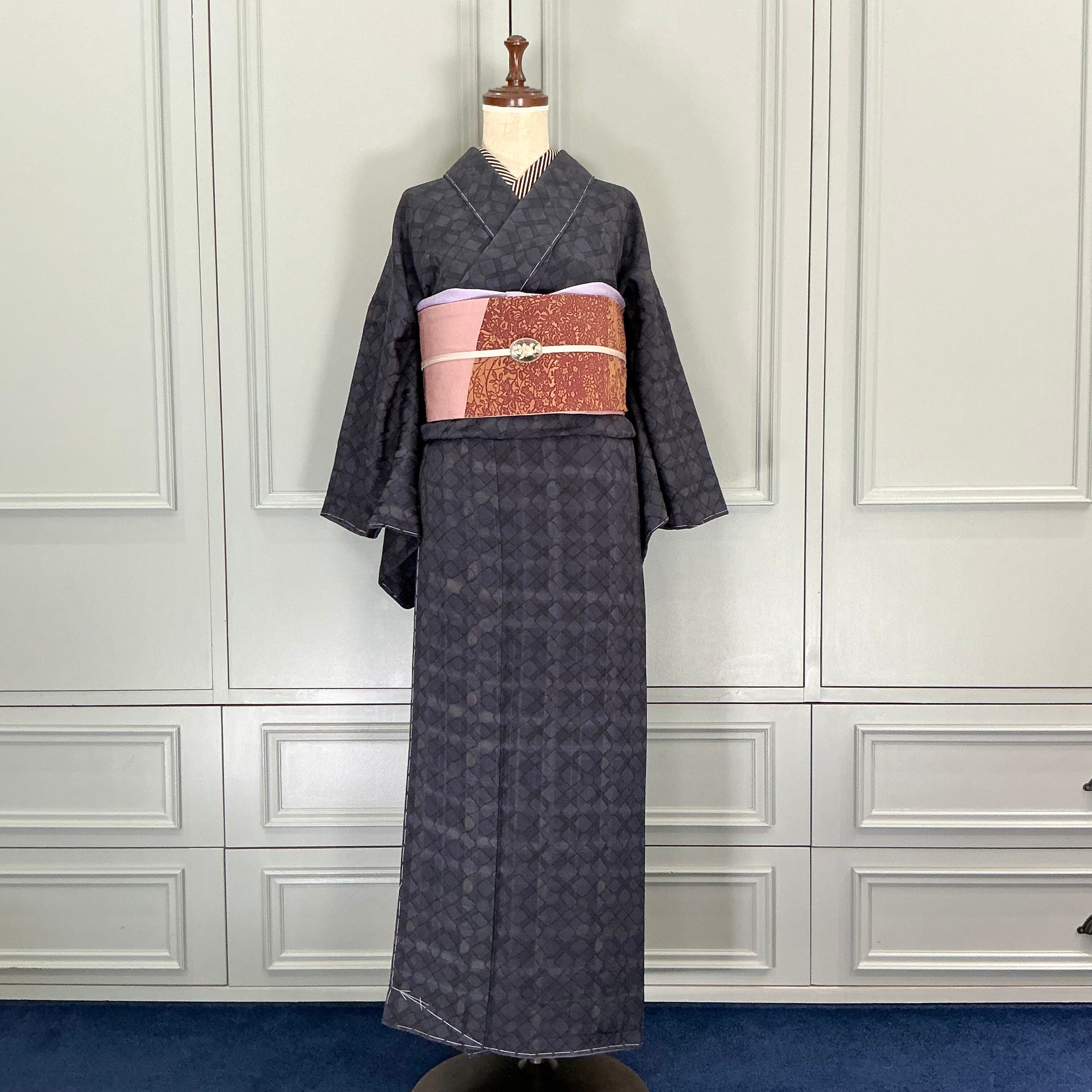 ブラック×ネイビーの菱形と格子柄の小紋着物です