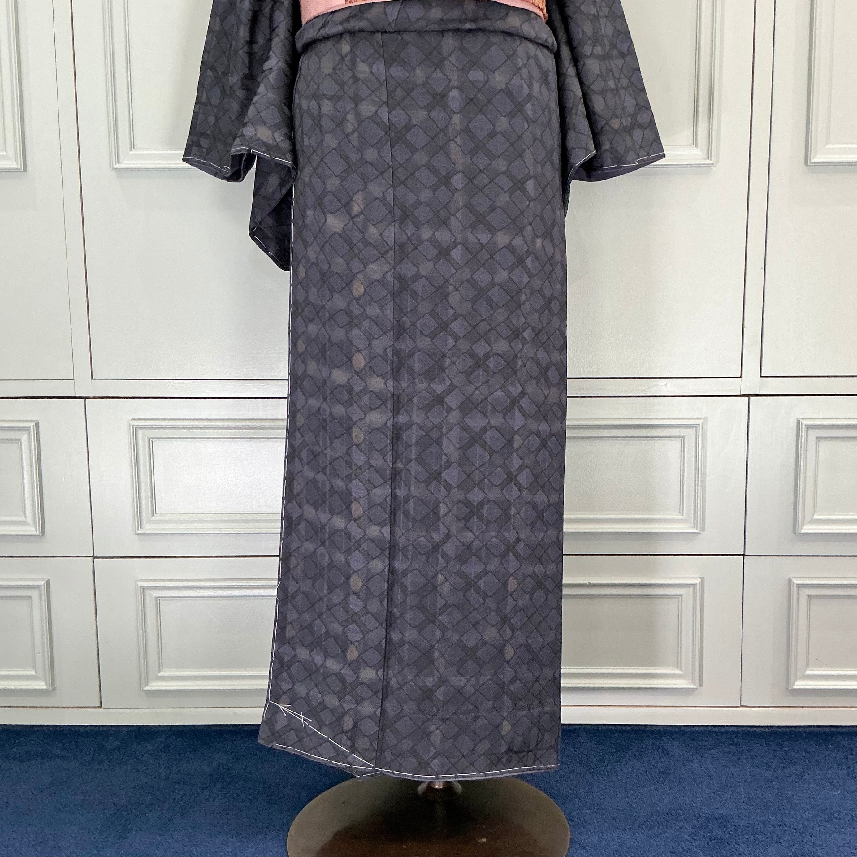 long*銀河の格子路*菱形 格子 モダン 幾何学 墨色 濃紺 小紋着物 B569