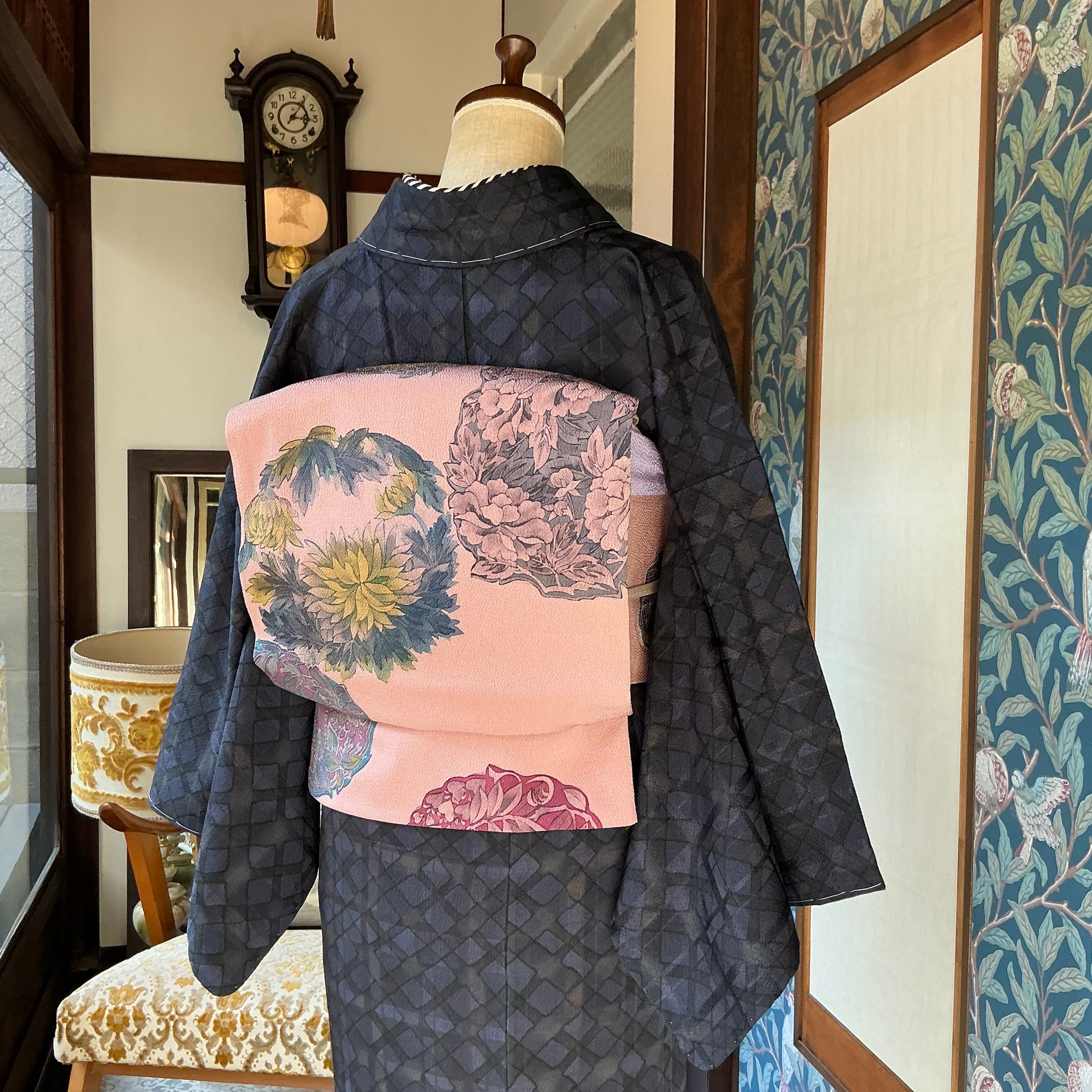 深い墨色の地に、濃紺の菱形が連なった幾何学模様の小紋で、モダンな雰囲気がとてもおしゃれですね✨️