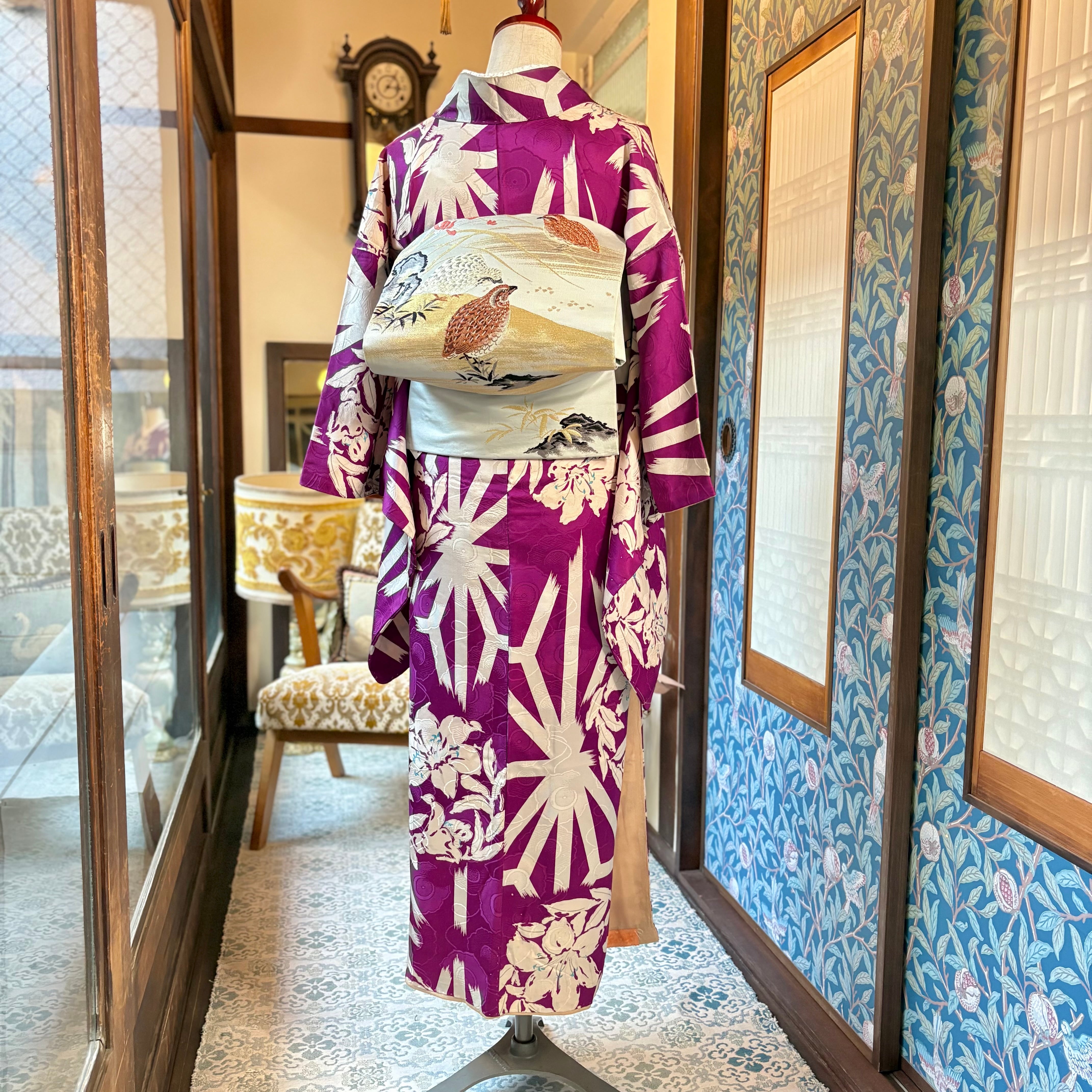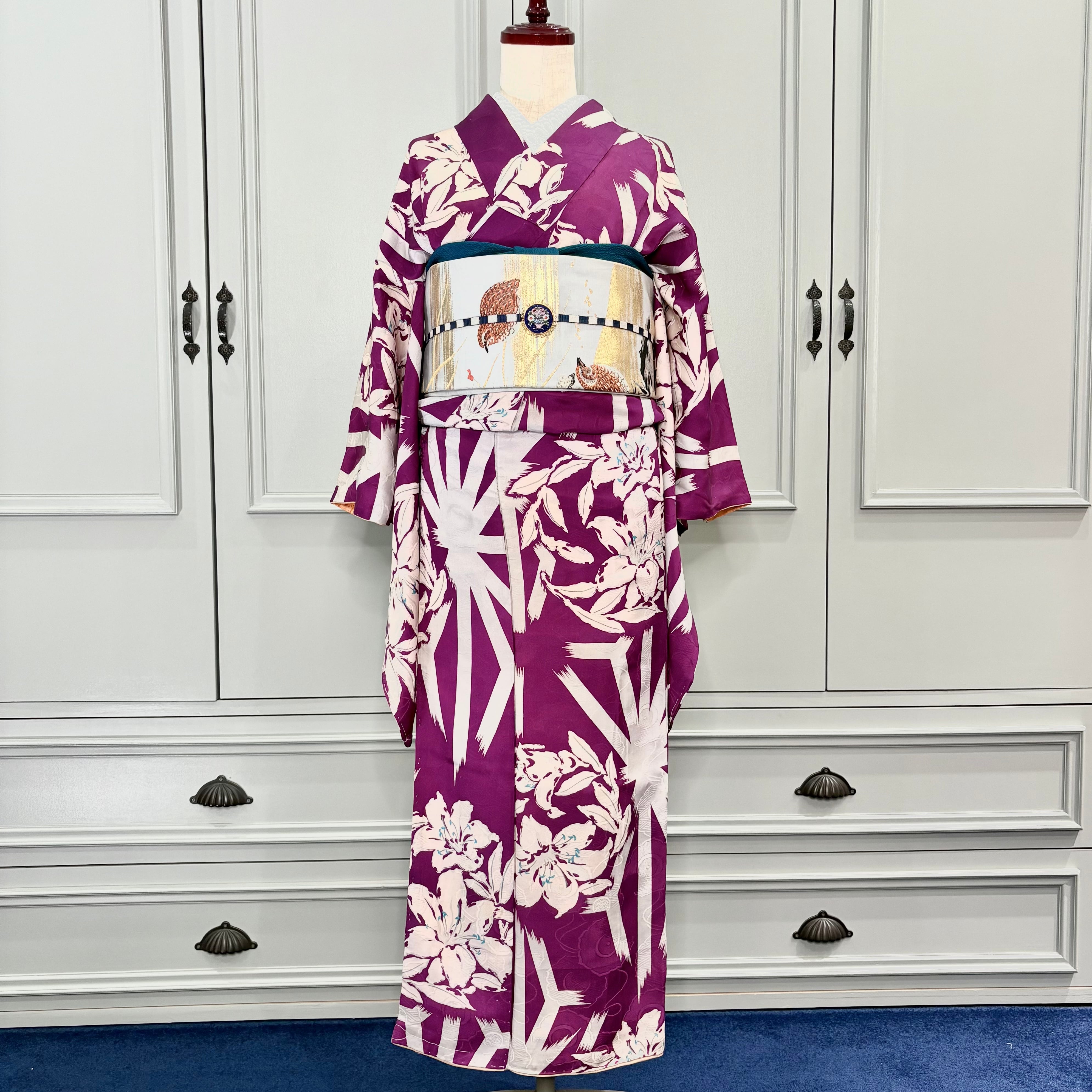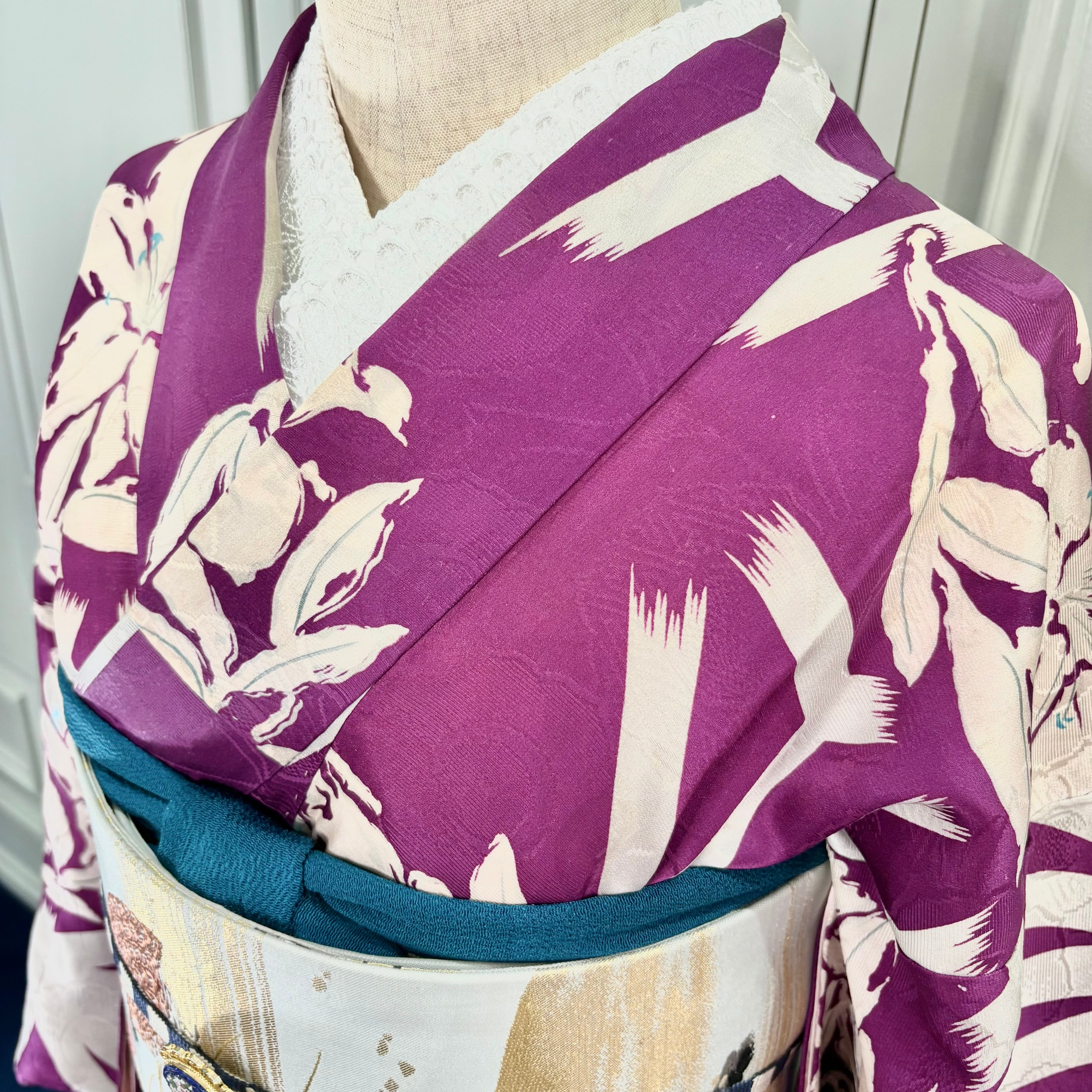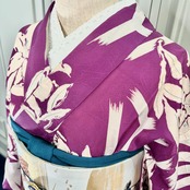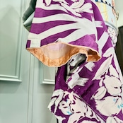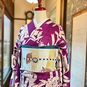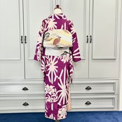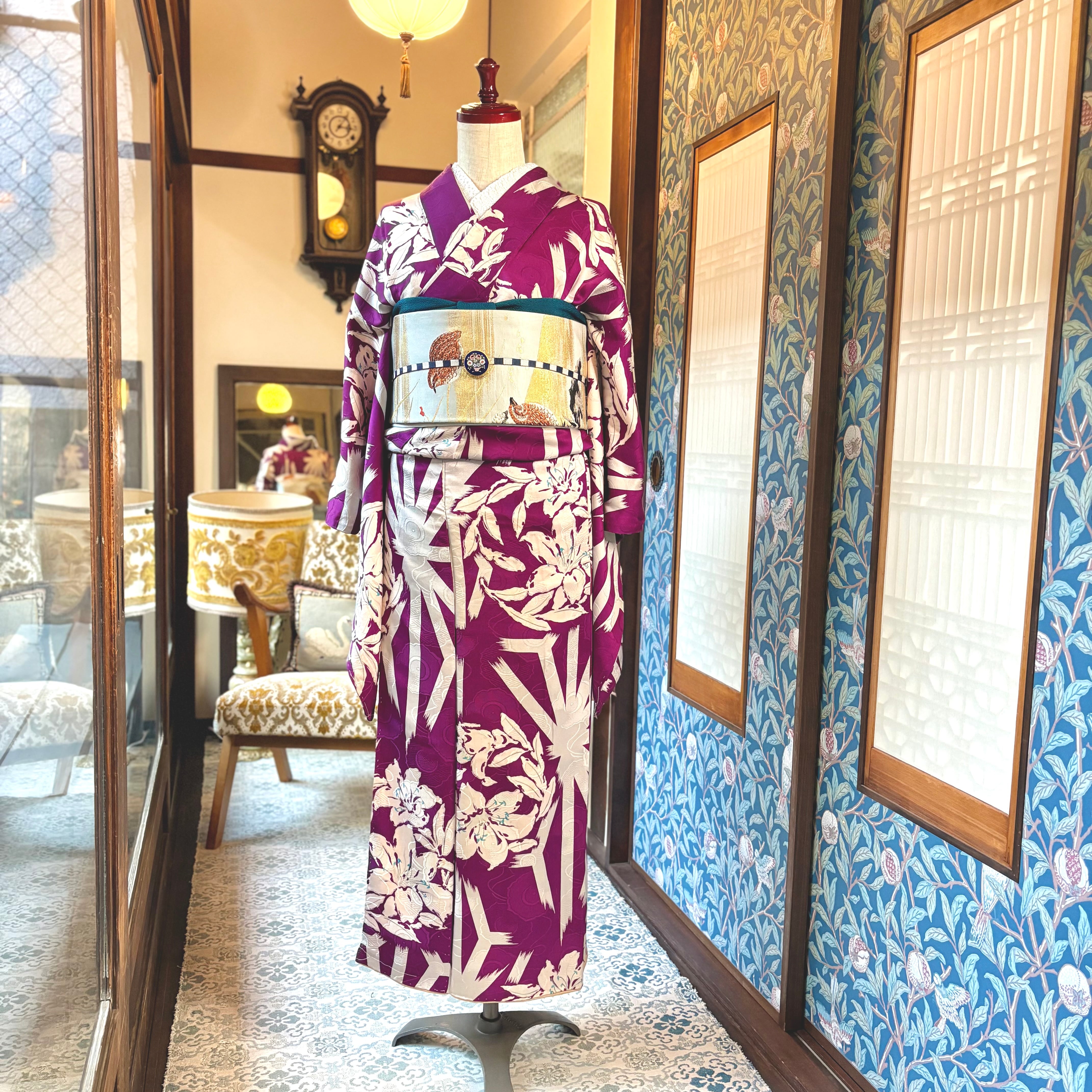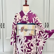 アンティークらしい明るめパープルカラーに、白で描かれた百合と麻の葉が映えるモダンな一着✨️