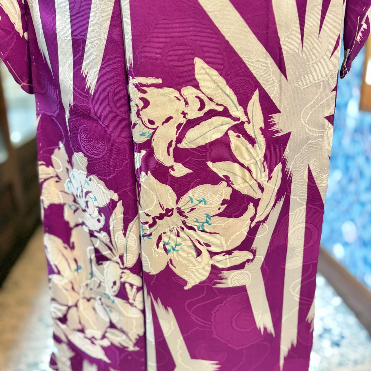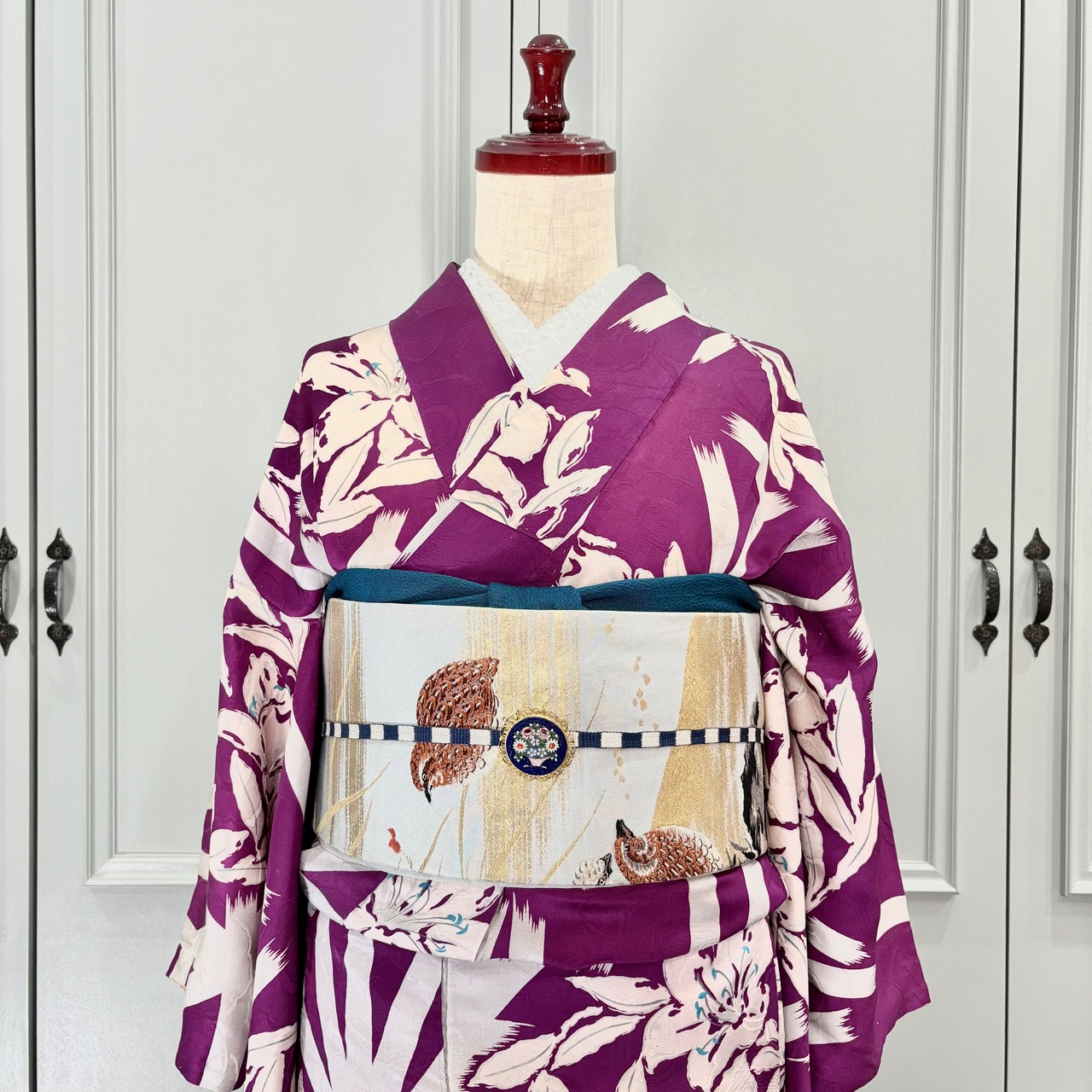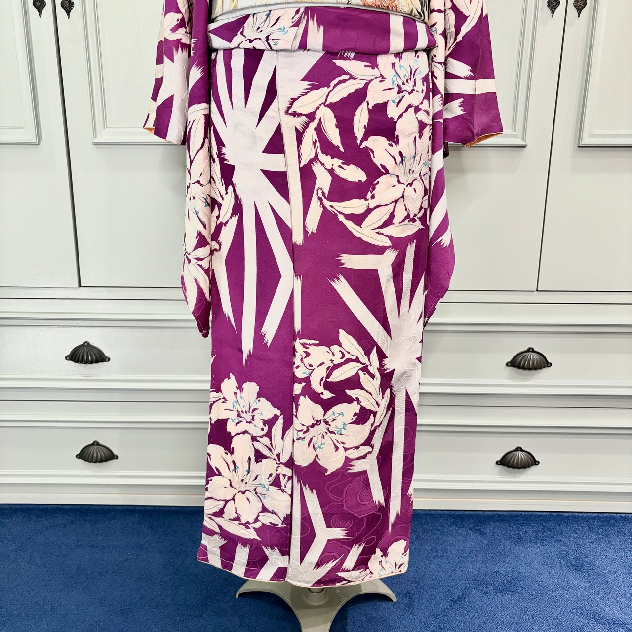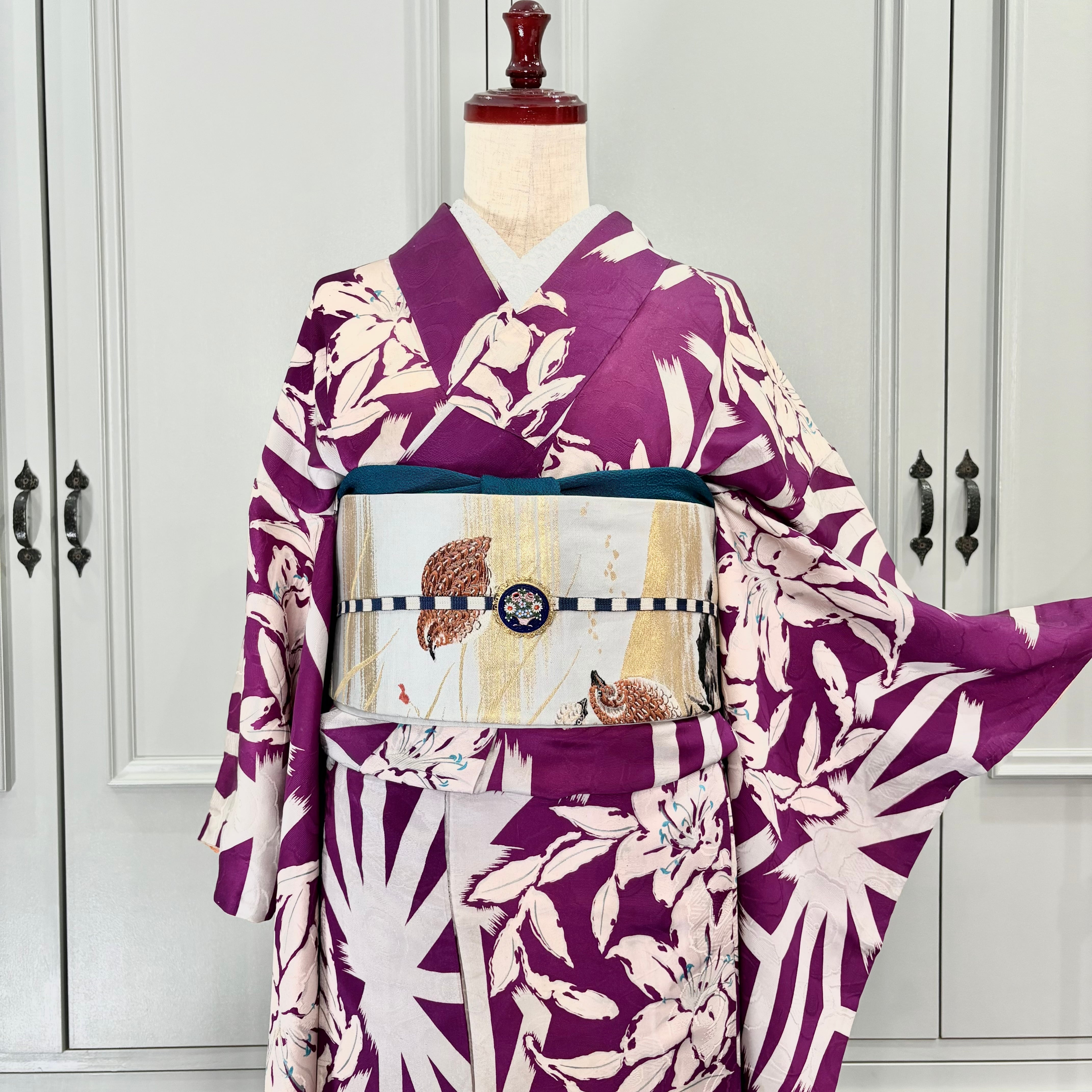アンティークらしい明るめパープルカラーに、白で描かれた百合と麻の葉が映えるモダンな一着✨️