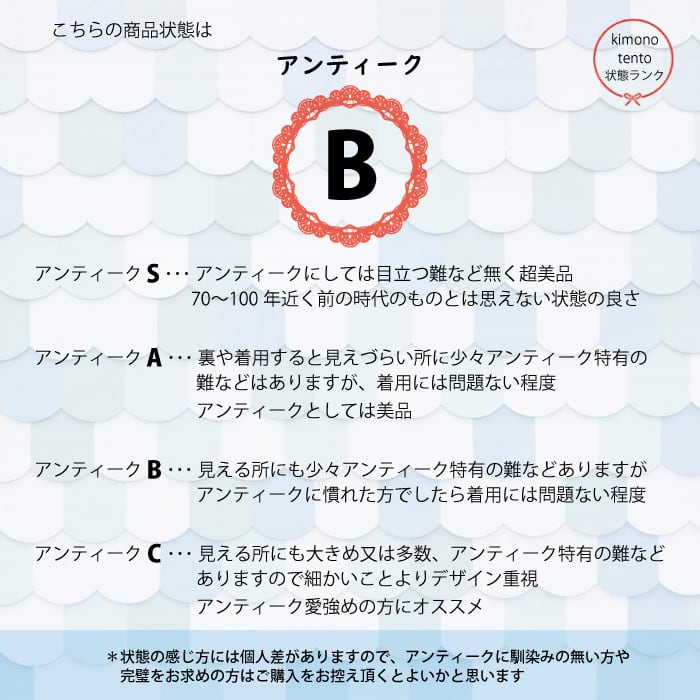 アンティーク A ・・・ 裏や着れば見えづらい所に少々アンティーク特有の難などはありますが、着用には問題ない程度!アンティークとしては美品と言えます✨