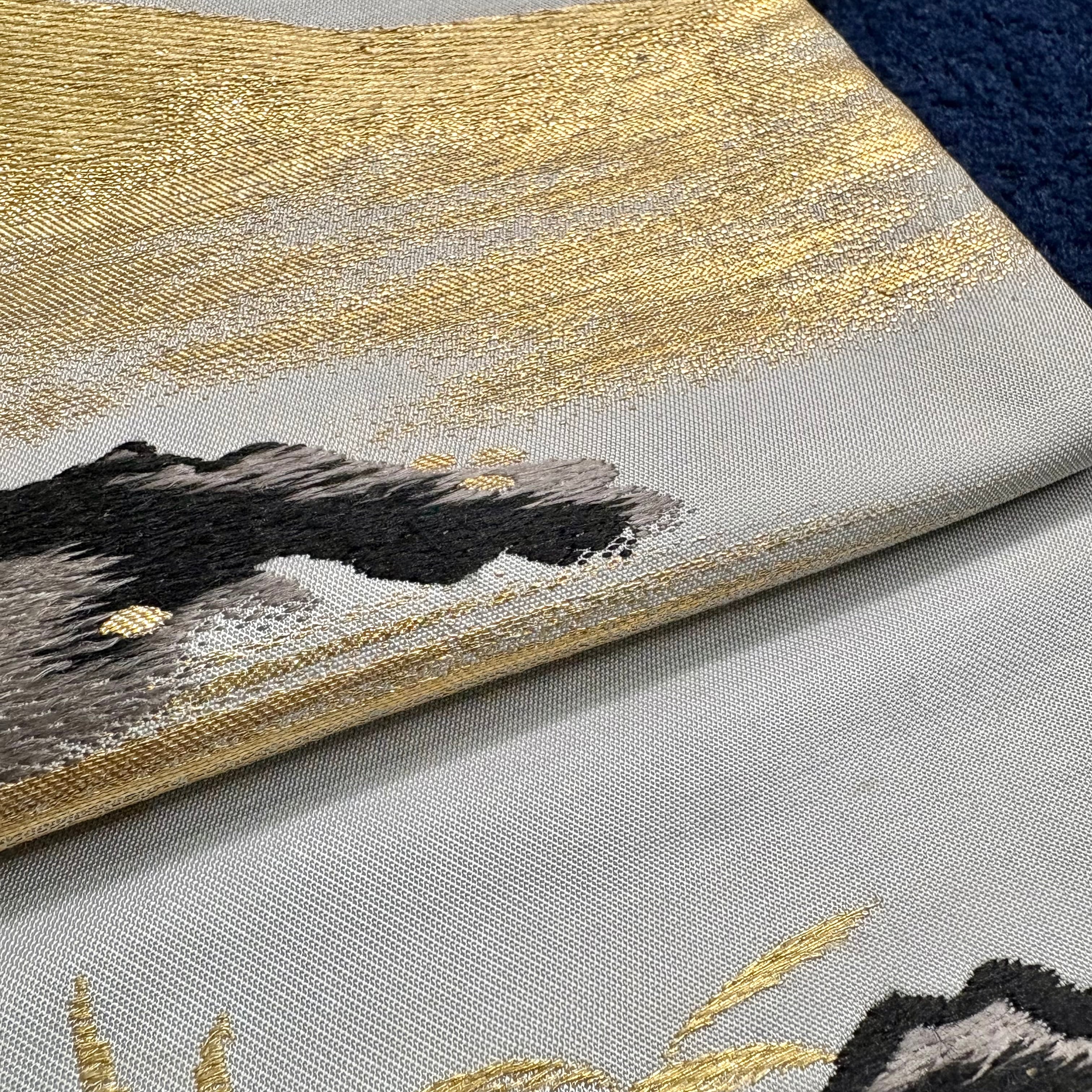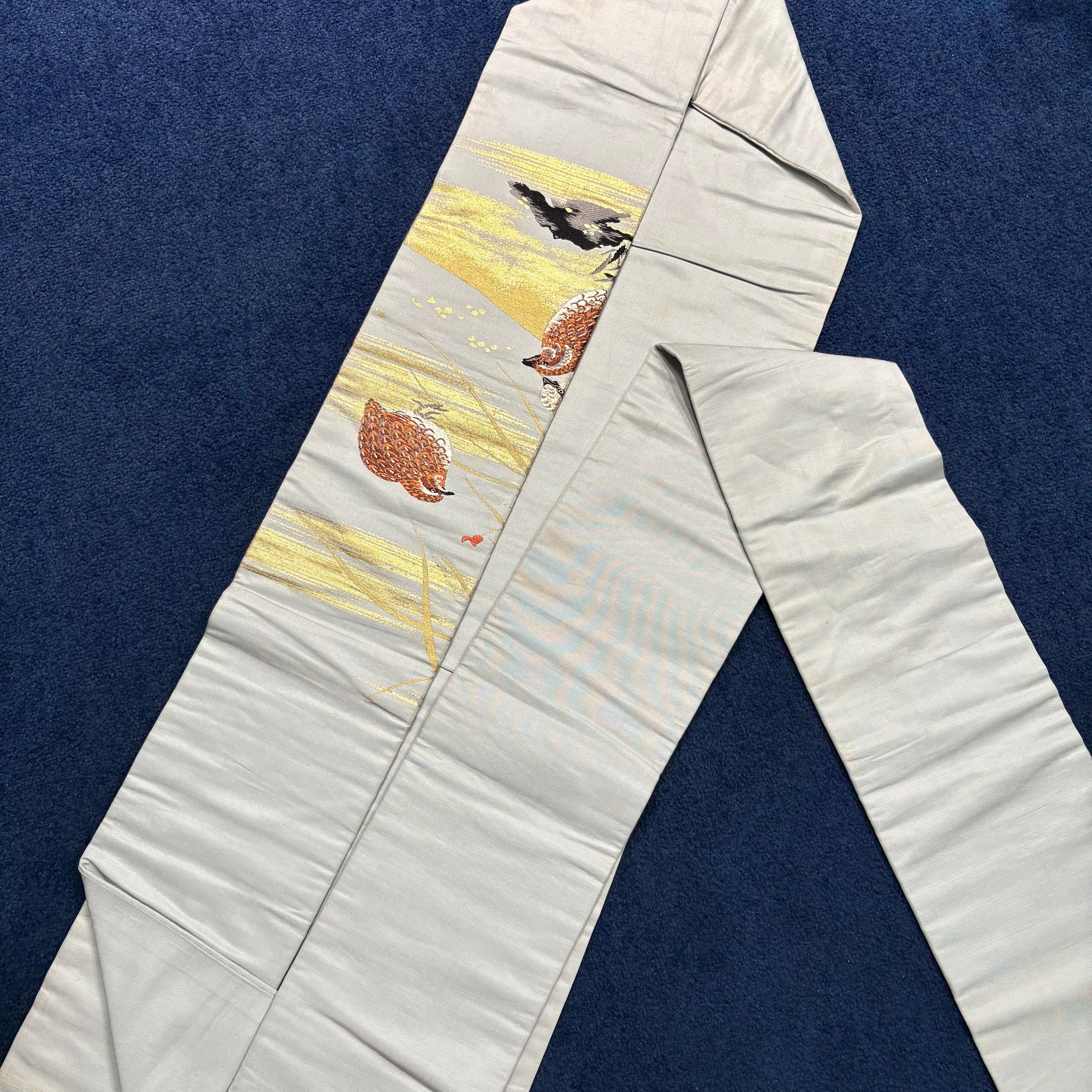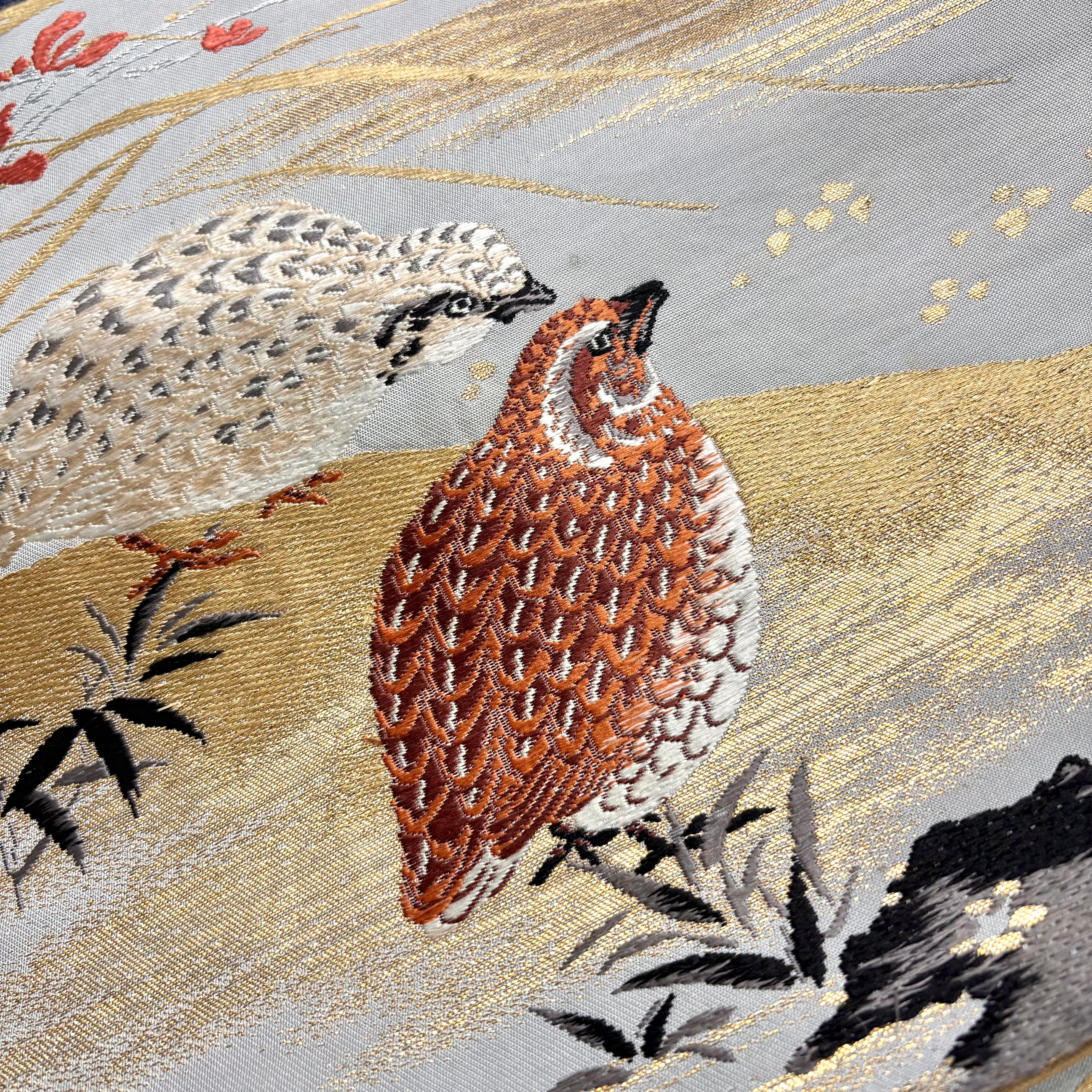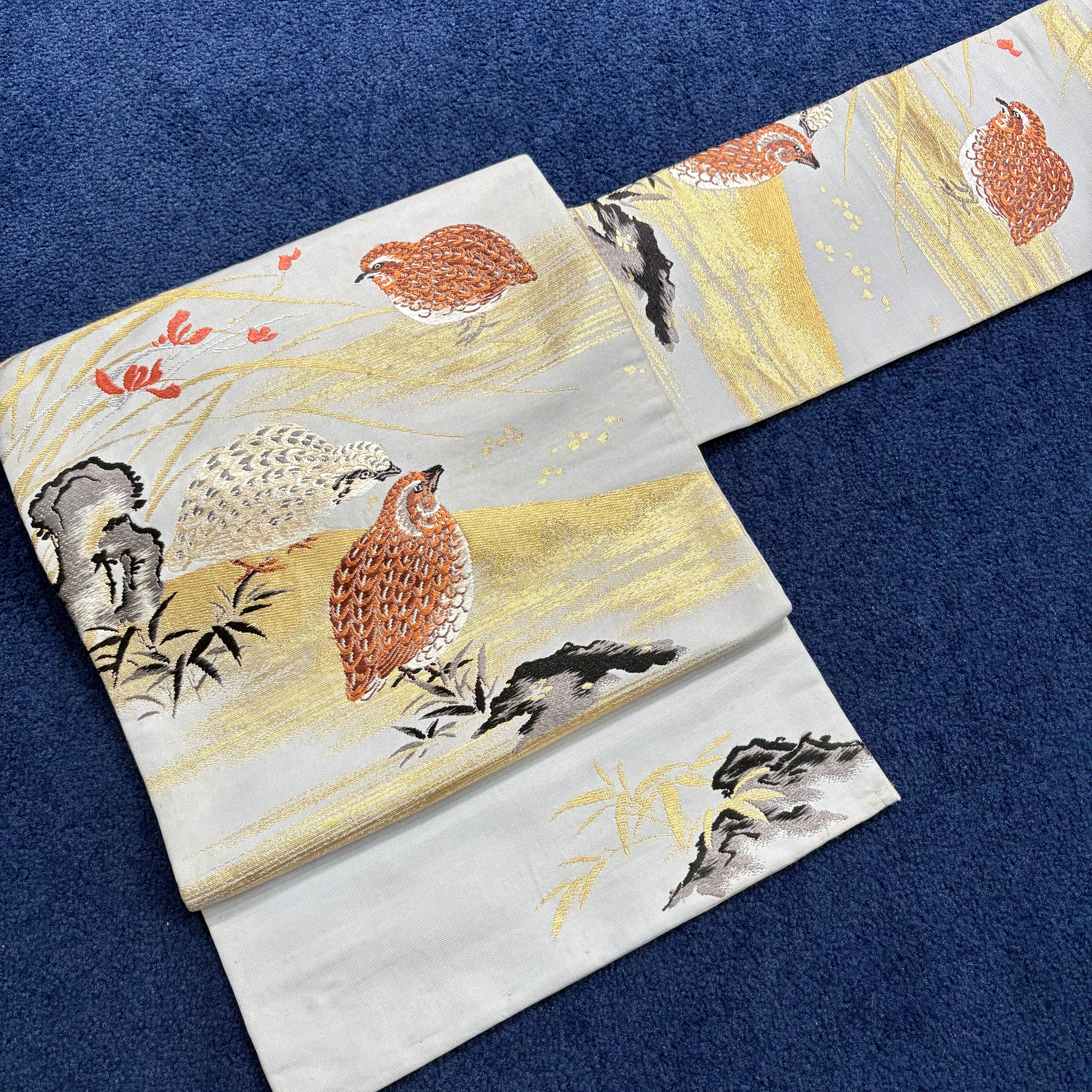 羽の模様まで細かく表現され、生き生きとしたうずらの鳴き声が聞こえてきそうな素敵な帯です。