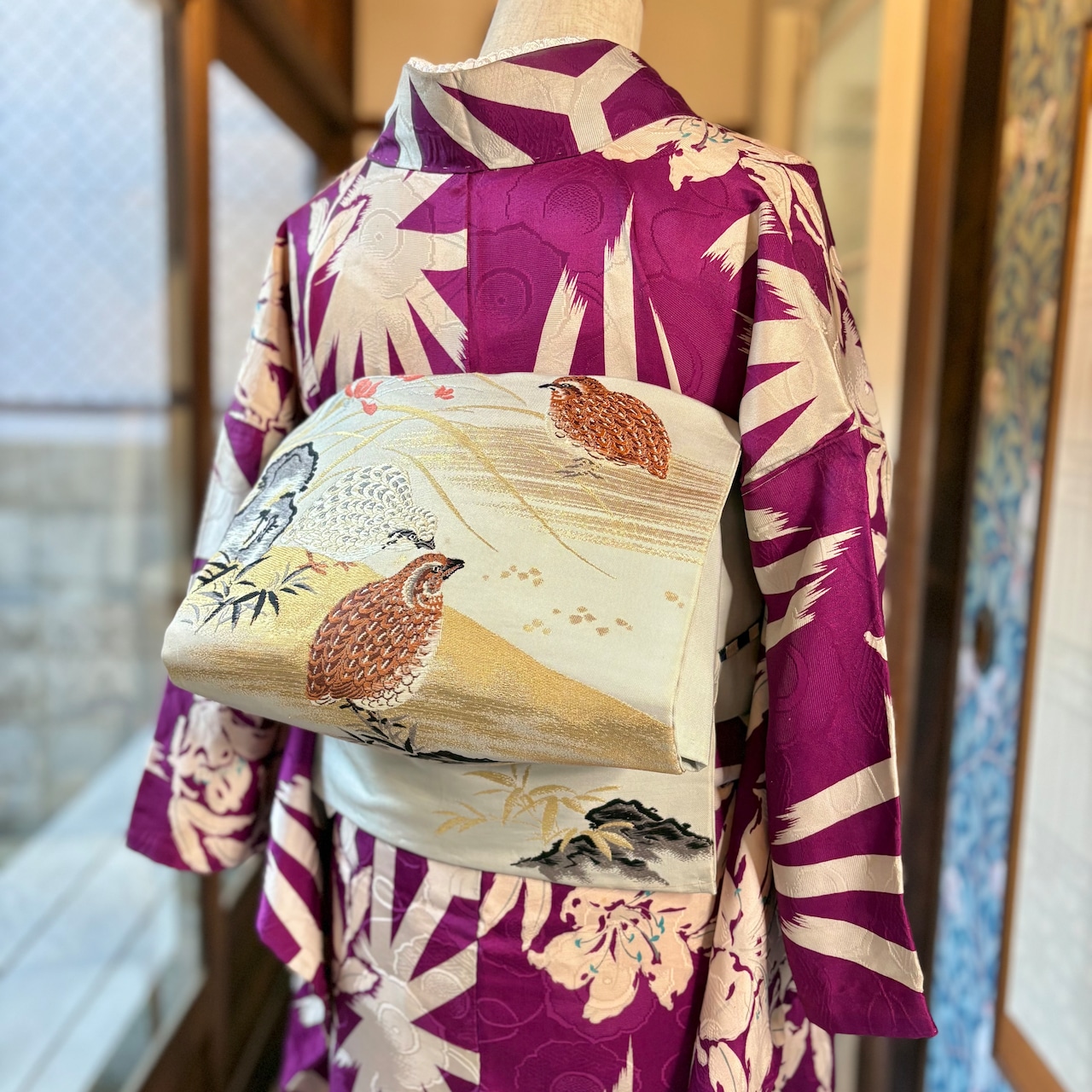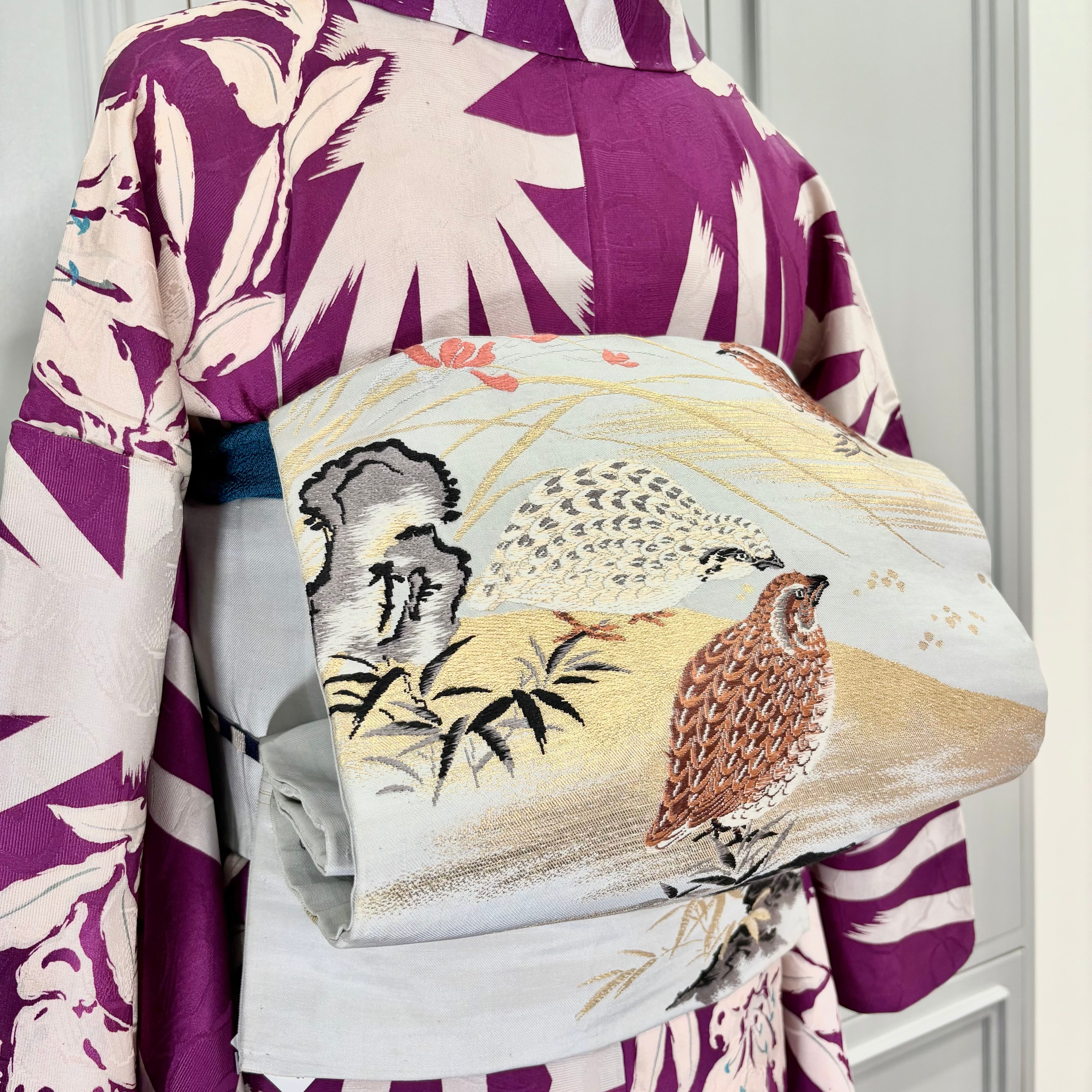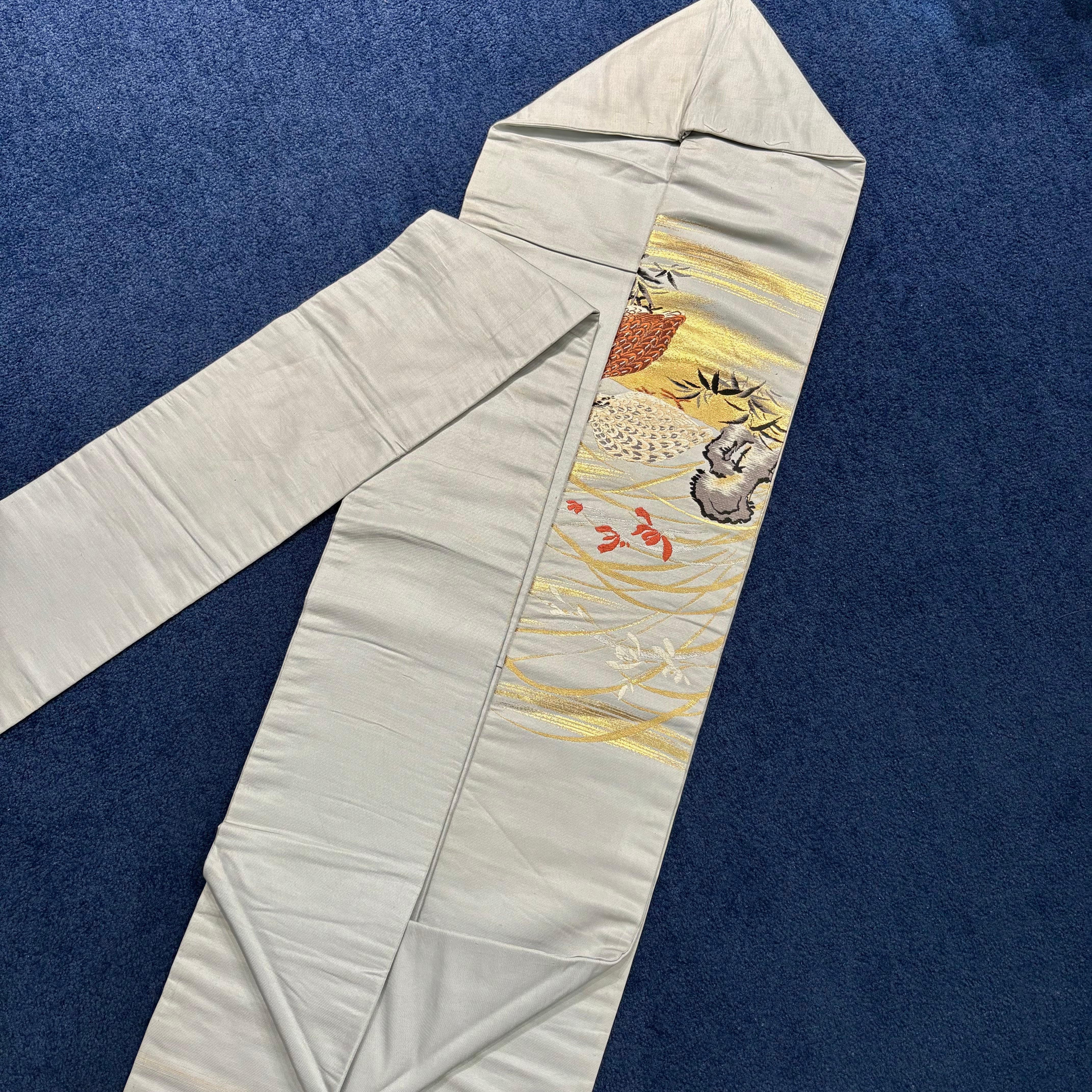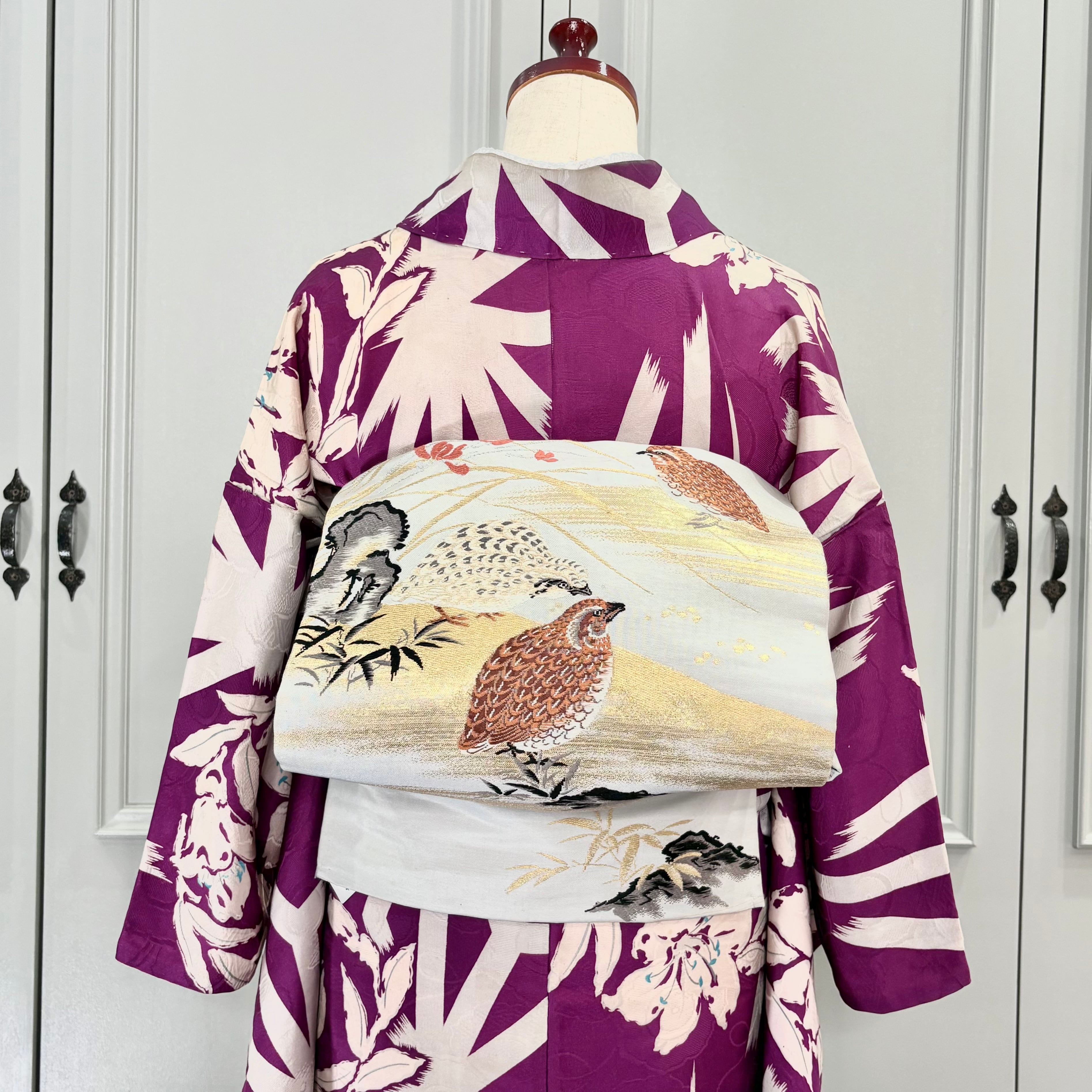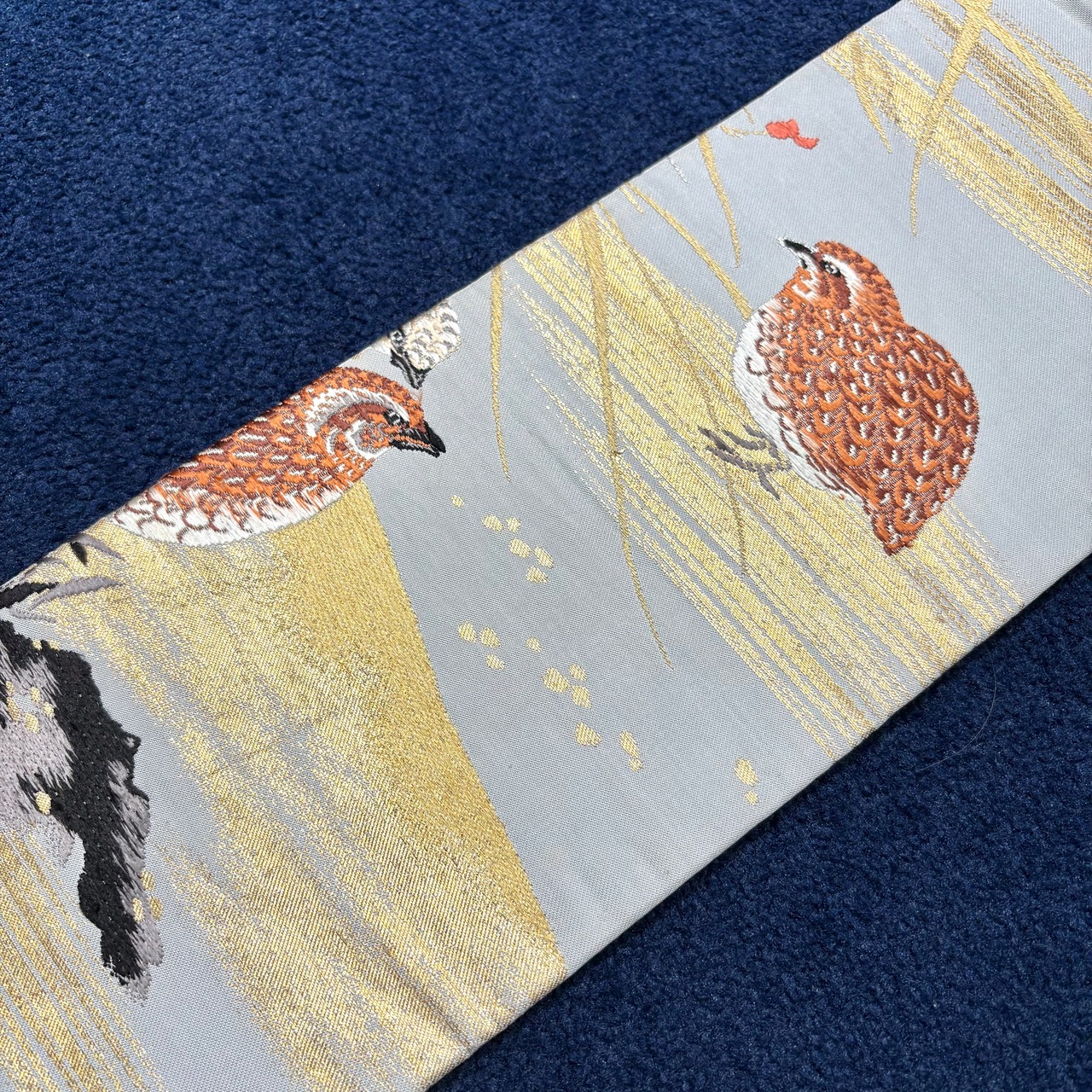 羽の模様まで細かく表現され、生き生きとしたうずらの鳴き声が聞こえてきそうな素敵な帯です。