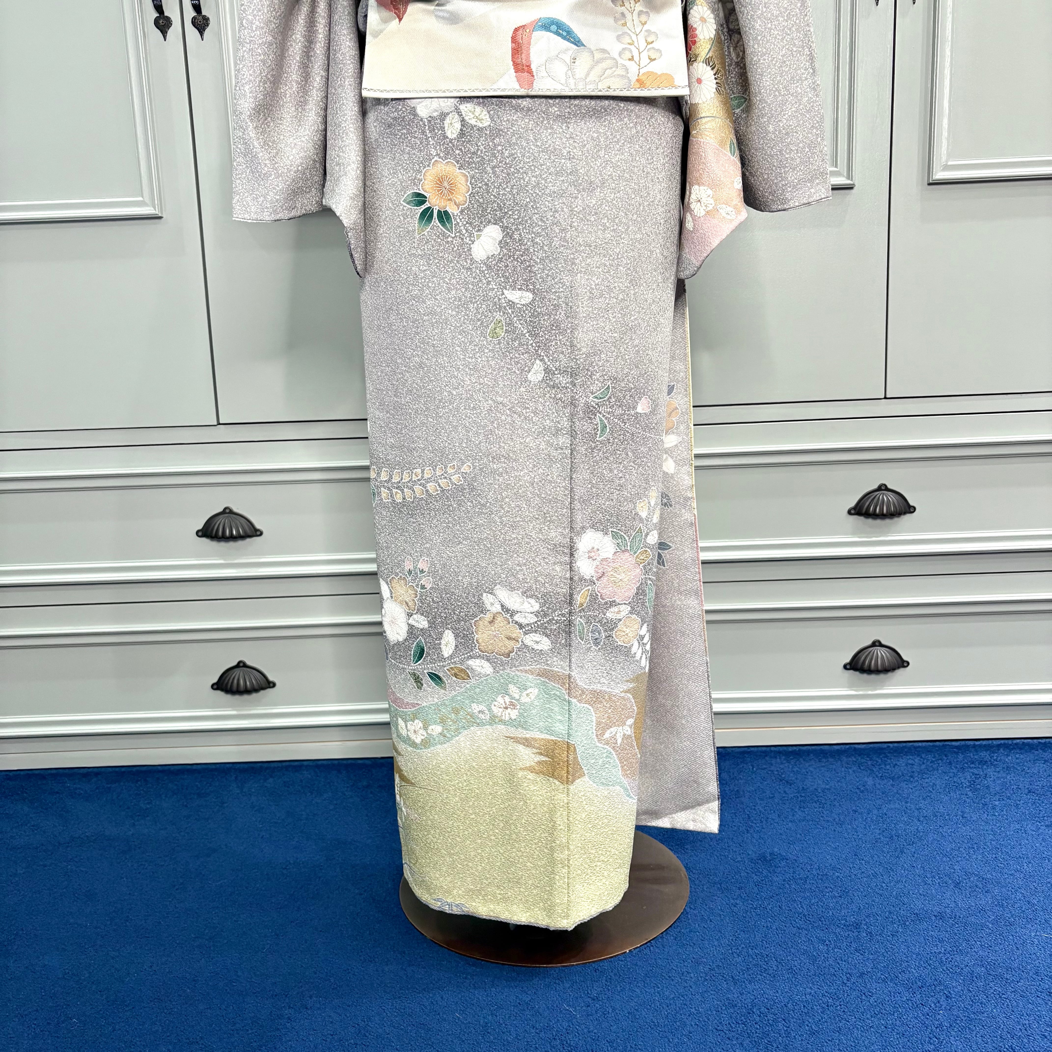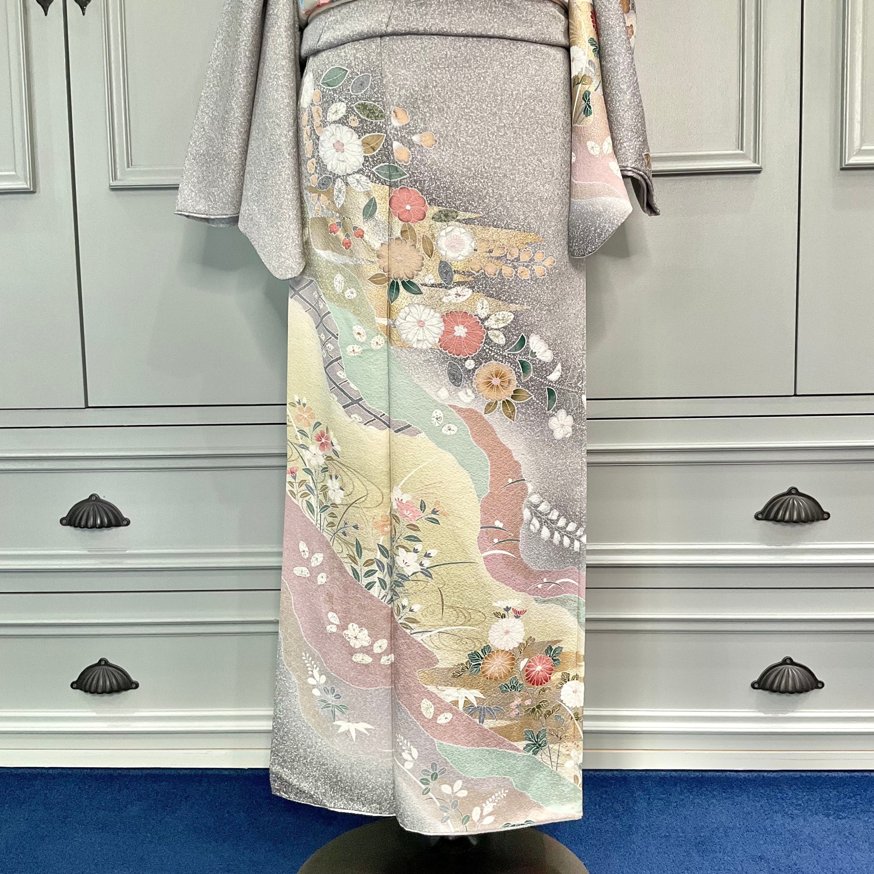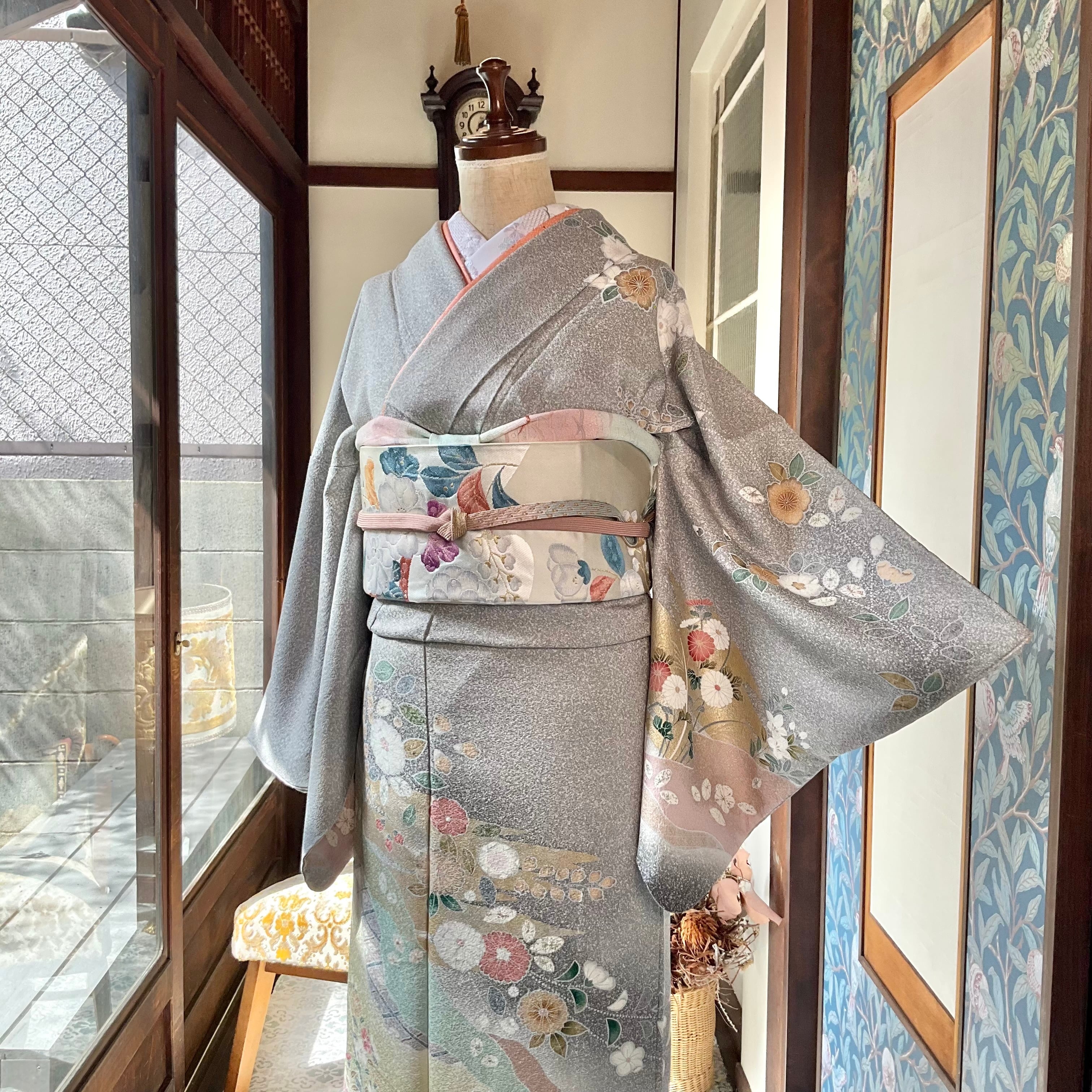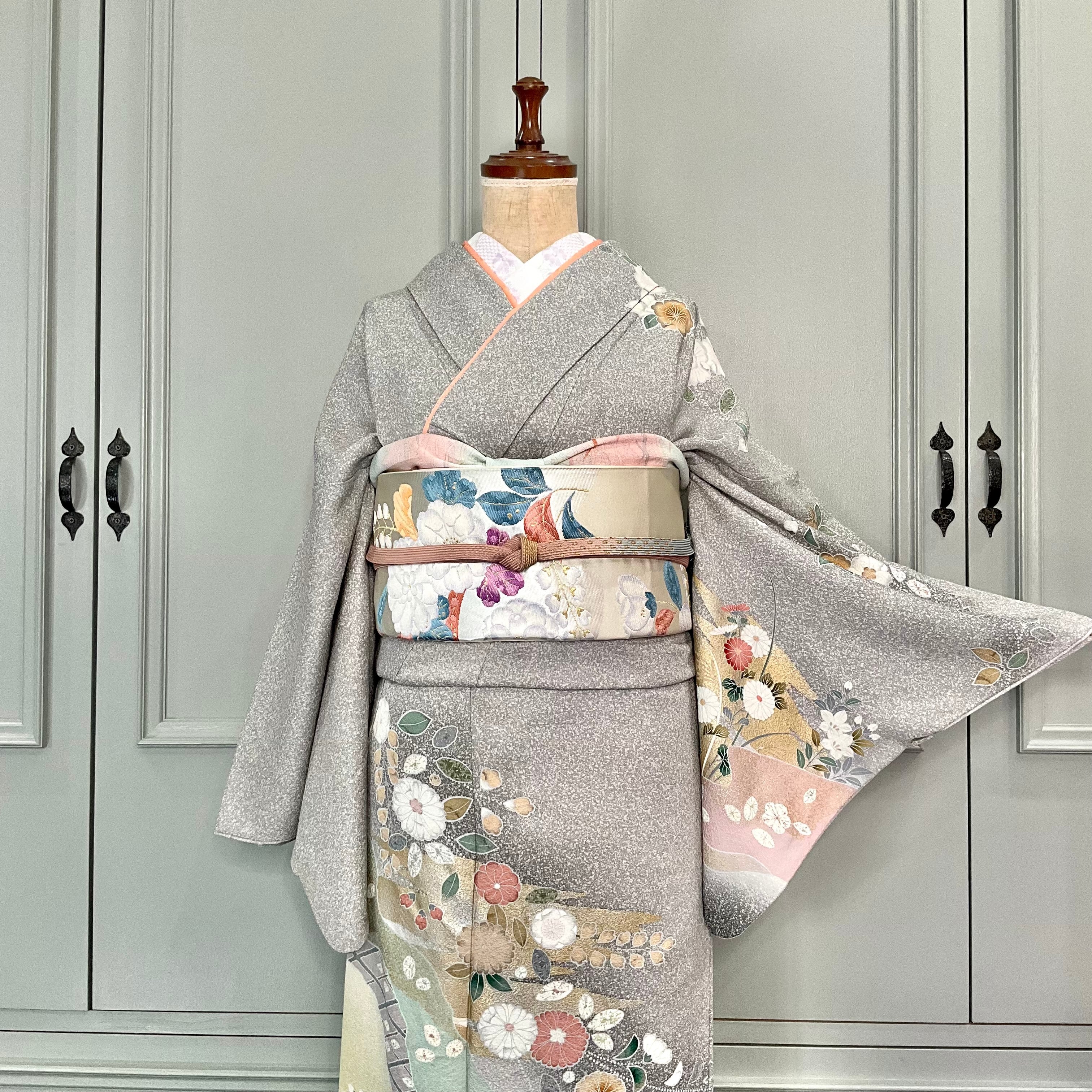訪問着は、たたき染めのライトグレー地に辻が花や菊などの花があしらわれており、上品でおしゃれな大人っぽい雰囲気です