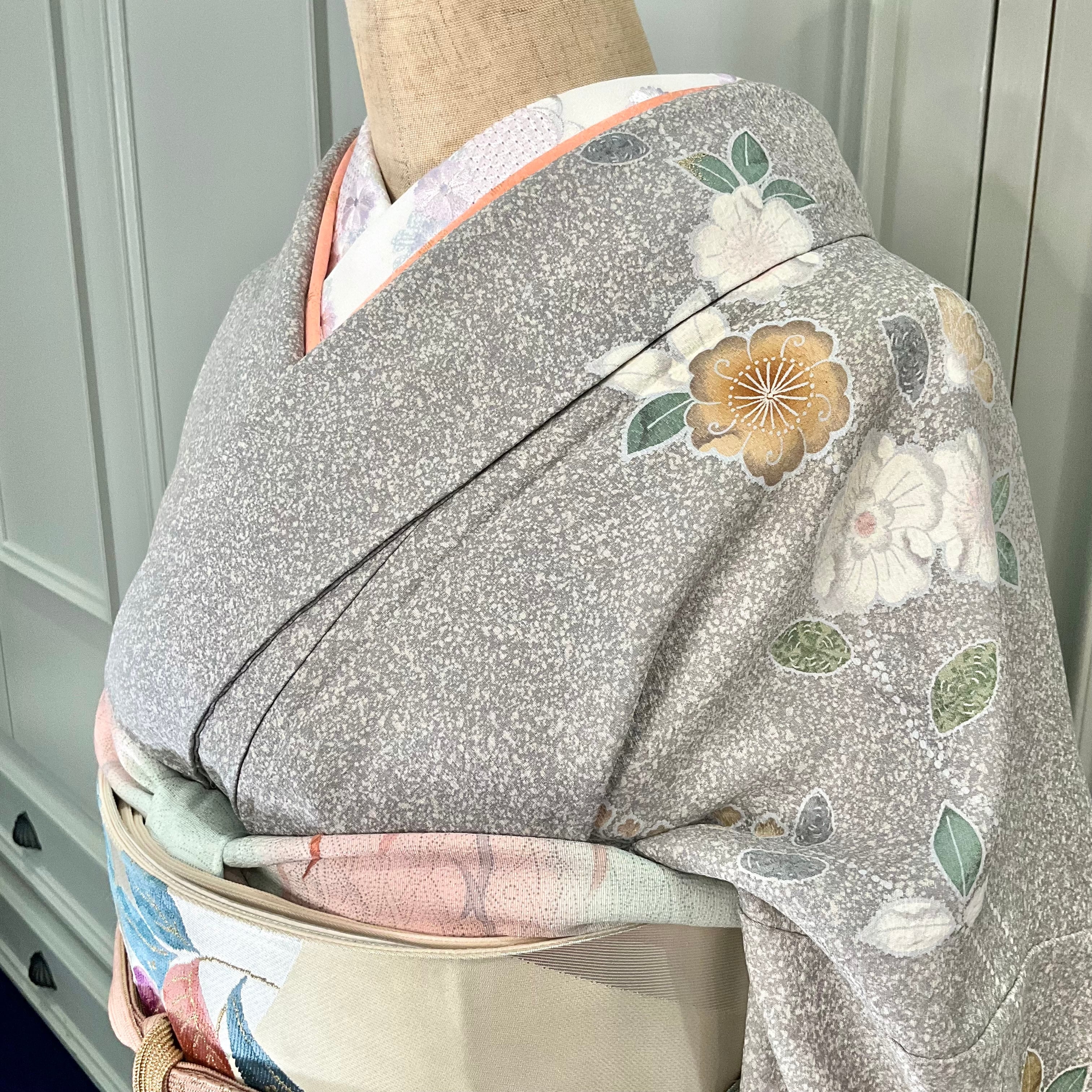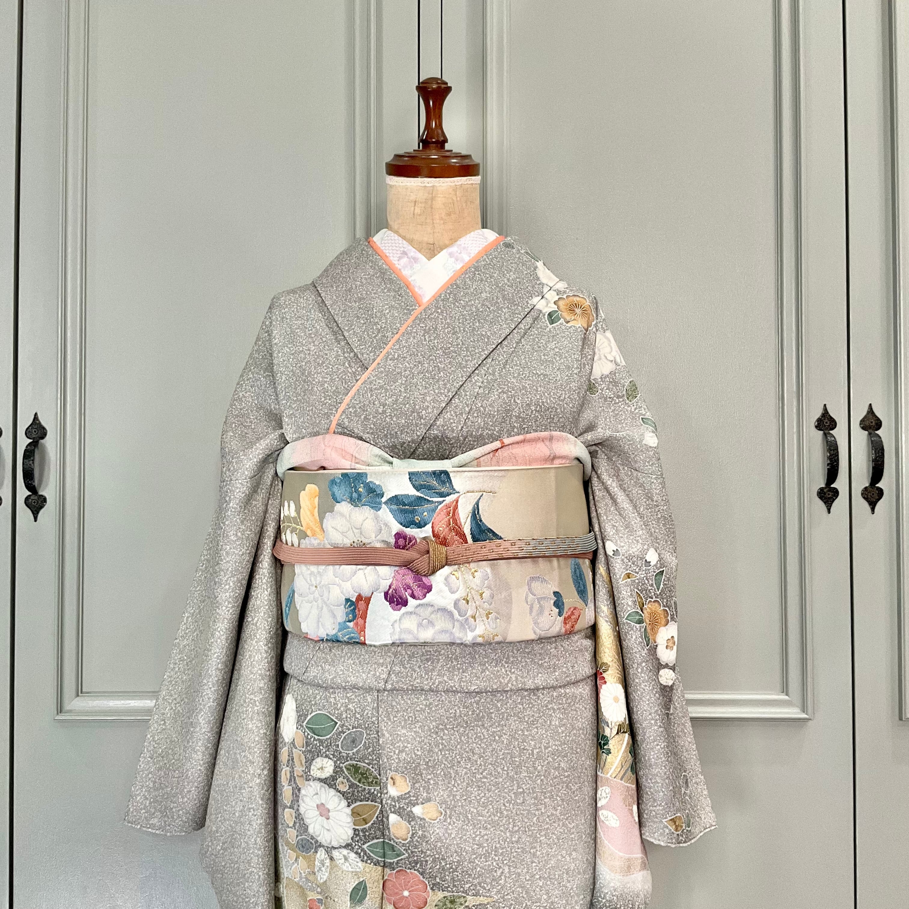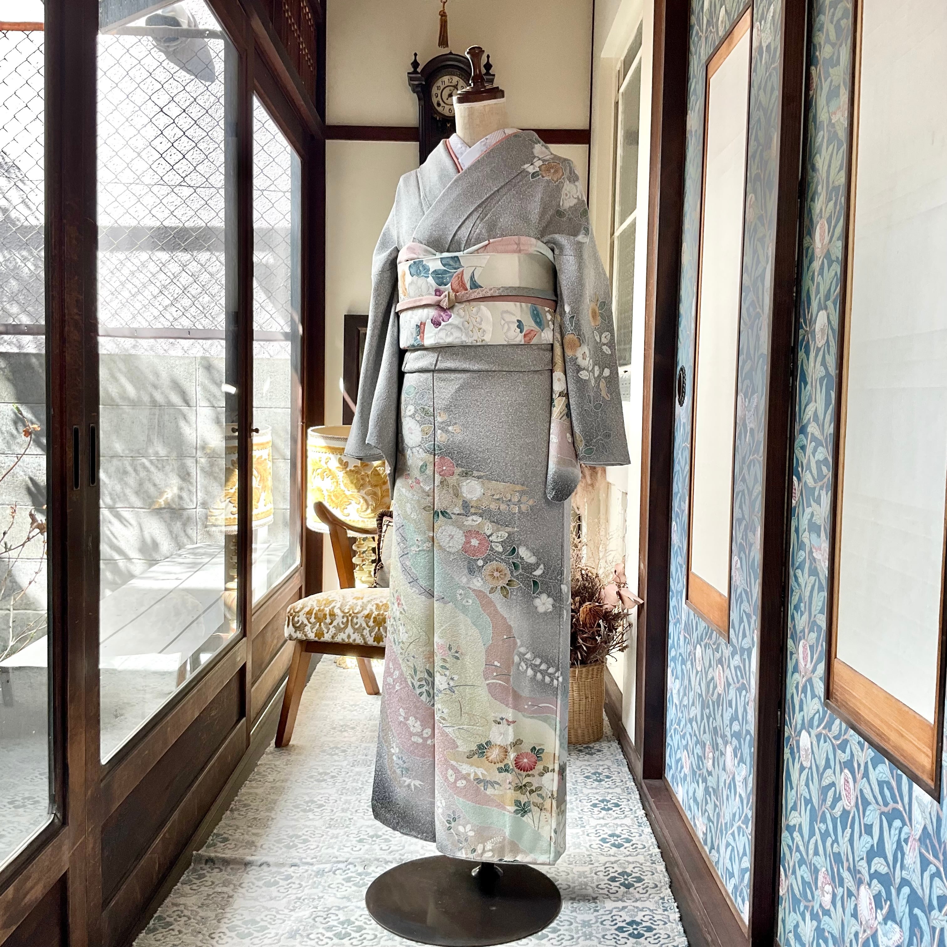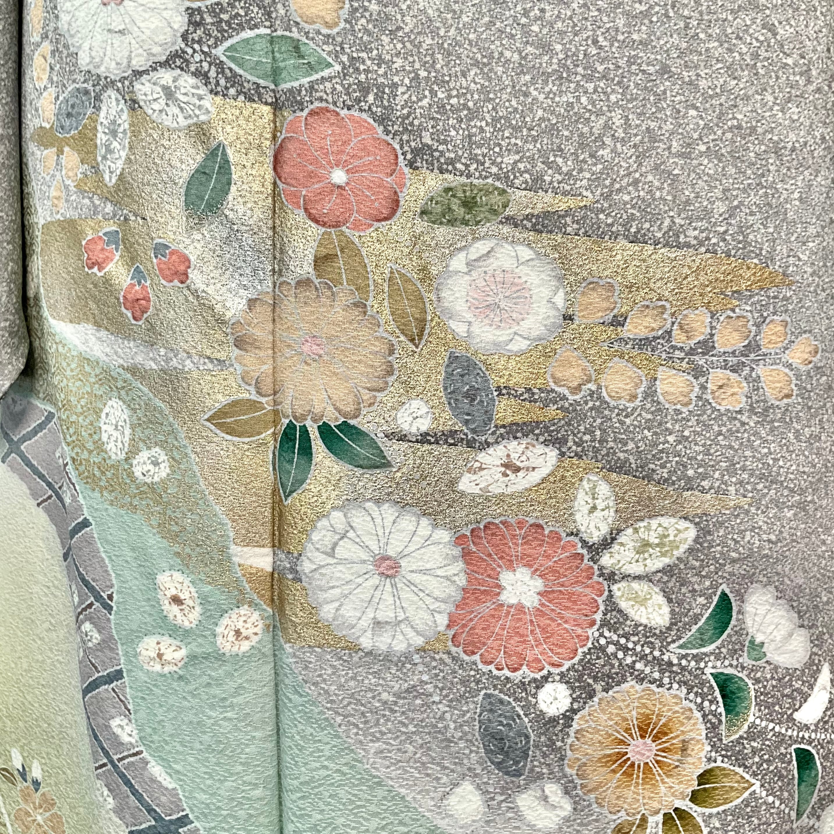 訪問着は、たたき染めのライトグレー地に辻が花や菊などの花があしらわれており、上品でおしゃれな大人っぽい雰囲気です