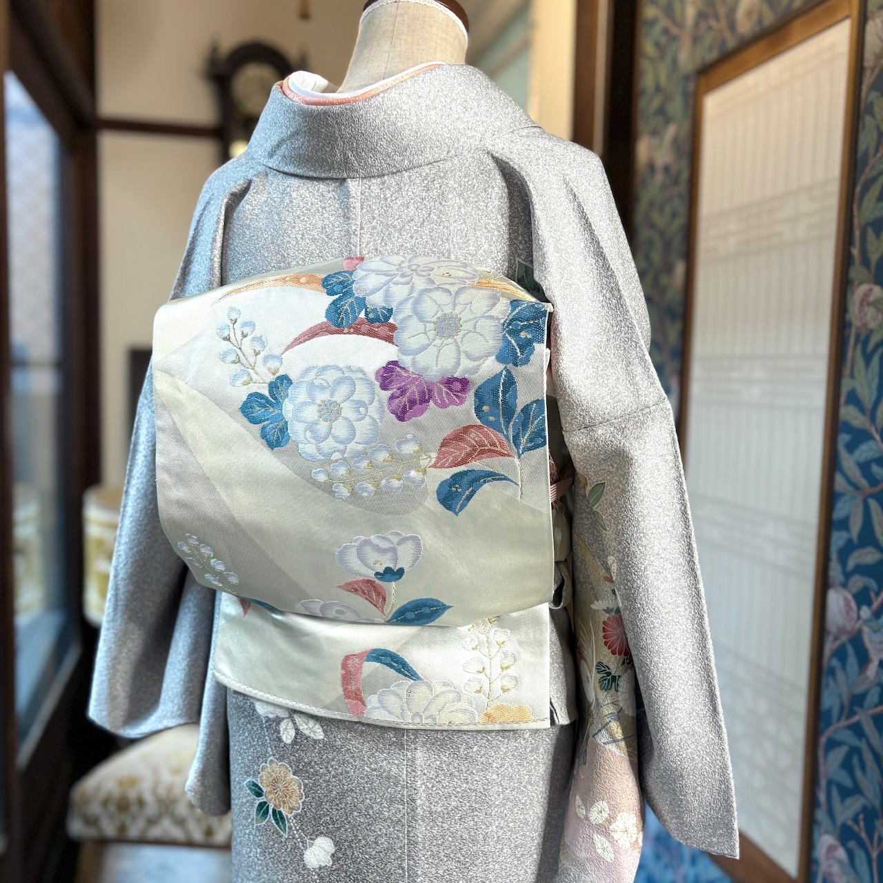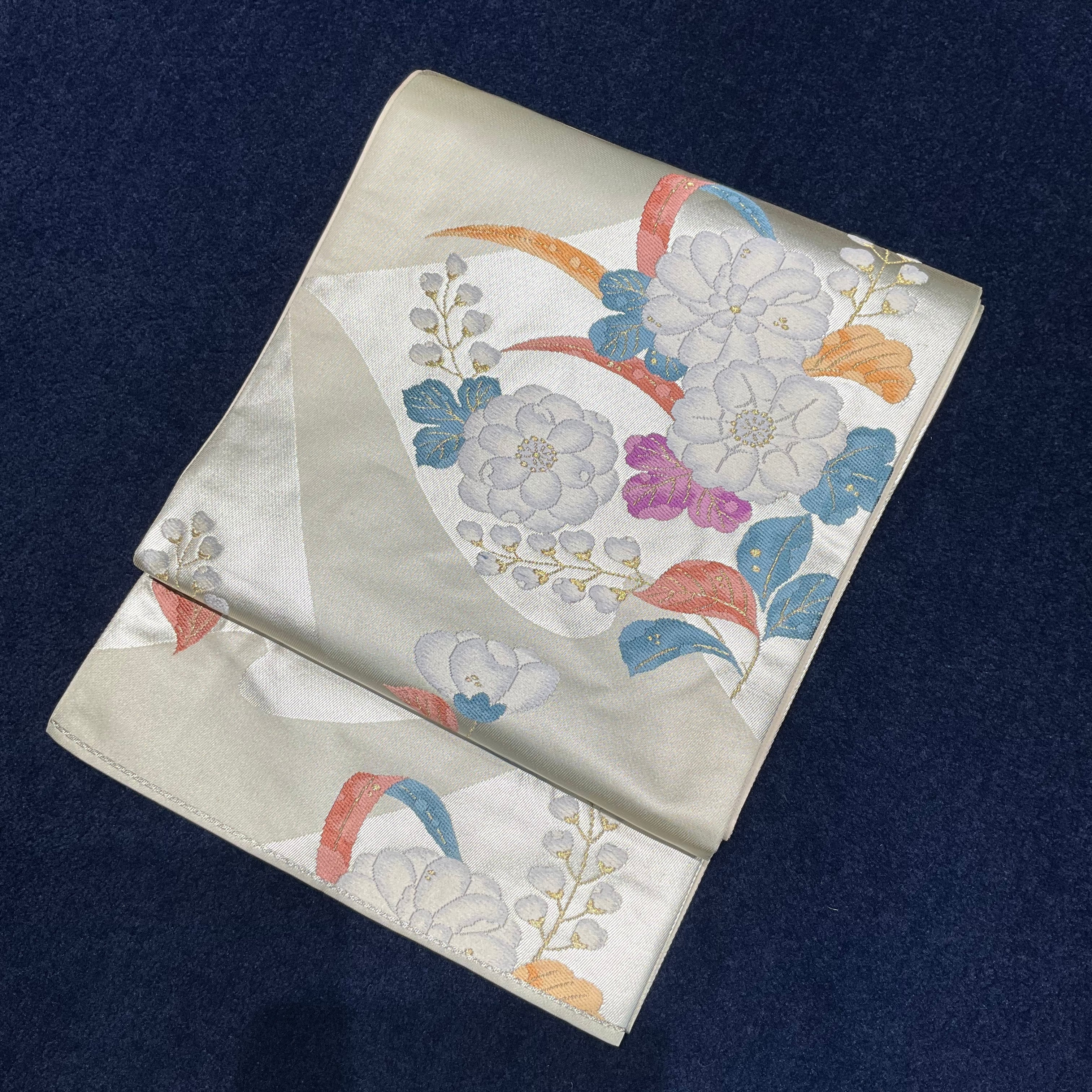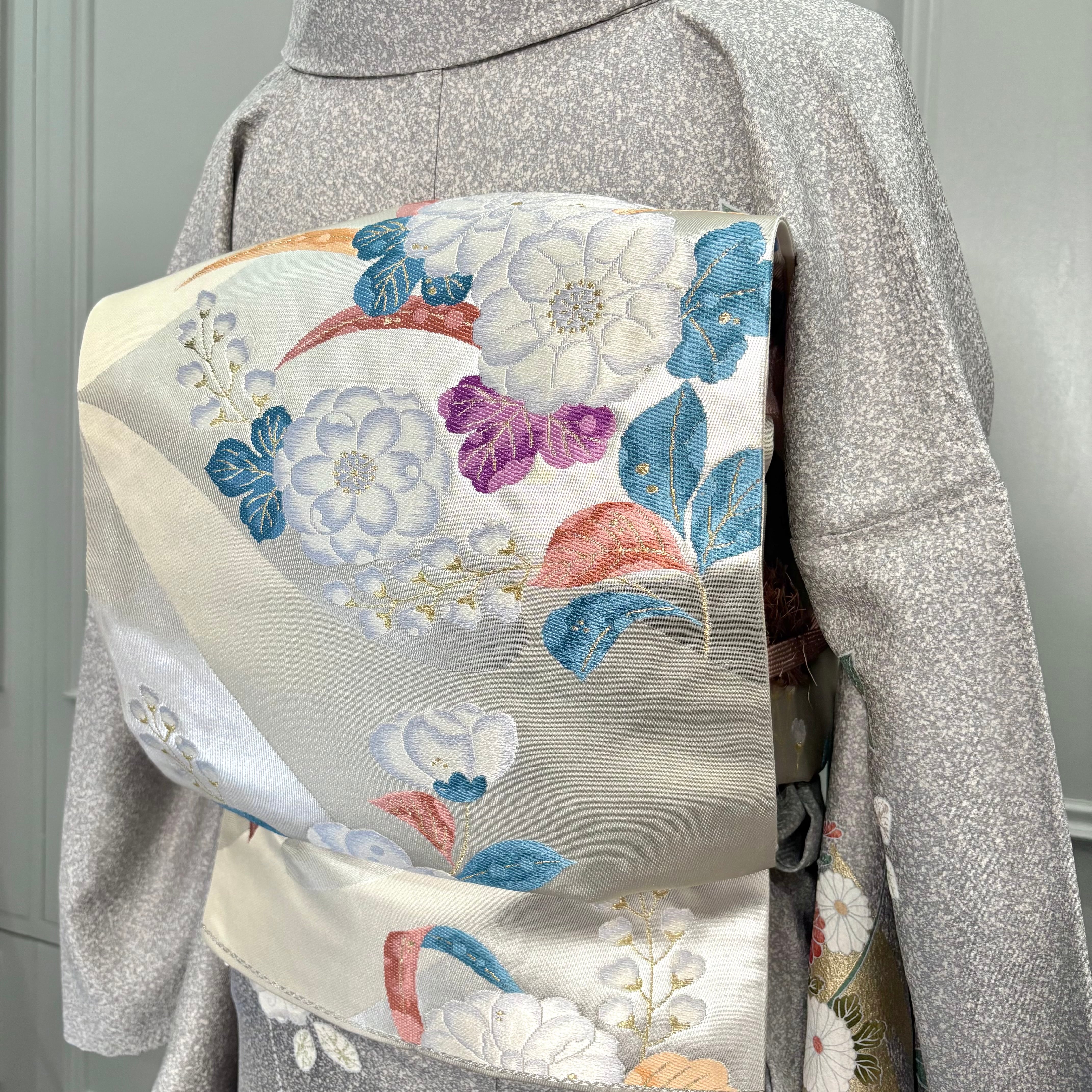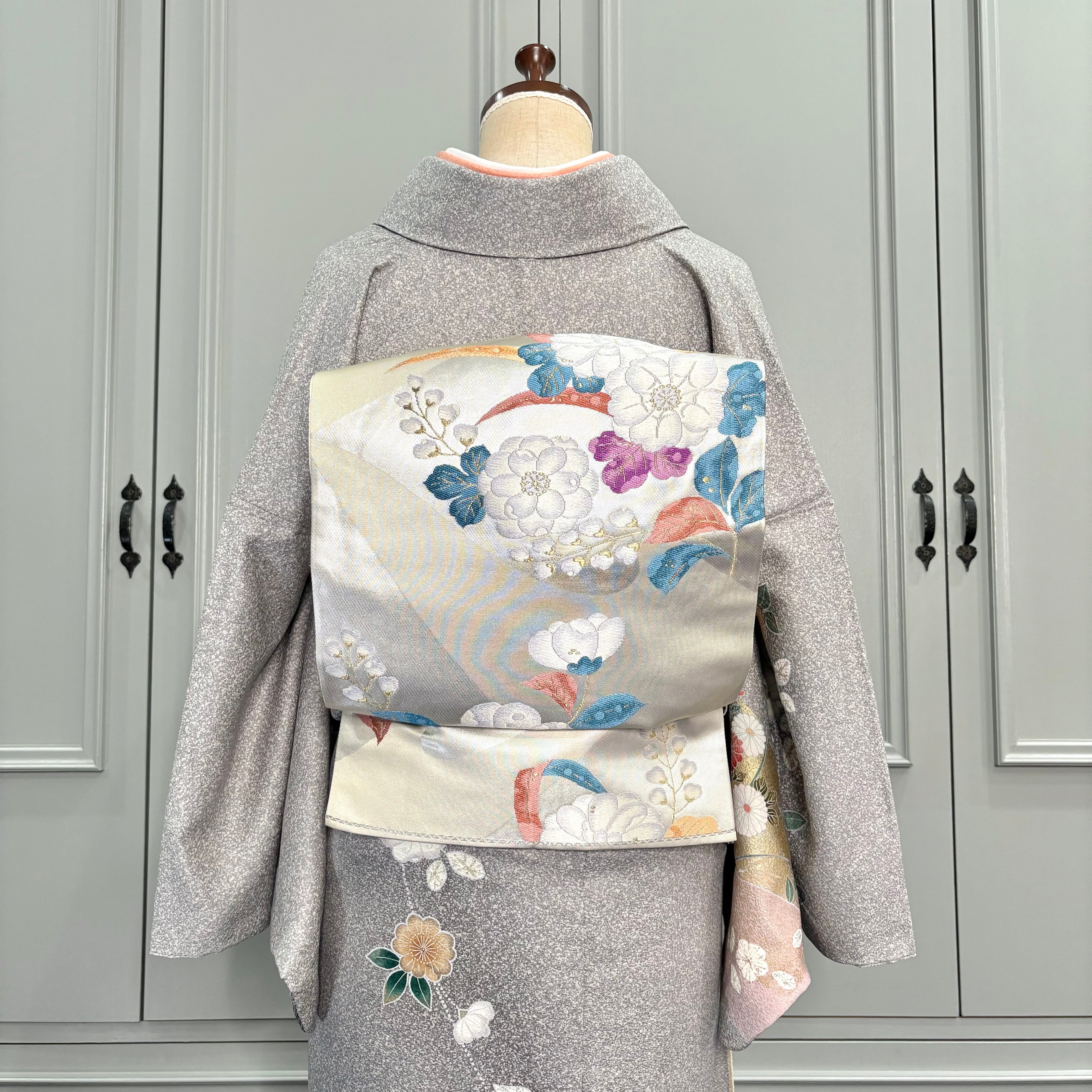 あわせた袋帯は、アイボリー地に椿や桐の花などが織り出されており、ブルーグリーン、アプリコット、パープルなどのカラフルな葉がポイントとなるおしゃれな帯です