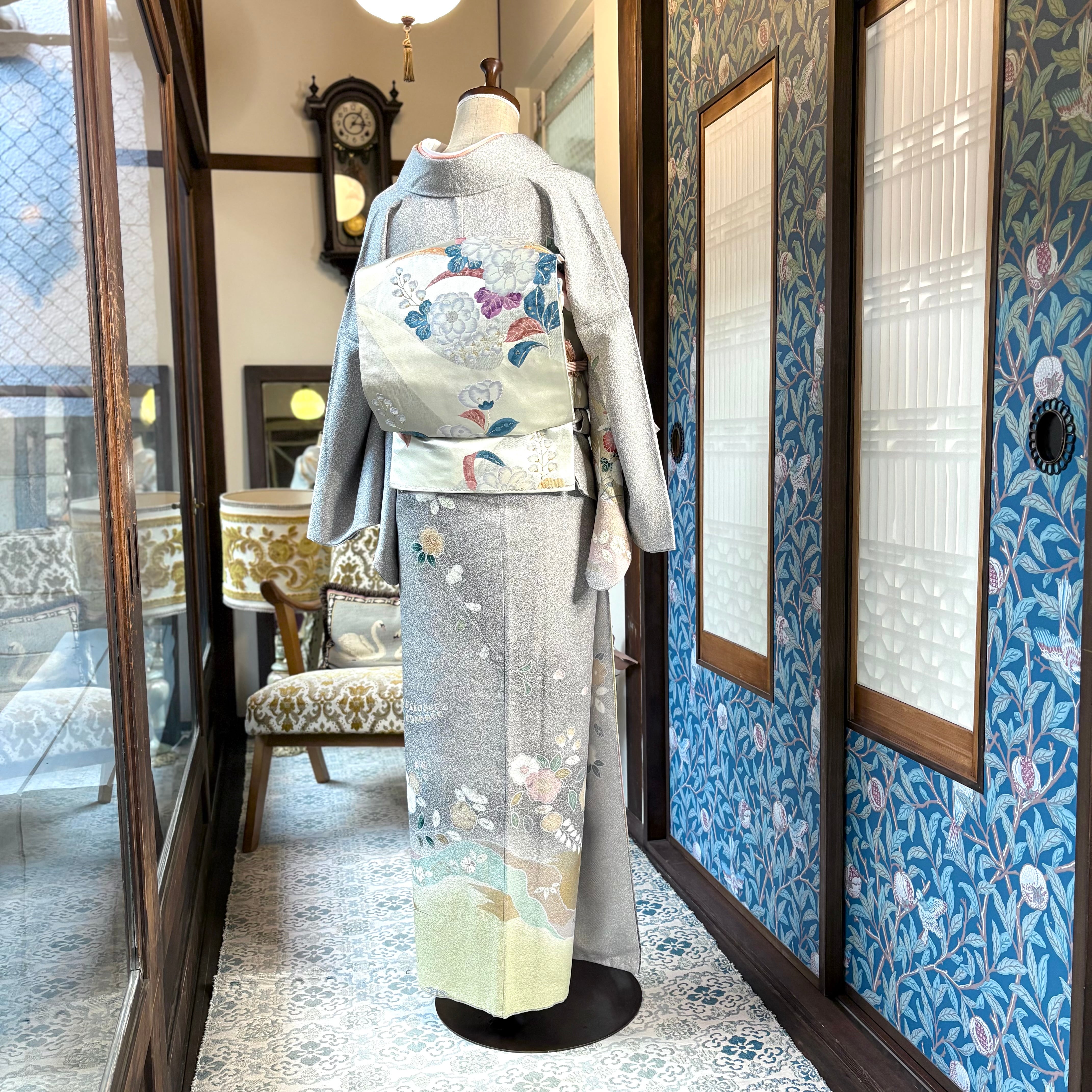 訪問着の裾を流れるように彩る、柔らかくくすんだクリームイエロー、ミントグリーン、ライラック、梅鼠色と帯の葉の色がリンクして、おしゃれにまとまったコーディネートです✨