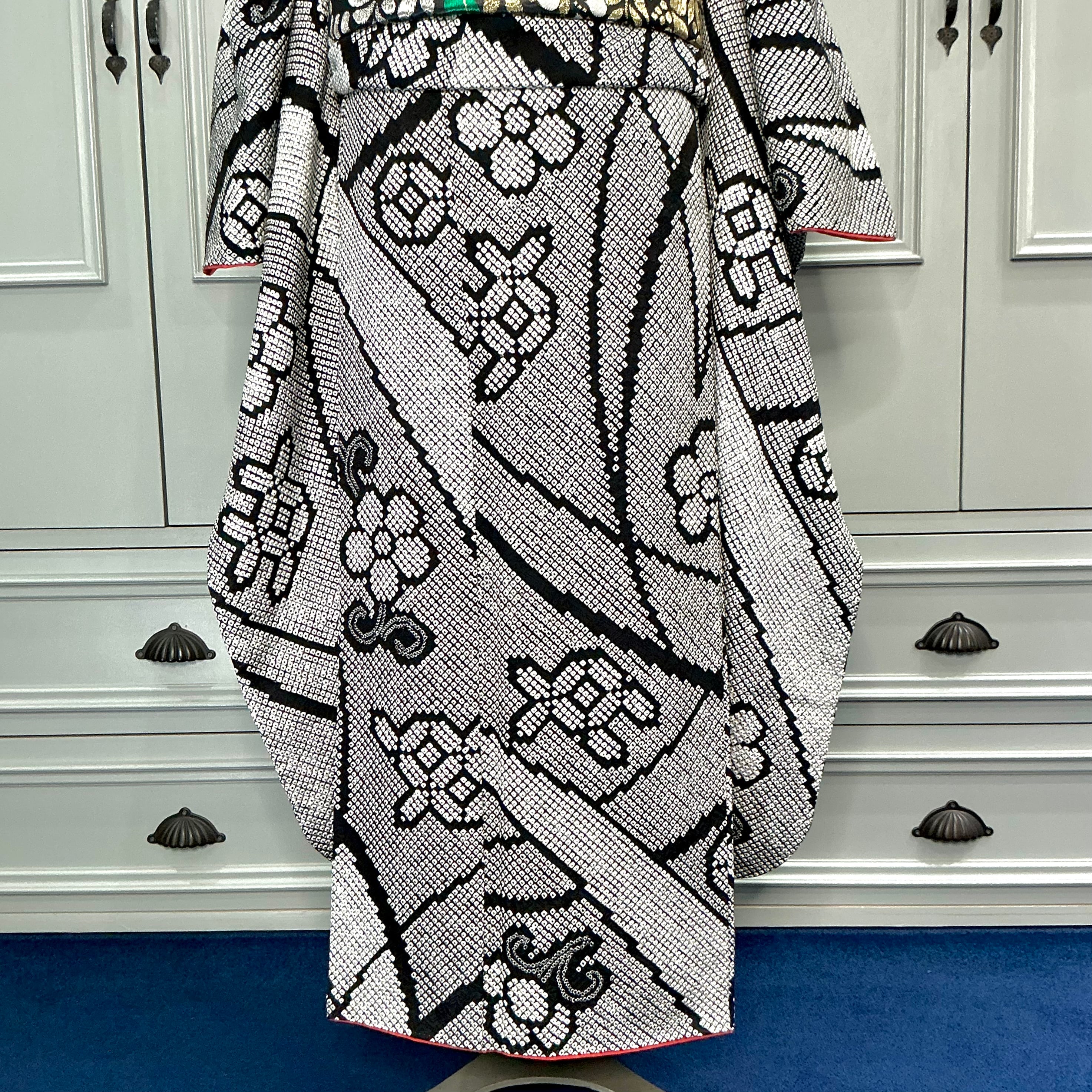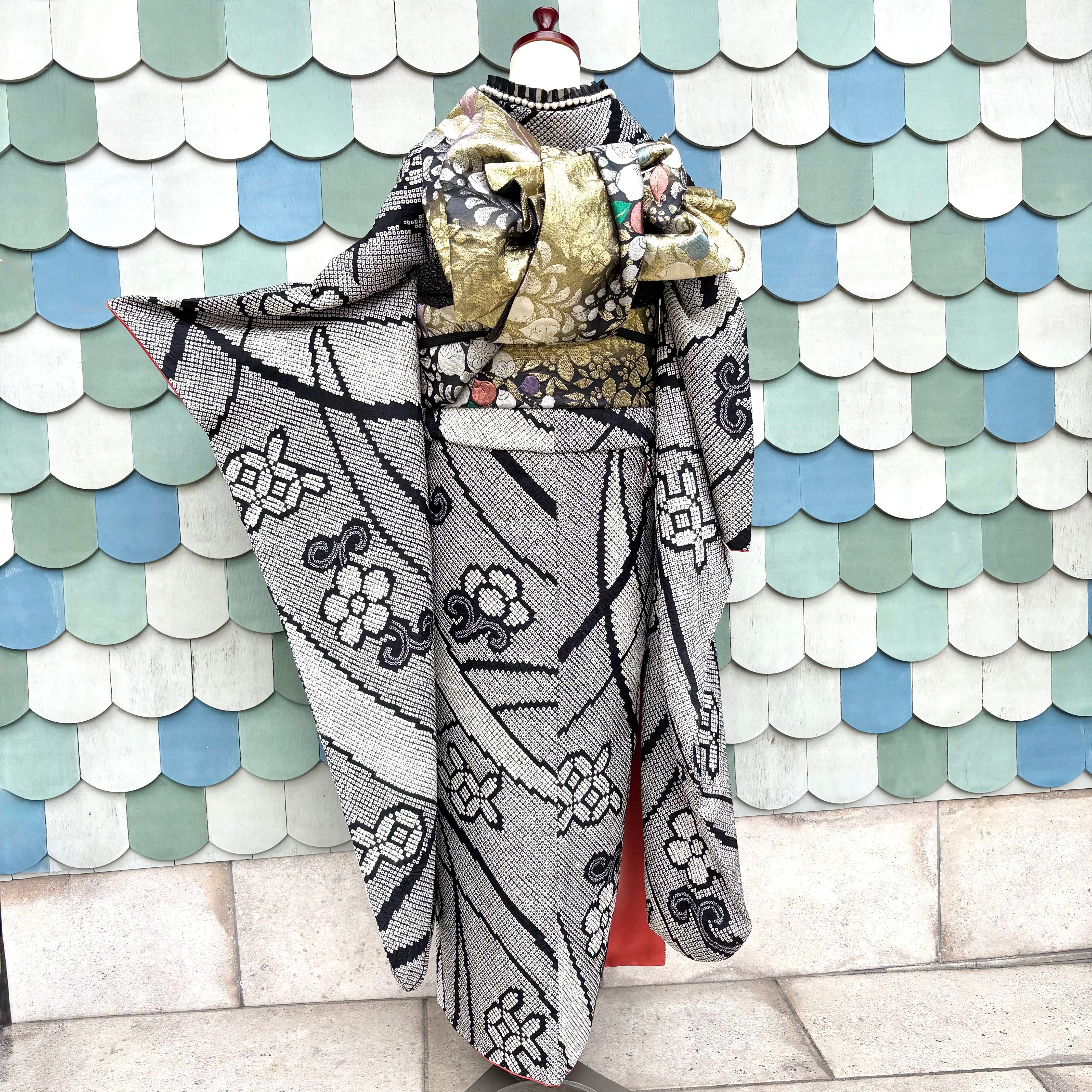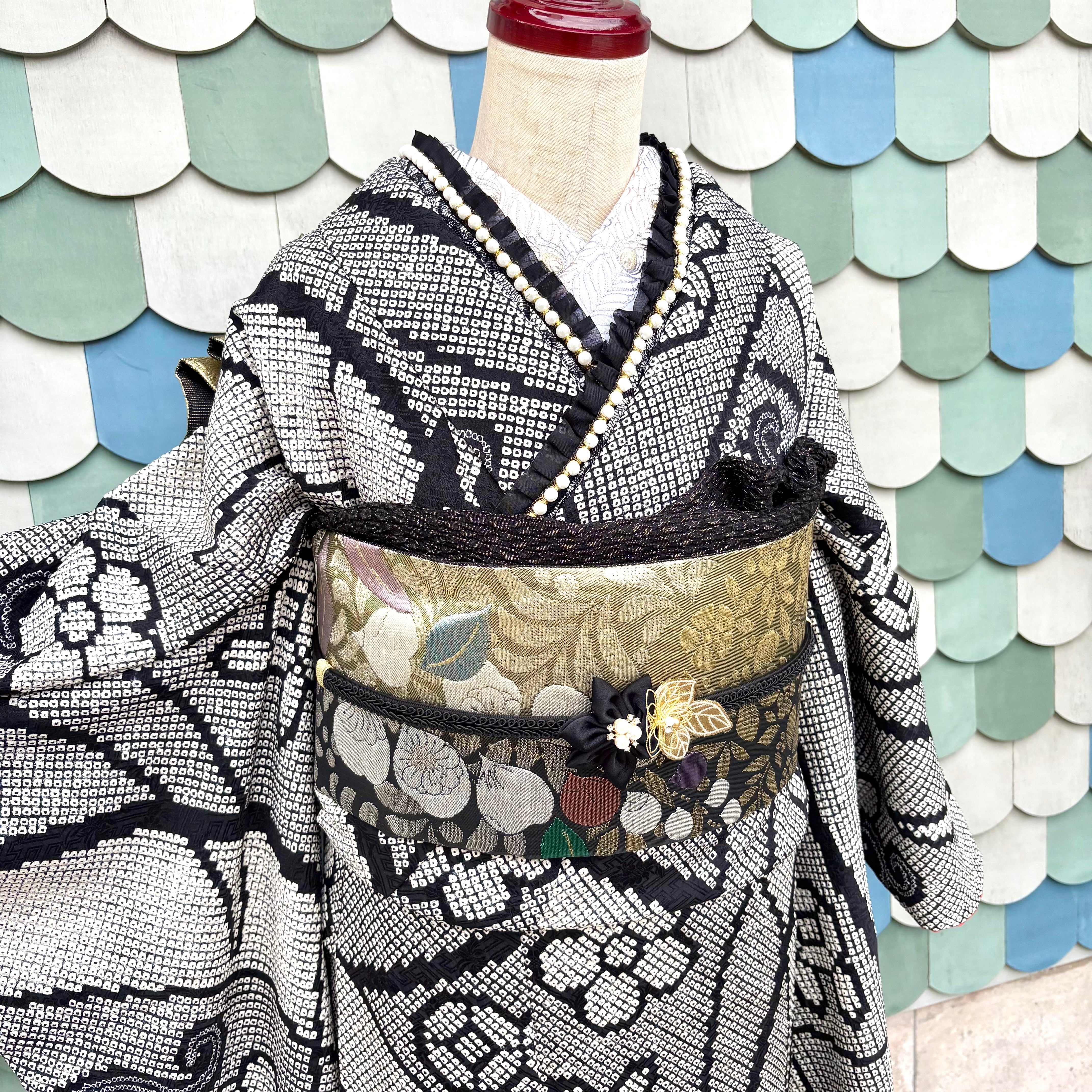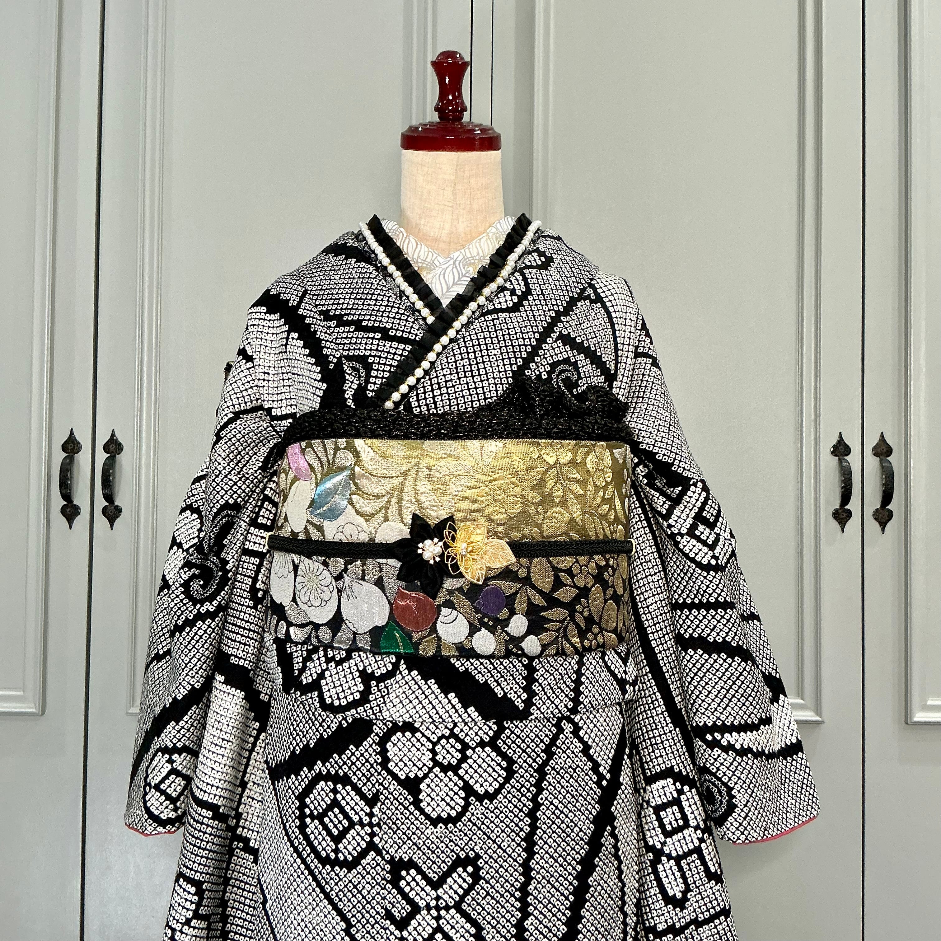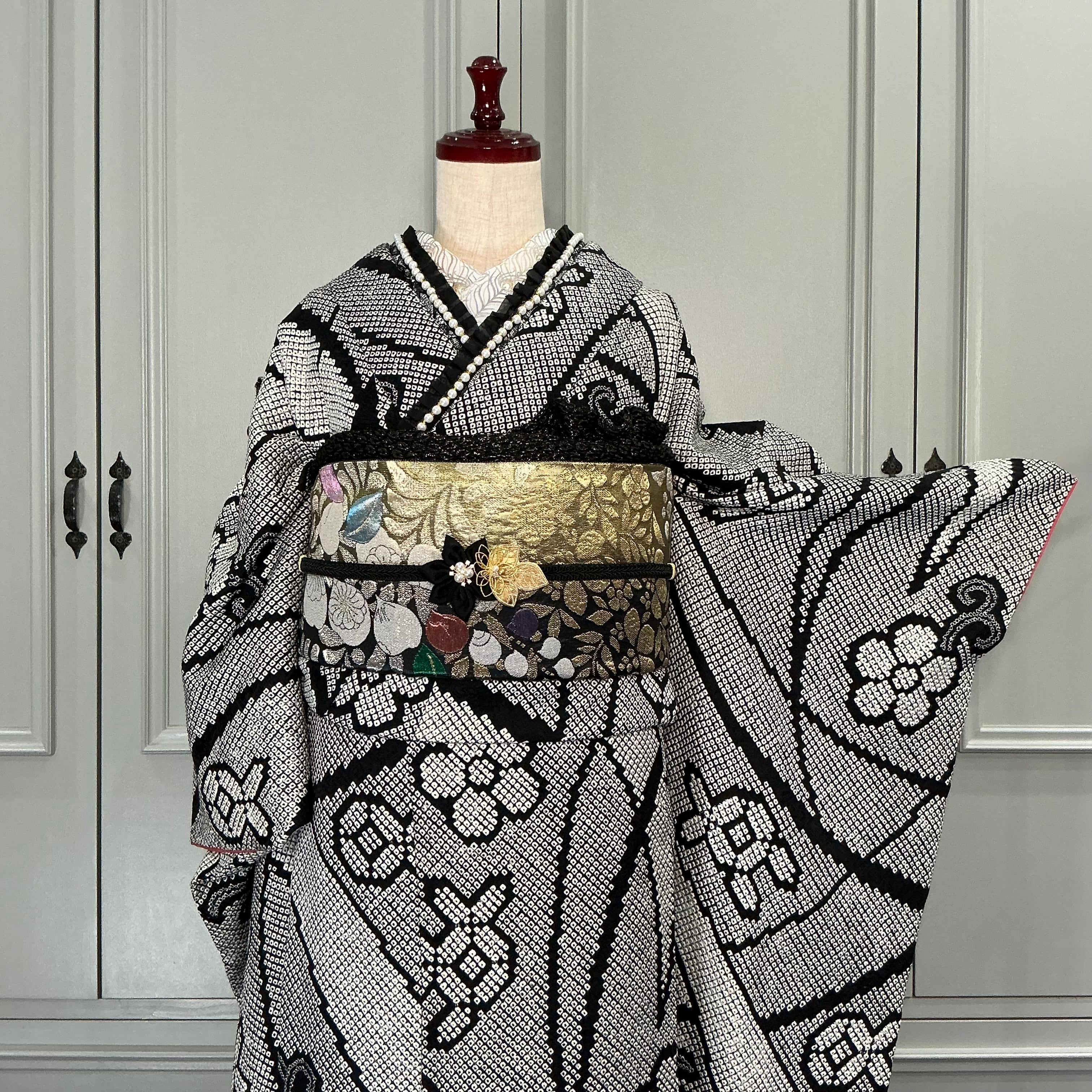Modern Noir*振袖 ブラック モノトーン 総絞り 成人式 振袖 袋帯 帯締め 帯揚げ 重ね衿 長襦袢 振袖7点セットB583