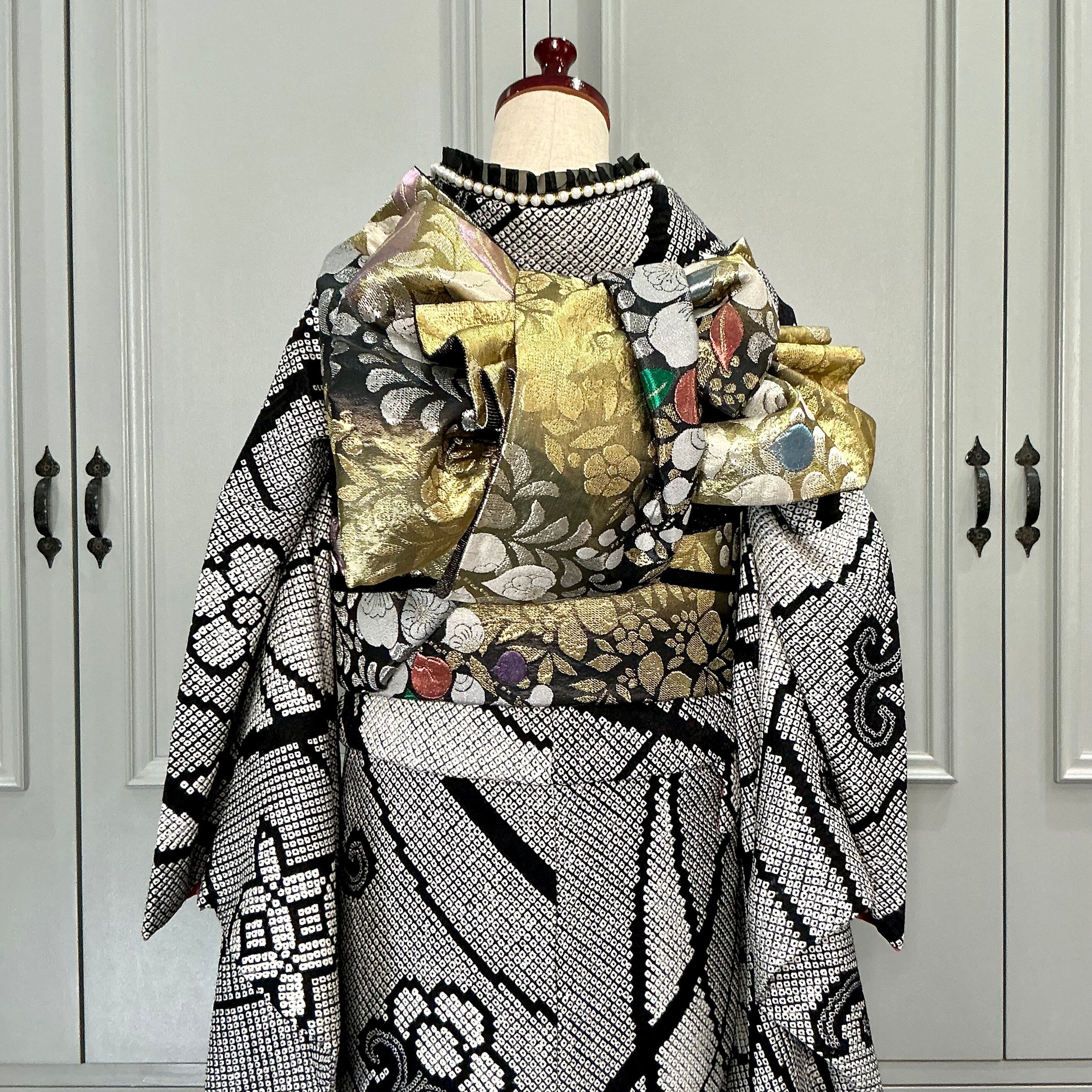 クラシカルでシンプルなモノトーンの総絞りですが、小物をブラック、ゴールド、シルバーで統一し、モダンにコーディネートしました✨️