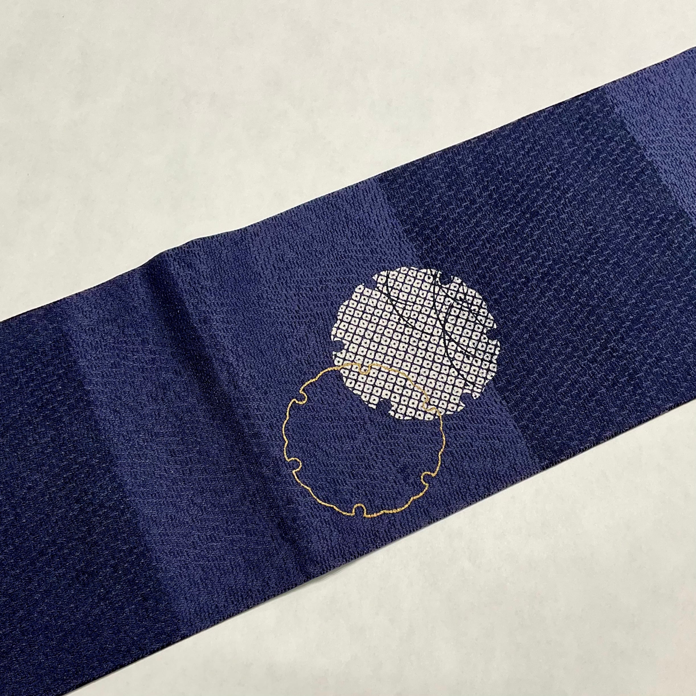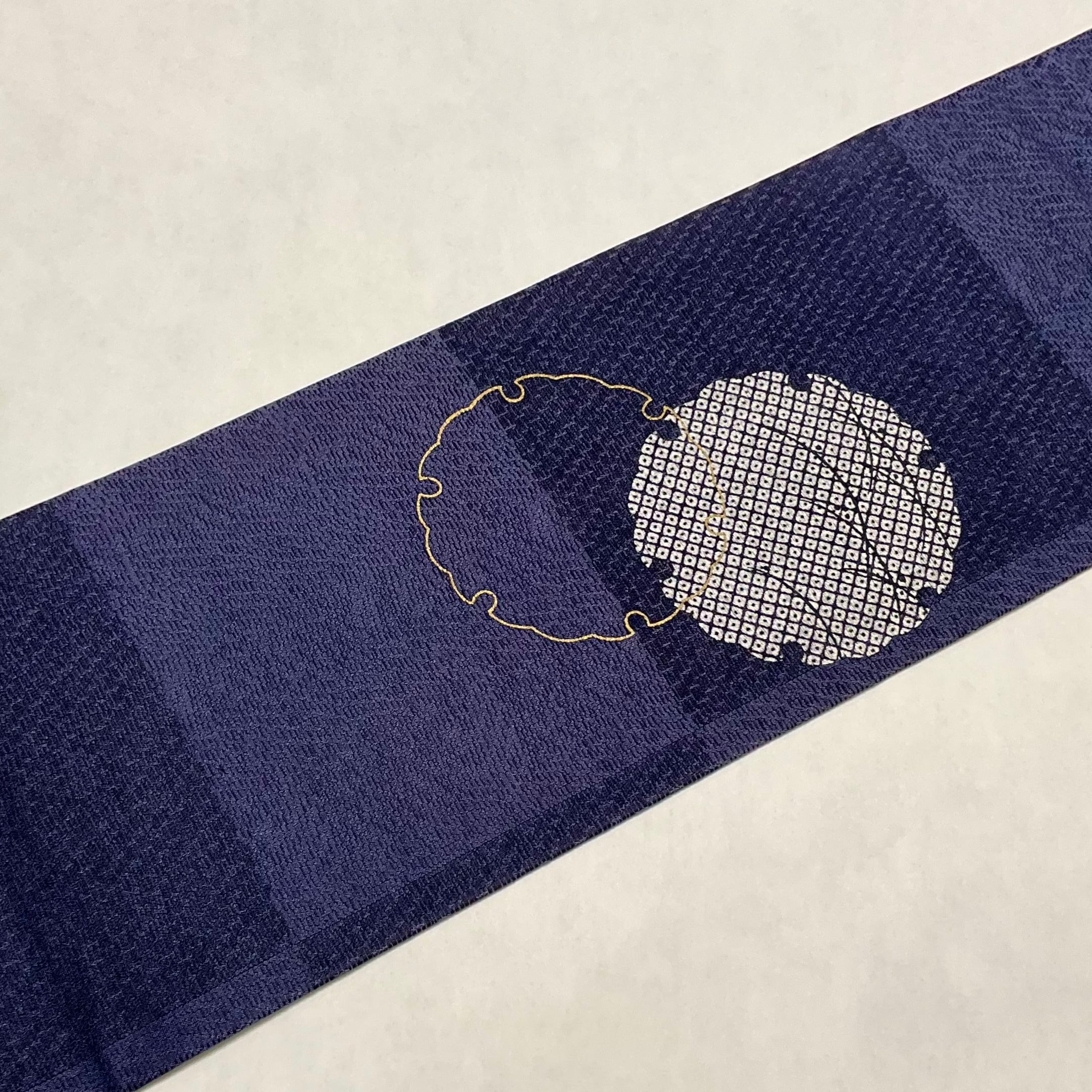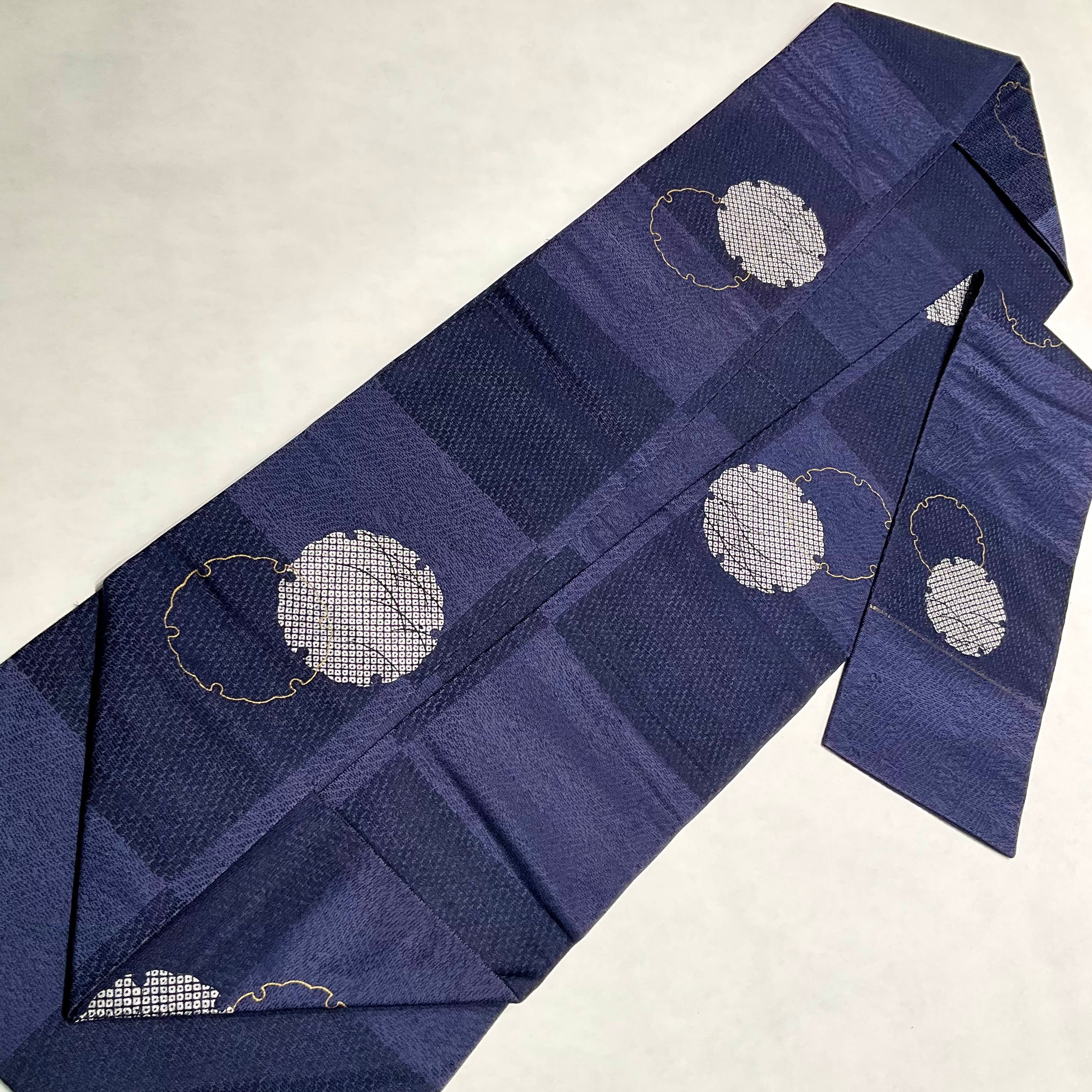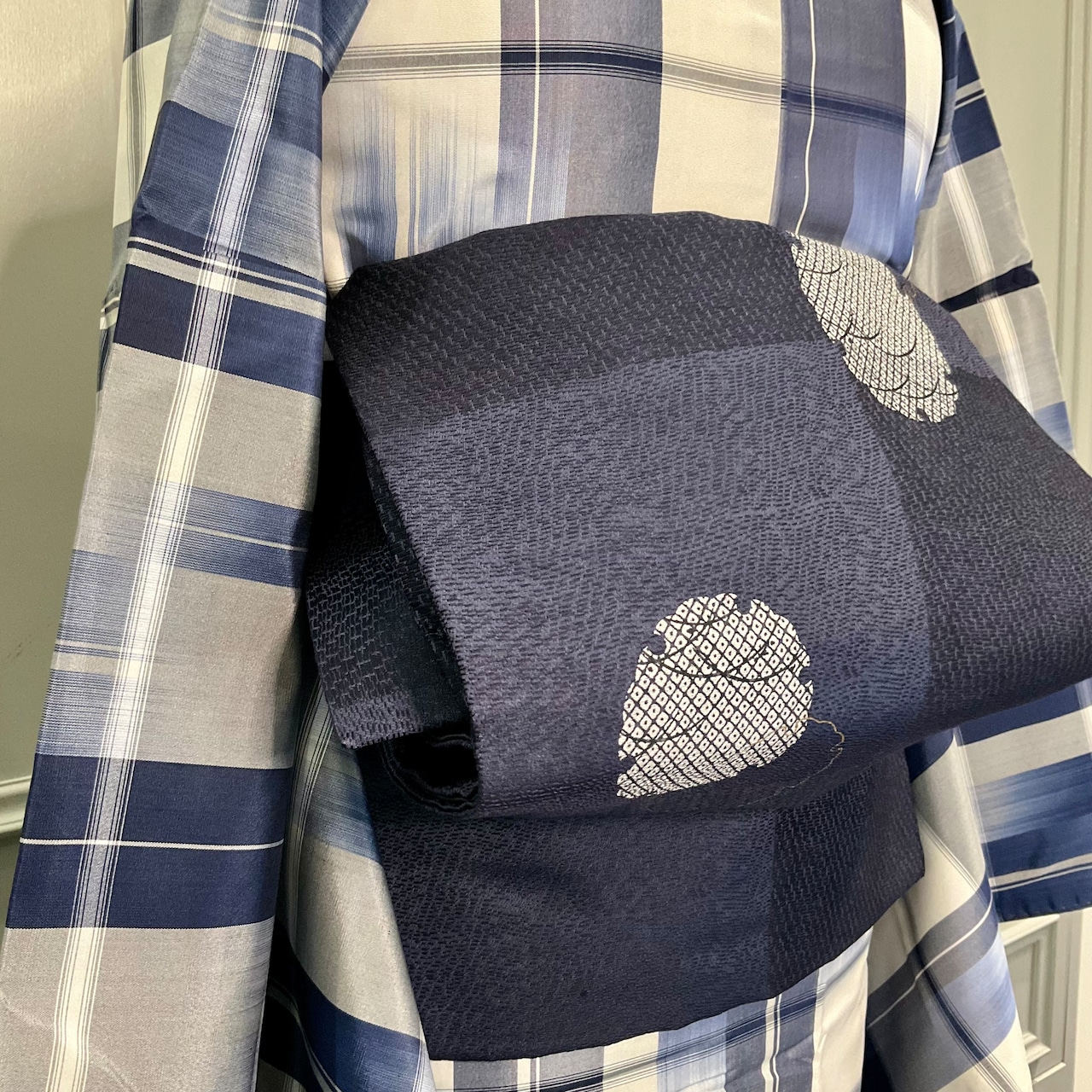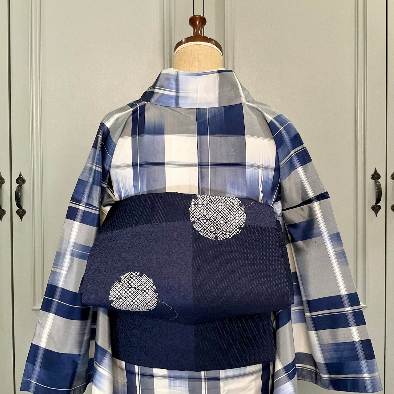 静夜の雪輪*未使用品 雪輪 芝草 格子 市松 ブロックチェック 紺 濃紺 ネイビー 染め帯 名古屋帯 B589