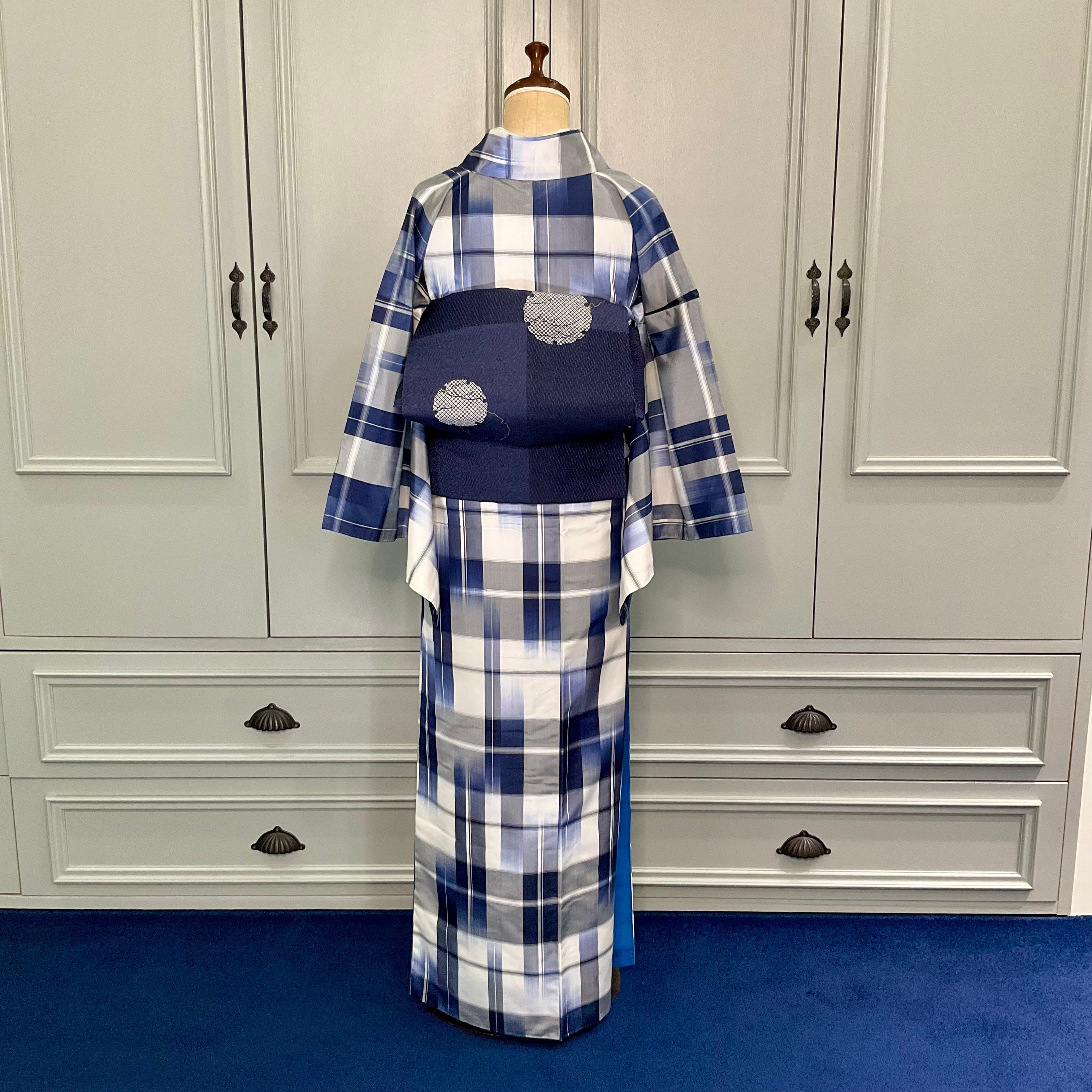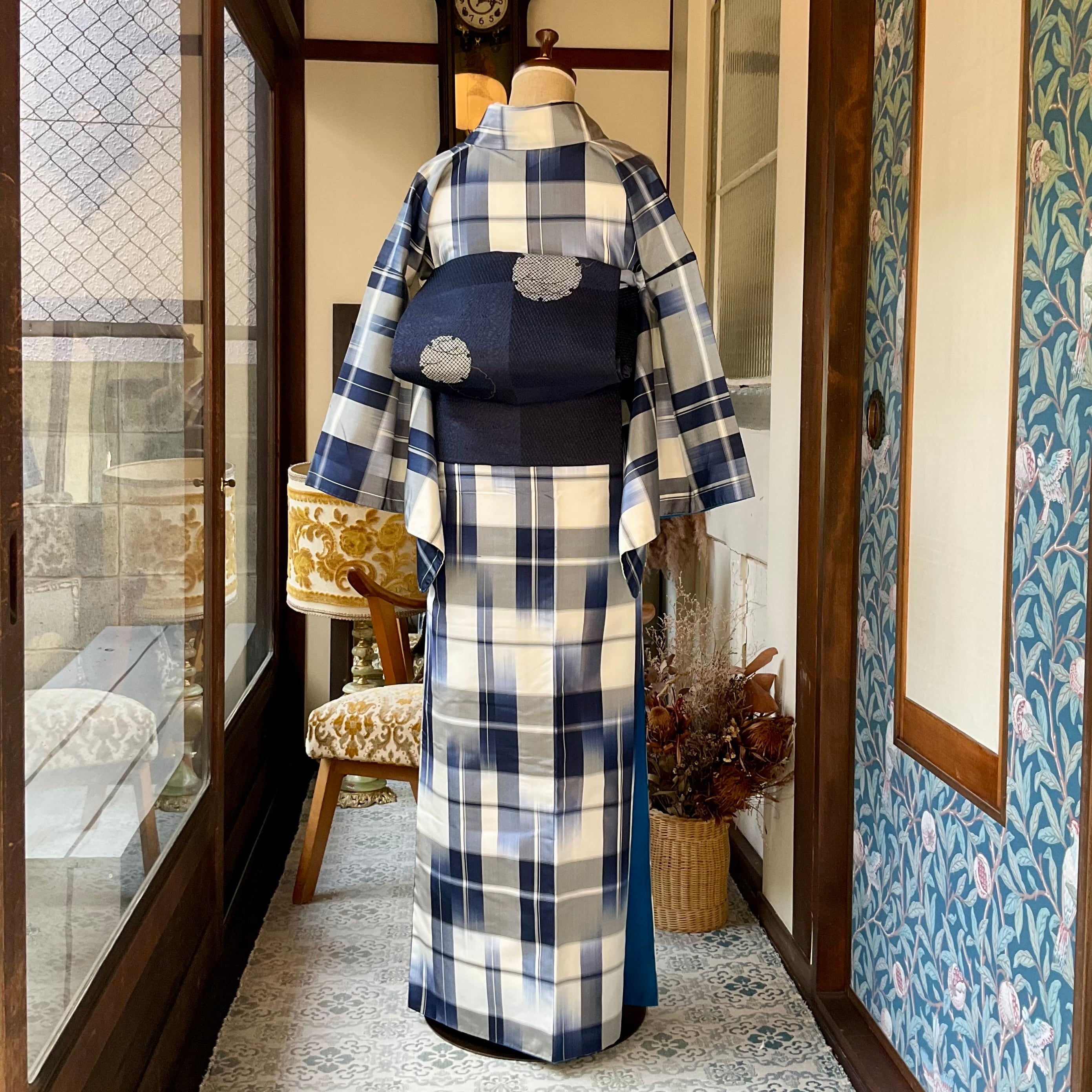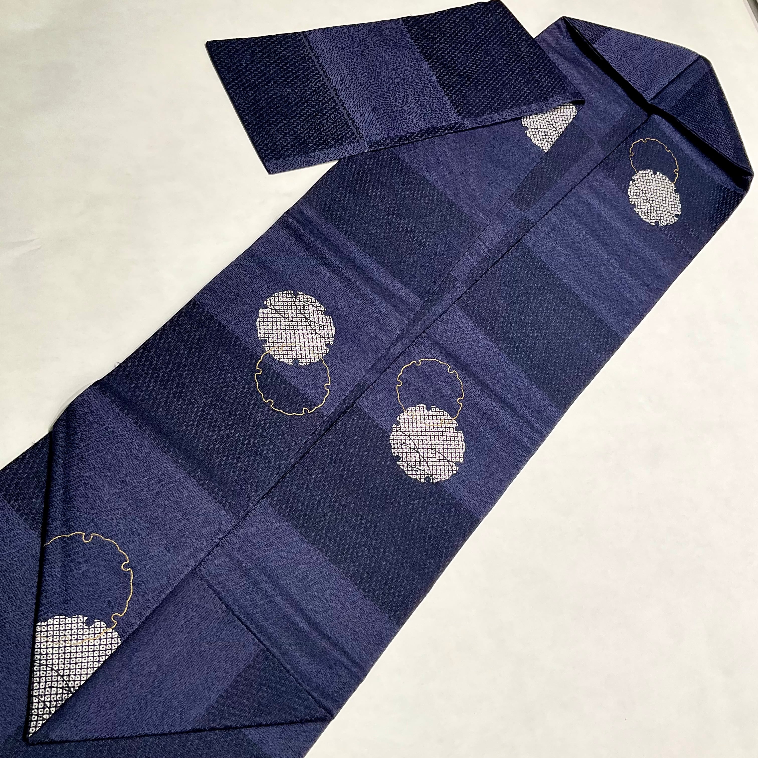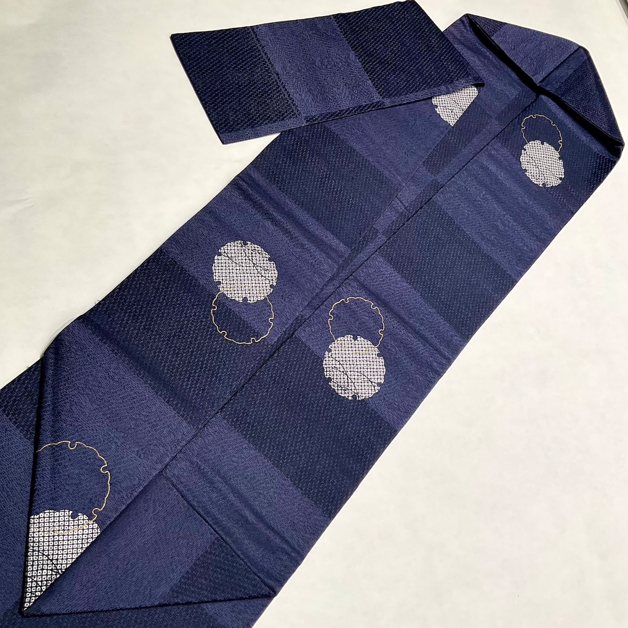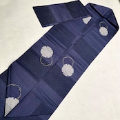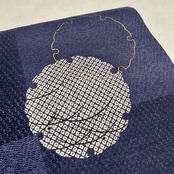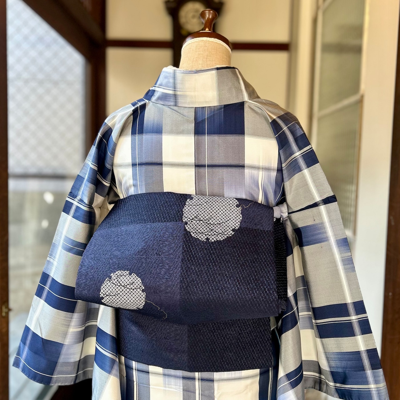 静夜の雪輪*未使用品 雪輪 芝草 格子 市松 ブロックチェック 紺 濃紺 ネイビー 染め帯 名古屋帯 B589