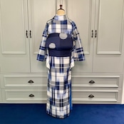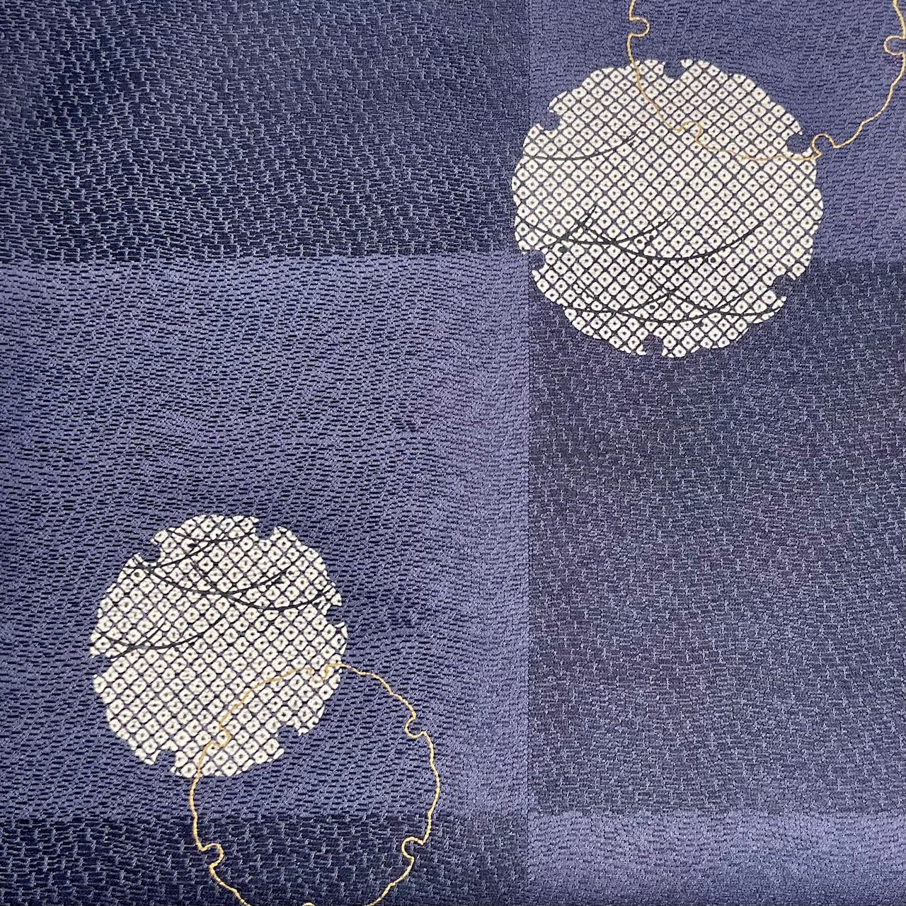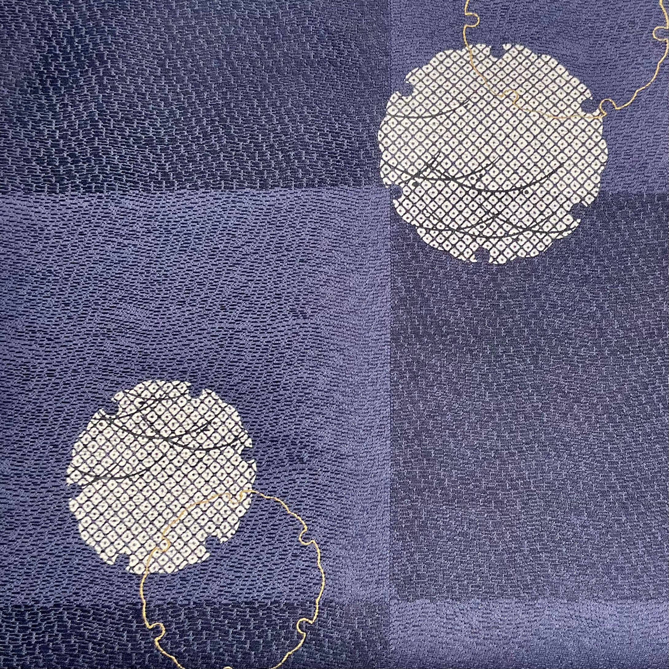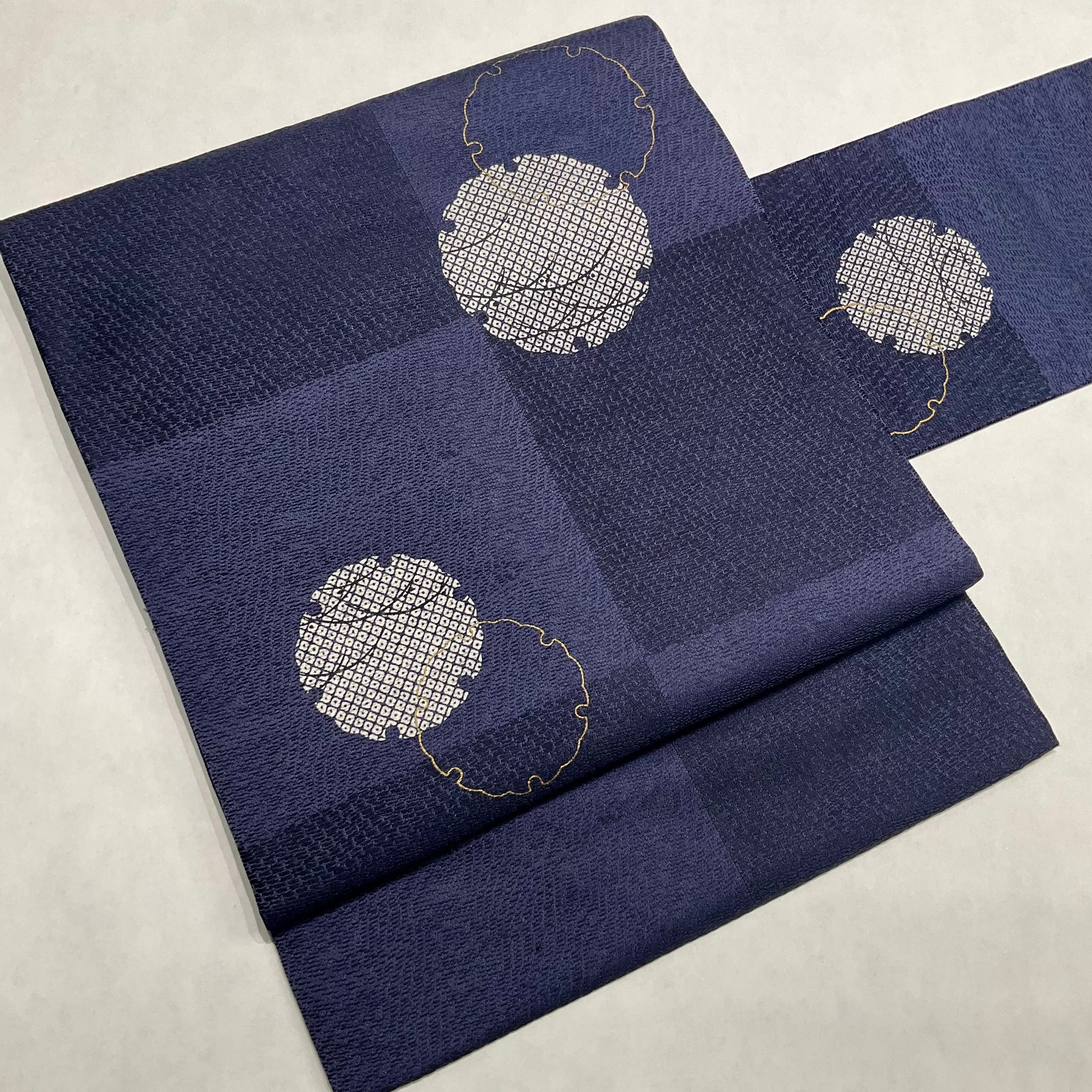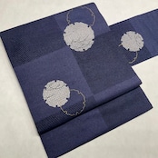 ネイビーの濃淡でデザインされた市松模様の地に、雪輪と芝草が描かれた名古屋帯です