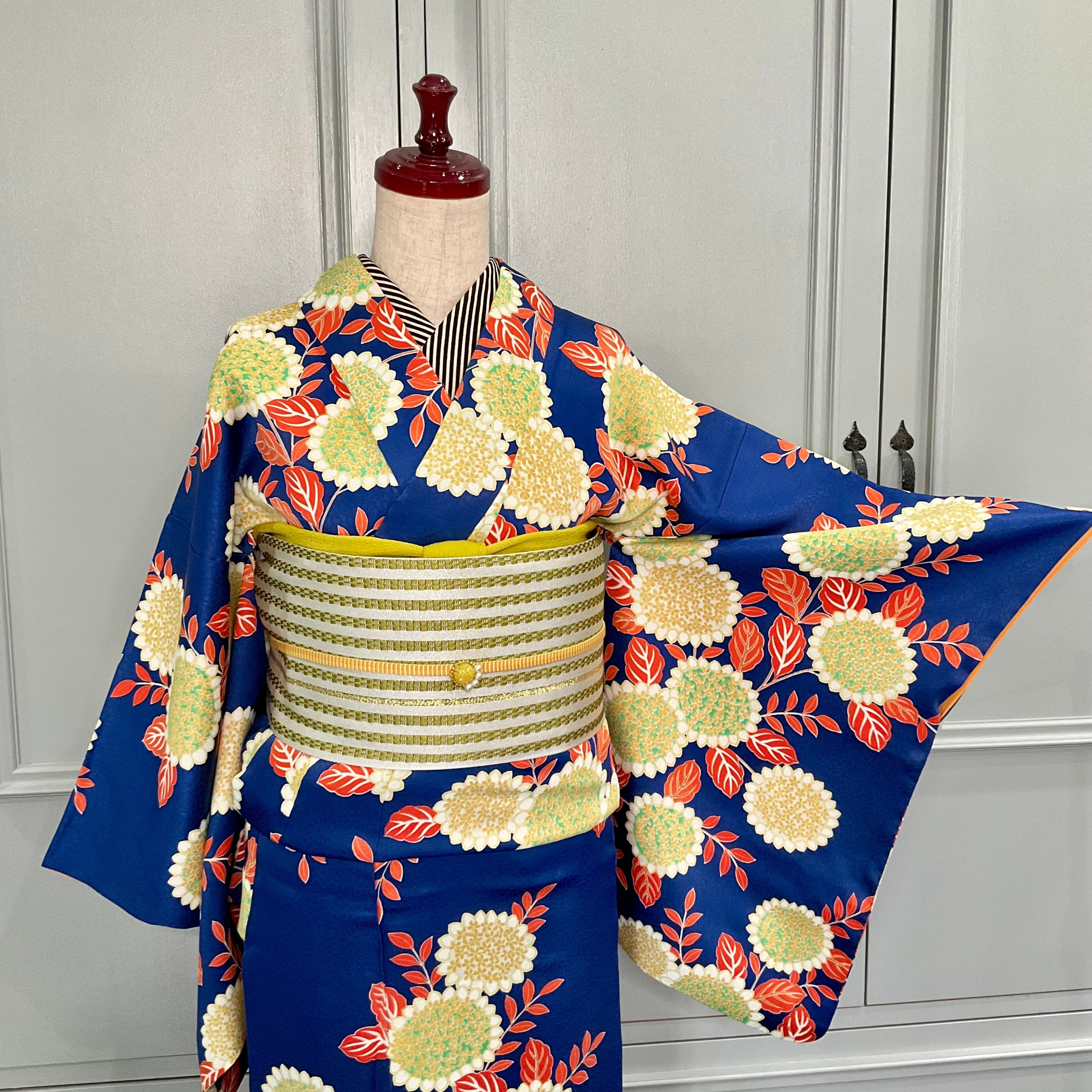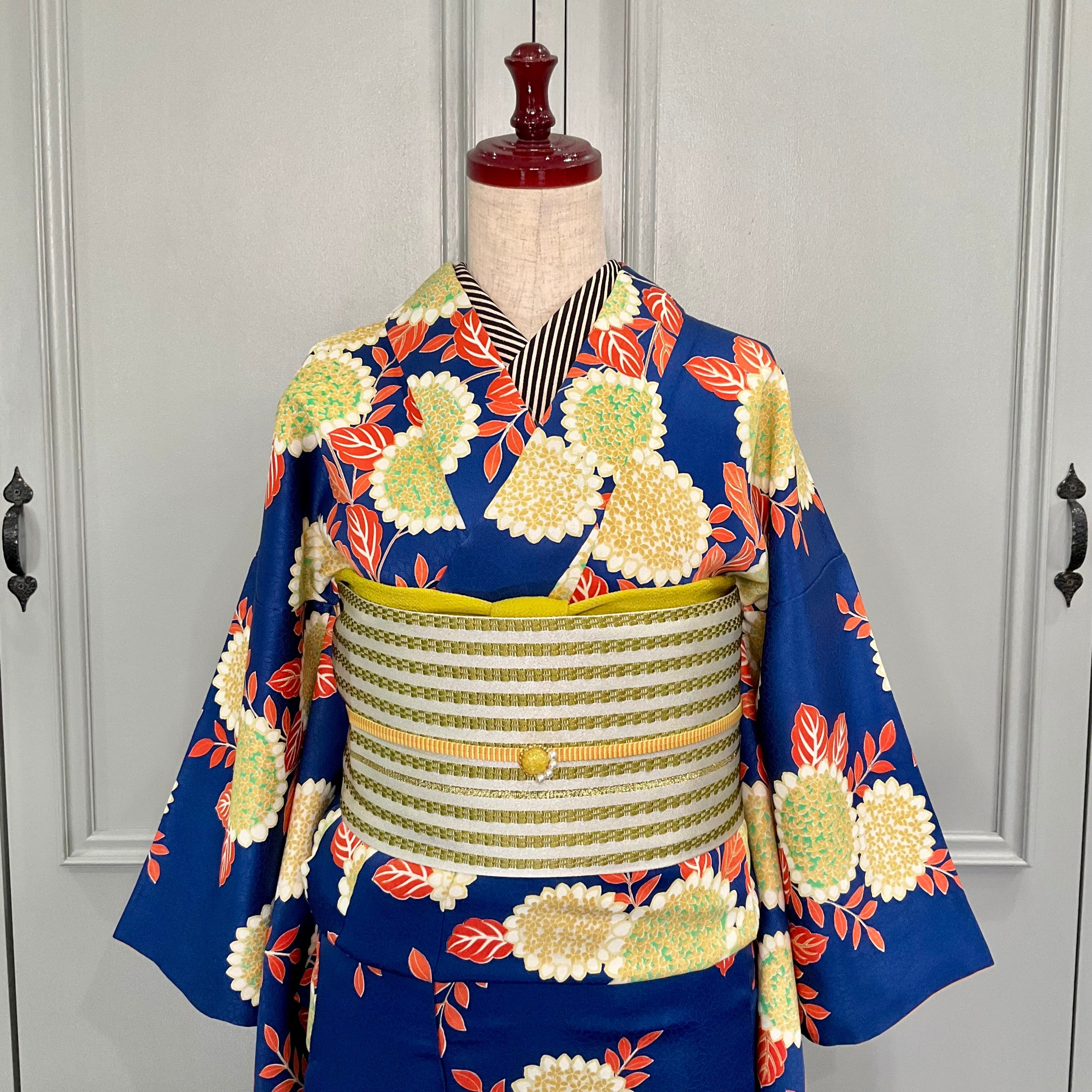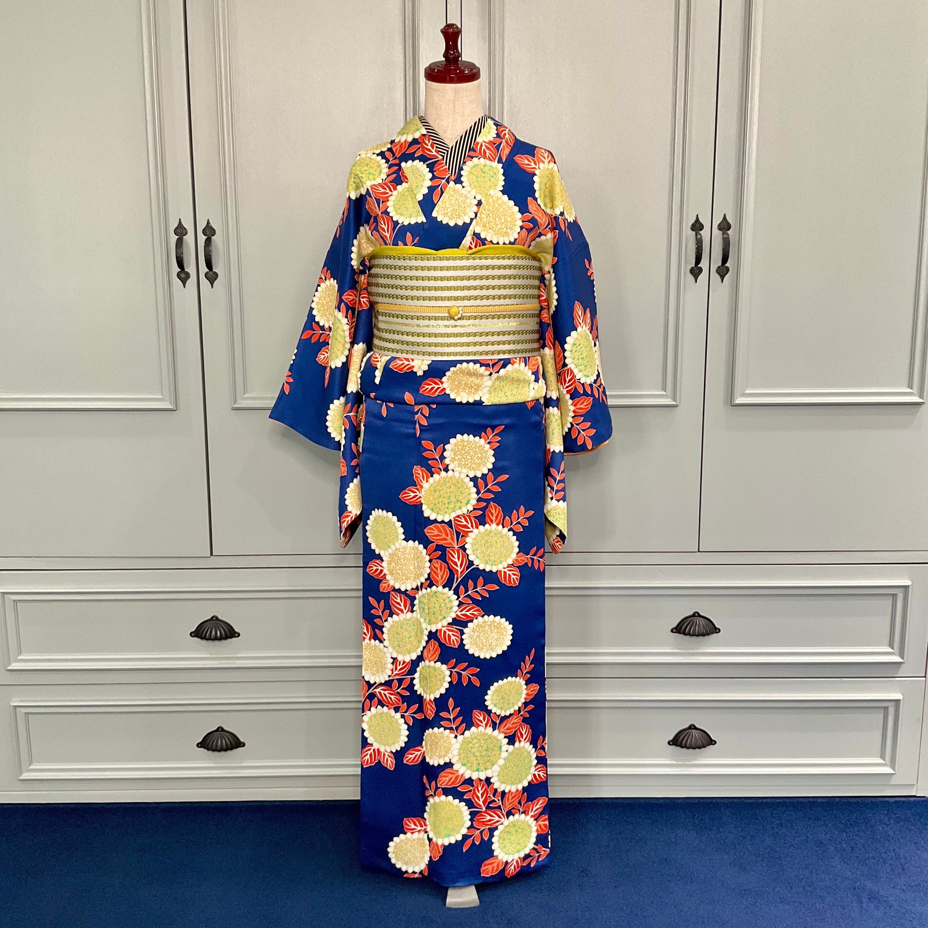 深いブルーの地色に、色鮮やかな花模様が大人可愛い小紋着物です