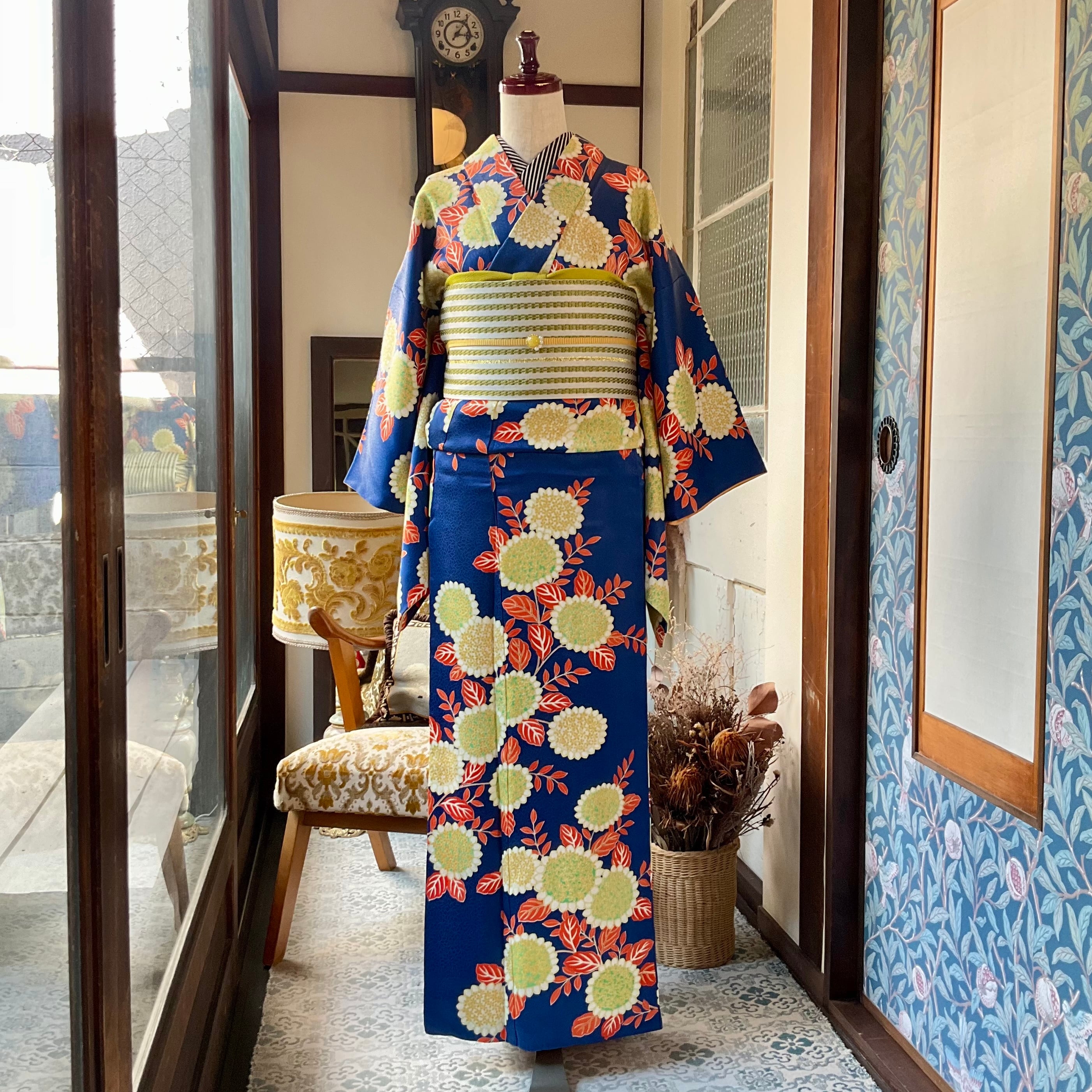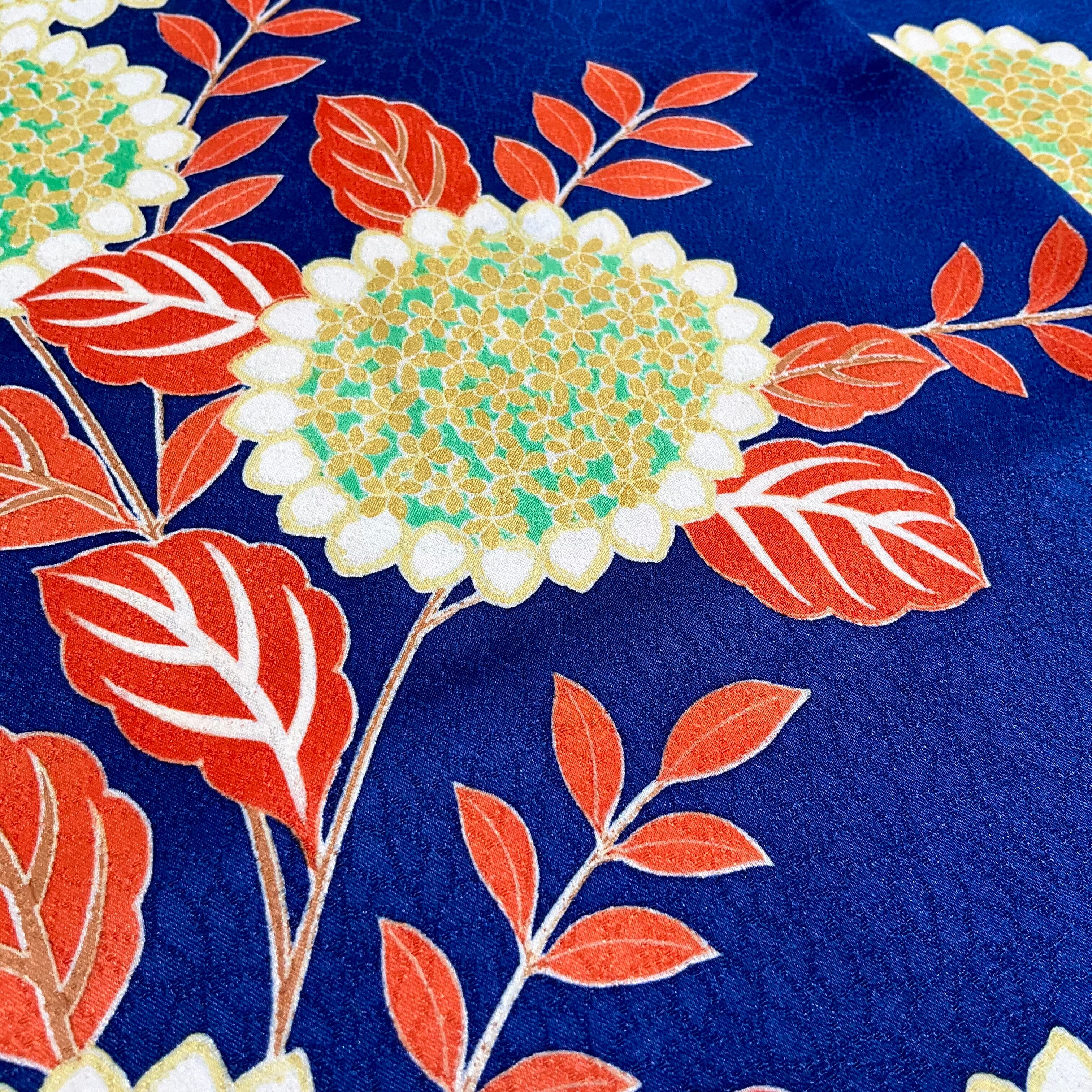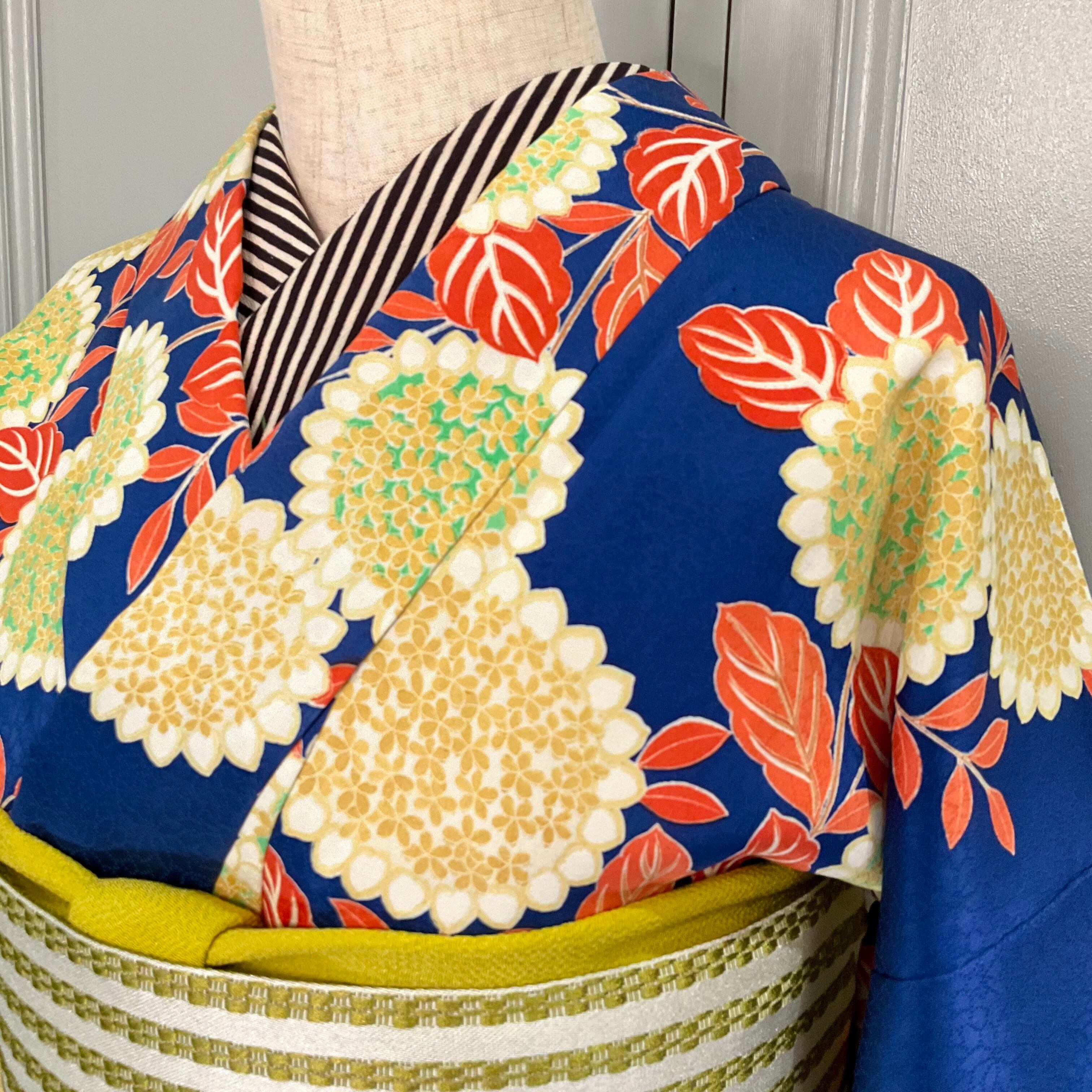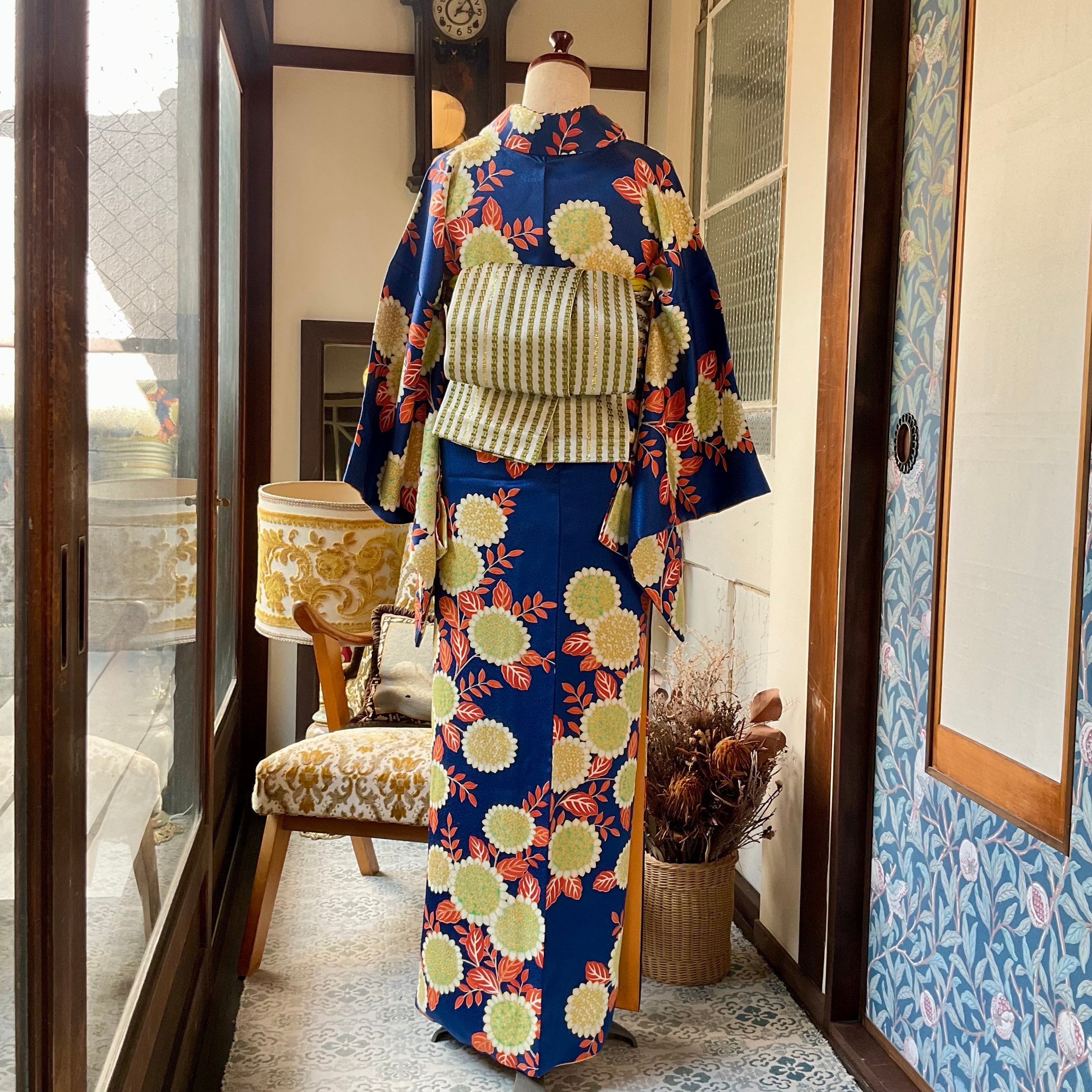 深いブルーの地色に、色鮮やかな花模様が大人可愛い小紋着物です