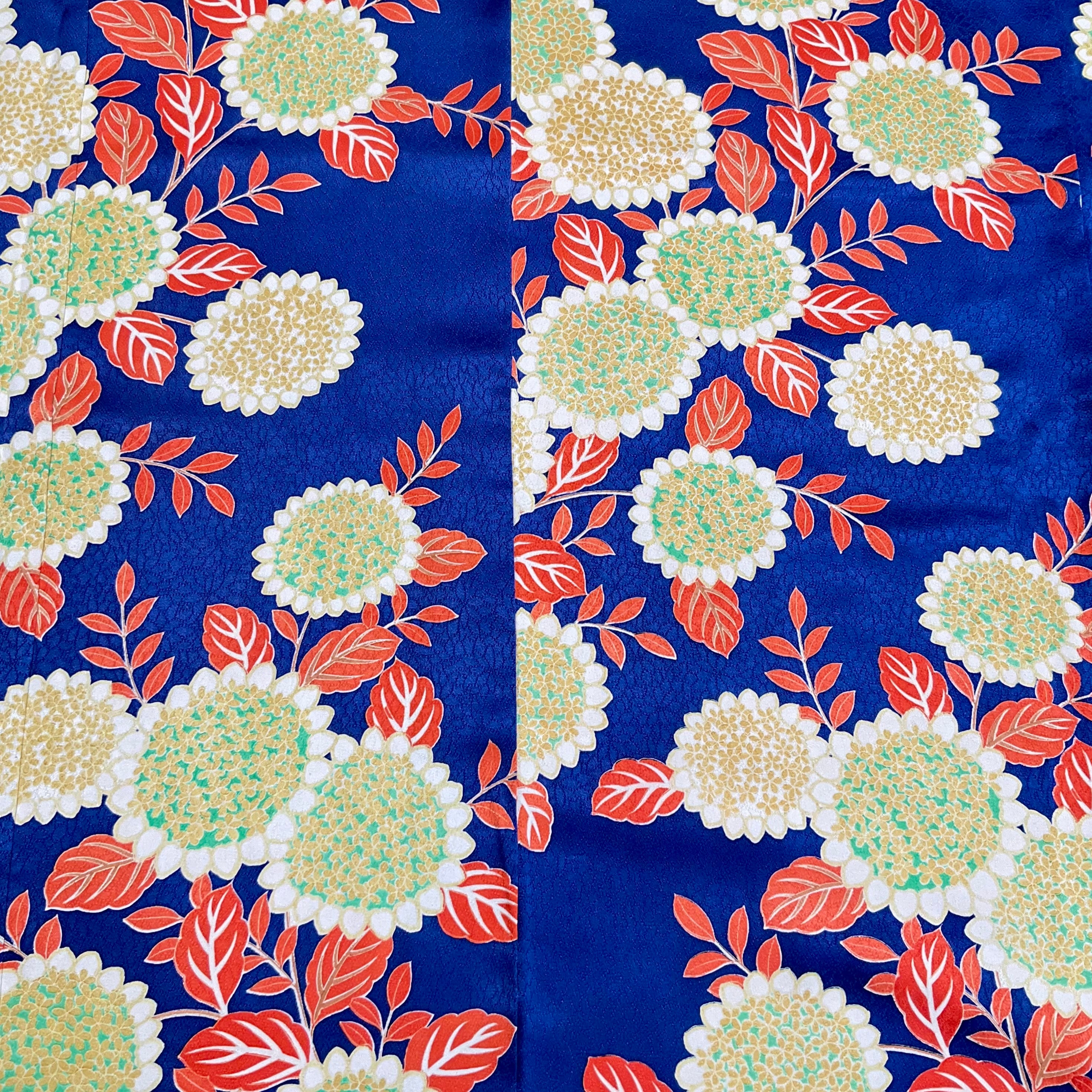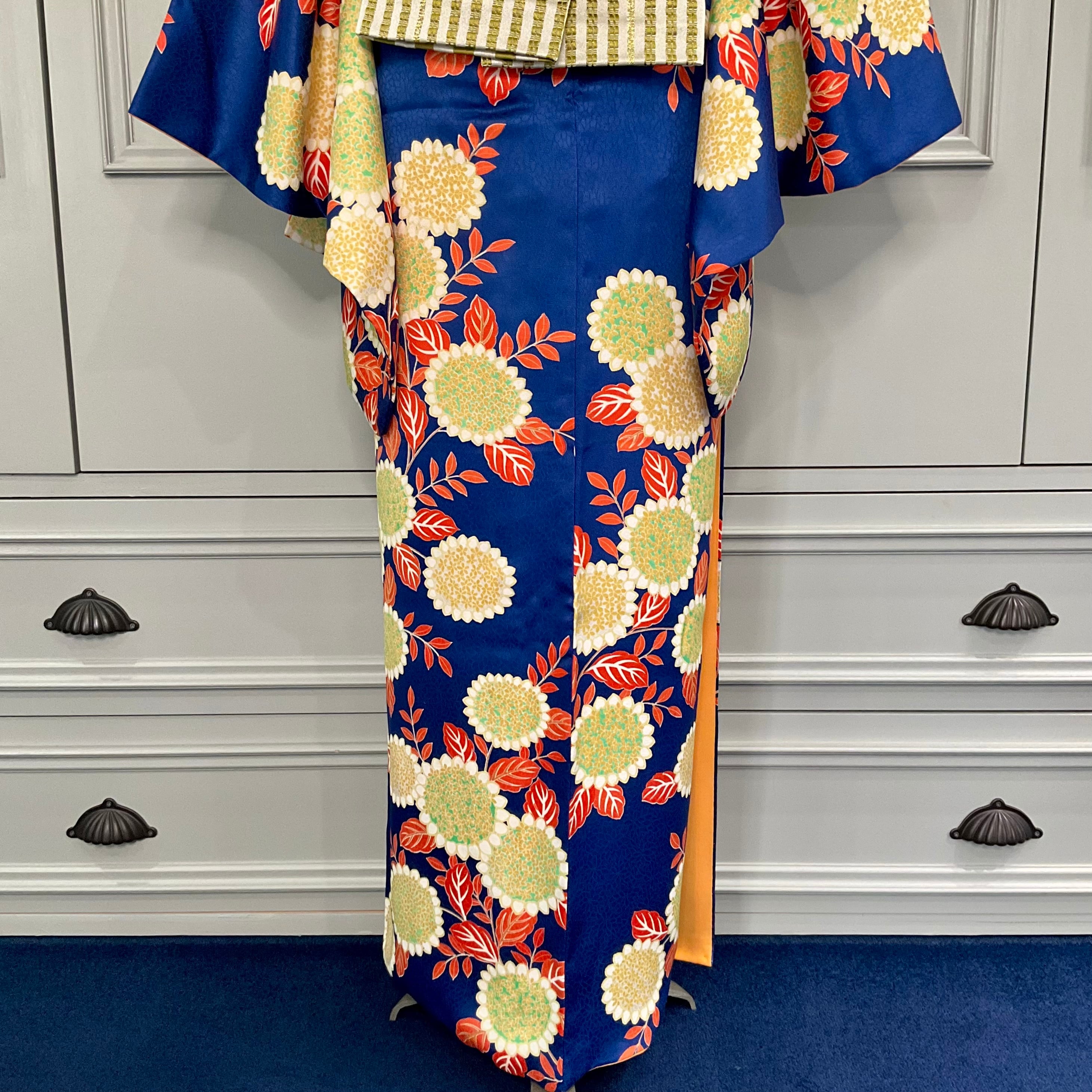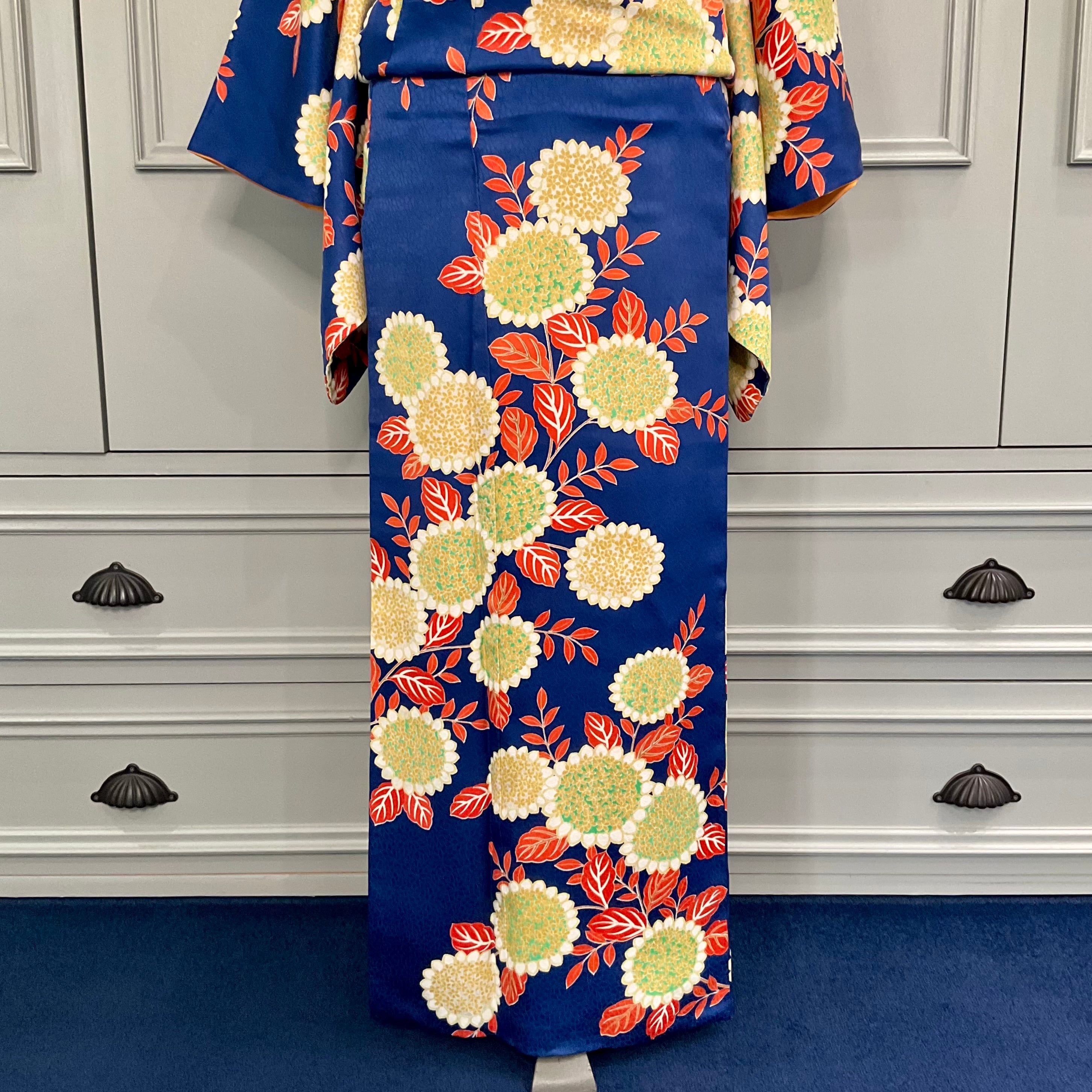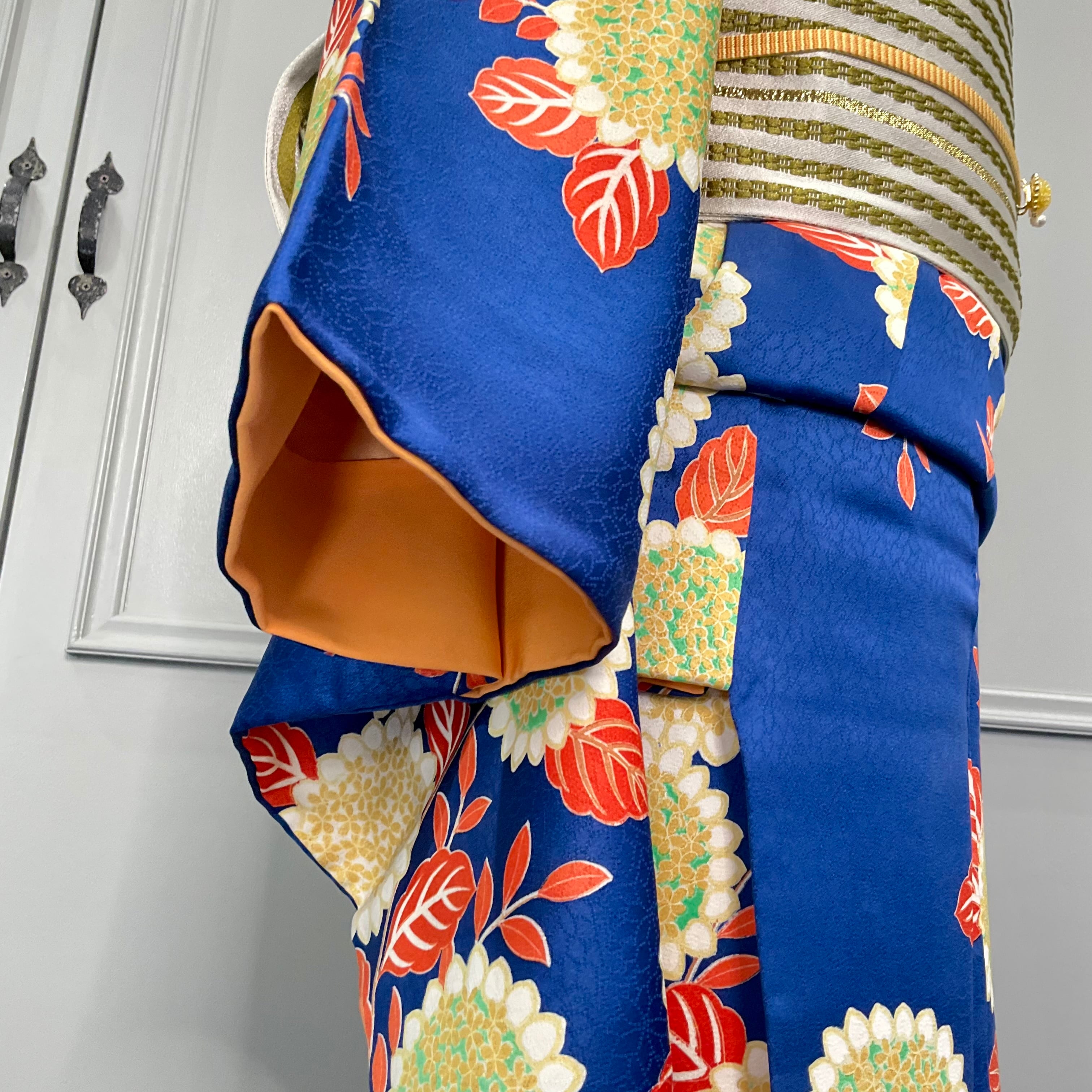 long*蒼の春*花模様 ブルー オレンジ ロイヤルブルー 青 小紋着物 B595