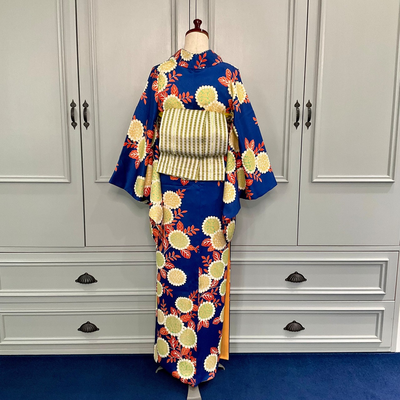 深い海を思わせるようなブルーの地色が大人な表情ですが、やさしく咲いた花模様が可愛らしくcuteな一着