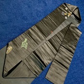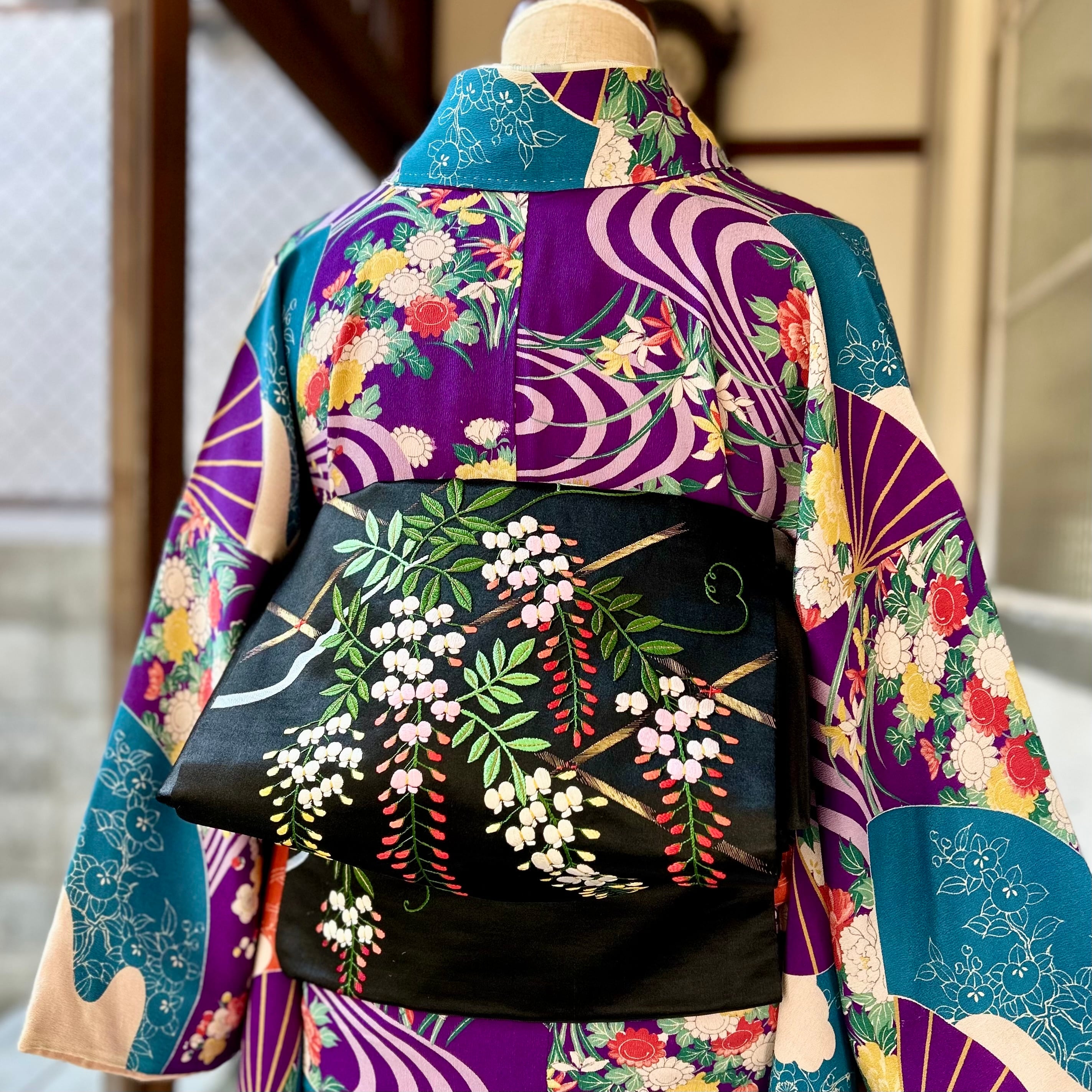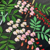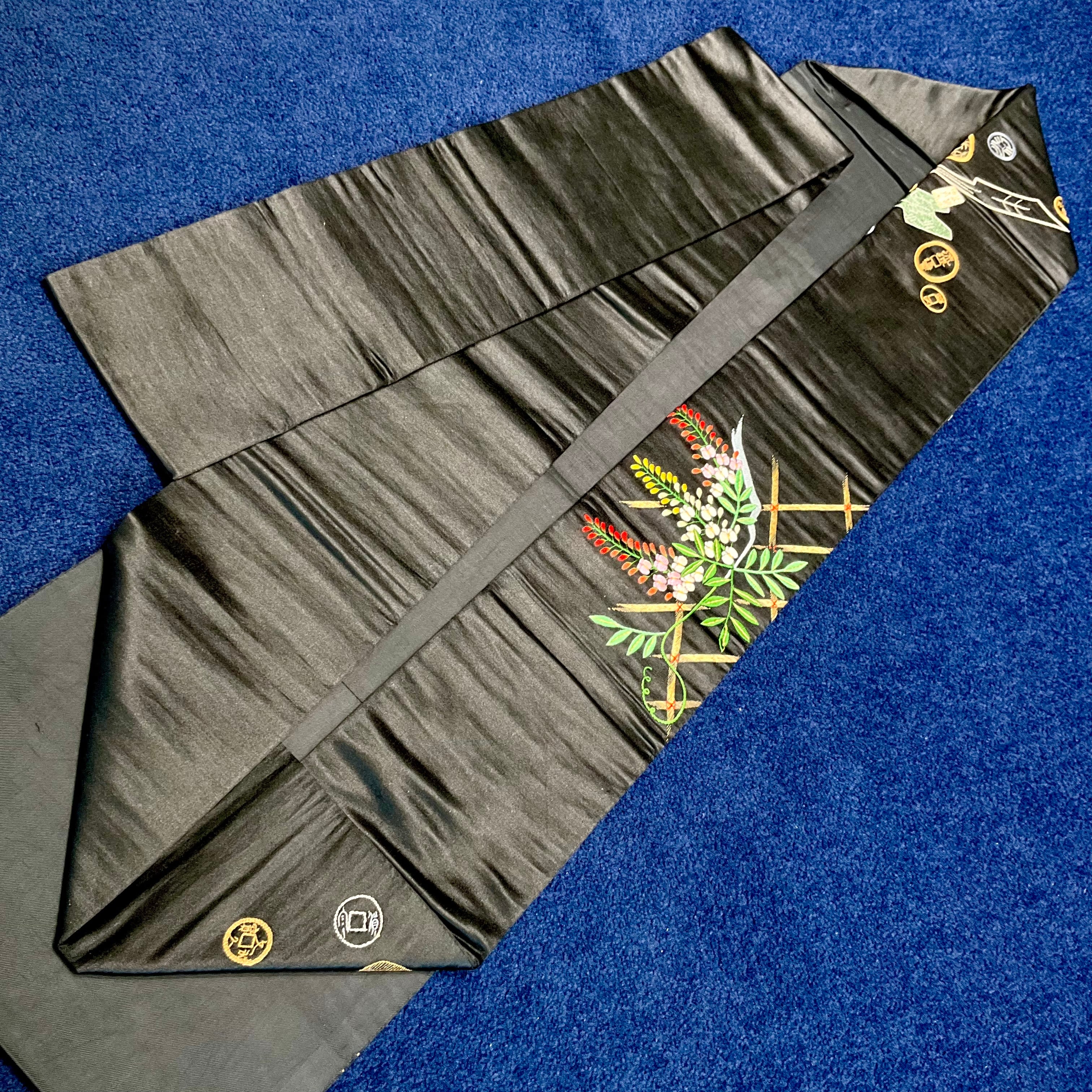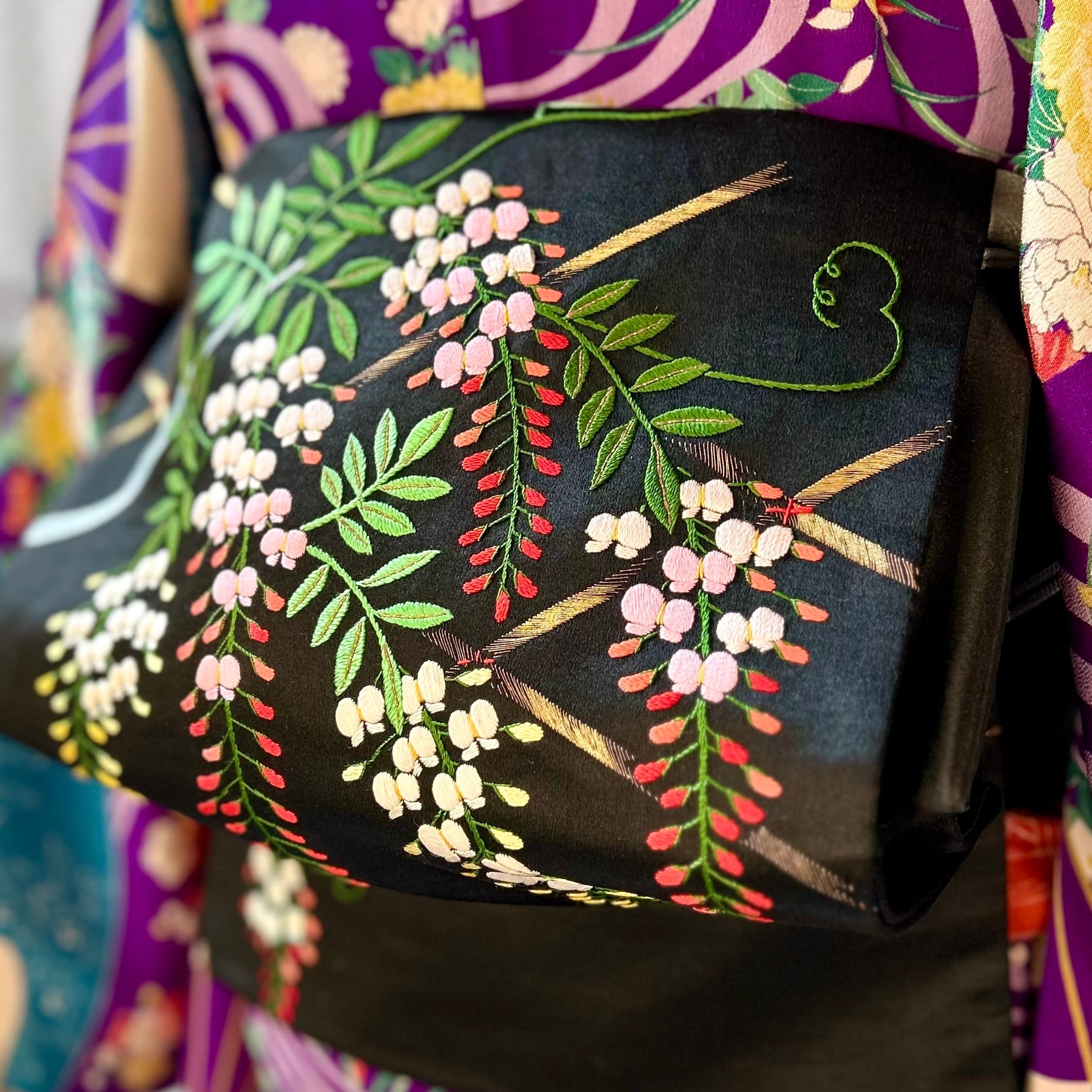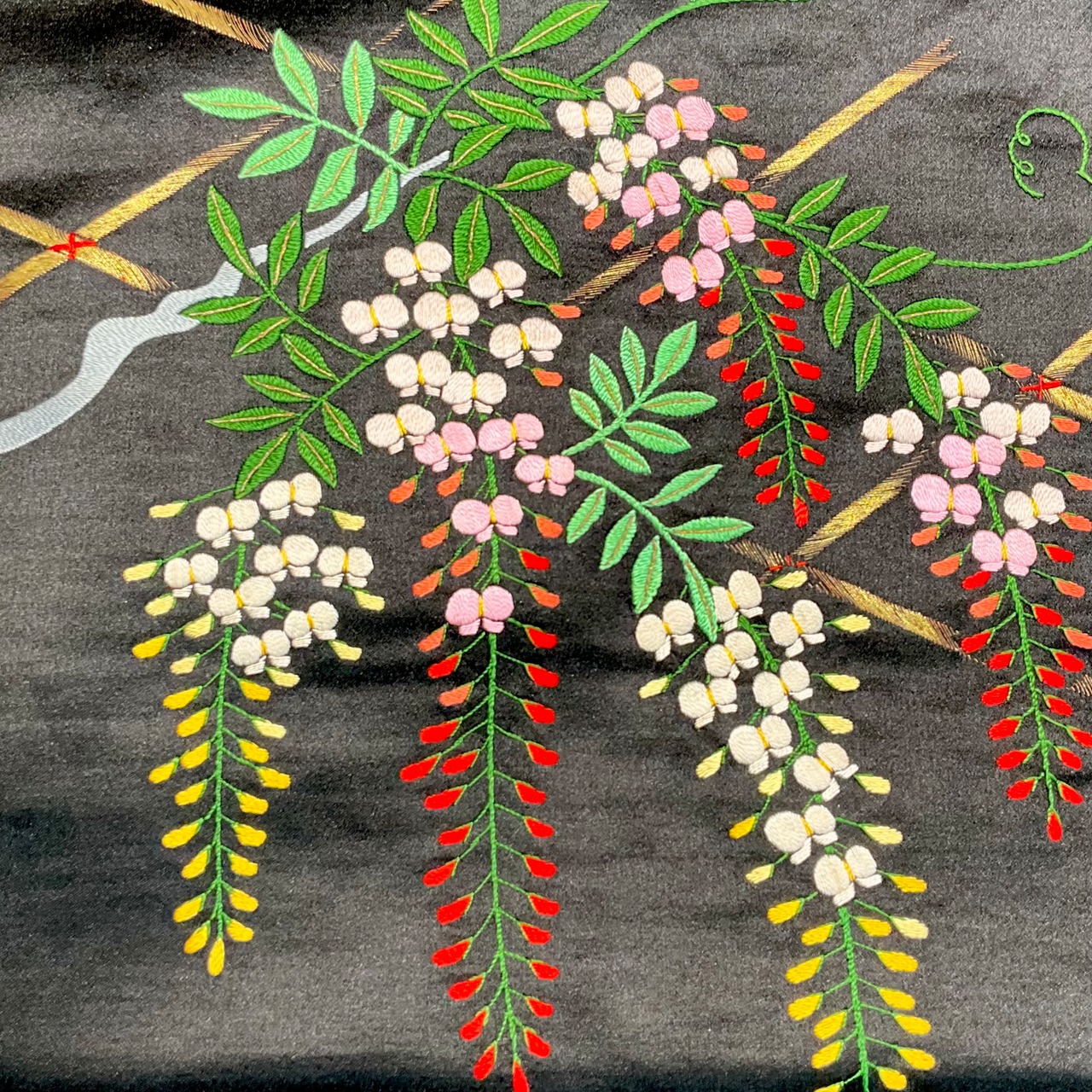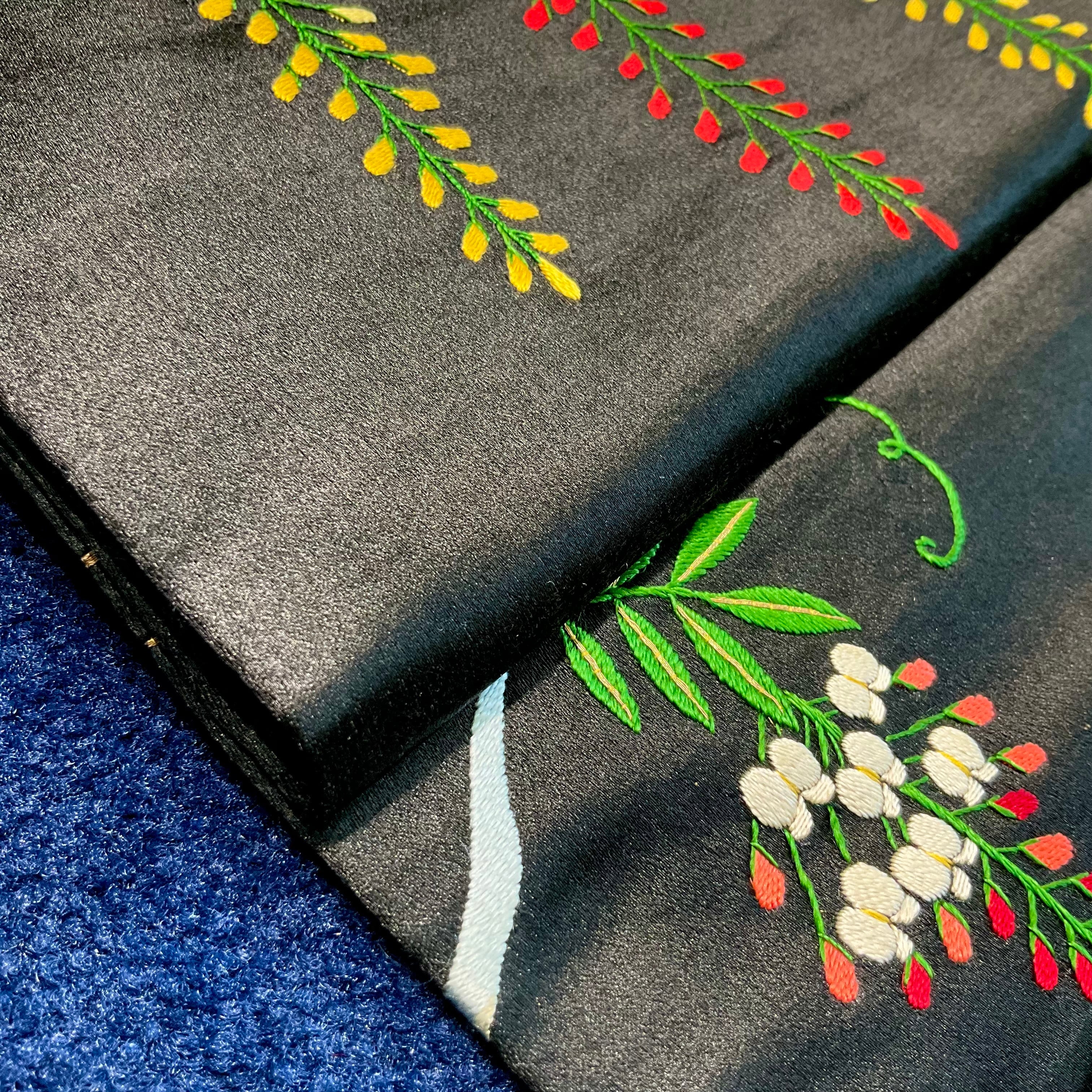 藤棚までも美しく施された手刺繍のデザインは、黒の艶やかな繻子地に映え、まるで夜風に揺れているように枝垂れ咲く様子が浮かび上がっていますね