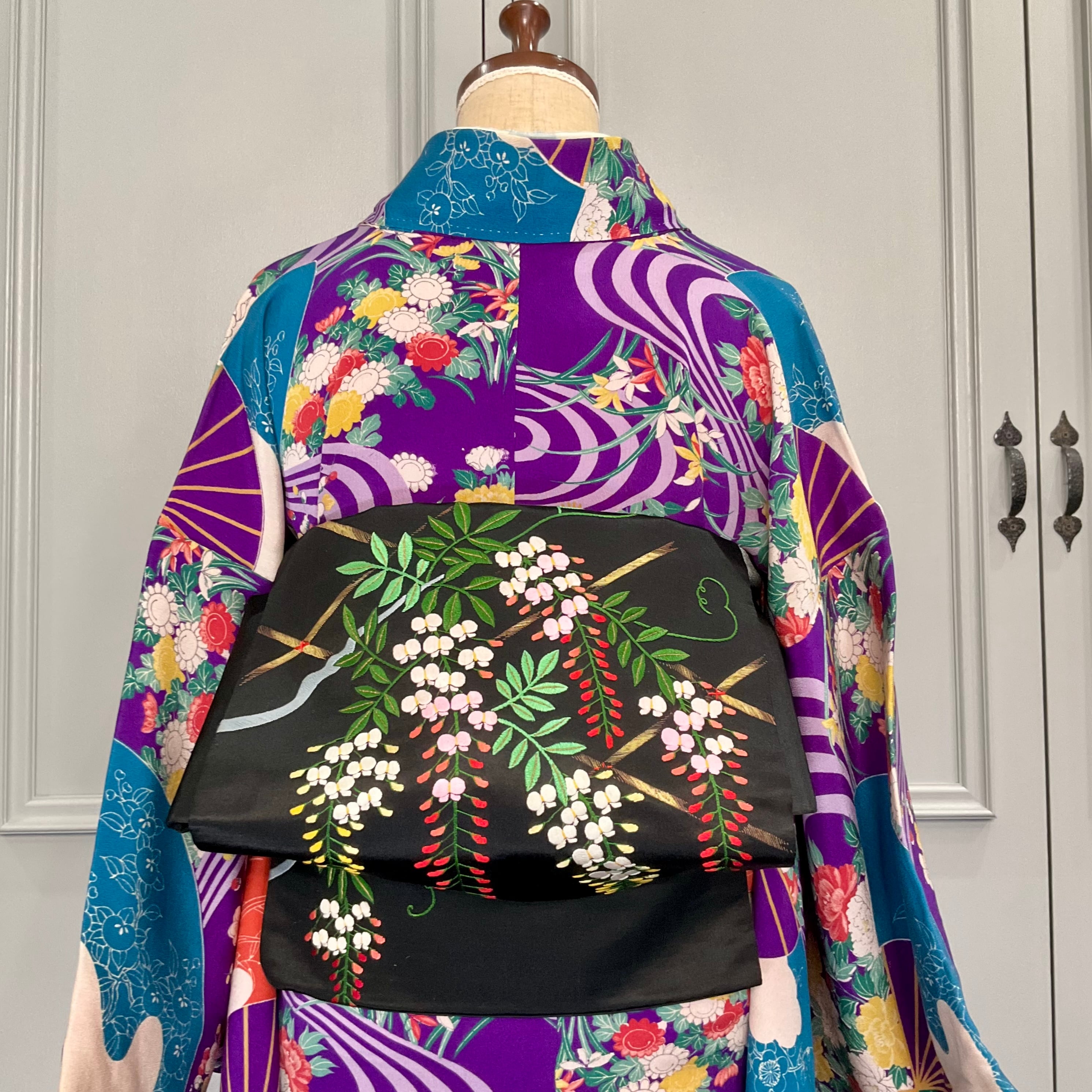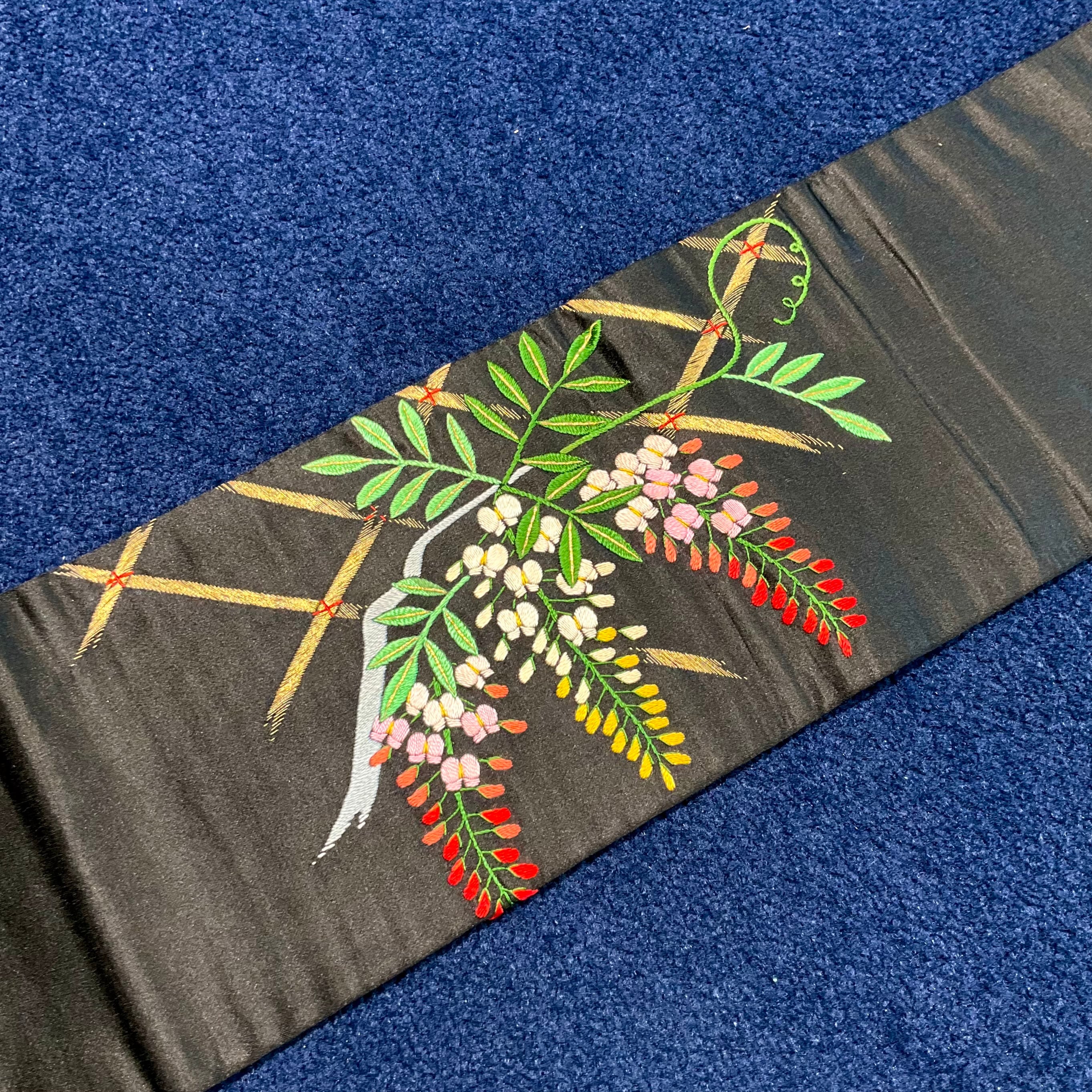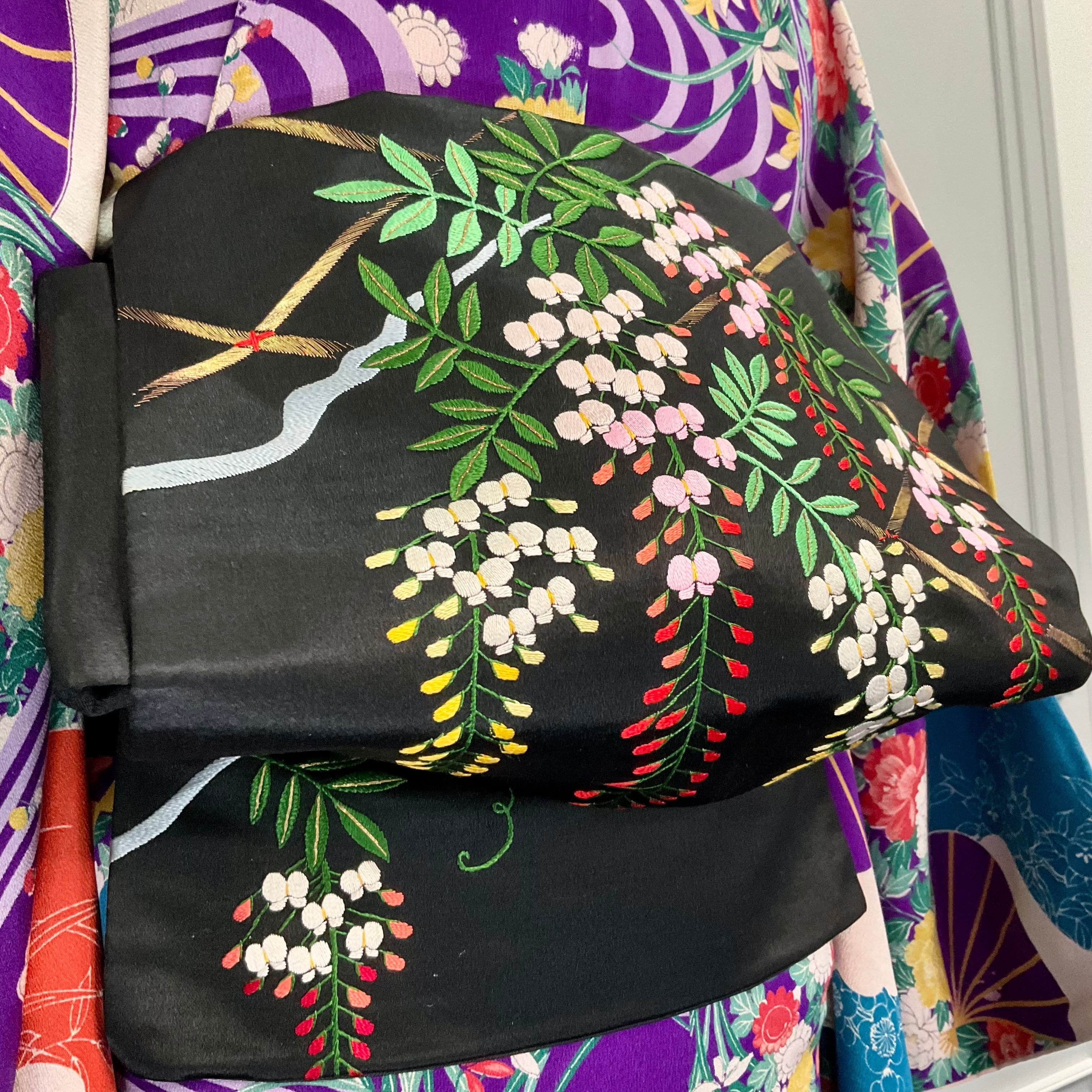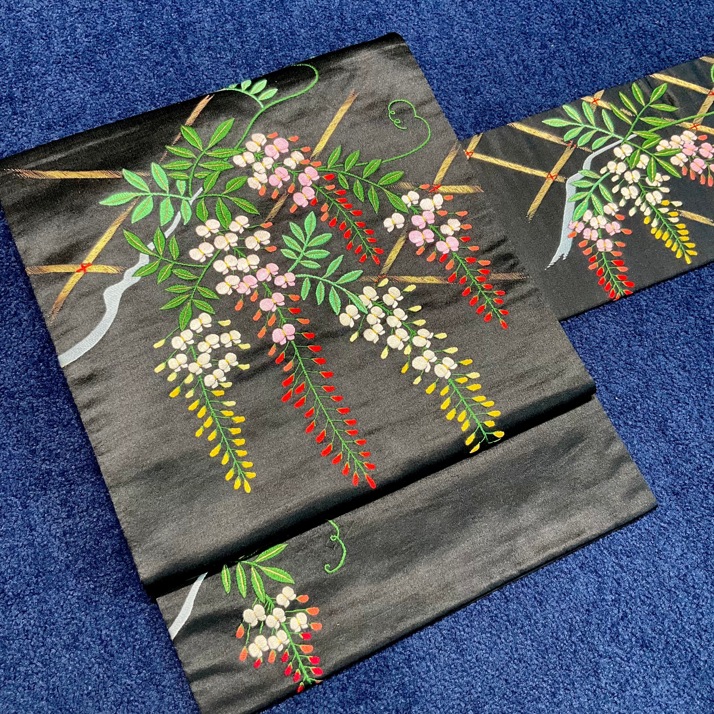 Wisteria in Midnight*藤 藤棚 ふじ 刺繍 黒繻子 刺繍帯 アンティーク名古屋帯 B597