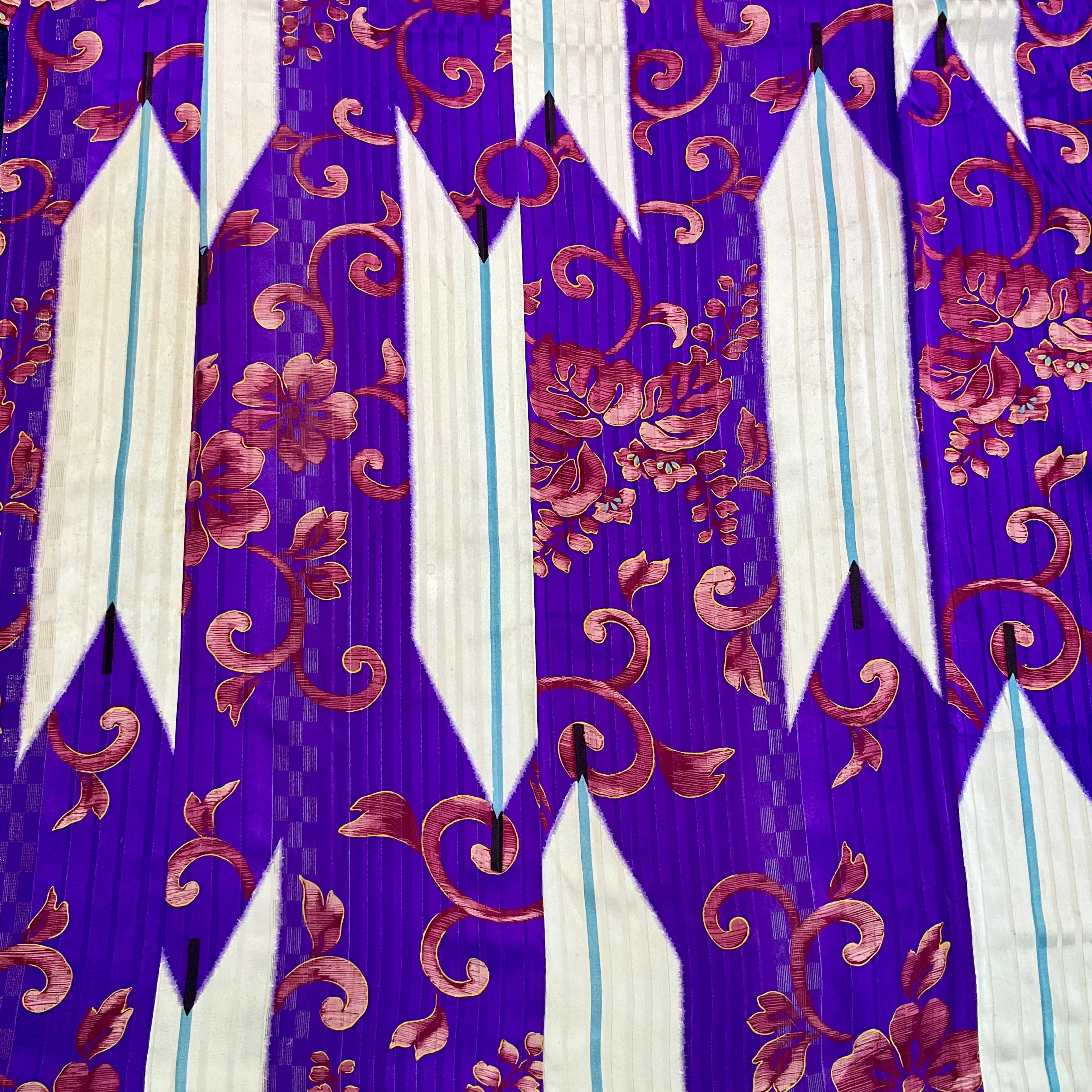 青みのある紫地にアイボリーの大きな矢羽根と唐草模様が描かれた袷のアンティーク小紋着物です