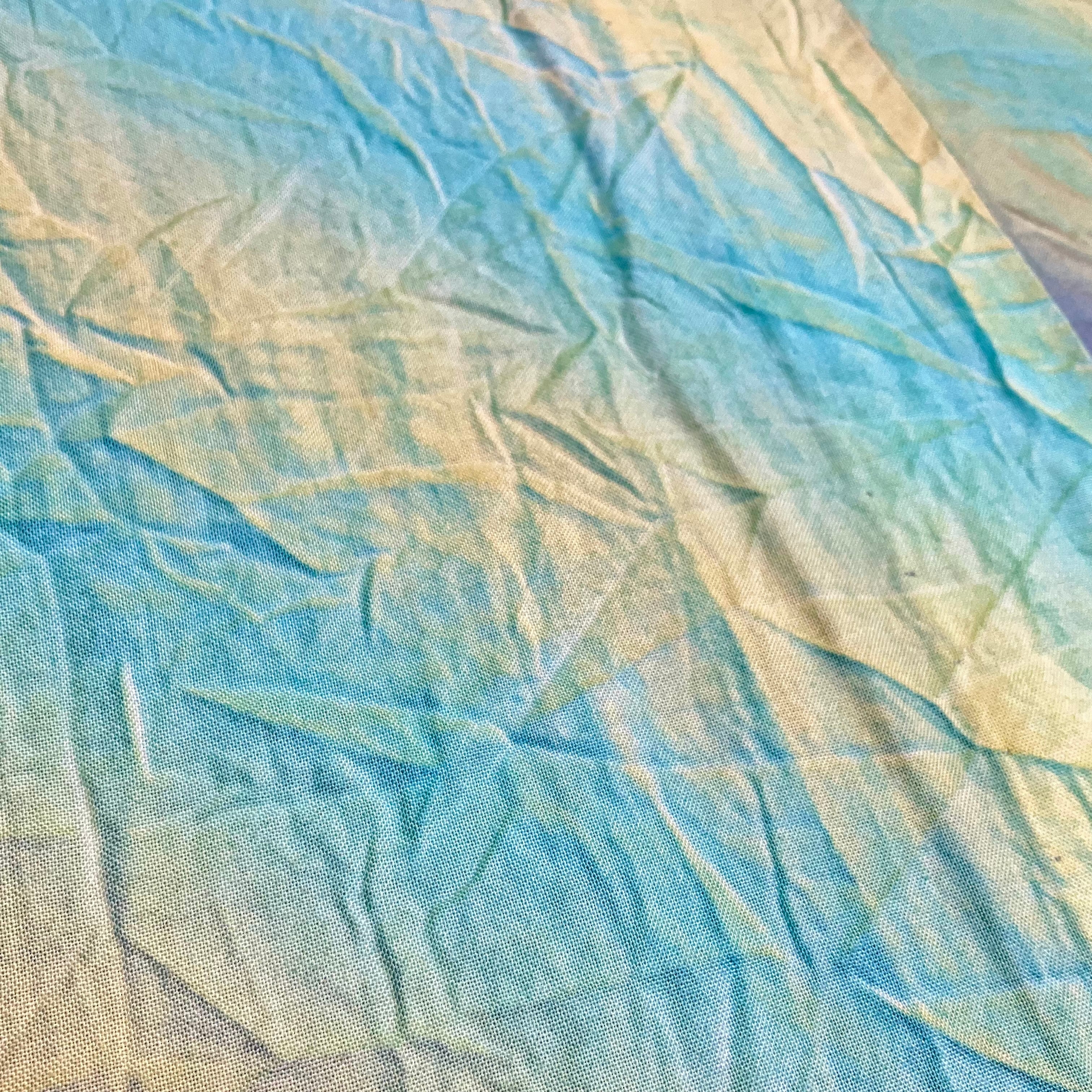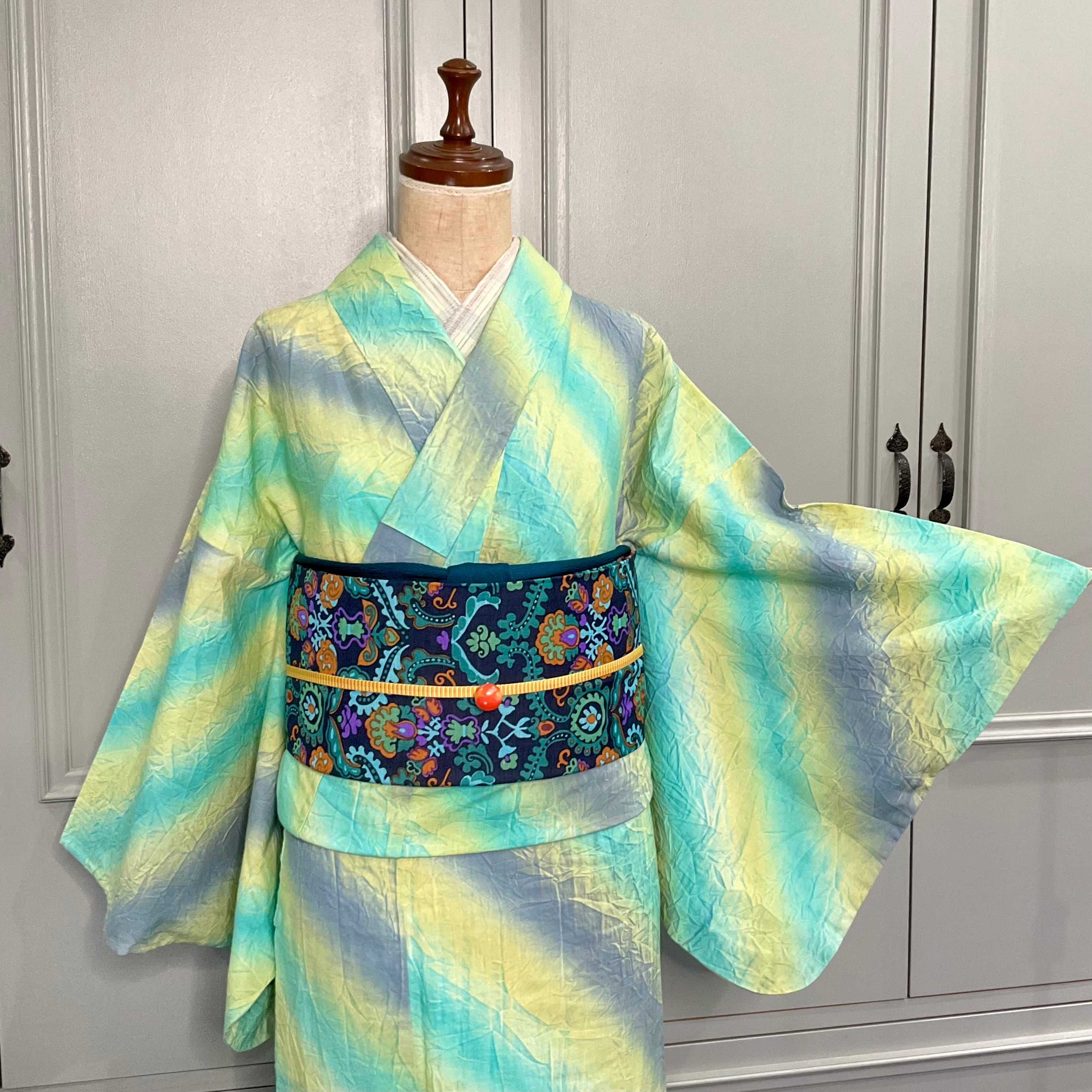 爽やかなミントグリーン×イエロー×パープルの斜め縞模様がステキな木綿の単衣着物です