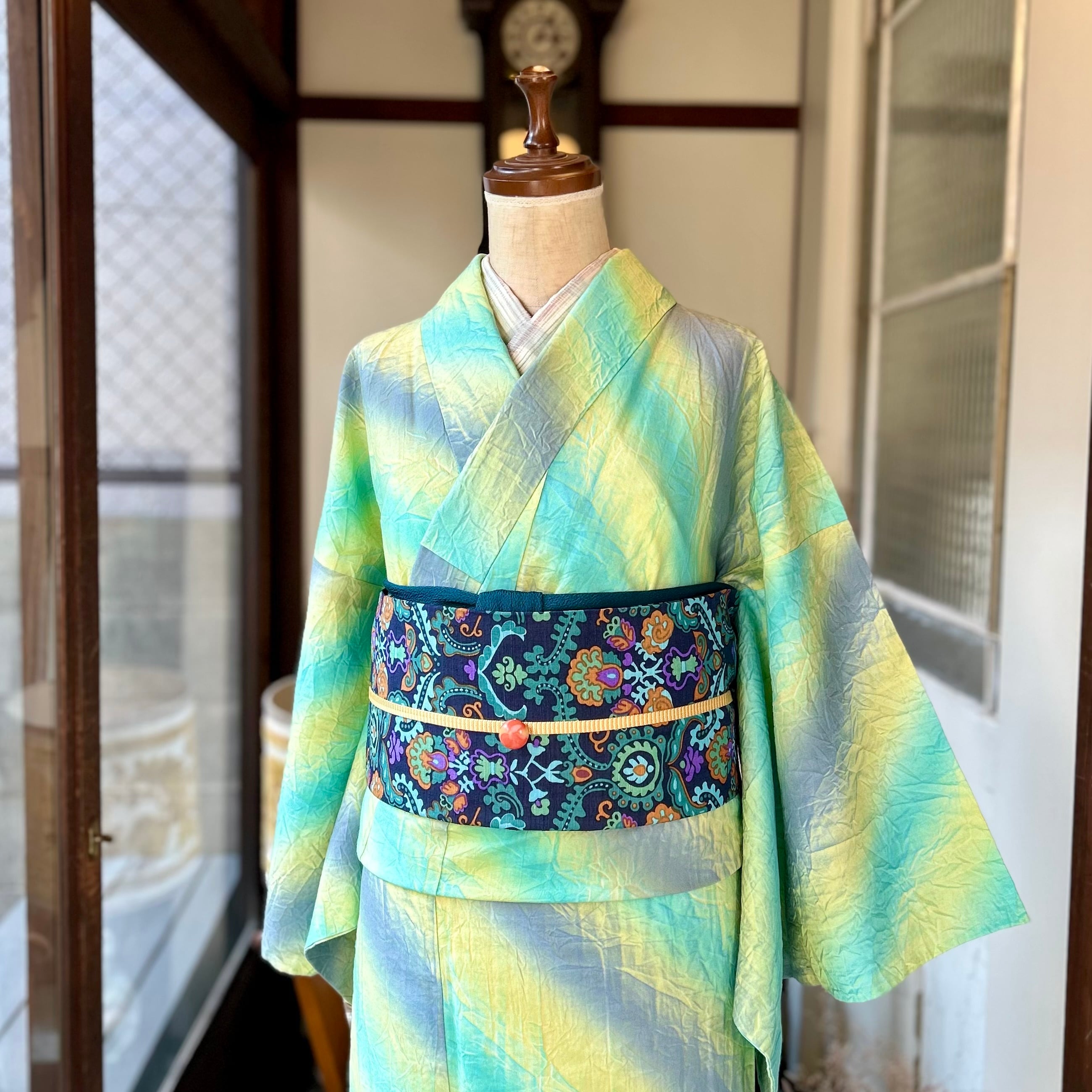 ○合わせた帯とオリジナル帯揚げビリジアングリーンとオリジナル三分紐ハニーレモンはweb shop掲載品です♪