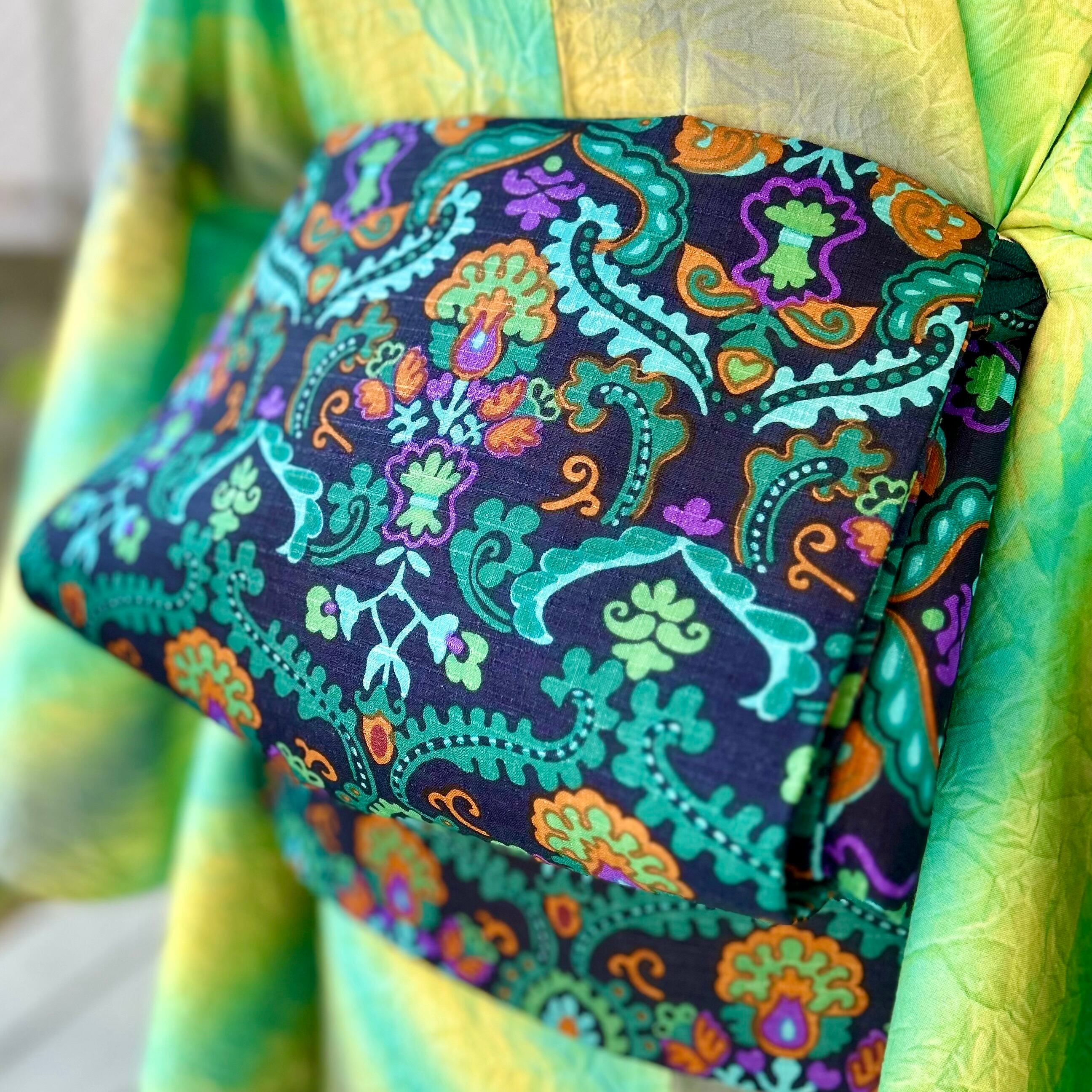 Emerald Paisley*更紗模様 オリエンタル エメラルド ネイビー オレンジ 名古屋帯 B604