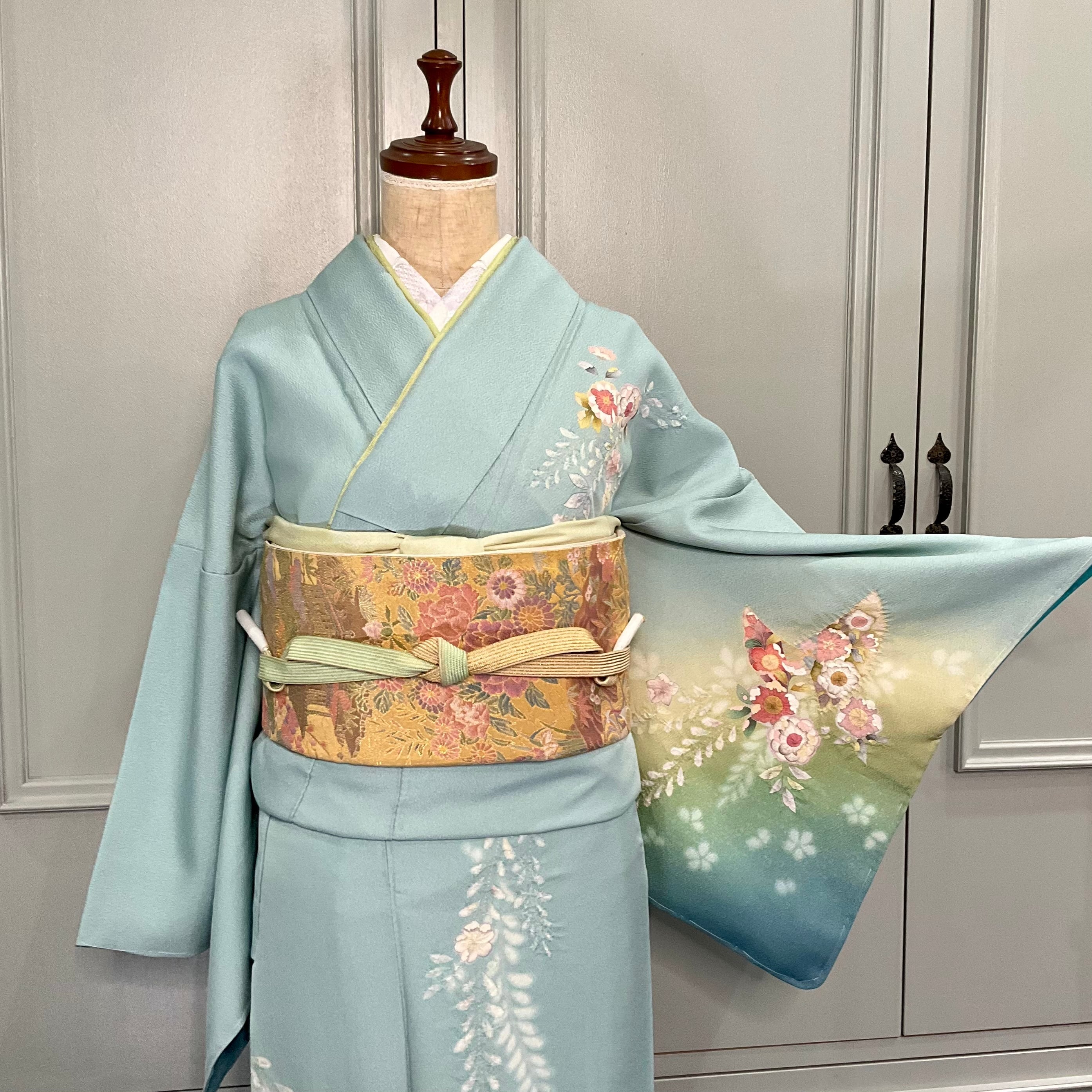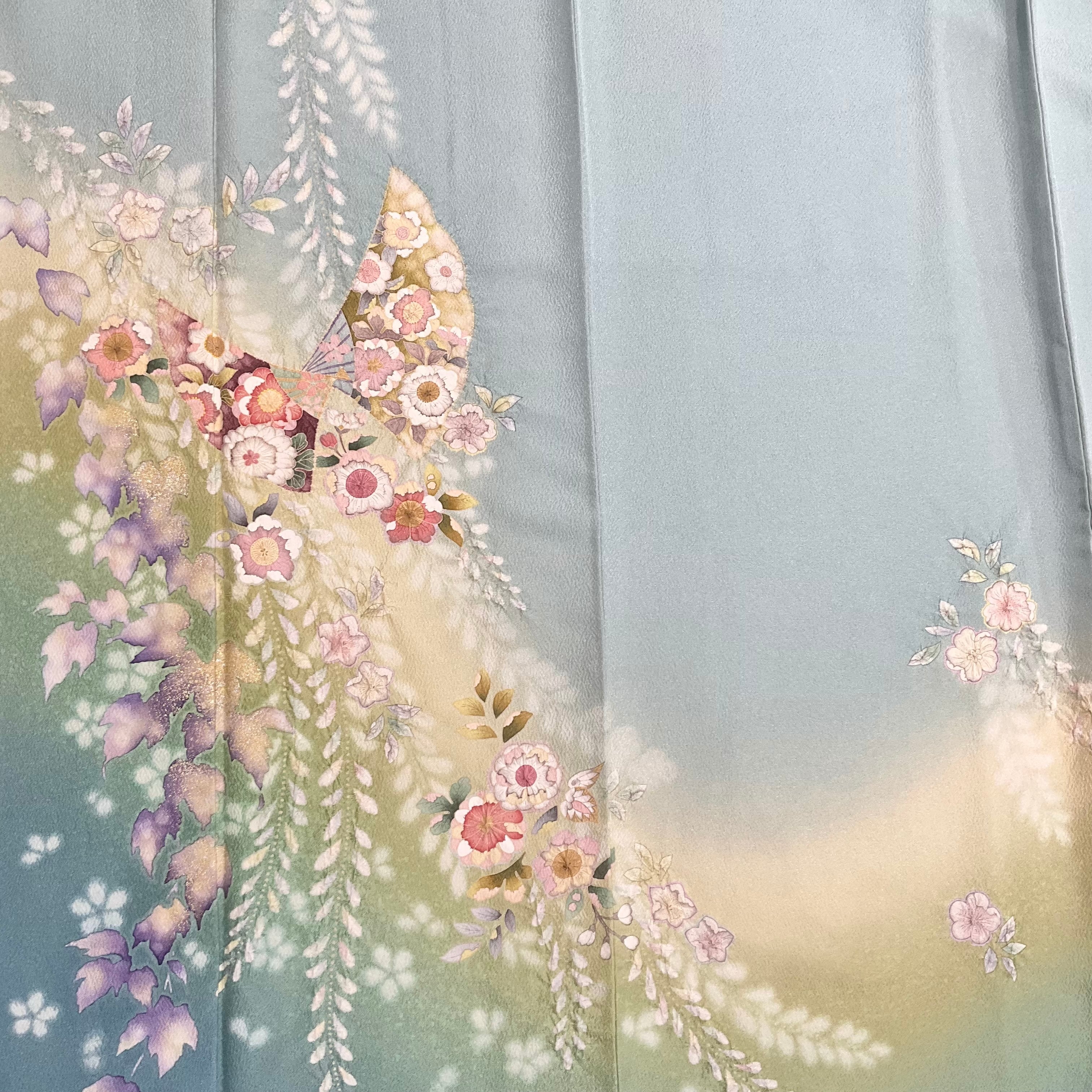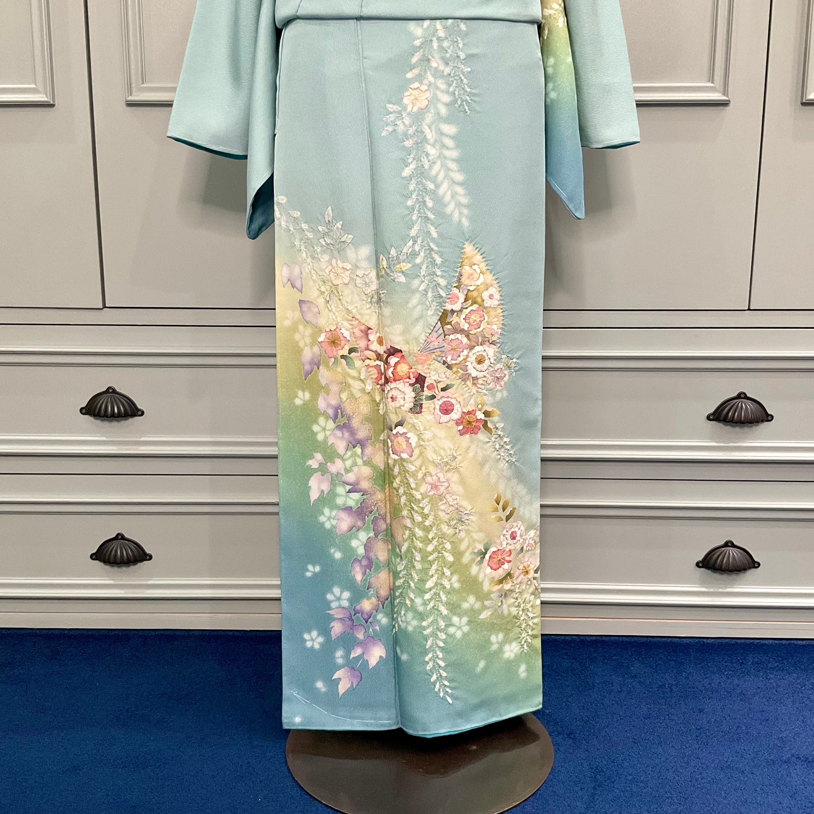 訪問着は、アクアブルーからやわらかなグリーンのぼかしが美しい地色に、辻が花の模様と桜や藤に絞りが施された立体感が上品で華やかなデザインです