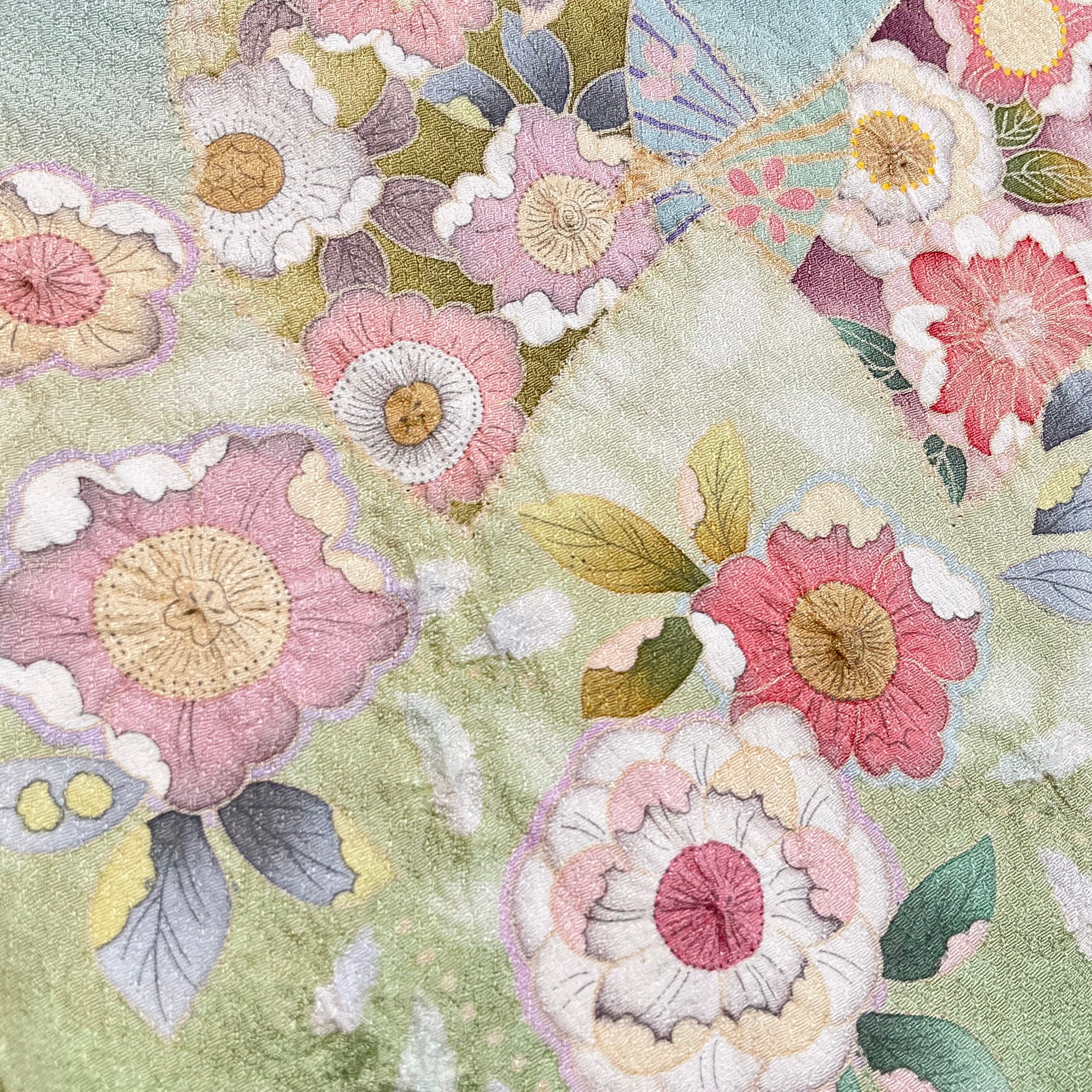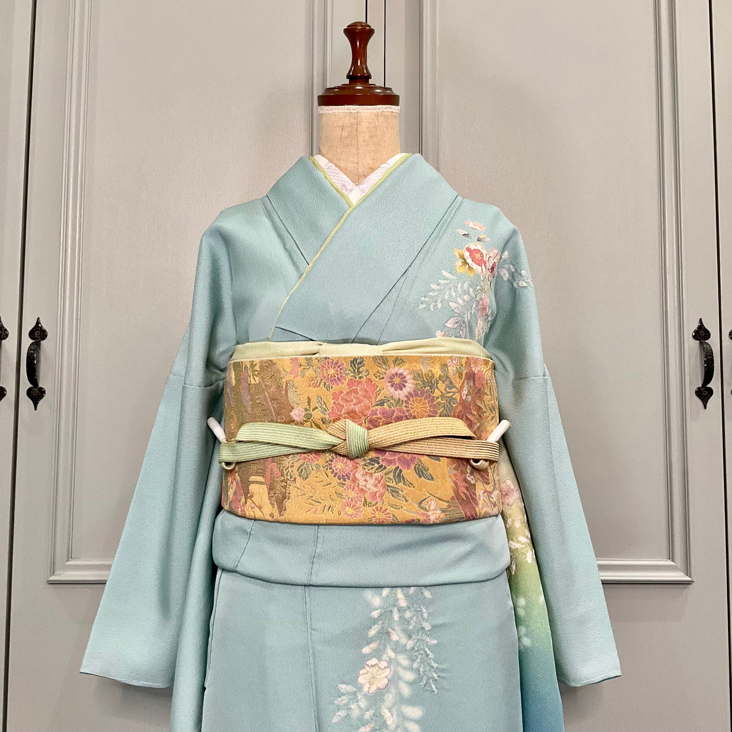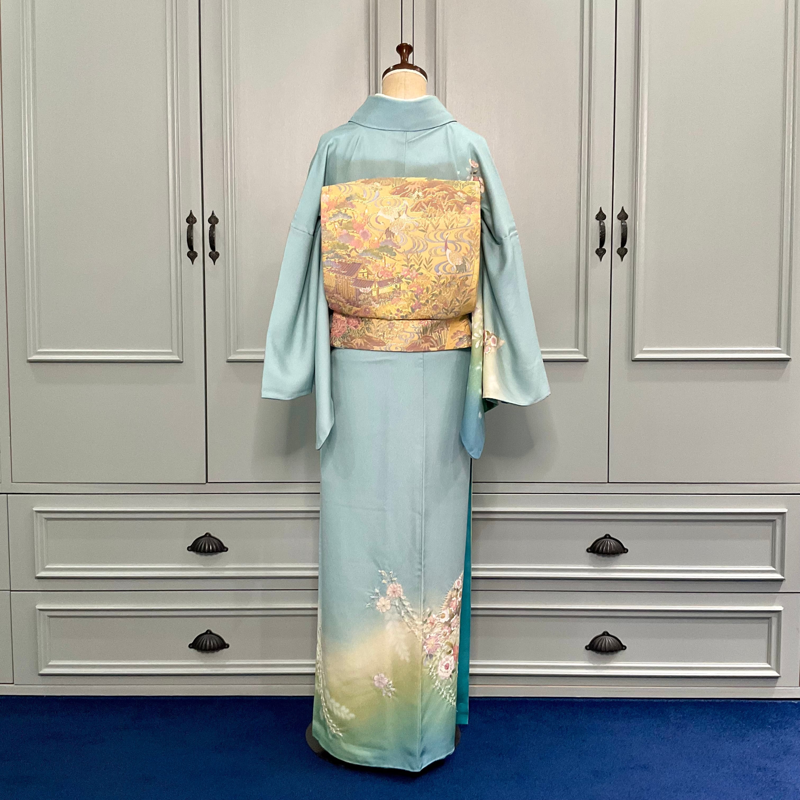 訪問着は、アクアブルーからやわらかなグリーンのぼかしが美しい地色に、辻が花の模様と桜や藤に絞りが施された立体感が上品で華やかなデザインです