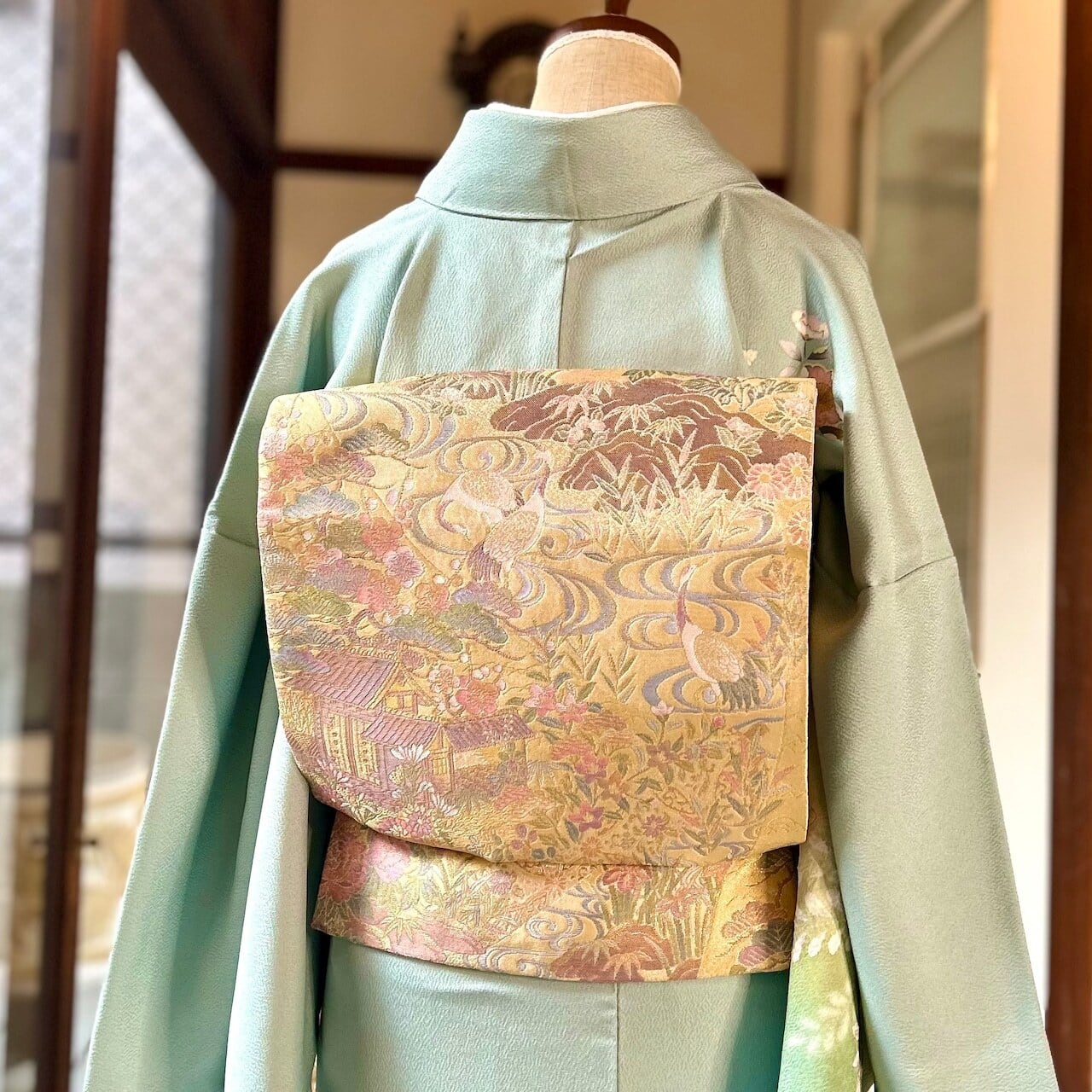 袋帯は、ゴールドの地色に鶴や流水、花模様、お祝いの席に相応しい松竹梅の吉祥文様などが美しく表現されています