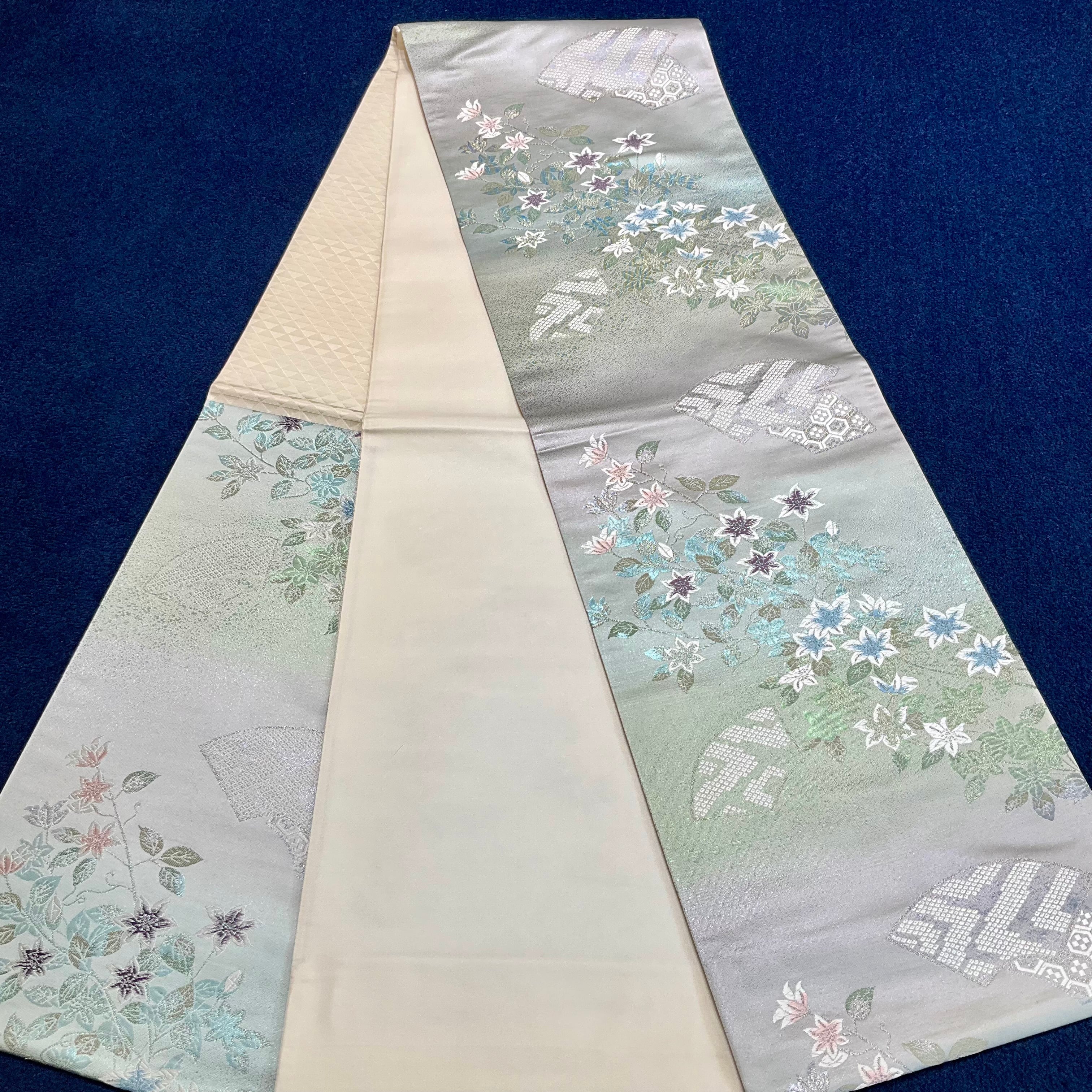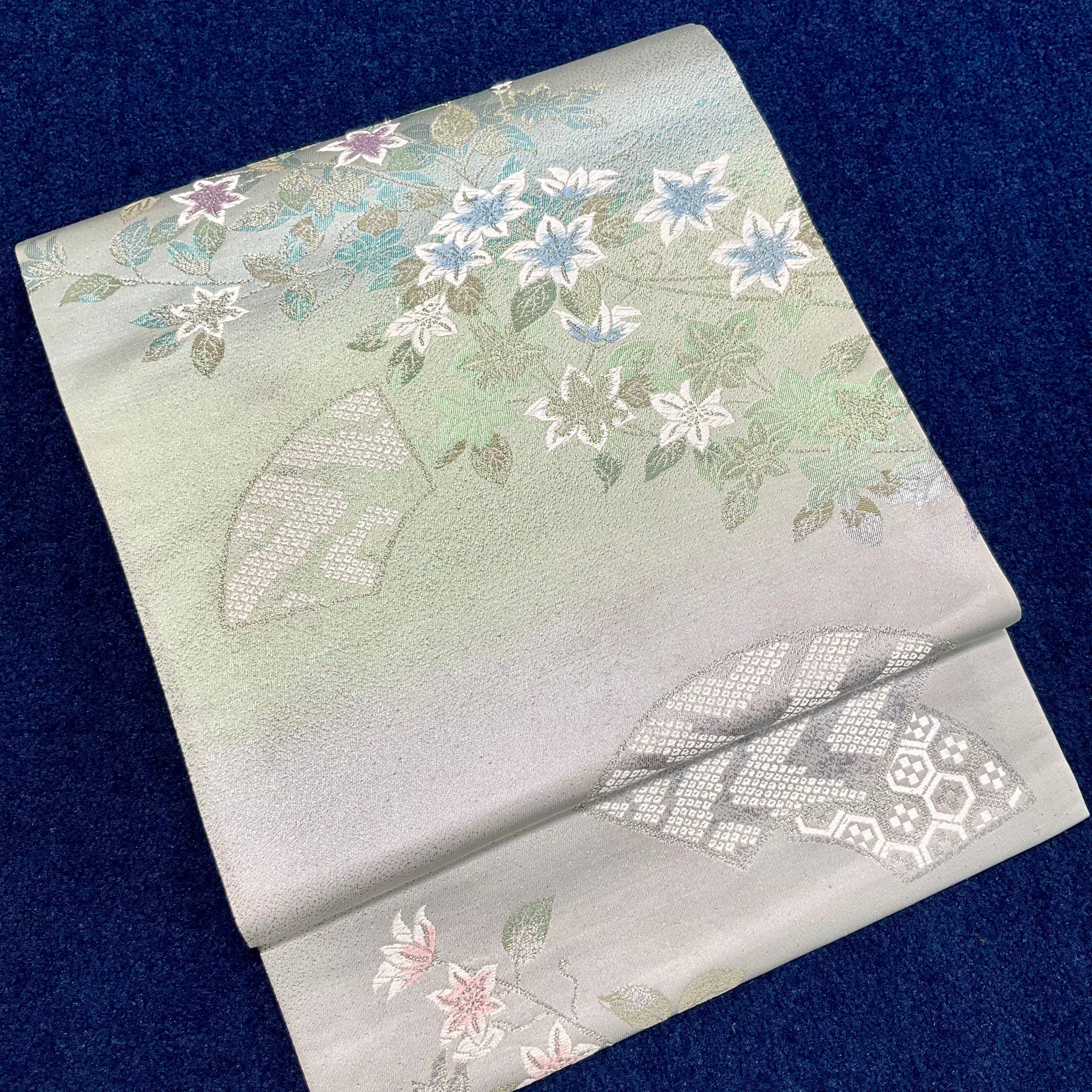 合わせた袋帯はシルバーグレーの地色に、やさしくブルーやグレープの色合いが目を惹く花模様、地紙の中に吉祥文様が描かれ、甘さとクールさを併せ持ち、シンプルな色無地をグッと引き立てる上品な織模様が華やかな袋帯です