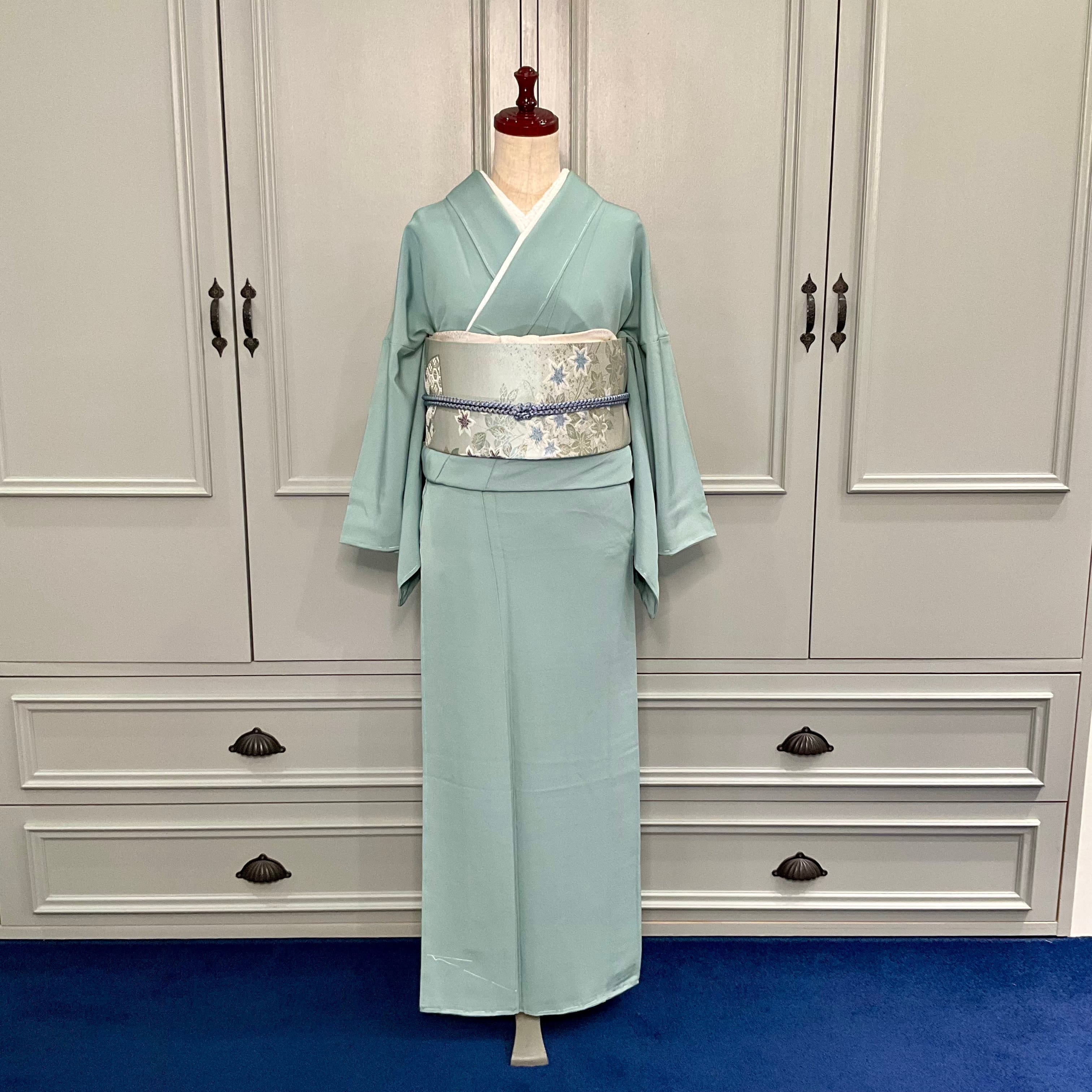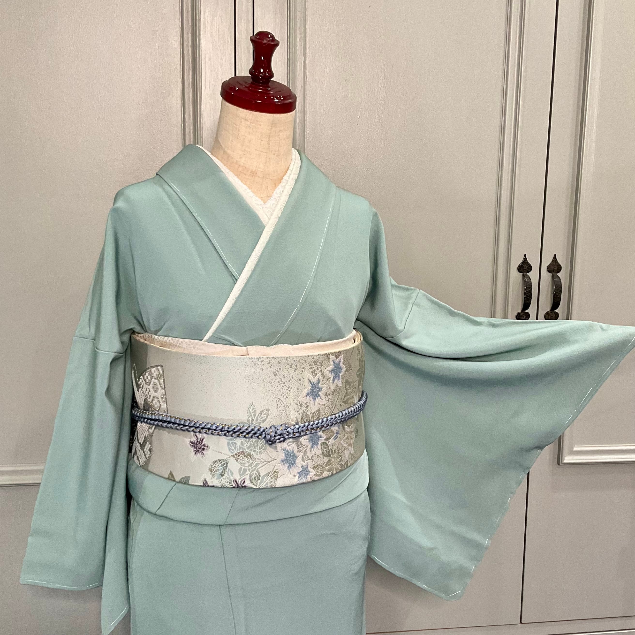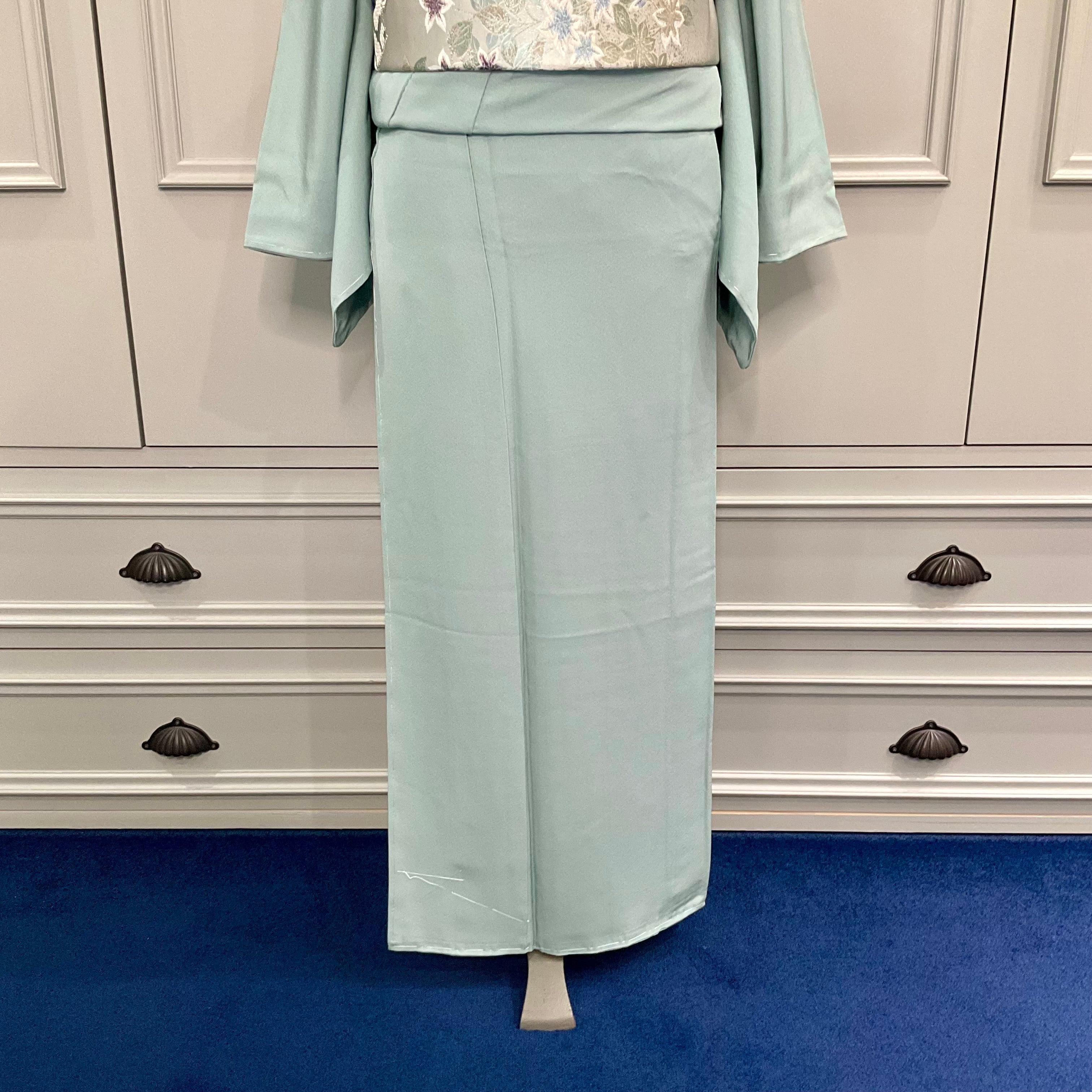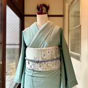 色無地はやわらかな浅い青緑、青磁の地色でスッキリとした美しさが映える一着