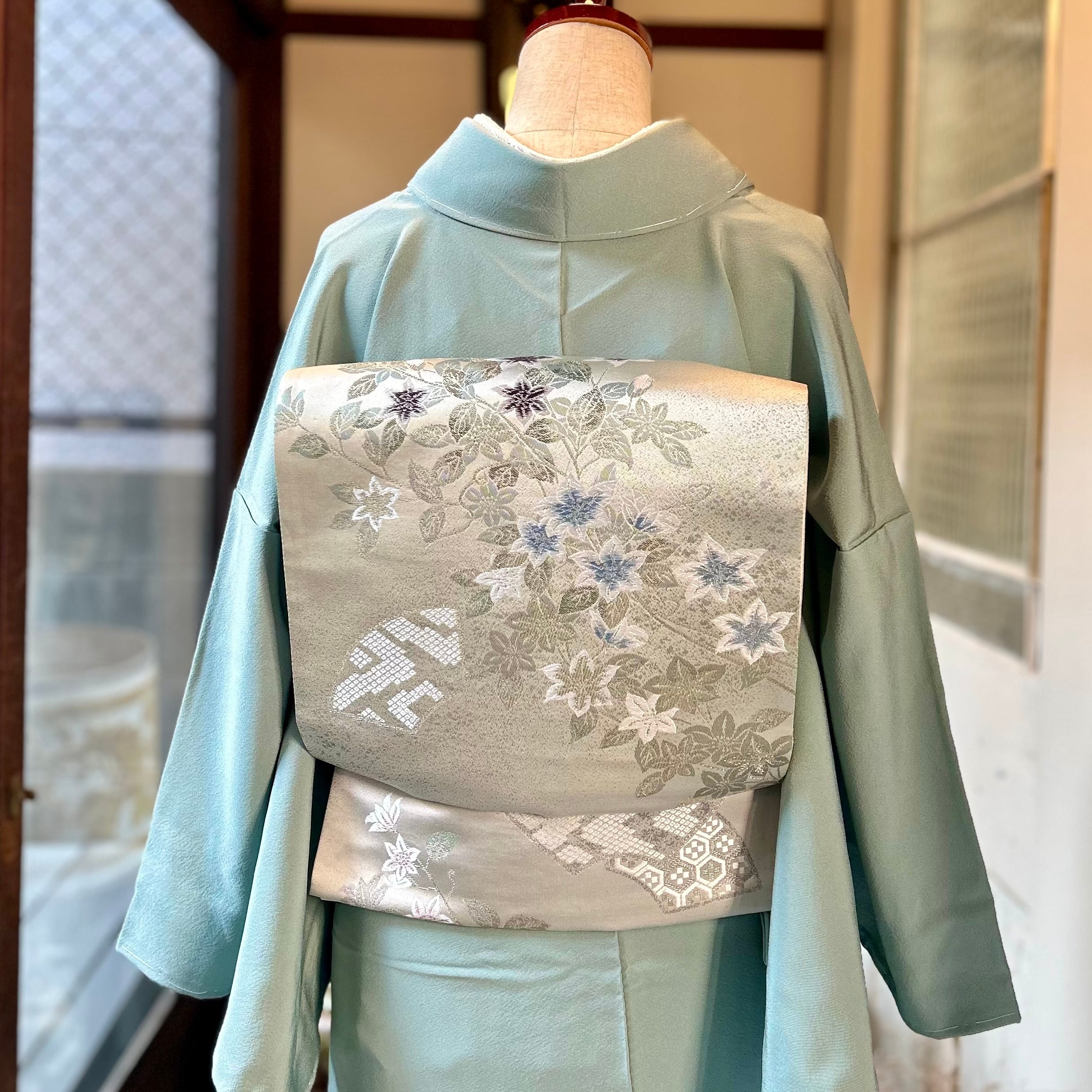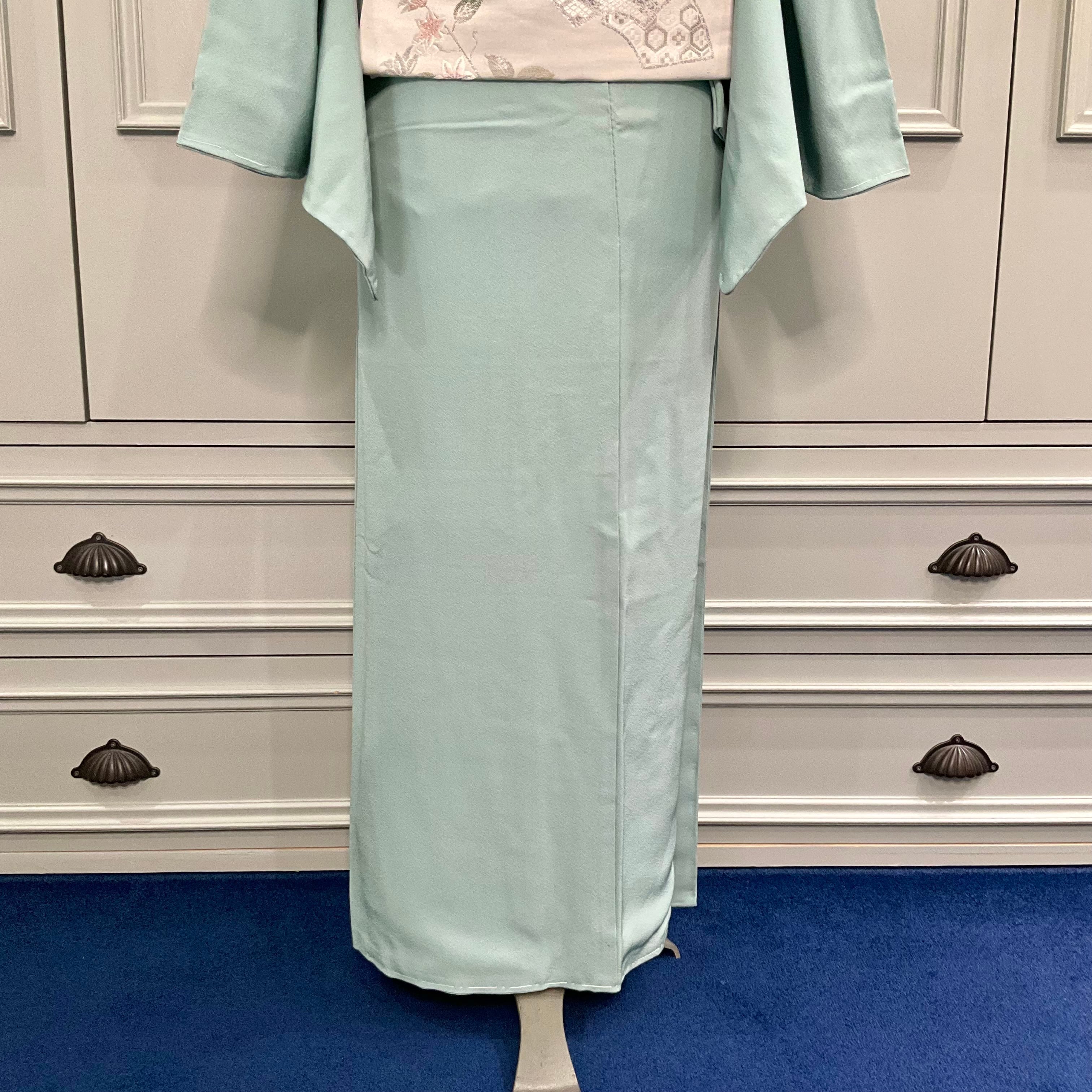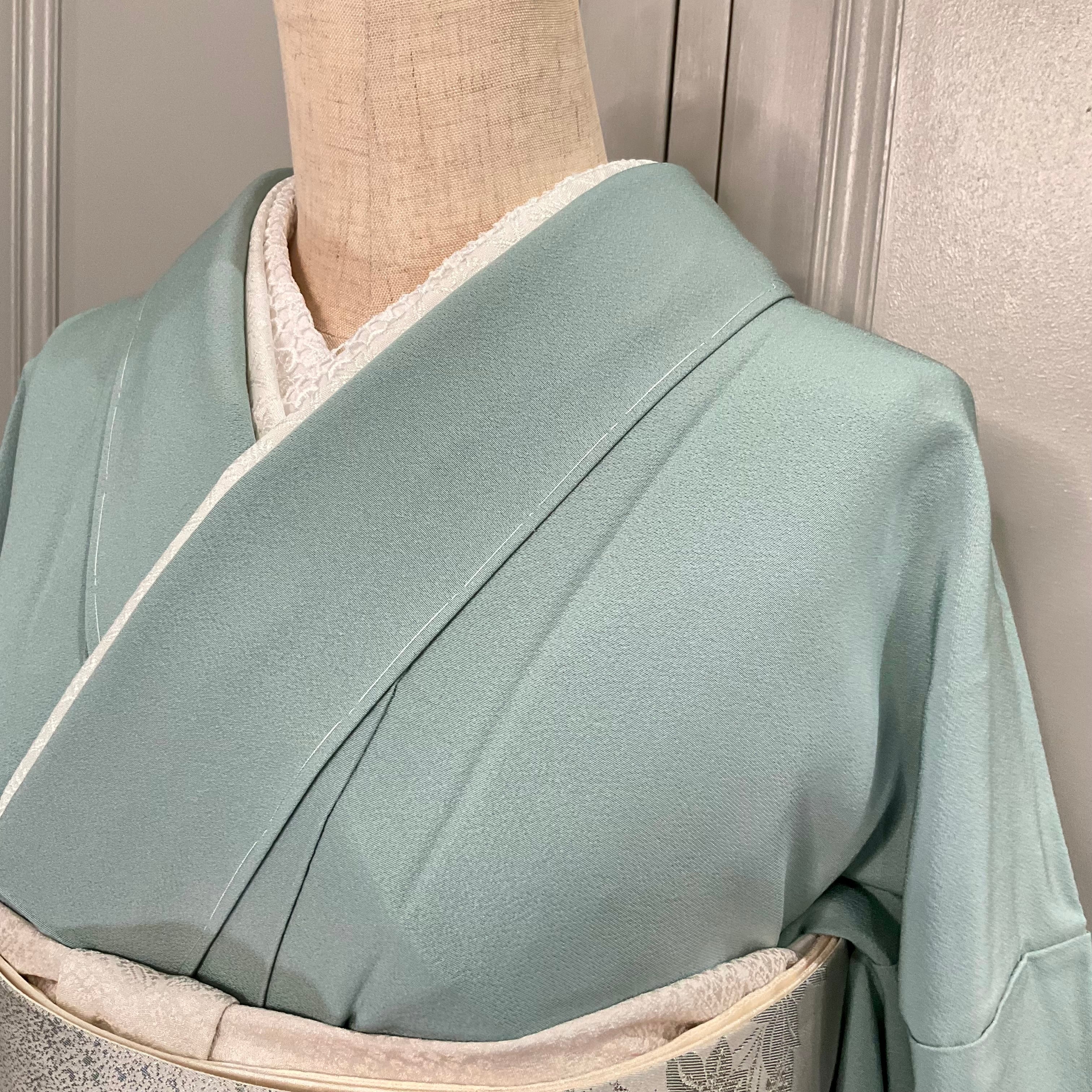 色無地はやわらかな浅い青緑、青磁の地色でスッキリとした美しさが映える一着