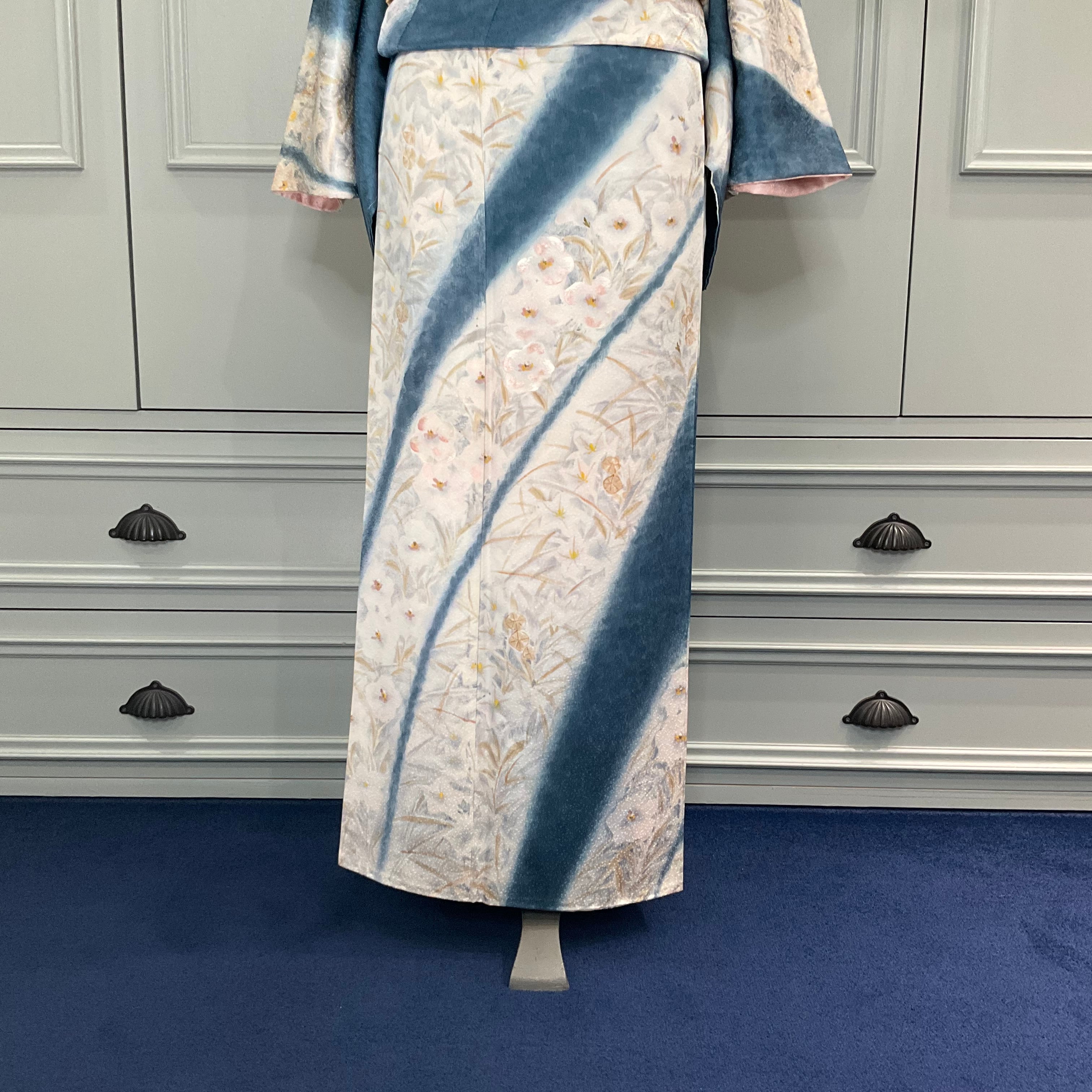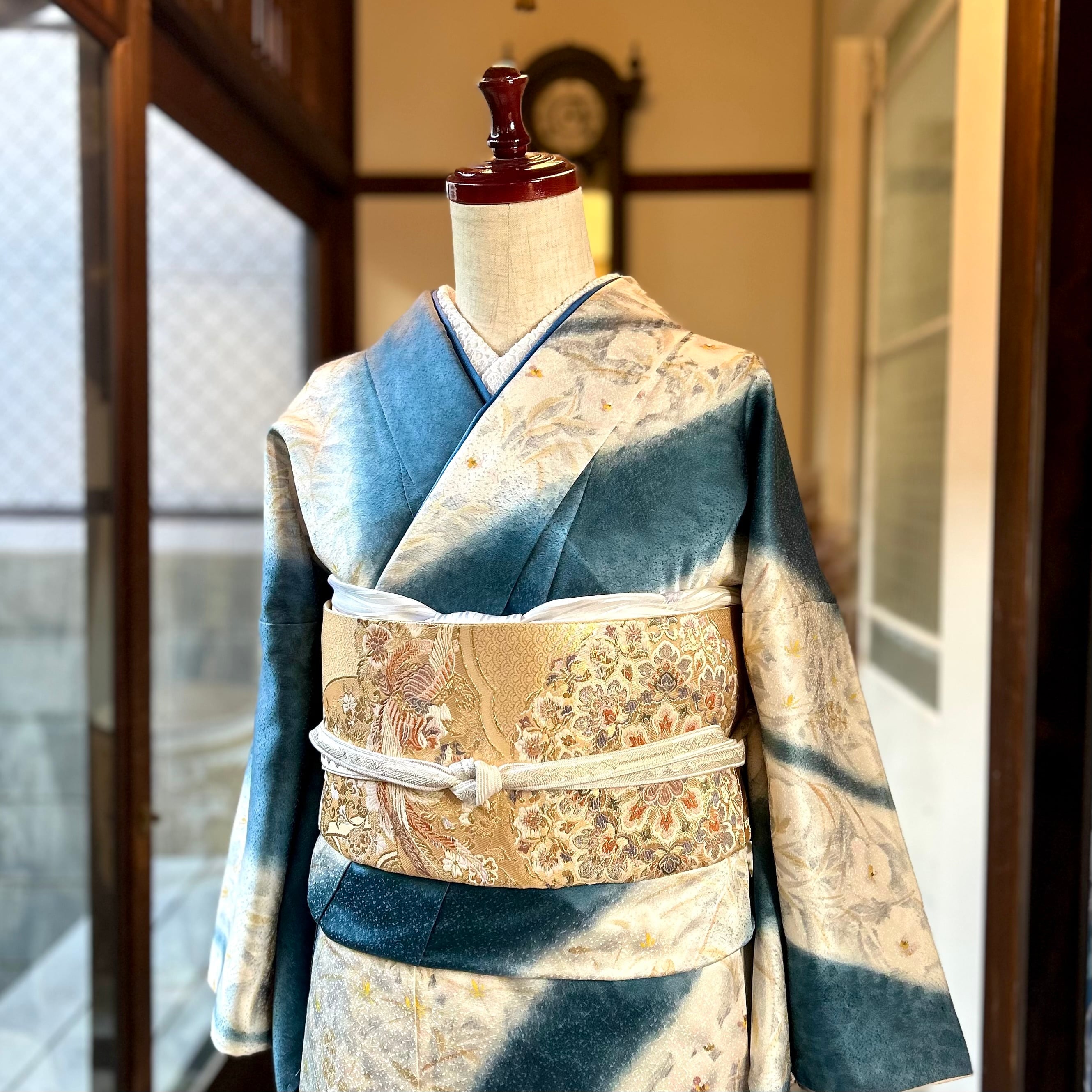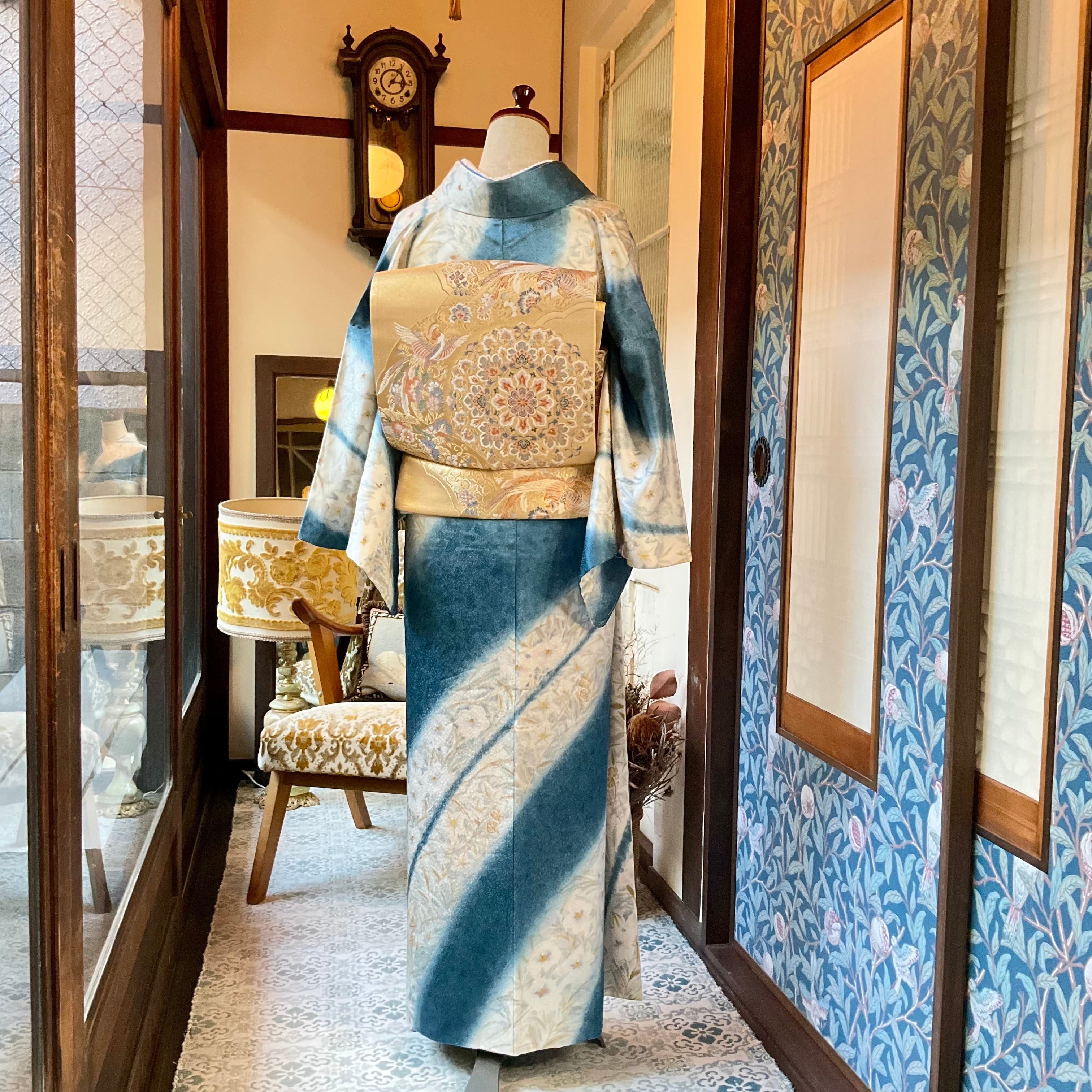 訪問着は、グレーがかったインディゴカラーに白い曲線のぼかしが美しく、ラインの中に花模様が描かれた上品で都会的なデザインです