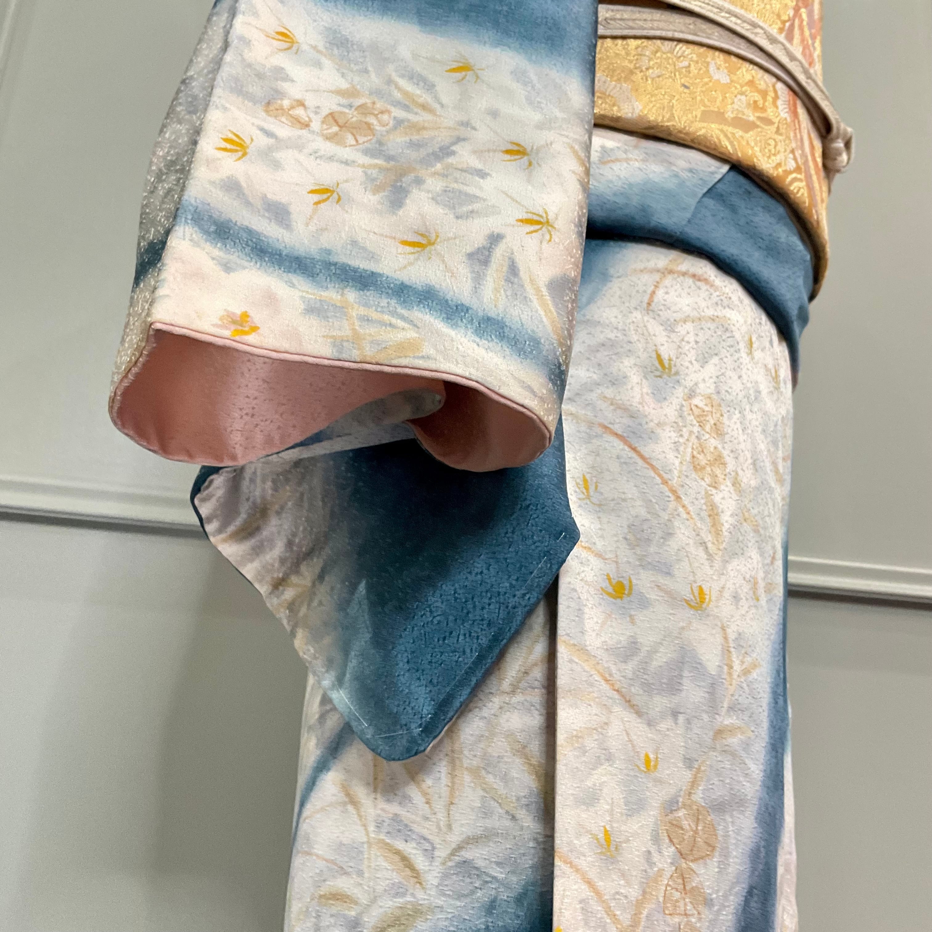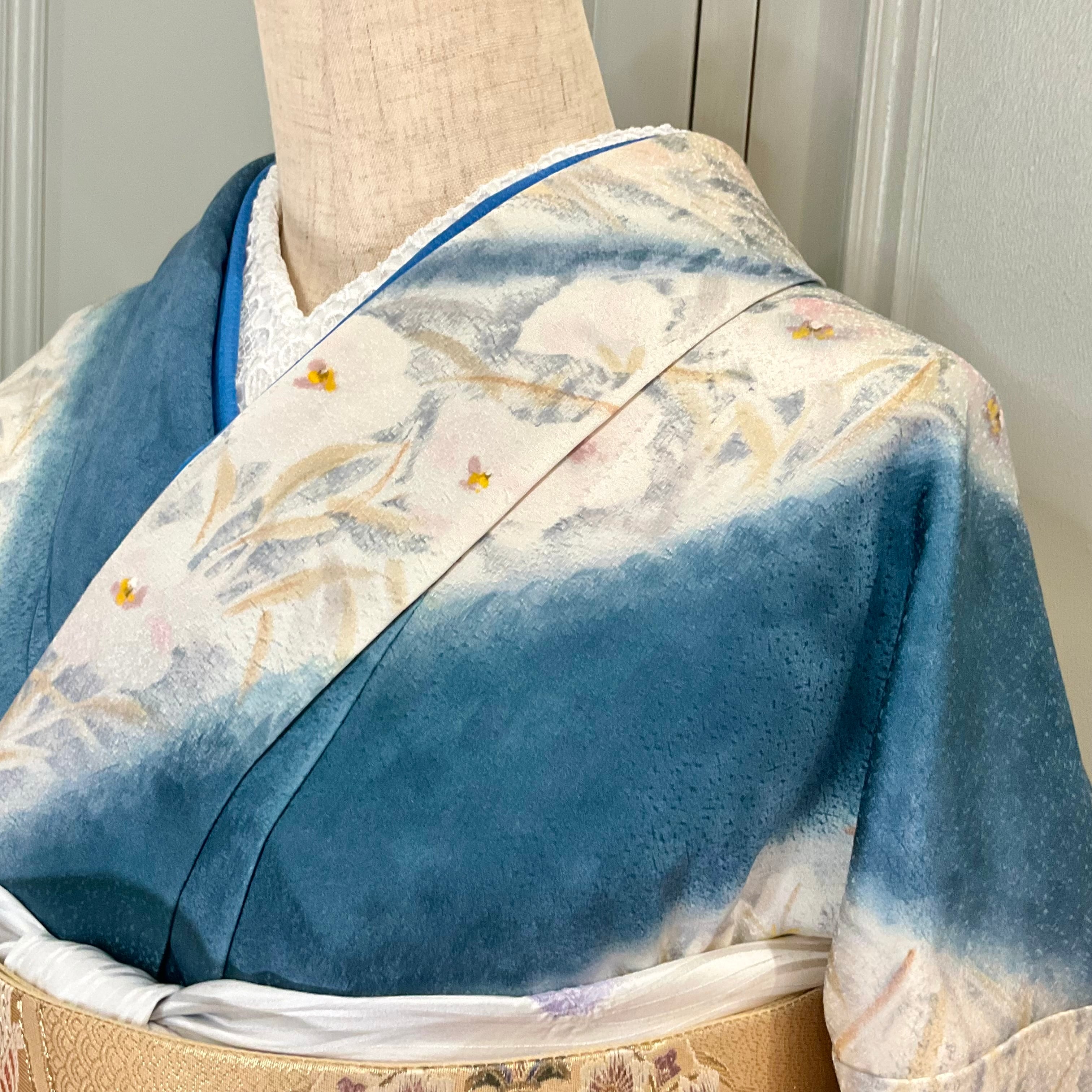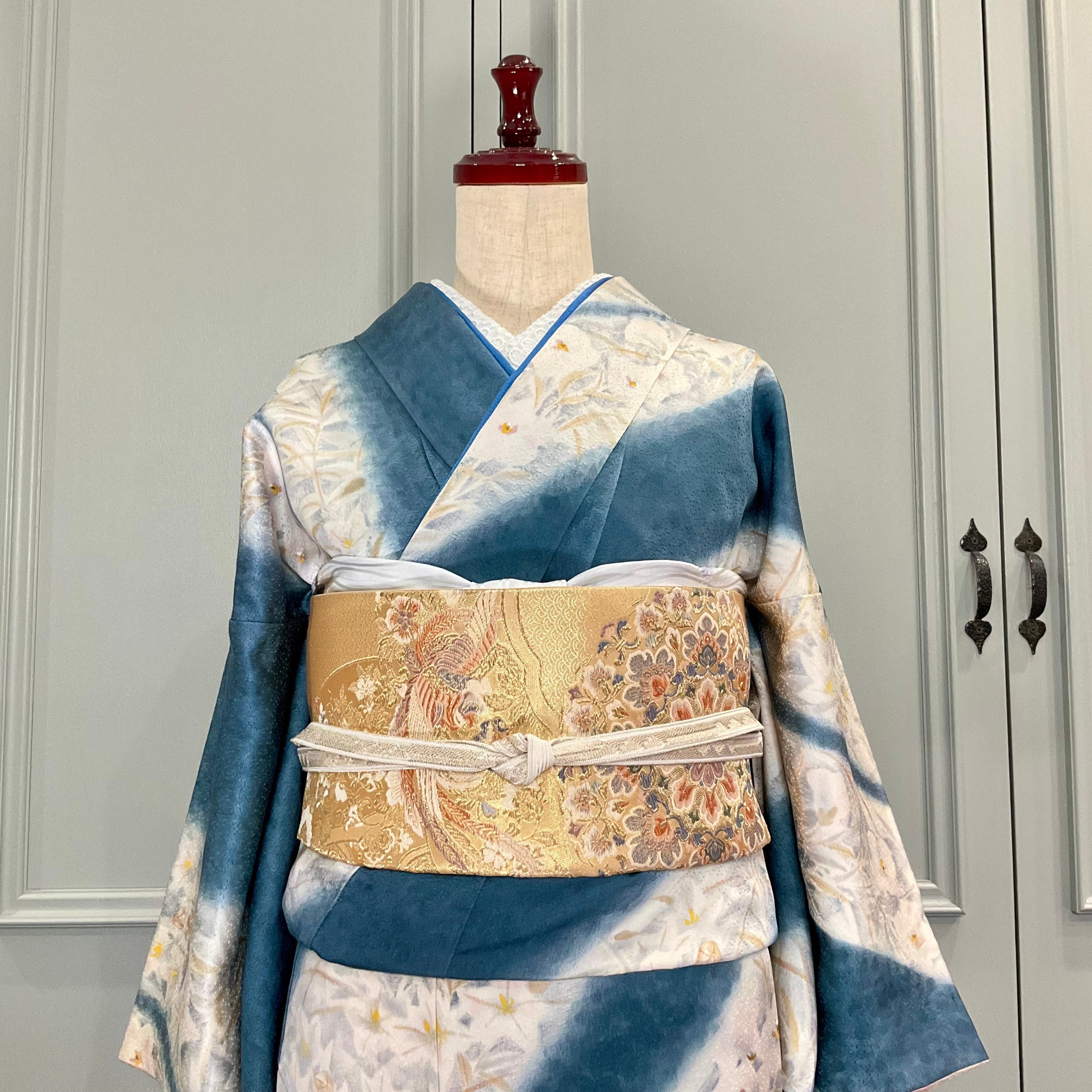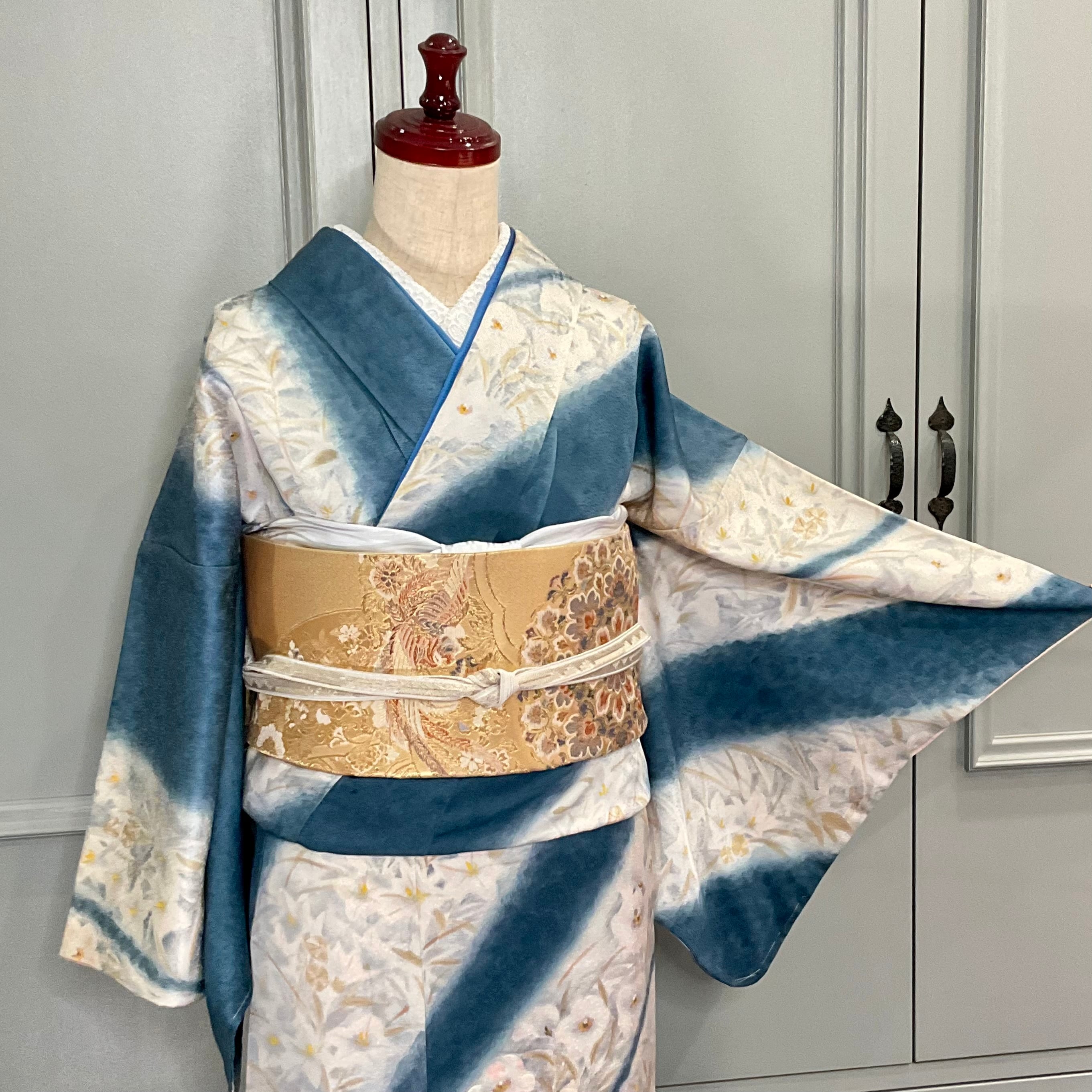 訪問着は、グレーがかったインディゴカラーに白い曲線のぼかしが美しく、ラインの中に花模様が描かれた上品で都会的なデザインです