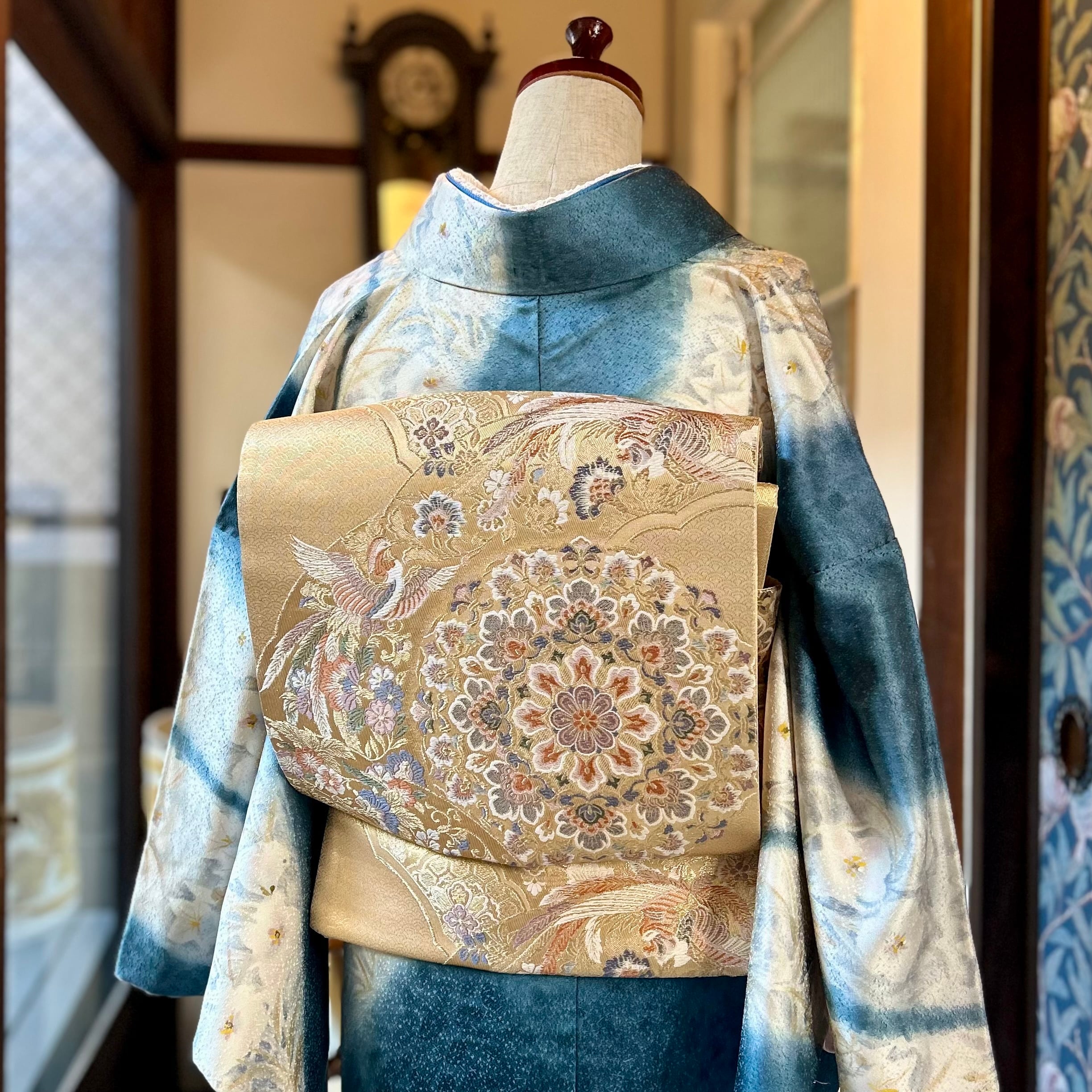 袋帯は上品なゴールド地に宝相華や鳳凰があしらわれ、エレガントな大人の華やかさが美しい一本