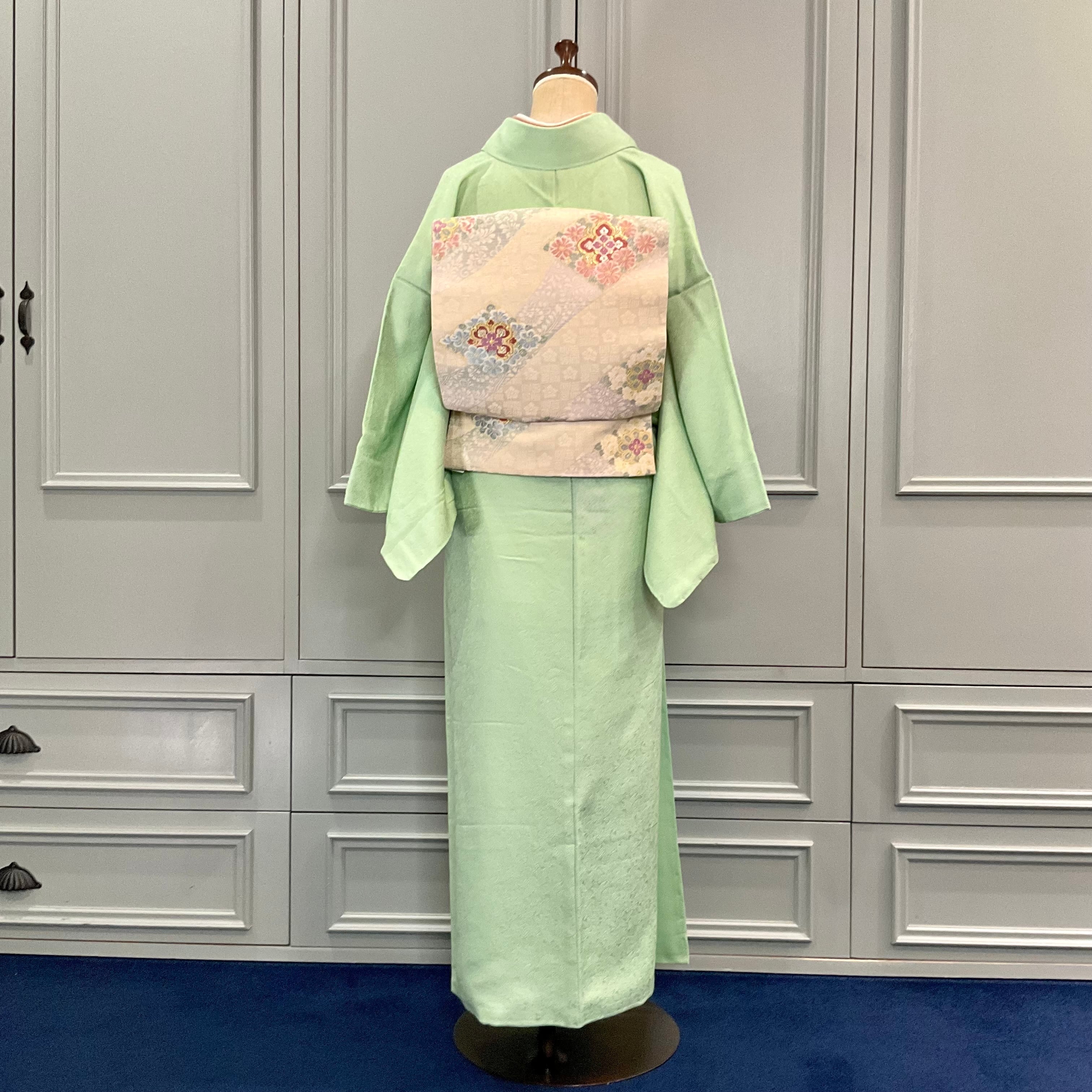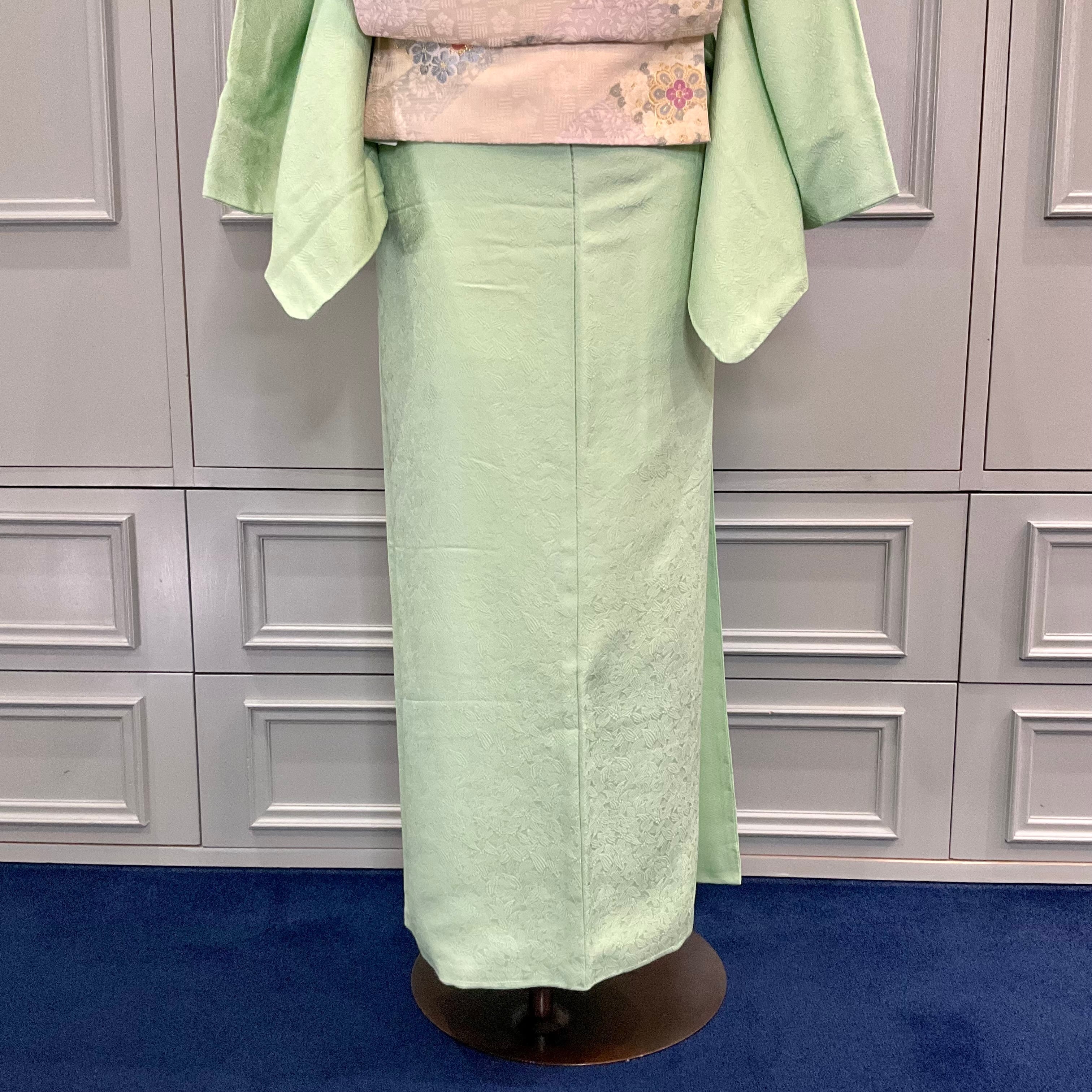色無地はさわやかなミントグリーンで、地紋には若葉のような模様が描かれ、柔らかな春の日差しの下に映えるスッキリとした美しさの一着