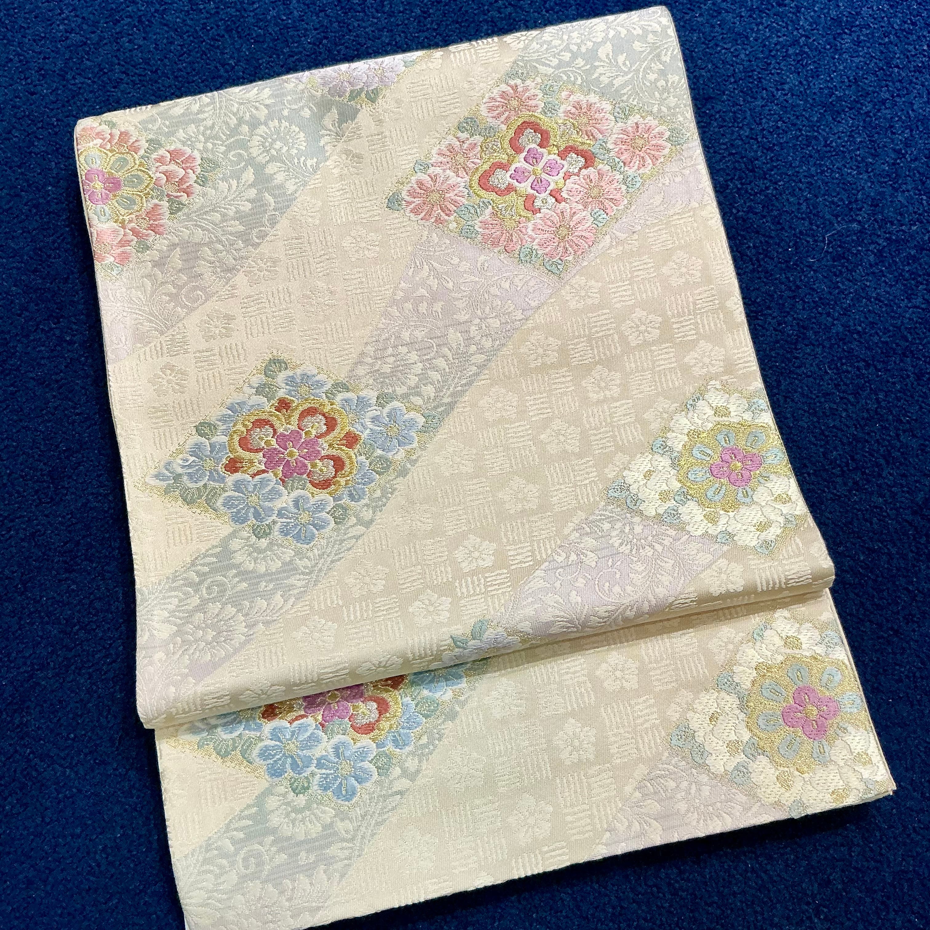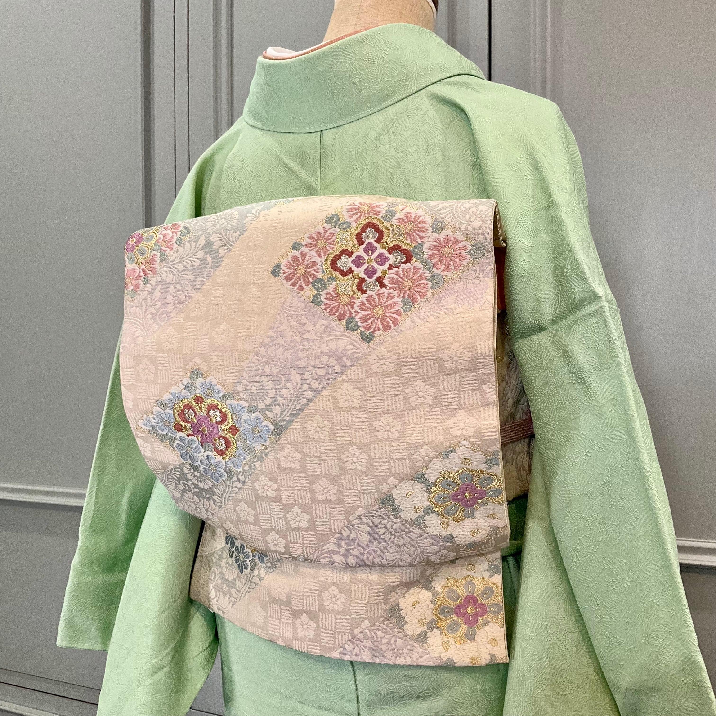 合わせた袋帯は柔らかい生成り地に正倉院文様のような花模様が菱形であしらわれています