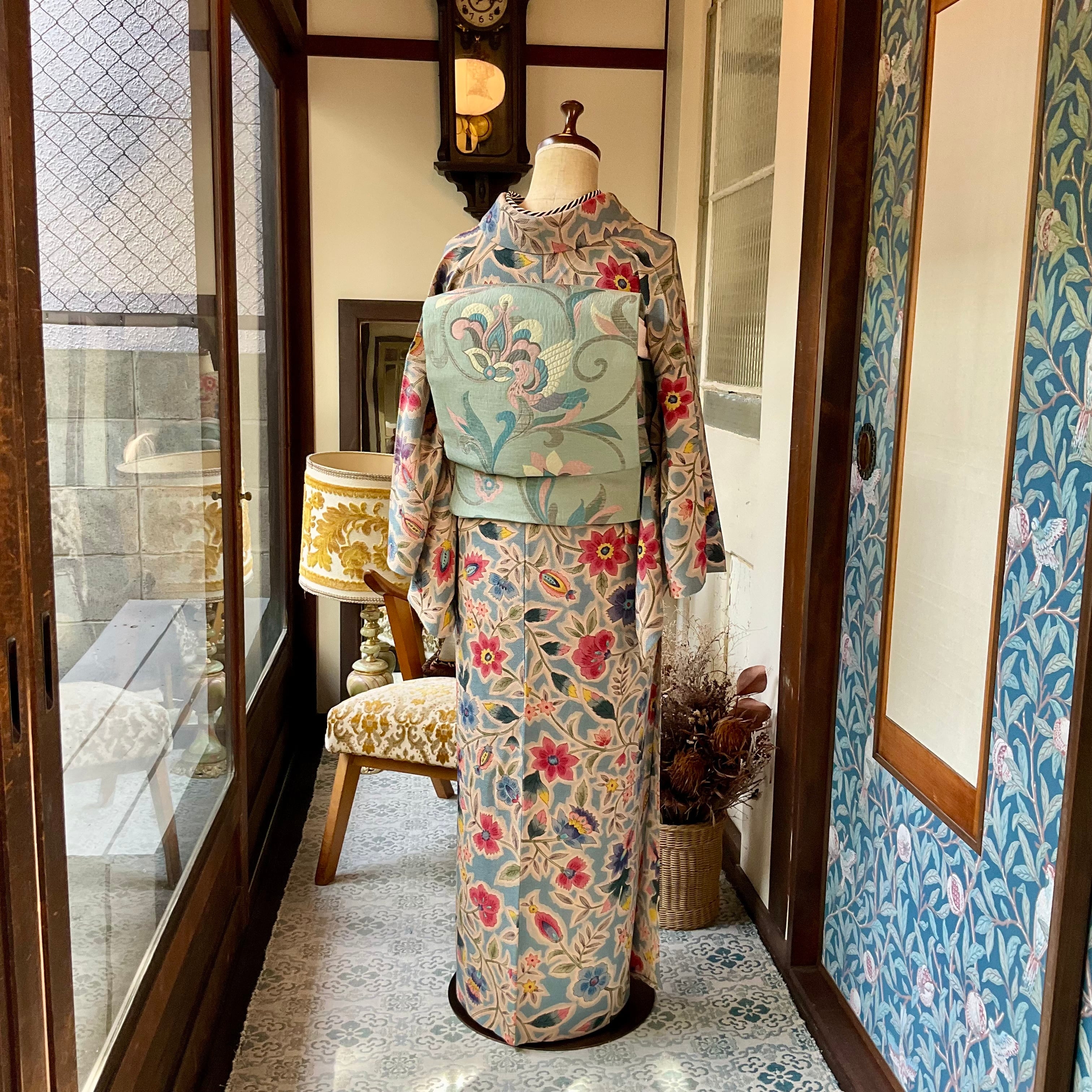 灰みのあるブルーの地色に、モダンな唐花模様がステキな単衣仕立ての小紋着物です♡