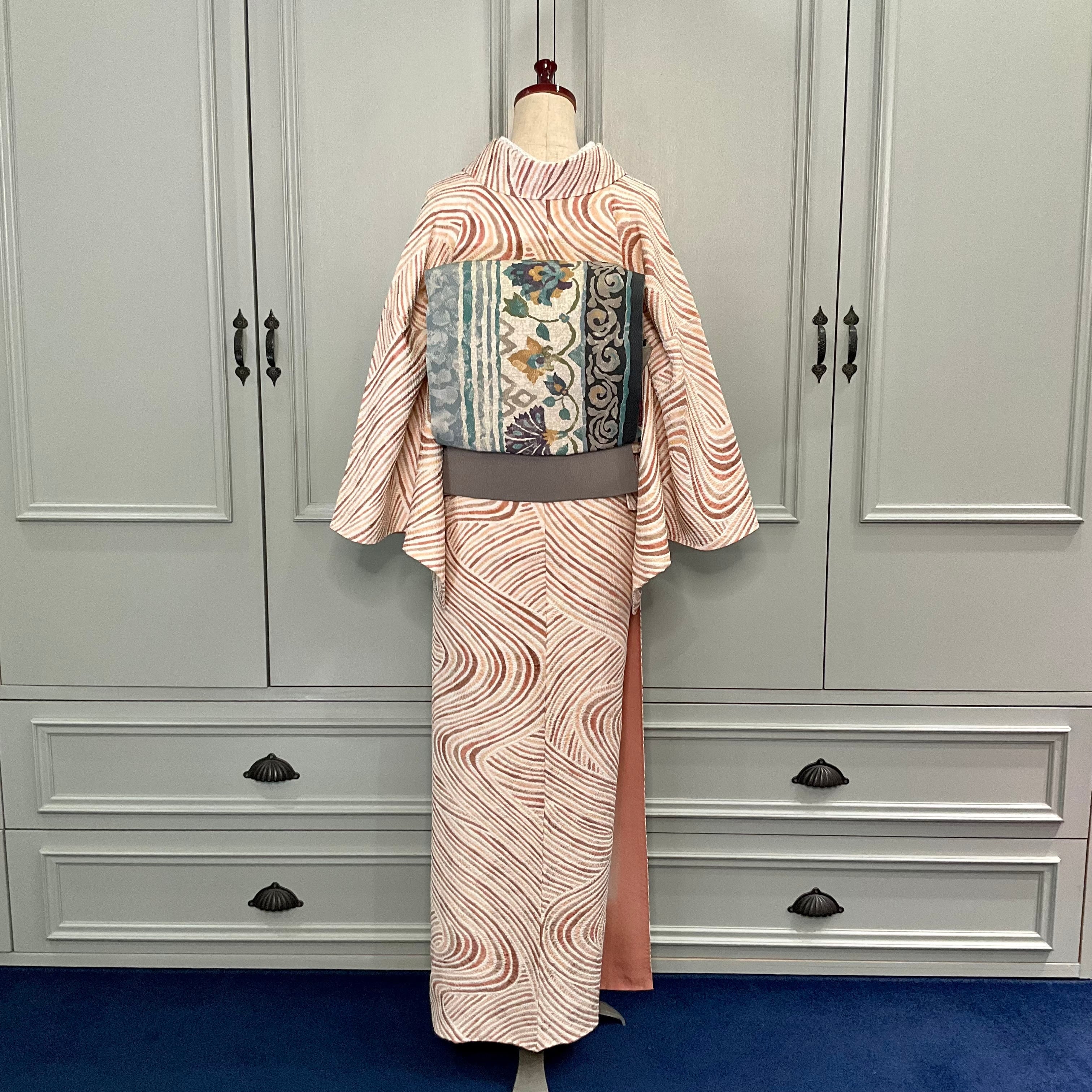 tall*砂のさざめき*総絞り 流水 ブラウン 茶 キャラメル テラコッタ アッシュローズ アプリコット 小紋着物 B623