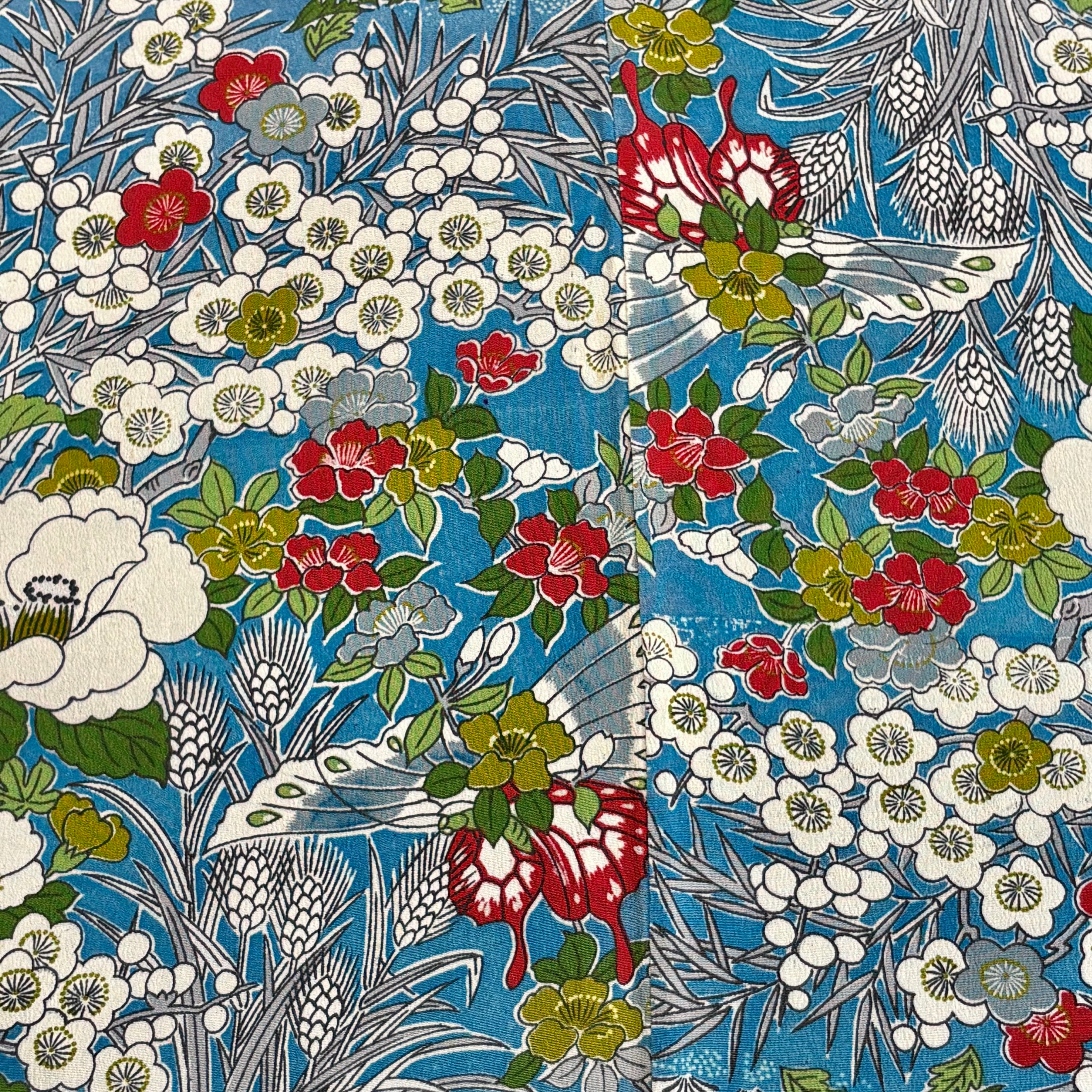 椿、梅、桜、牡丹、菖蒲など、四季折々の花が咲き誇る華やかな柄行きに、鳥や蝶が舞い、どこかシノワズリを思わせる異国情緒漂う一枚。