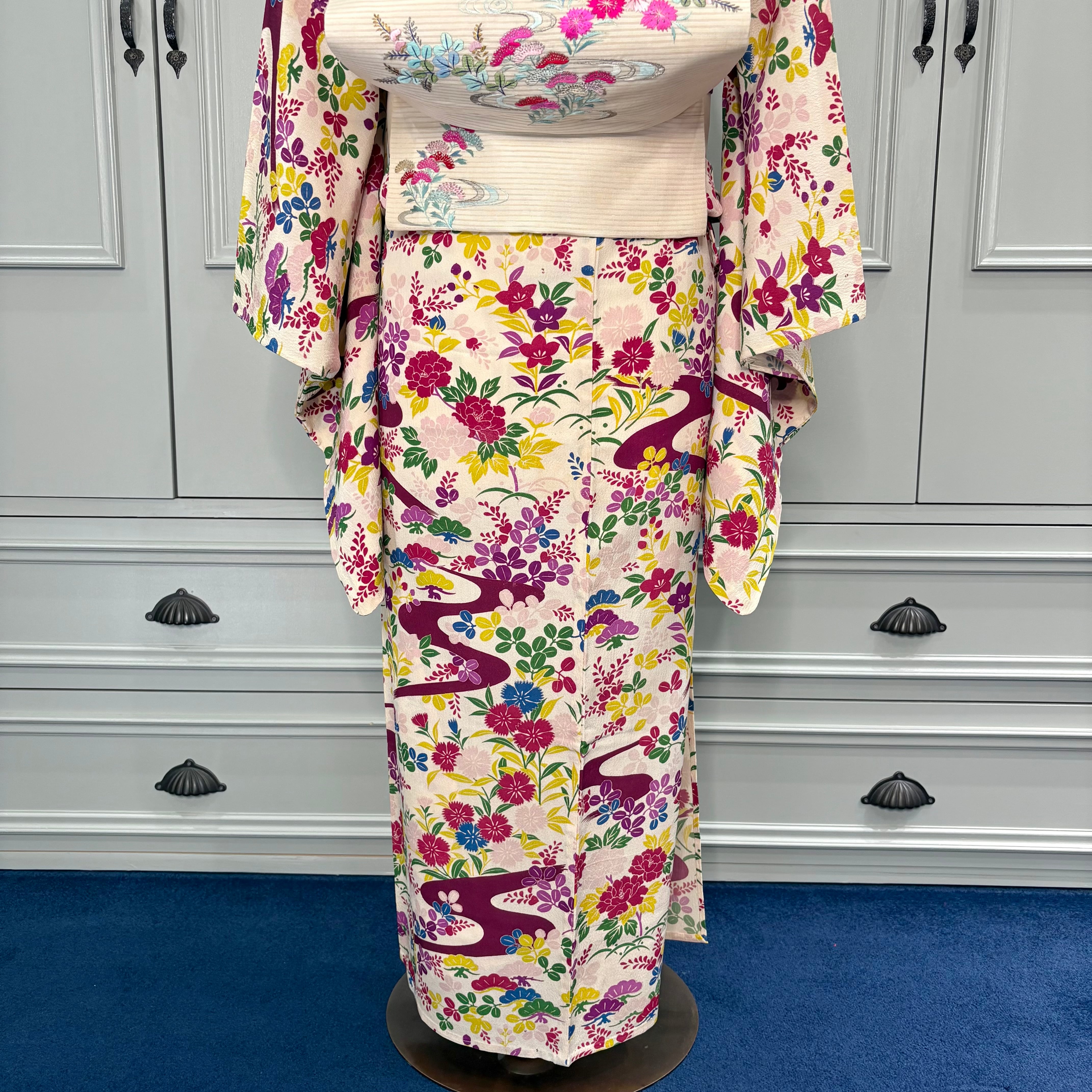 やさしい色合いの中に、可憐な草花と流水文様が広がり、涼やかで上品な印象の一枚。
