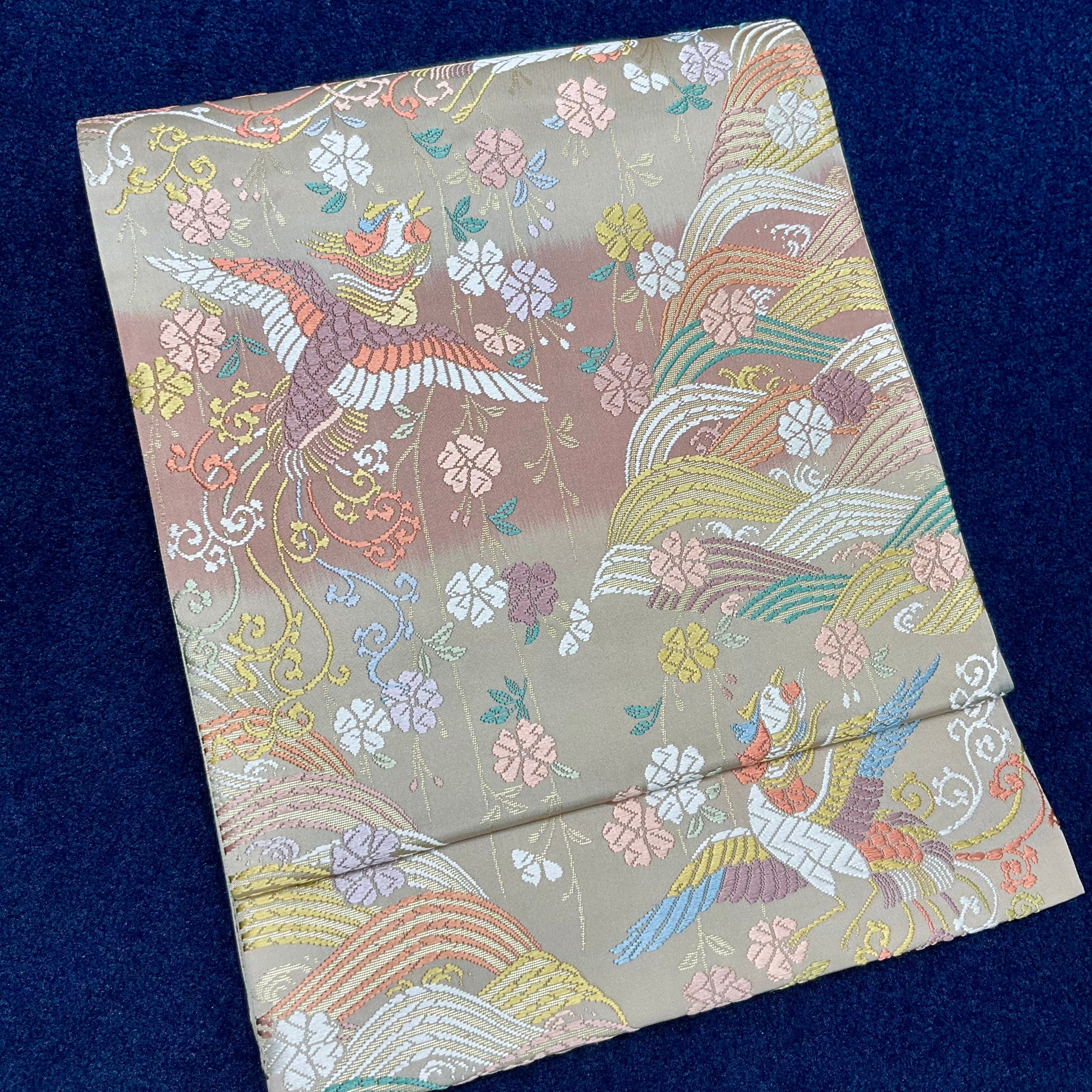 地色のシャンパンゴールドに梅鼠、銀鼠の上品な横段がベースになっていて、彩りや豊かに流水や鳥さんが織り出され、かわいらしさの際立つ一本♬