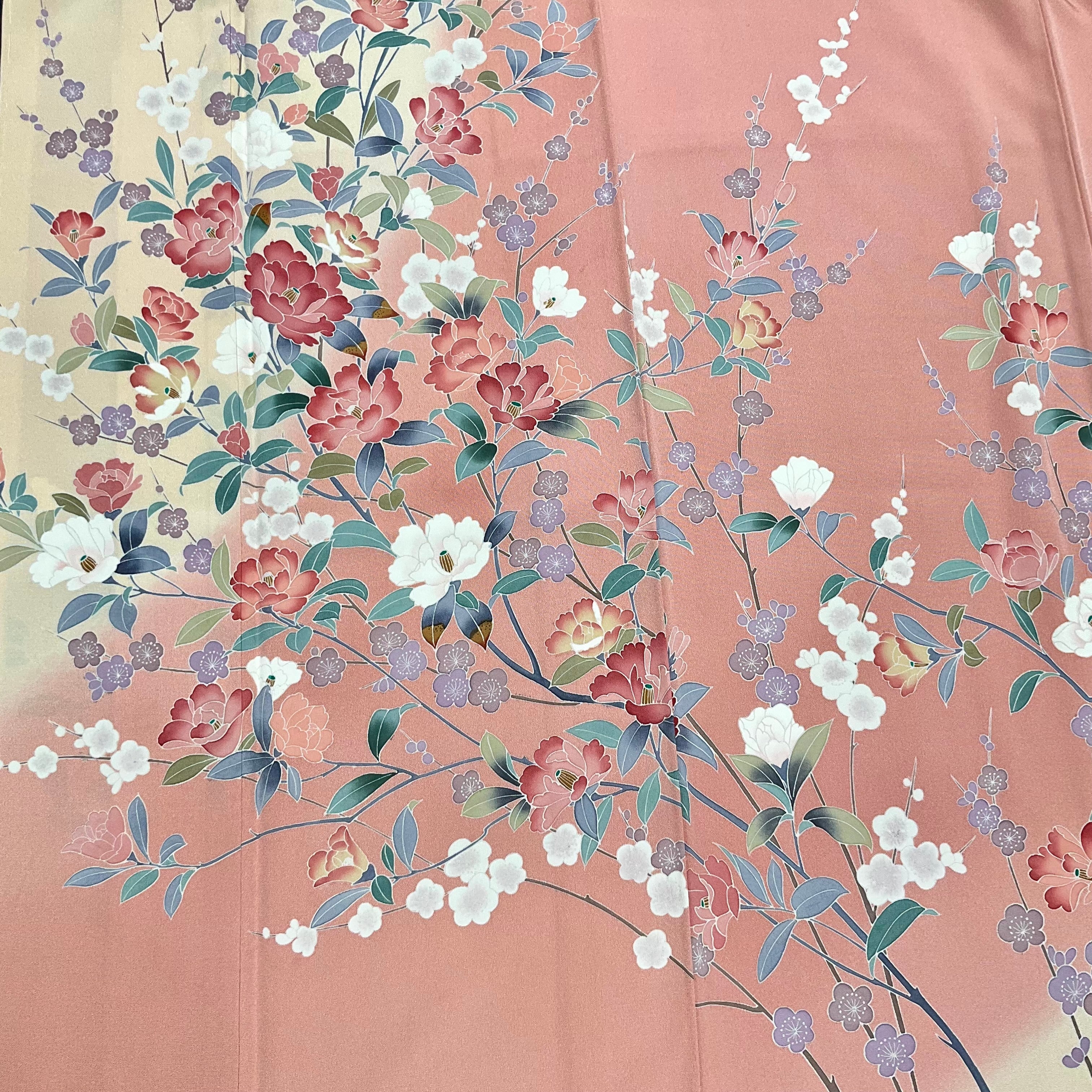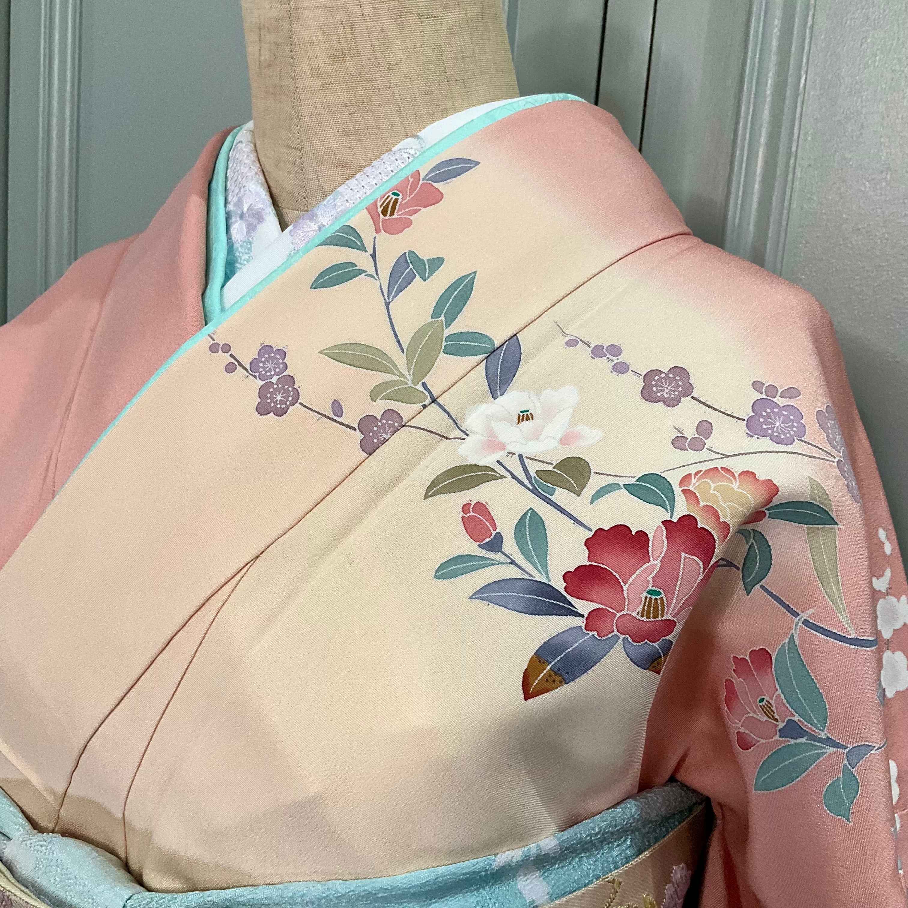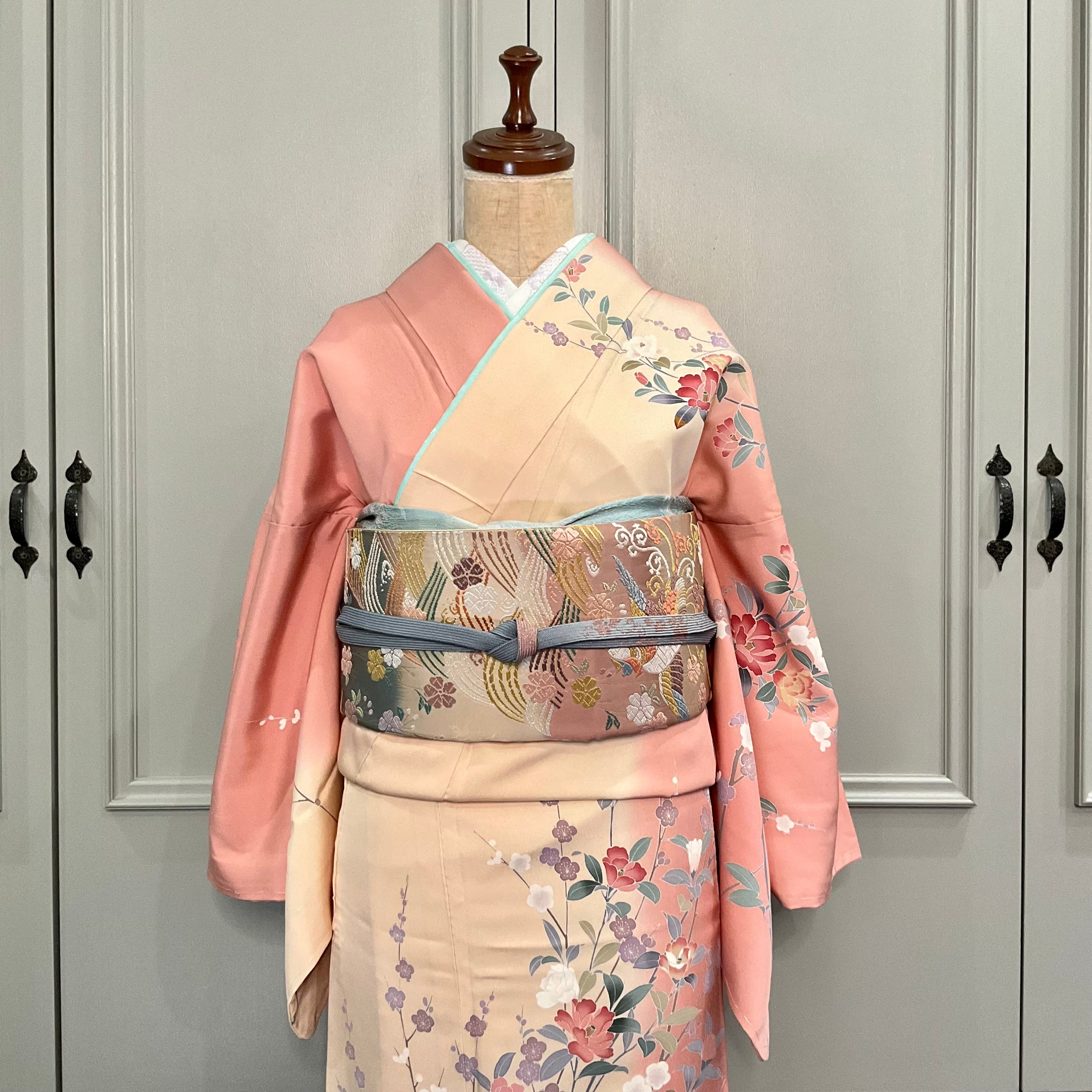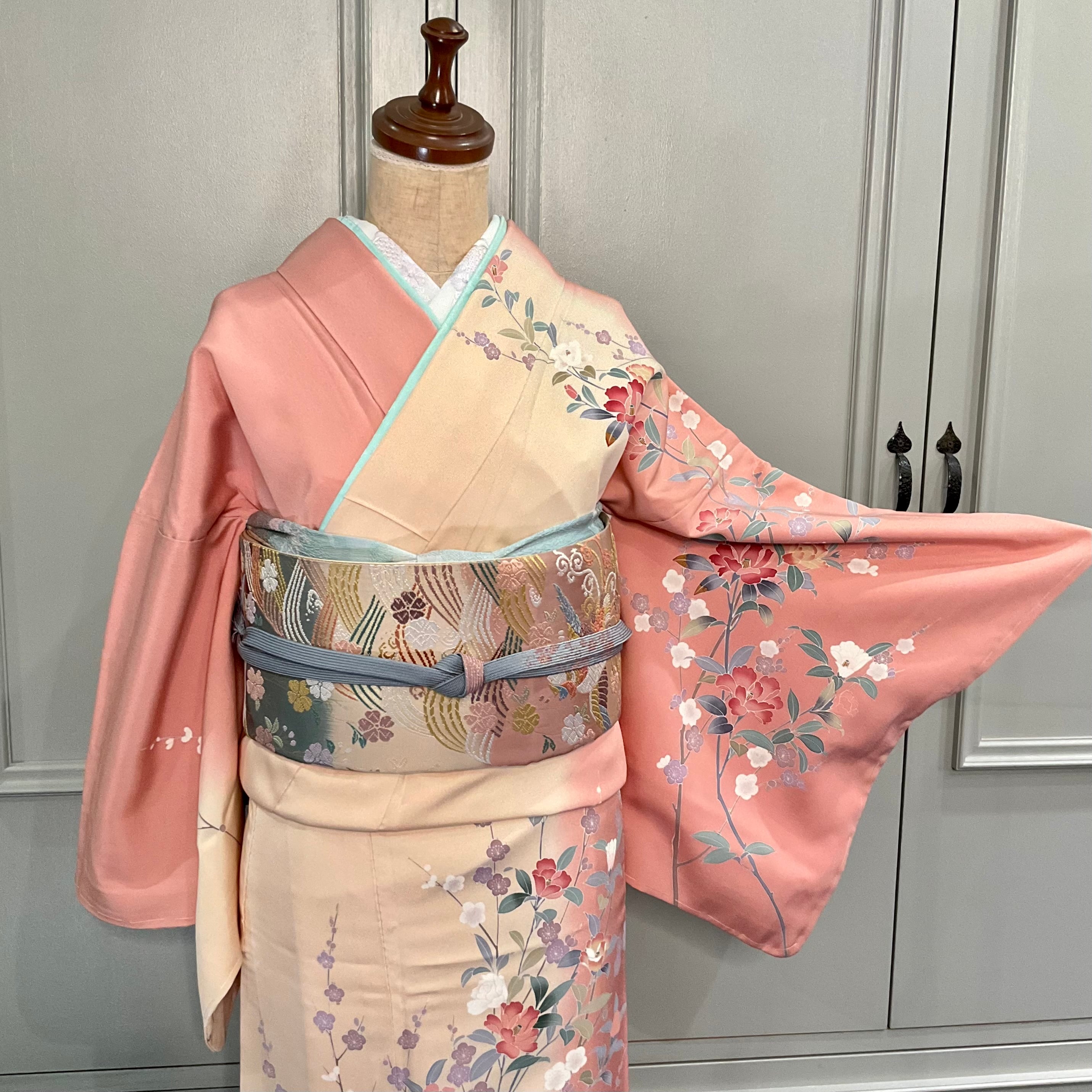 訪問着は、淡いピンクベージュからシェルピンクのグラデーションが美しい地色に、華やかな椿や梅などの花模様が、彩りやさしく描かれた上品な訪問着です