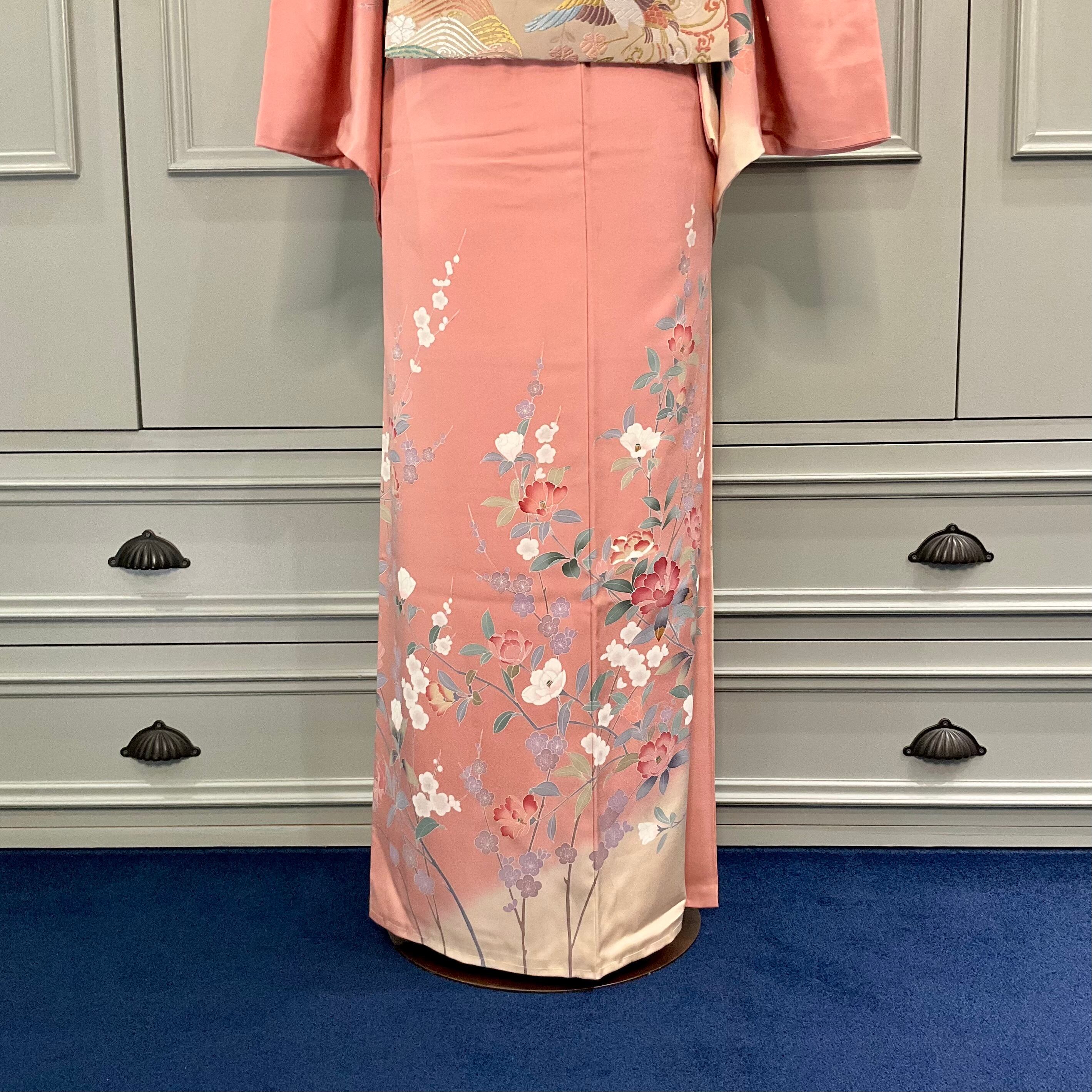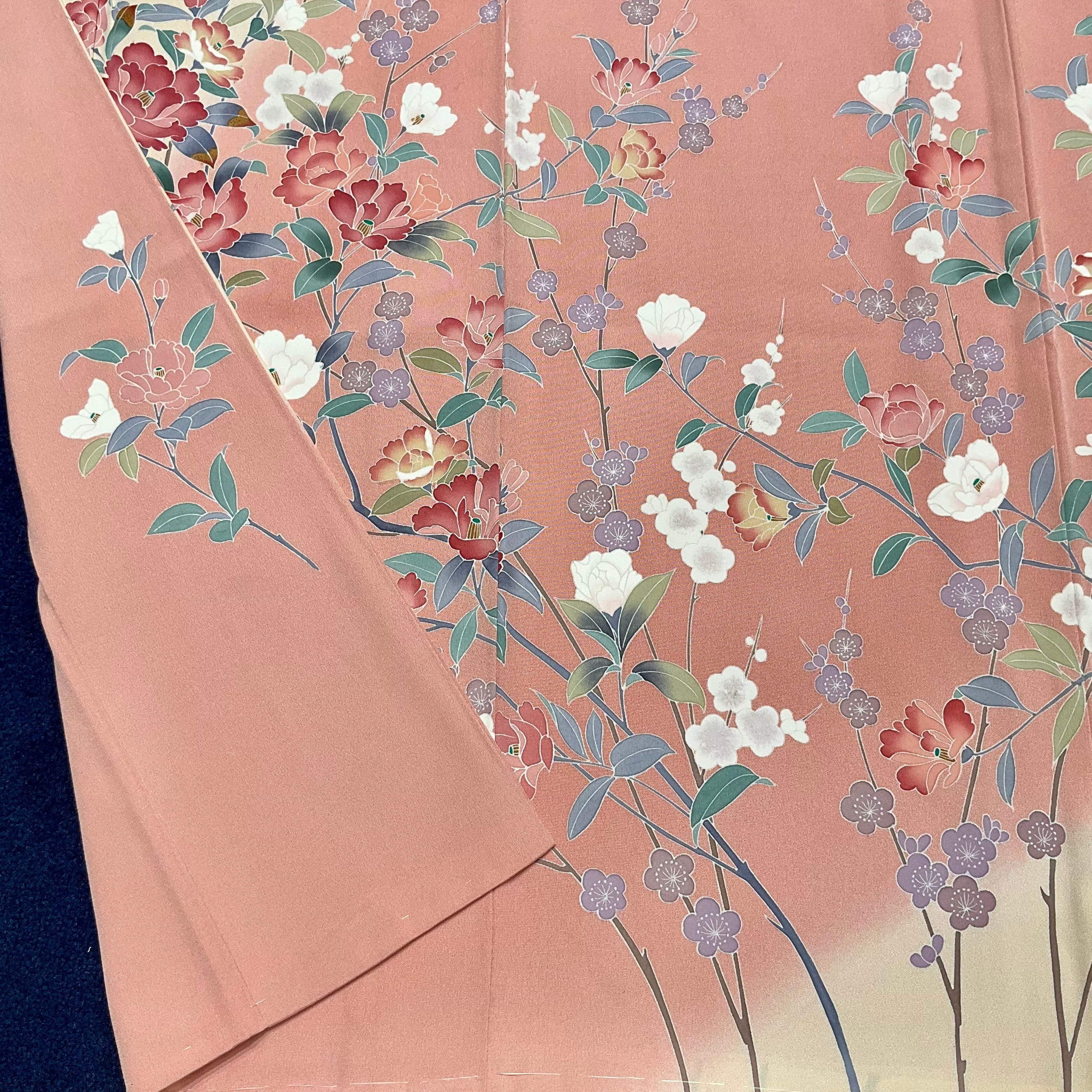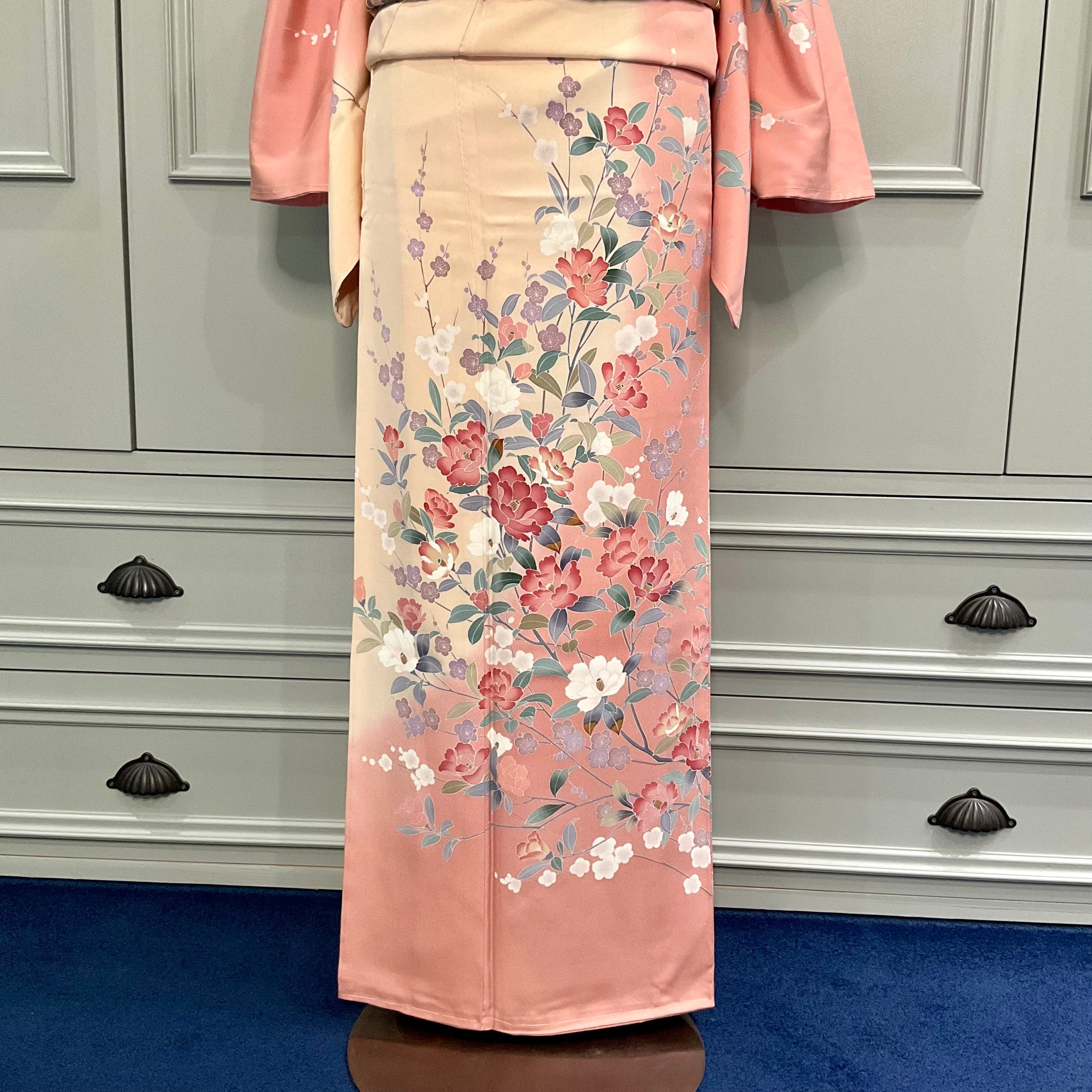訪問着は、淡いピンクベージュからシェルピンクのグラデーションが美しい地色に、華やかな椿や梅などの花模様が、彩りやさしく描かれた上品な訪問着です