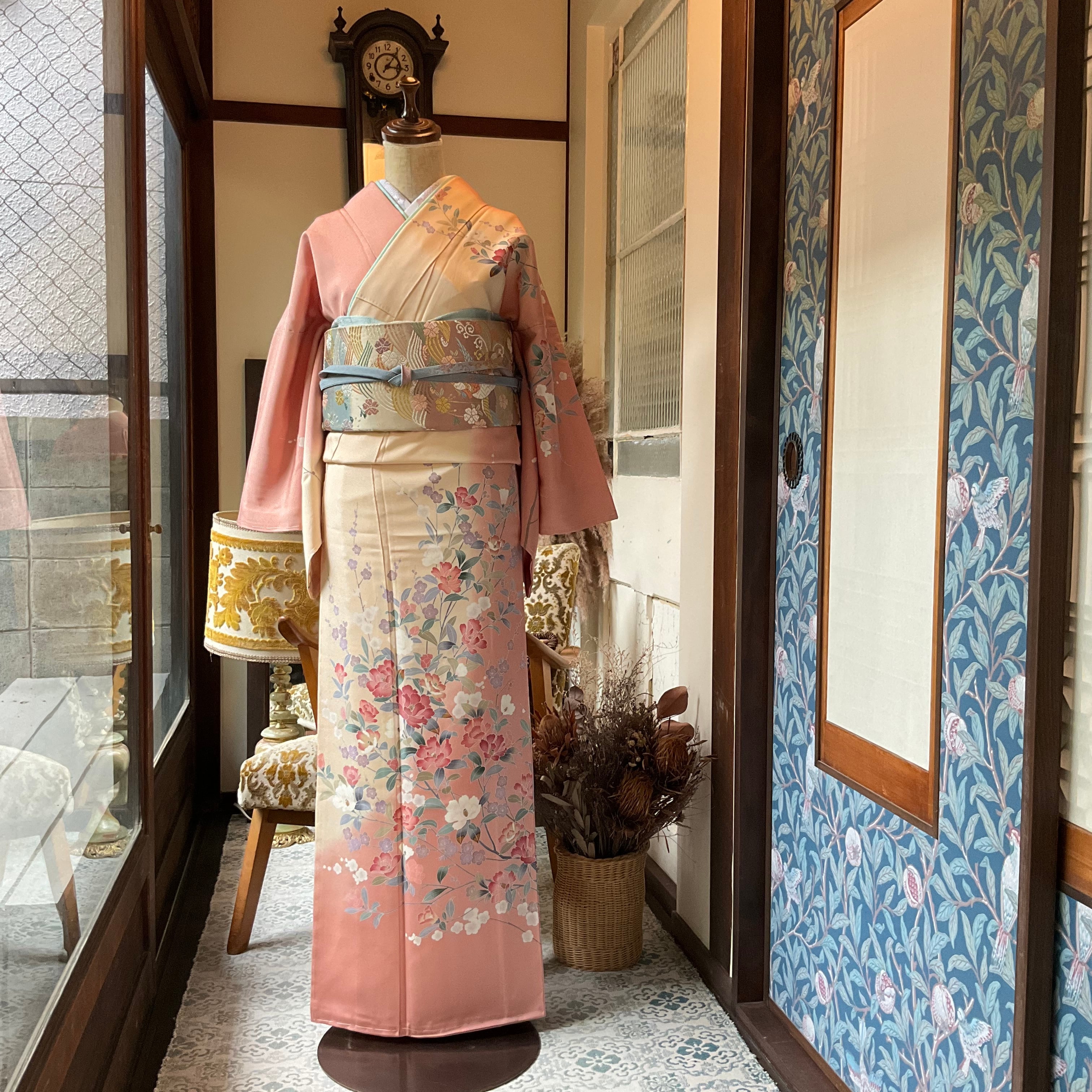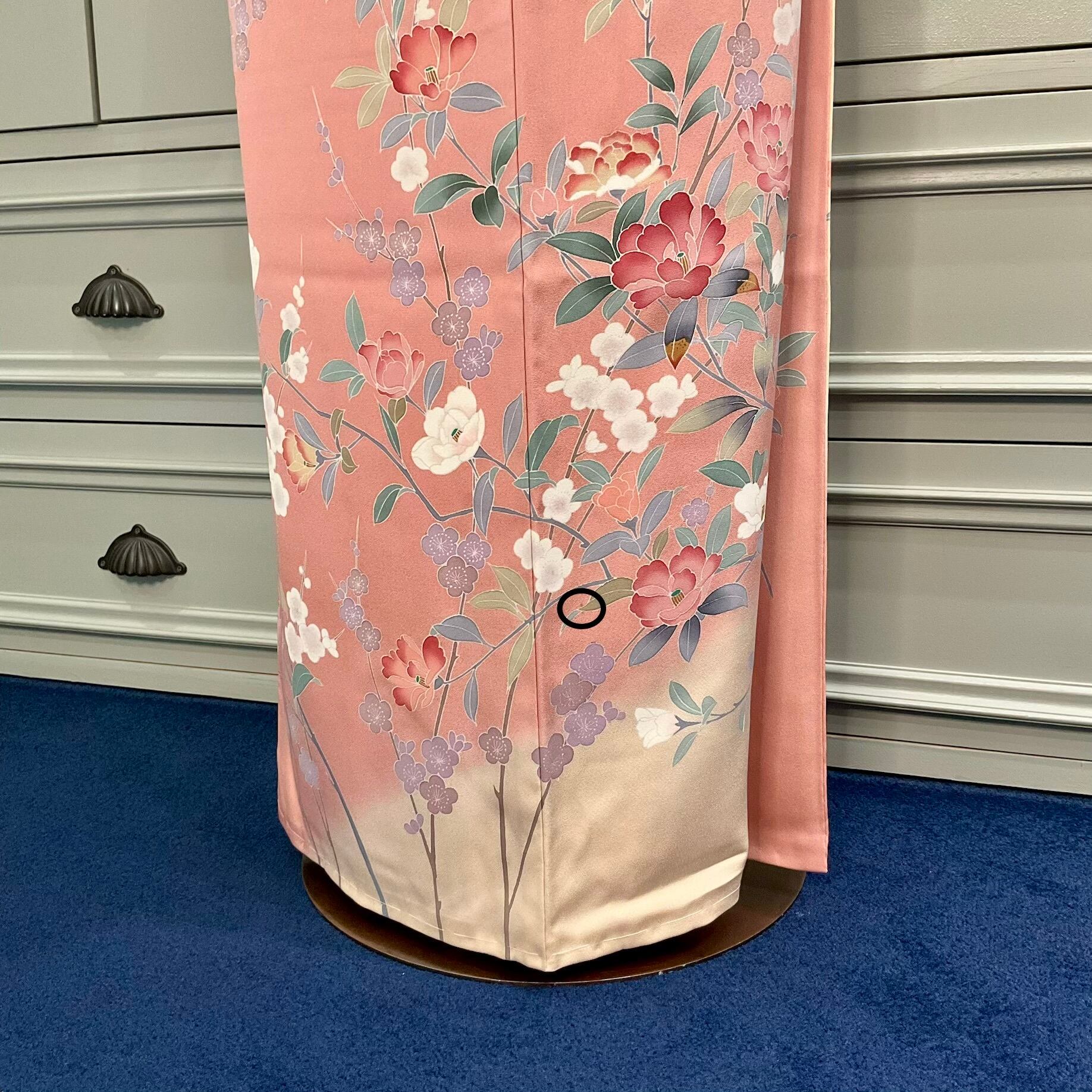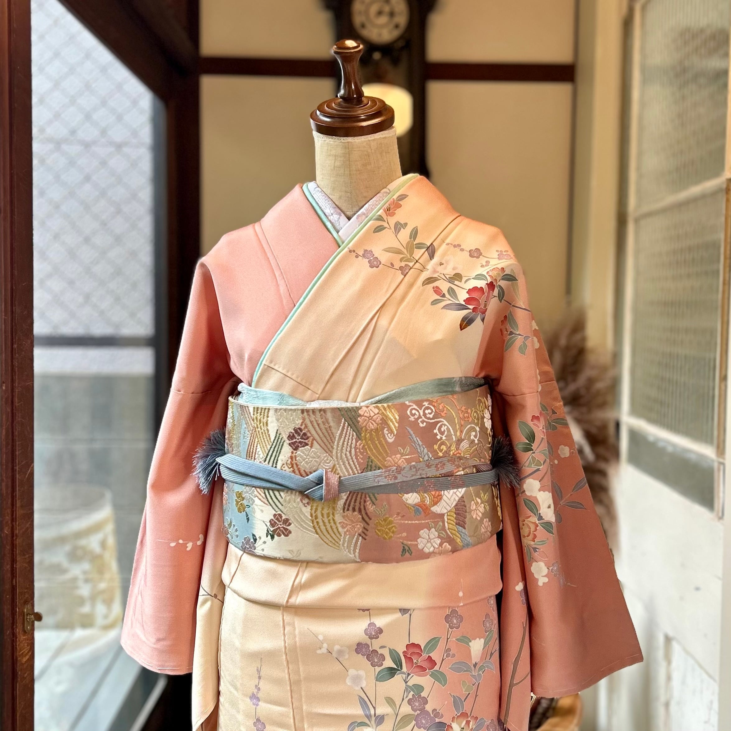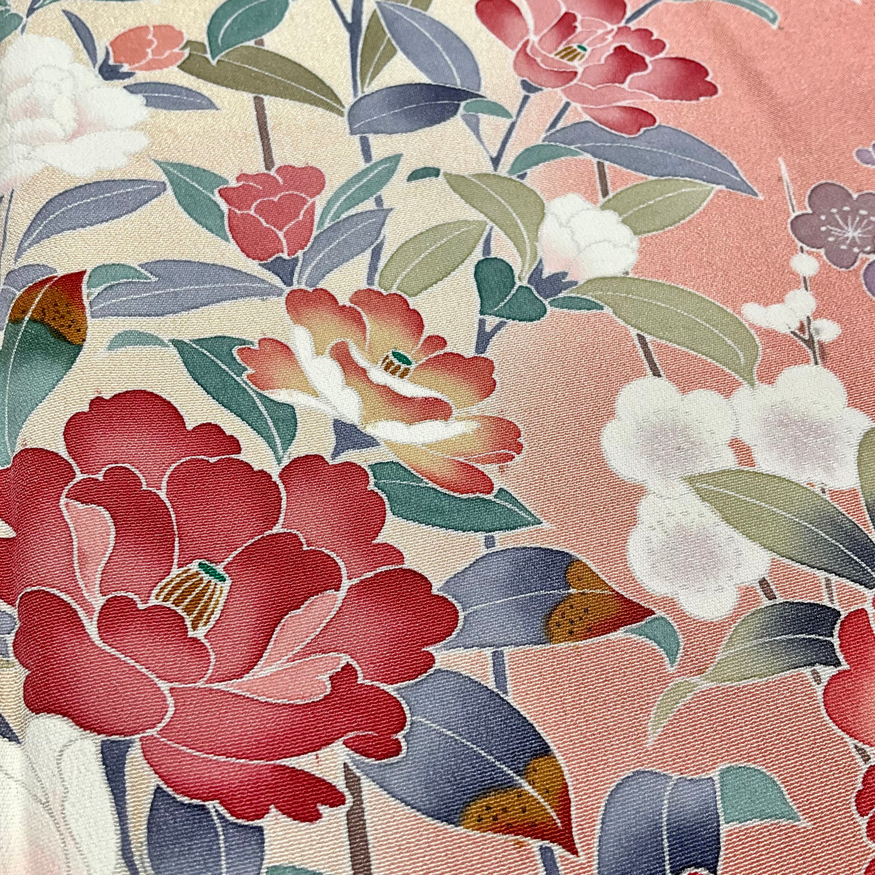 訪問着は、淡いピンクベージュからシェルピンクのグラデーションが美しい地色に、華やかな椿や梅などの花模様が、彩りやさしく描かれた上品な訪問着です