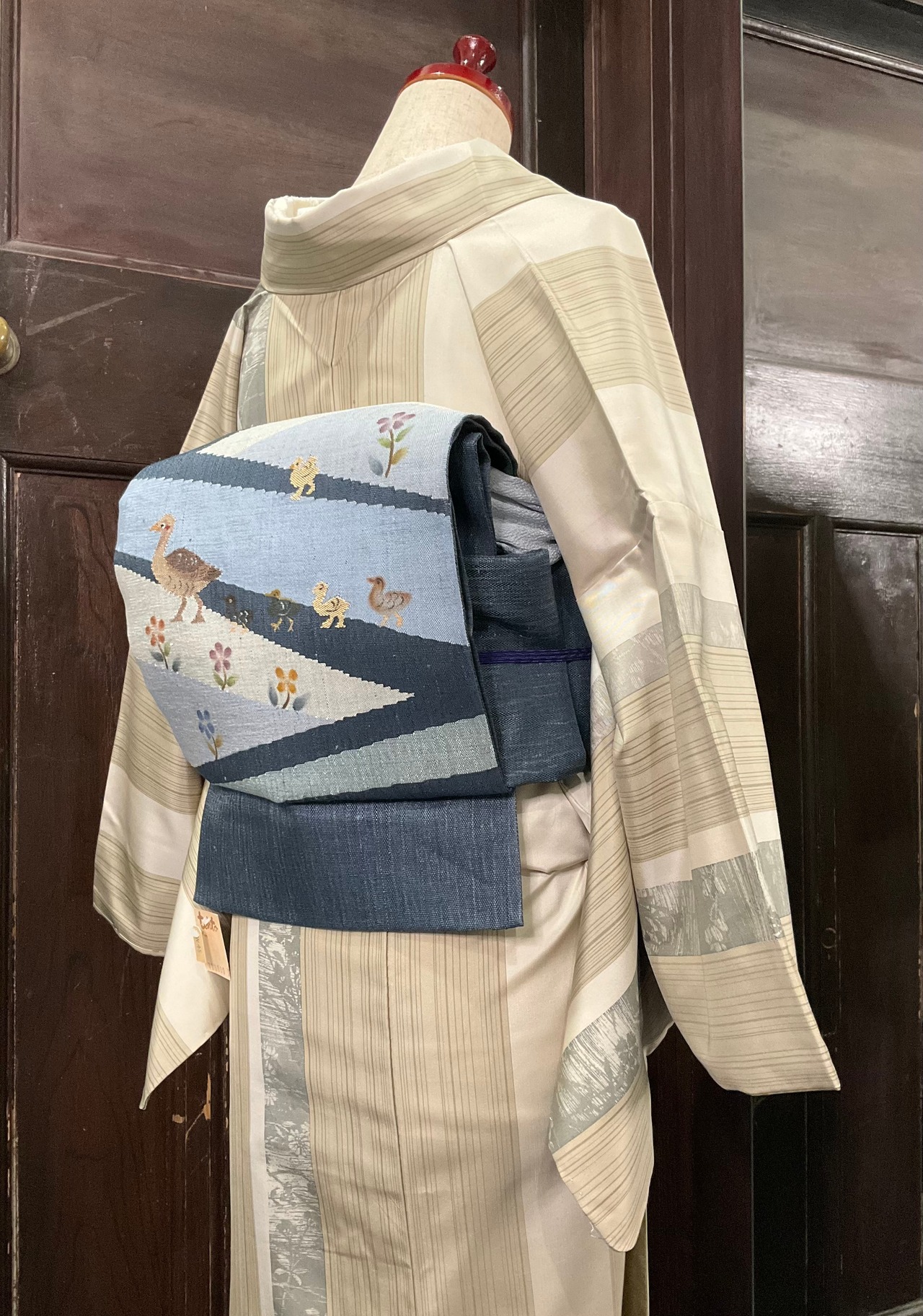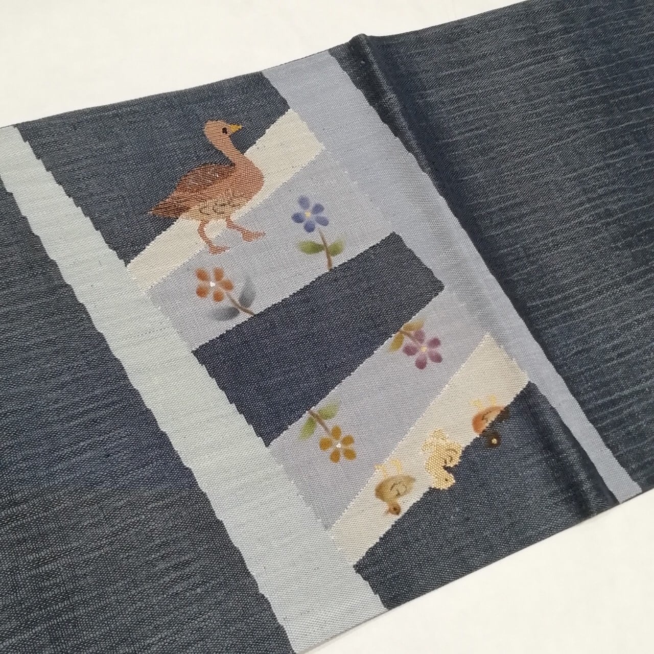 くすみブルー系の配色の紬地にカルガモ親子が並んで歩く現代モノの未使用 洒落袋帯です。