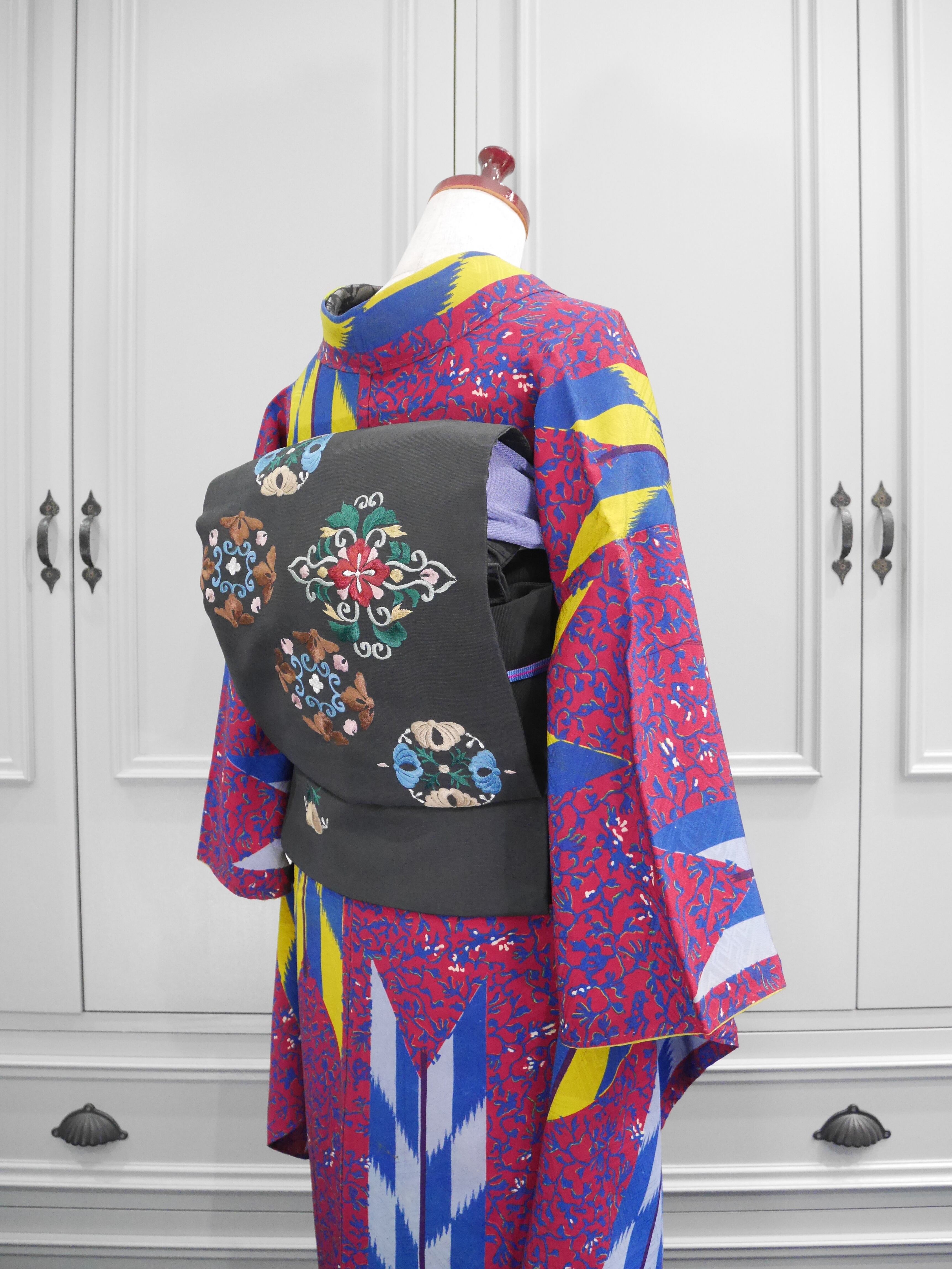 黒地 × シックカラーの刺繍で、華やかなアンティーク着物をカッコ良く引き立ててくれそうです!